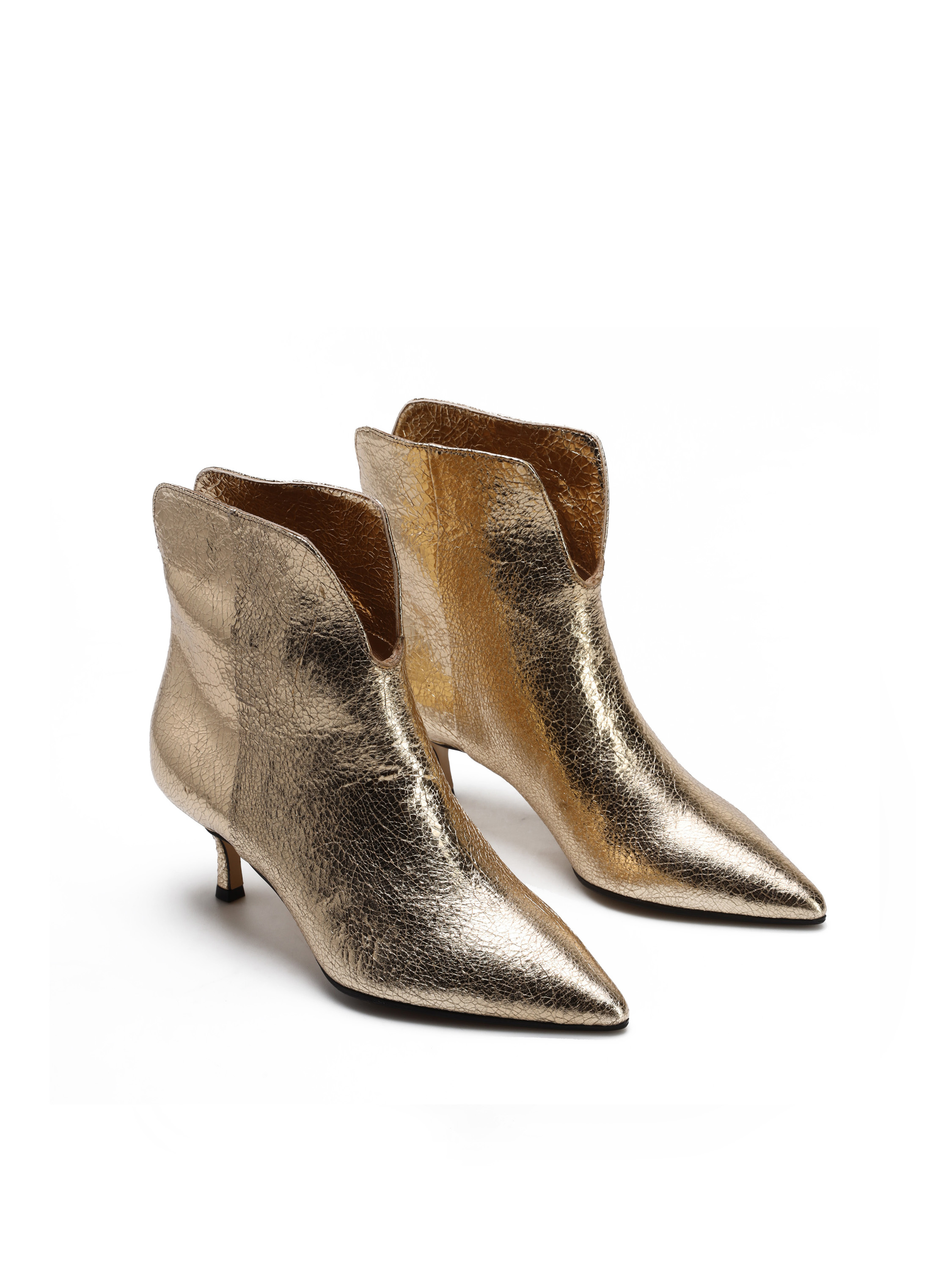 Botki na niskim obcasie wykonane są z naturalnej, metalizowanej skóry. Posiadają profilowaną cholewkę za kostkę. Model z noskiem w szpic oraz wygodnym obcasem na szpilce. Botki damskie będą uzupełnieniem nie tylko casualowych stylizacji.