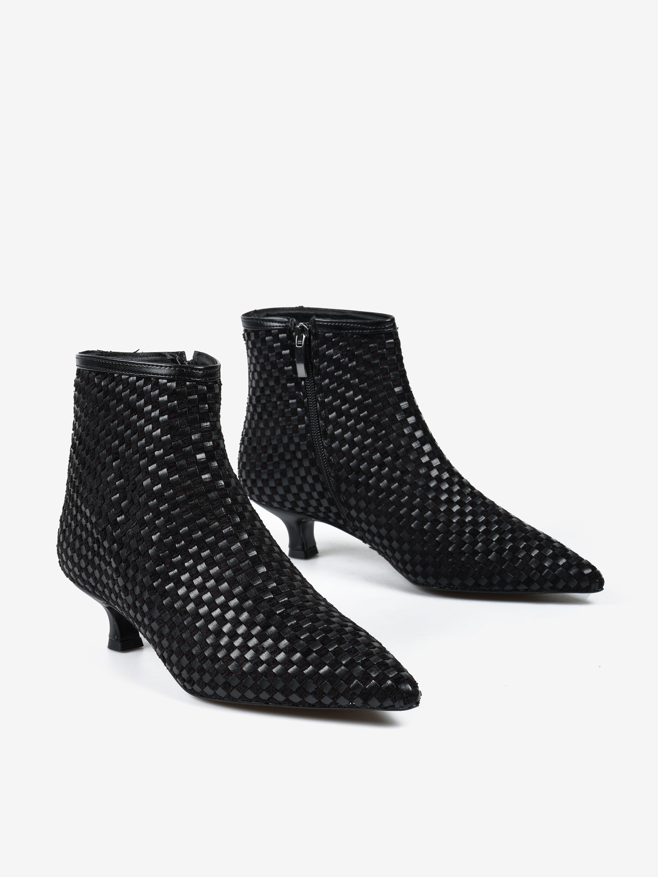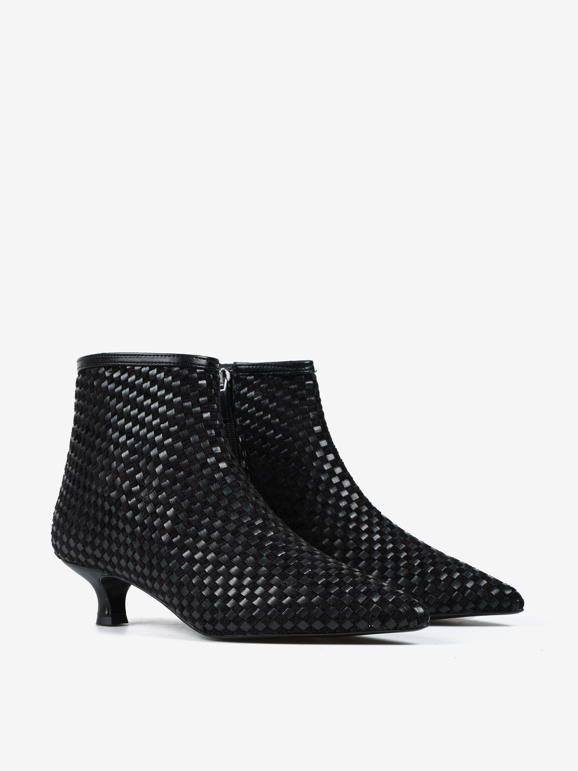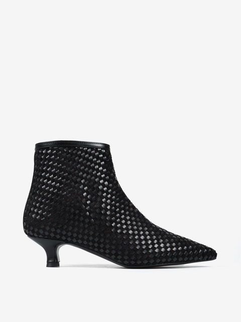Botki na niskiej szpilce wykonane z plecionego materiału. Nosek w szpic i zapięcie na suwak.