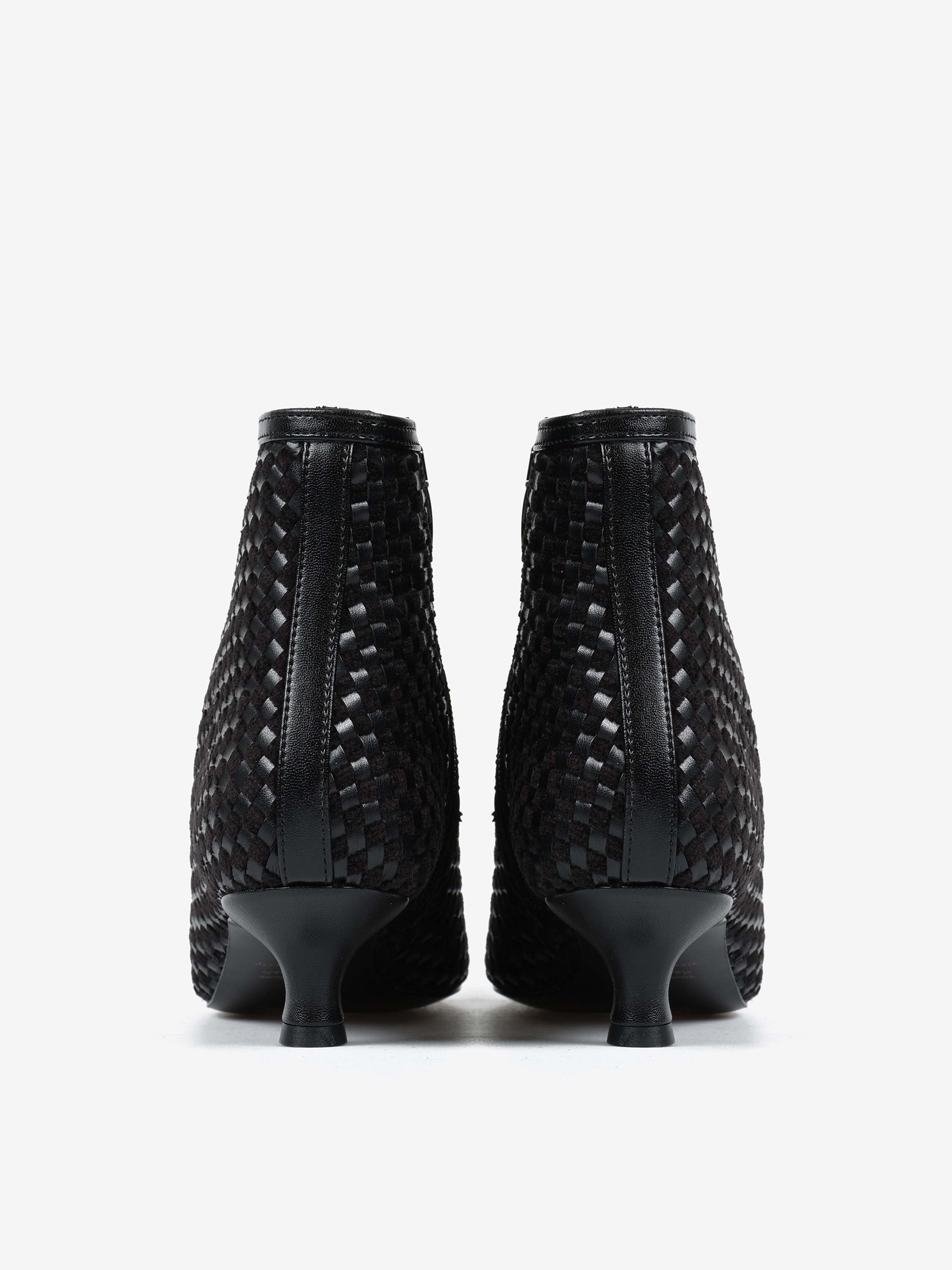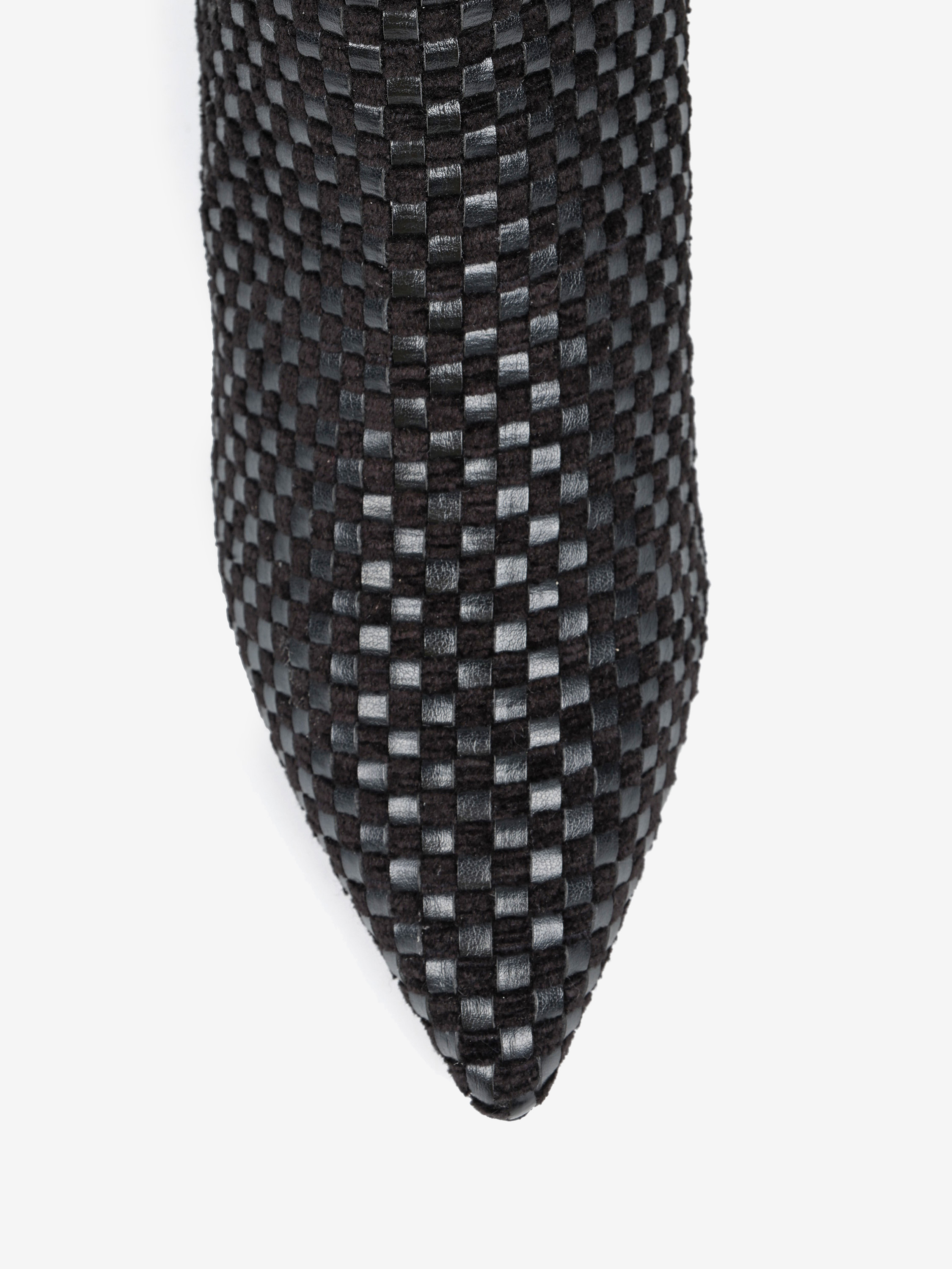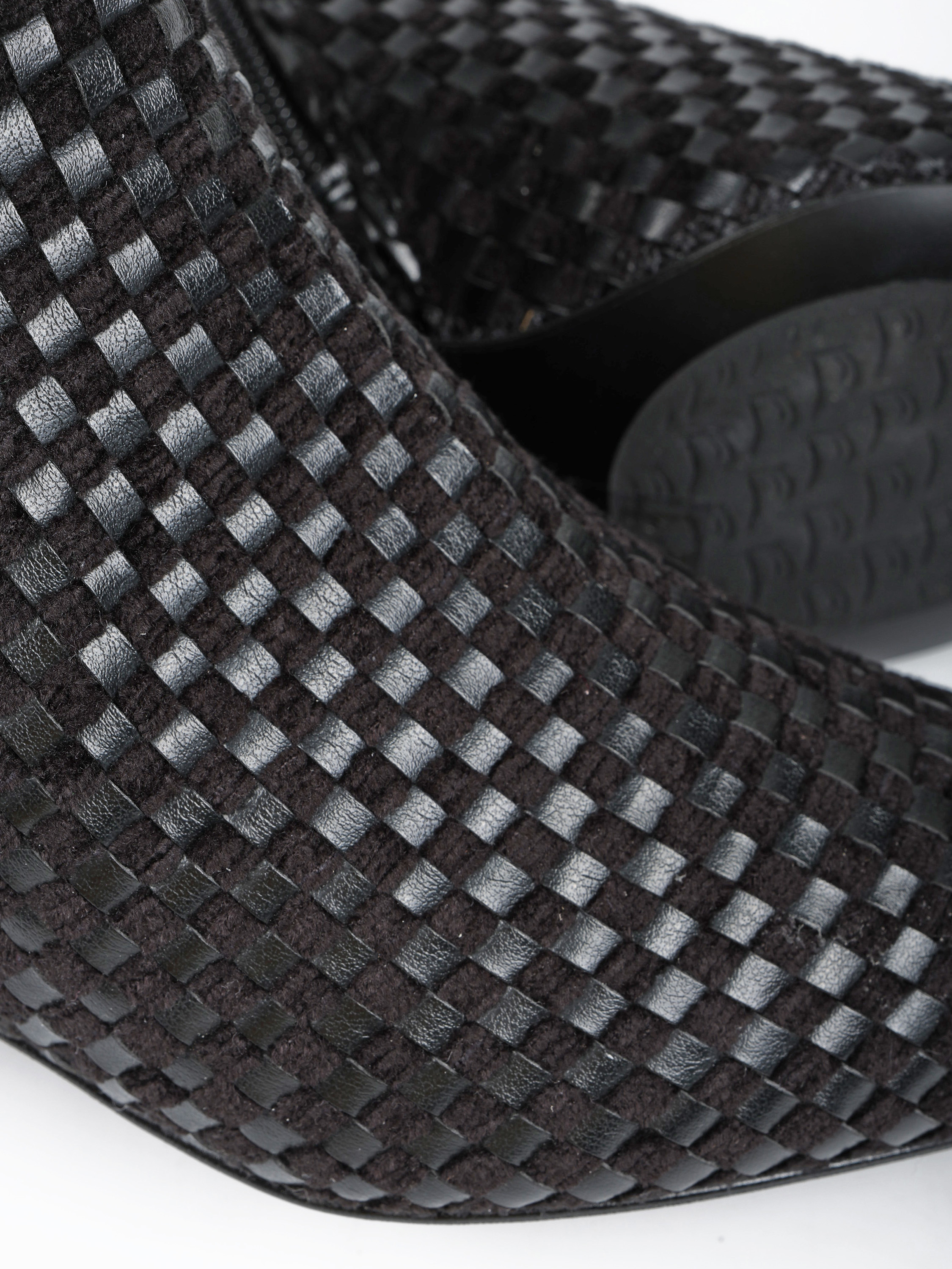 Botki na niskiej szpilce wykonane z plecionego materiału. Nosek w szpic i zapięcie na suwak.