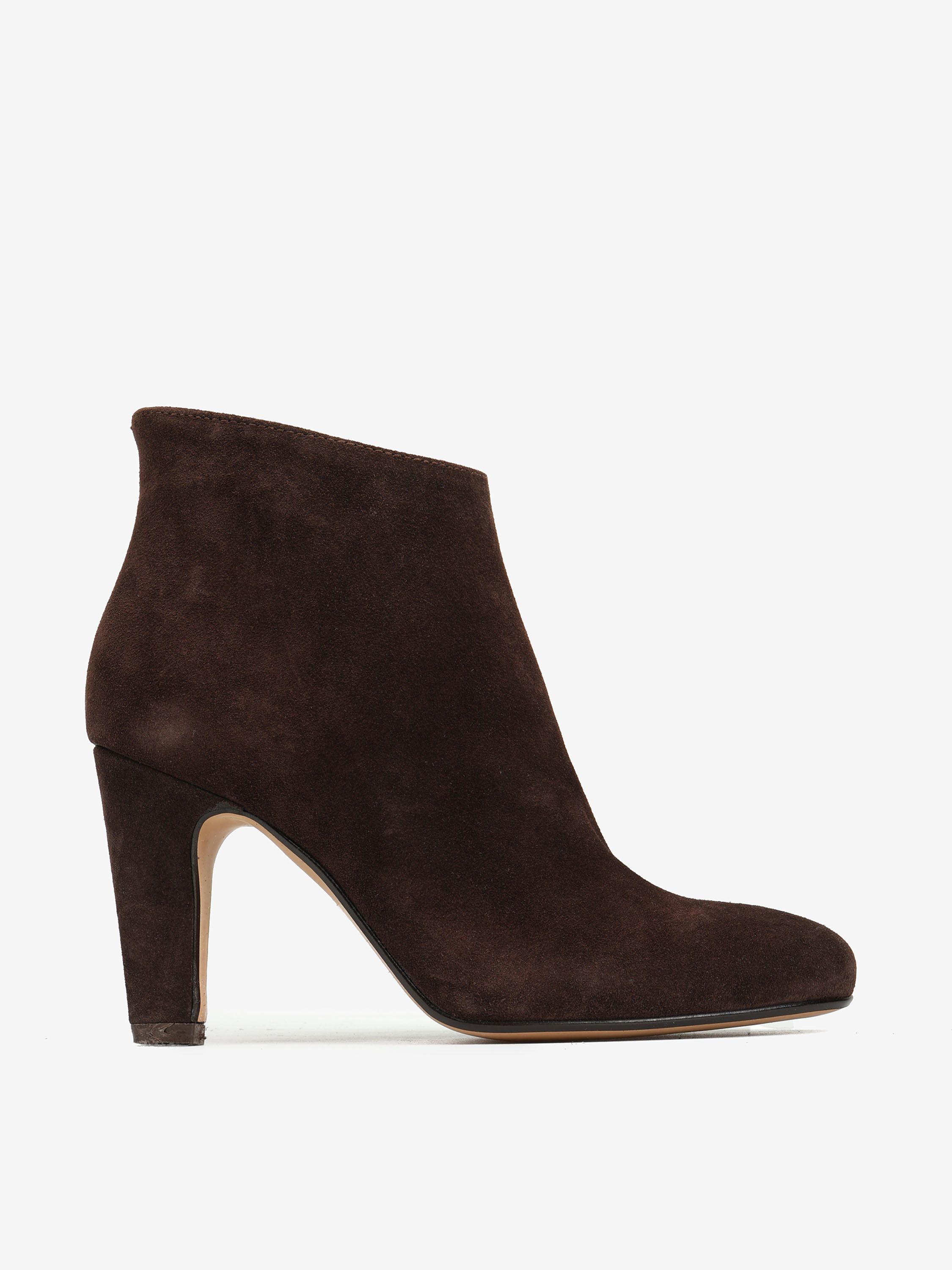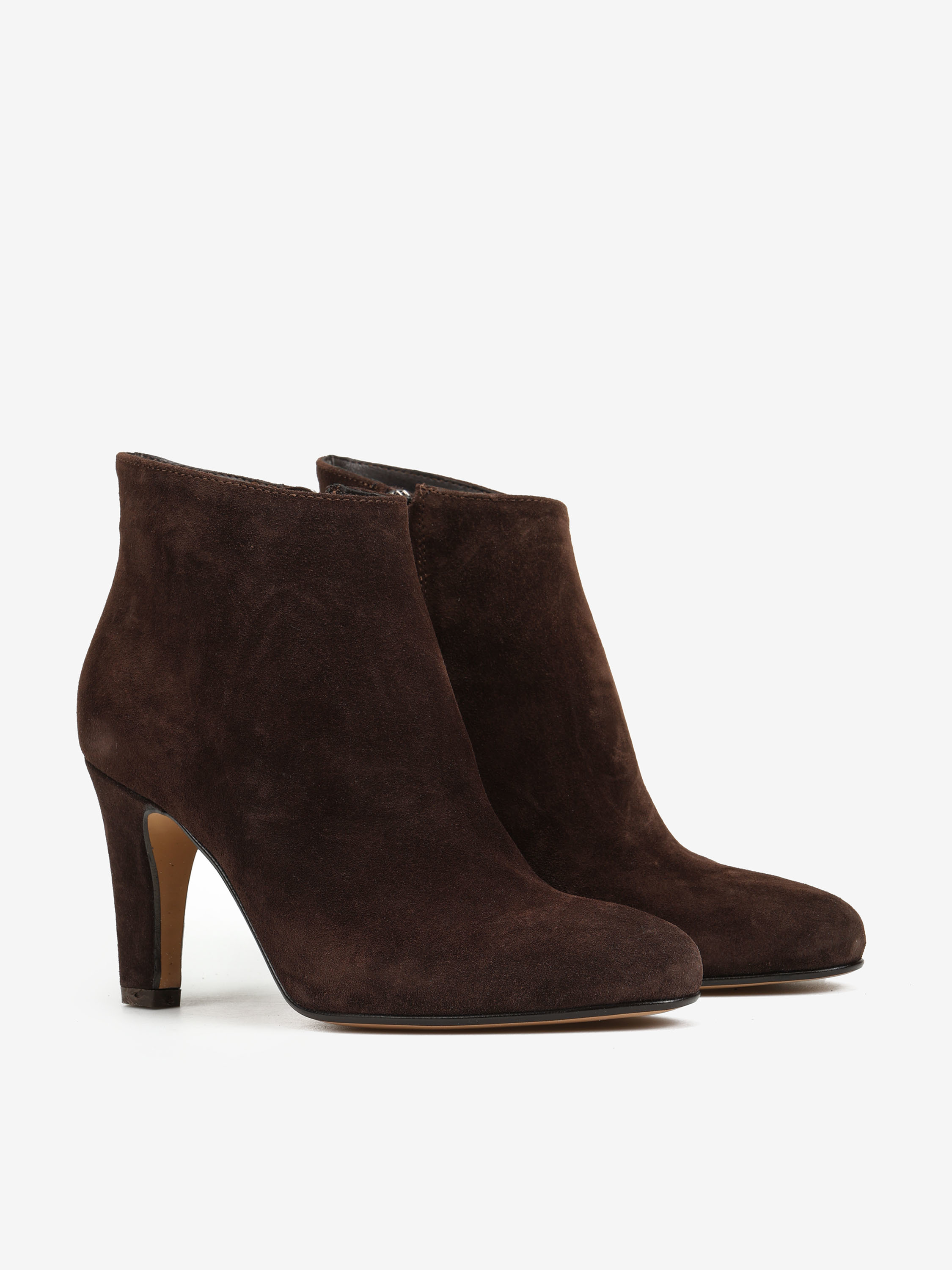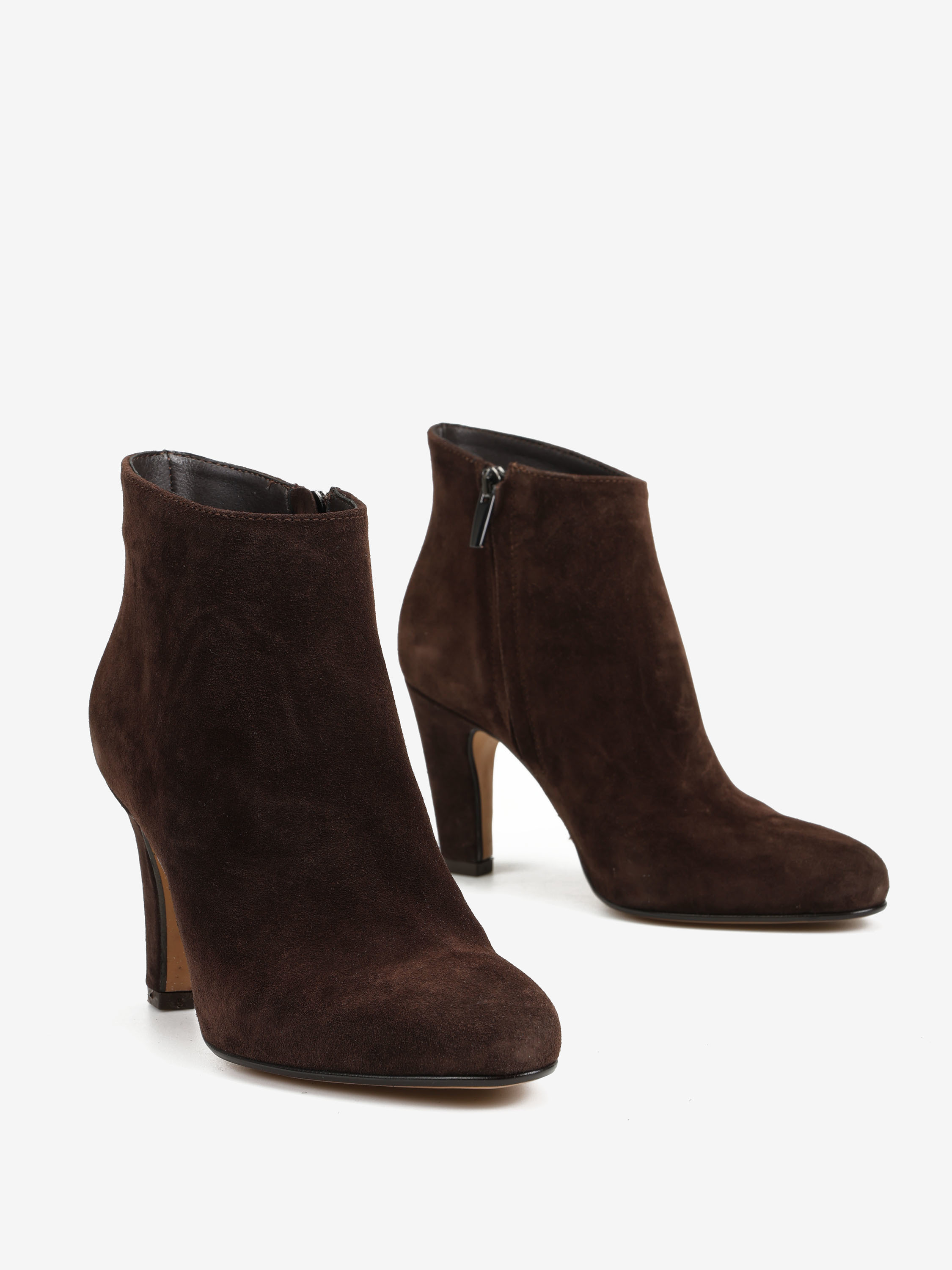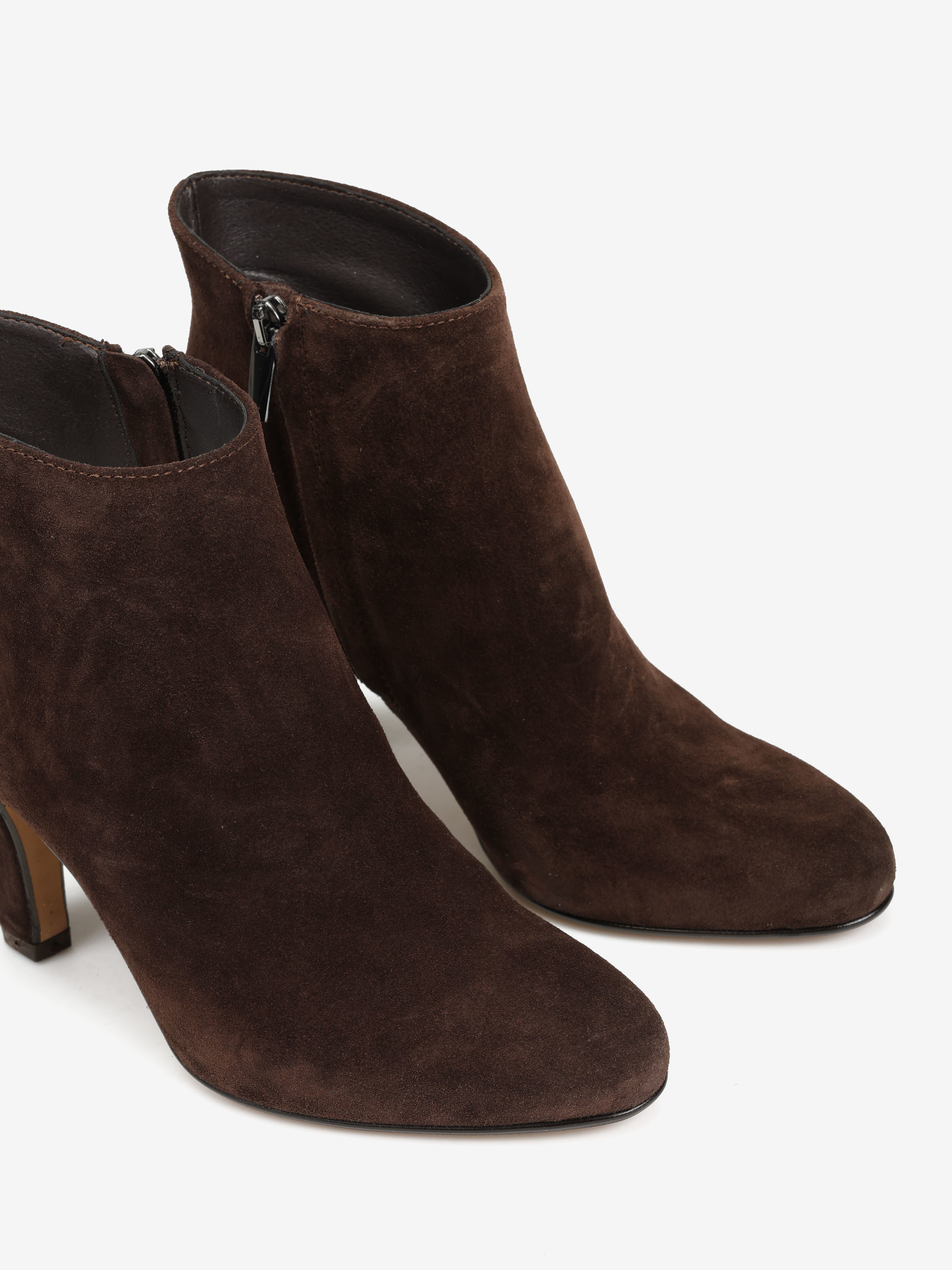 Zamszowe botki na wysokim obcasie. Okrągłe noski i zapięcie na suwak przy kostce.