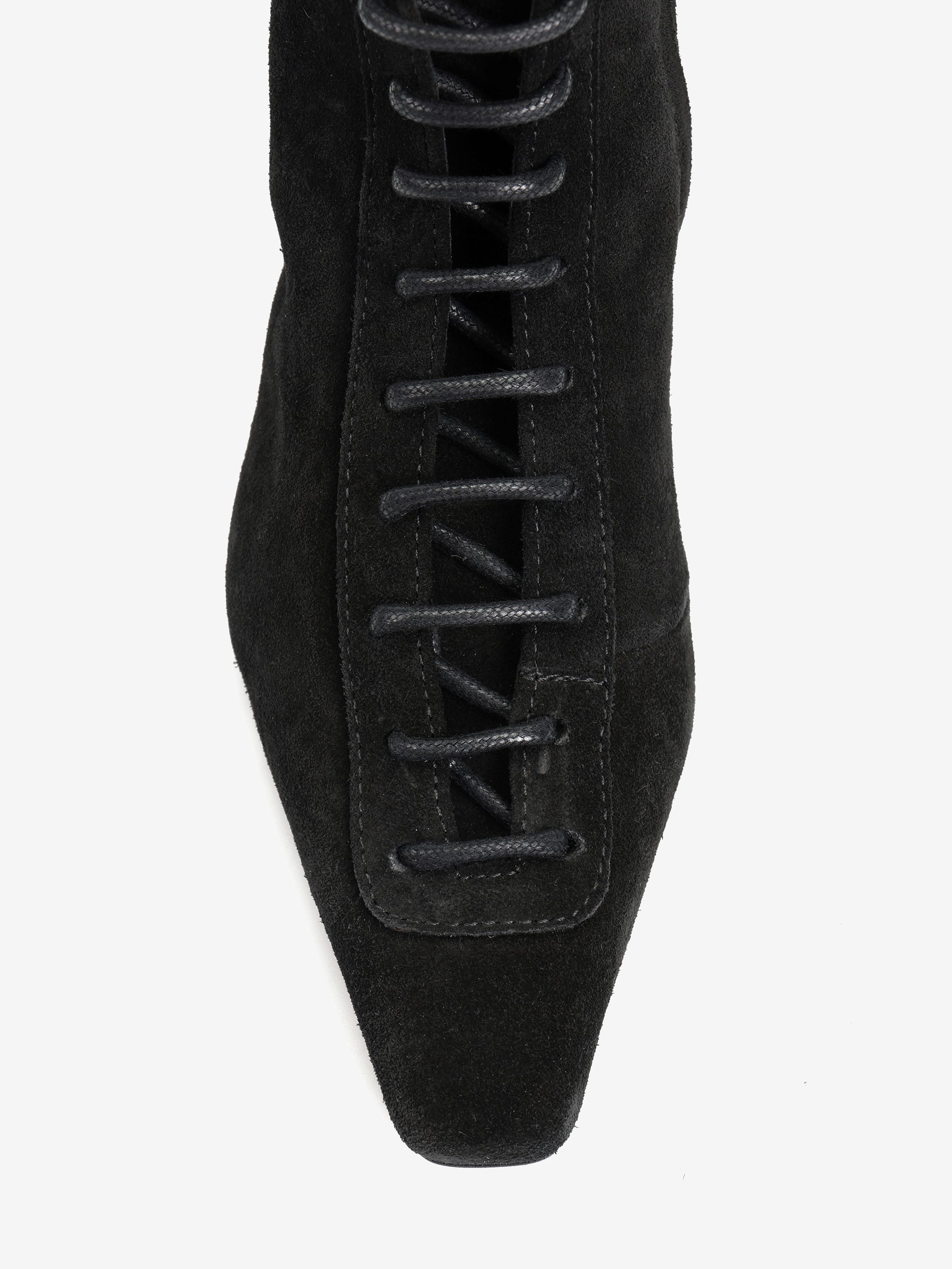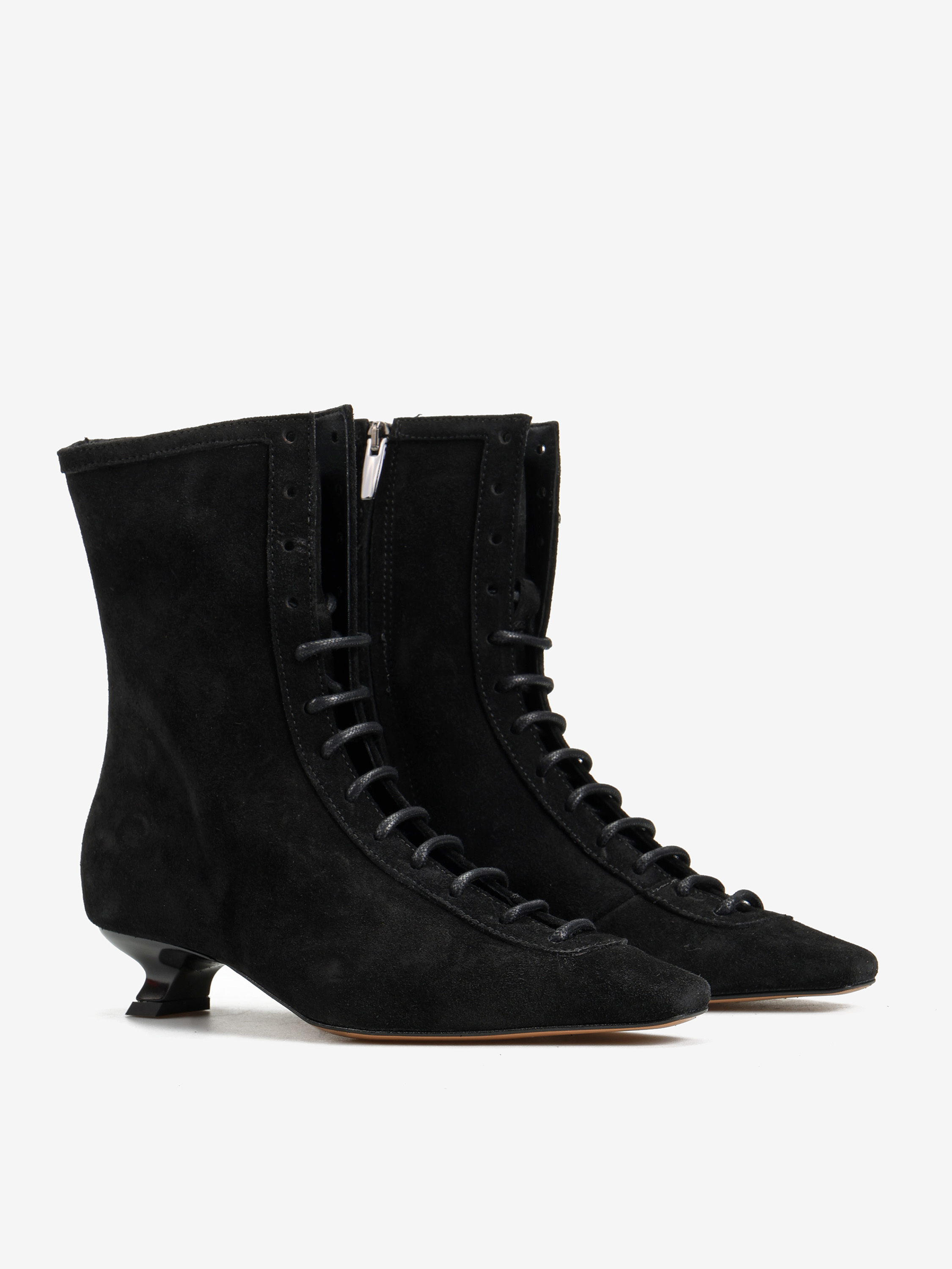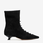 Zamszowe botki na niskiej szpilce, z wiązaniem na sznurówki i zapięciem na suwak. Wydłużone, kwadratowe noski.