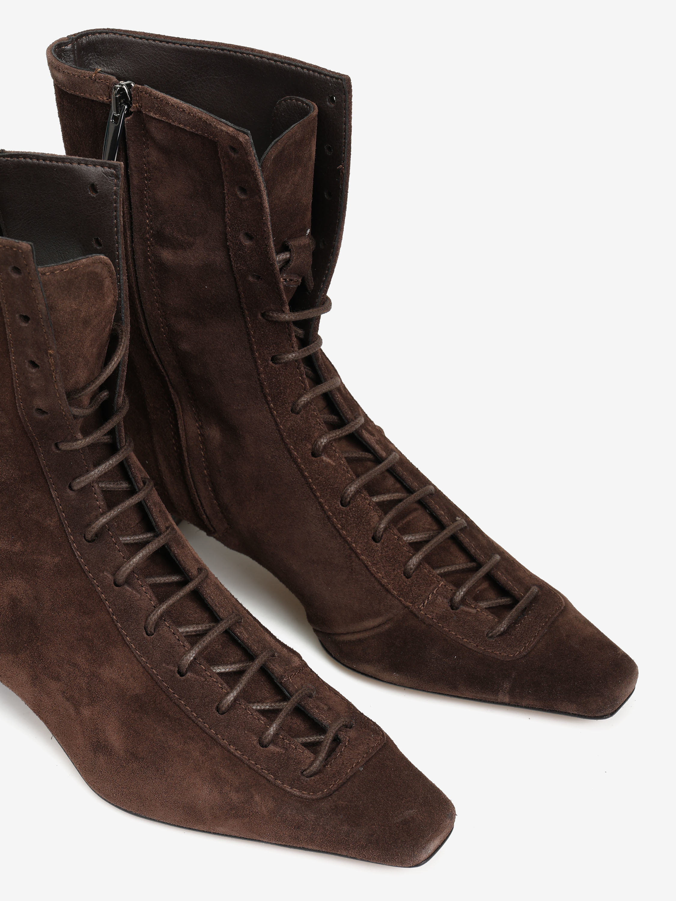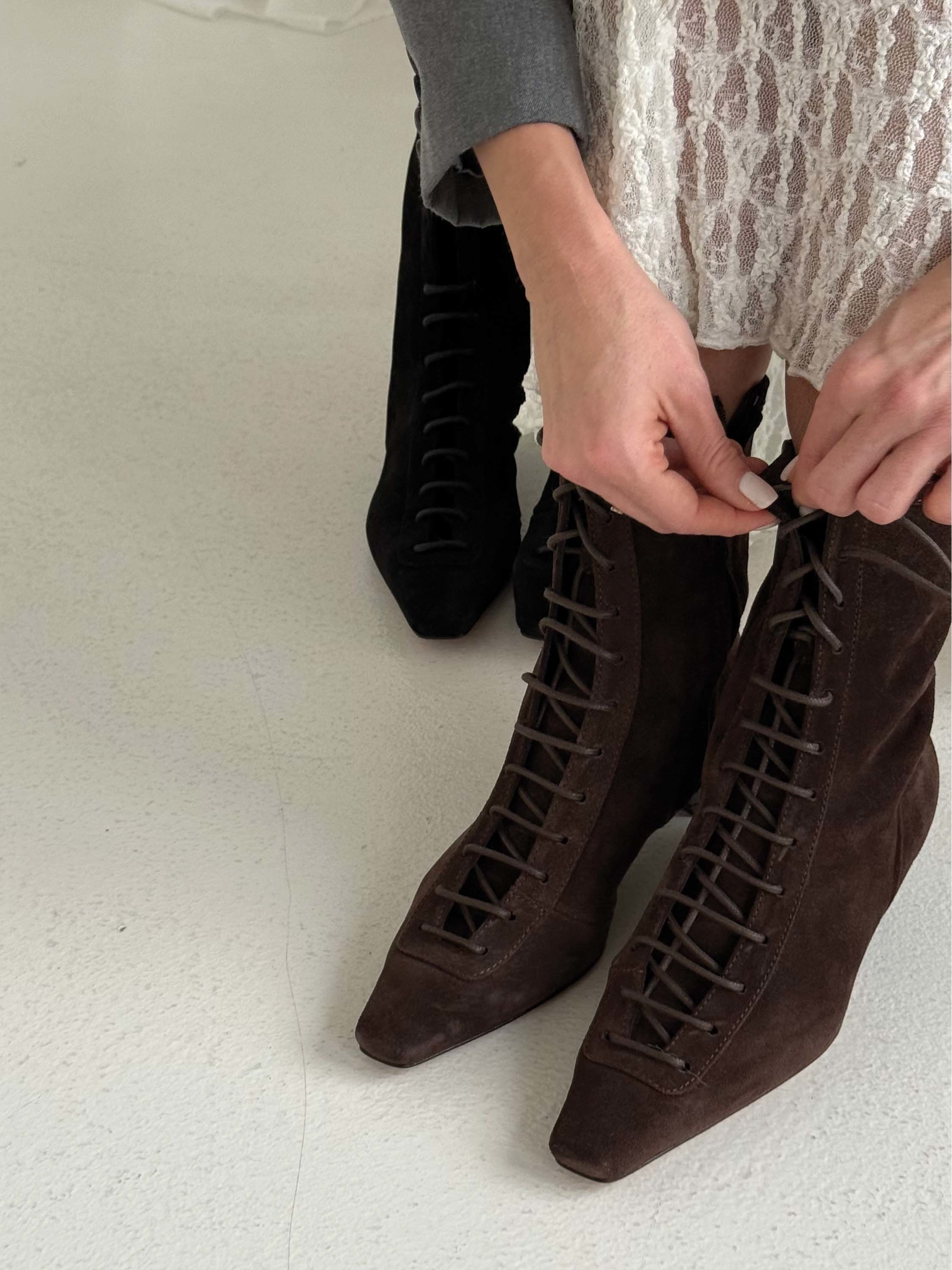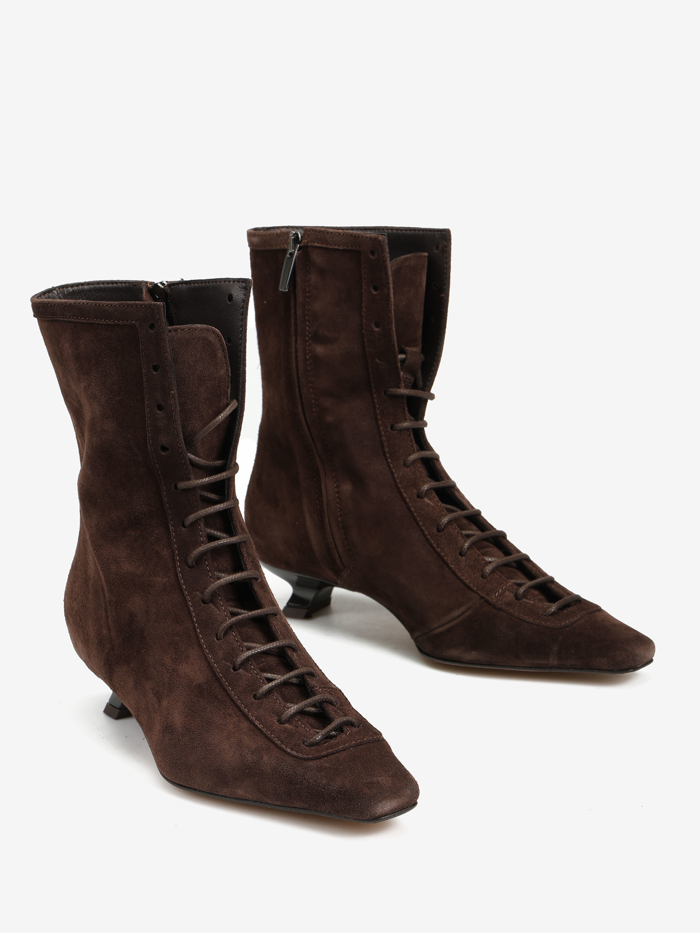 Zamszowe botki na niskiej szpilce, z wiązaniem na sznurówki i zapięciem na suwak. Wydłużone, kwadratowe noski.