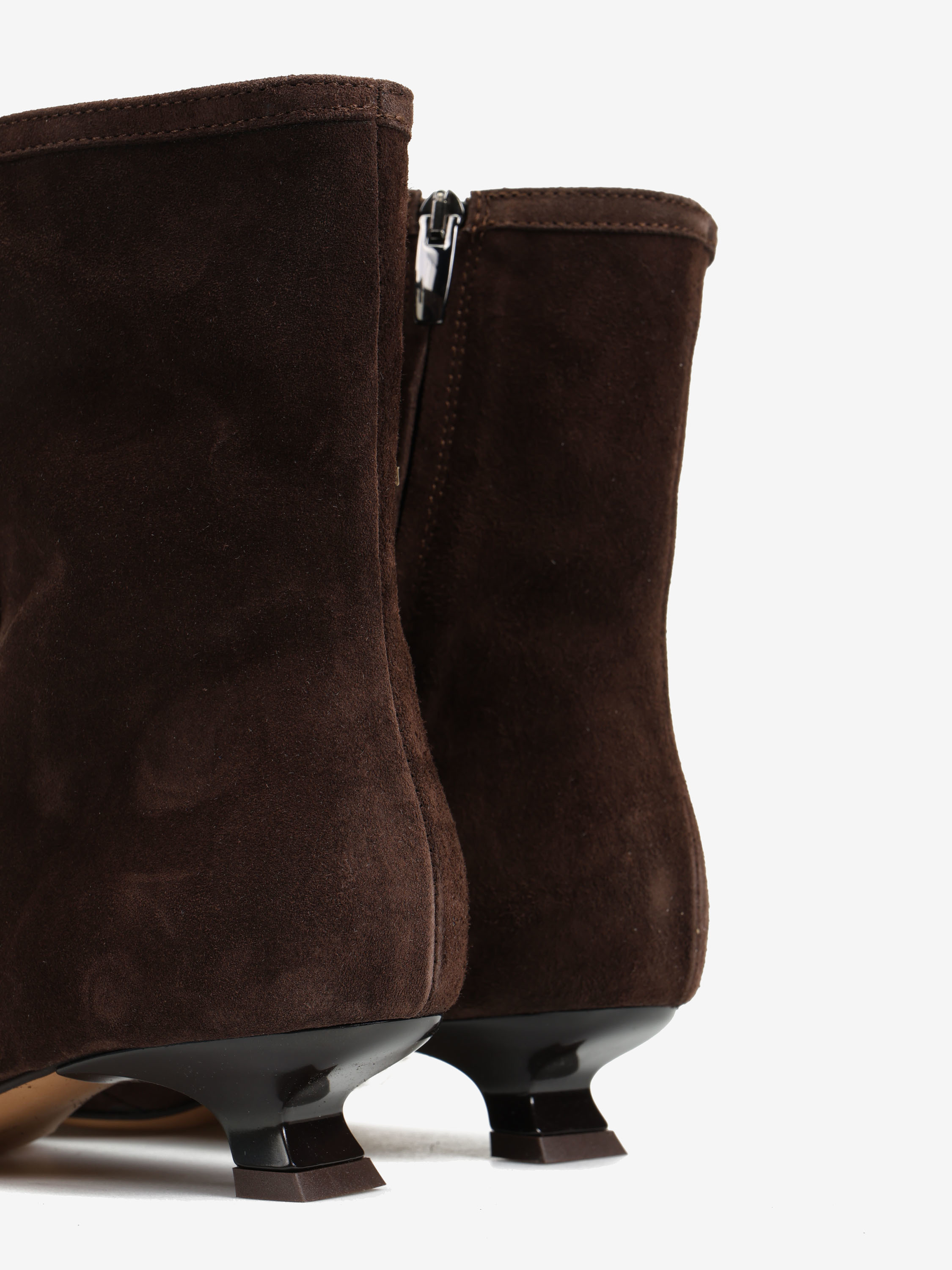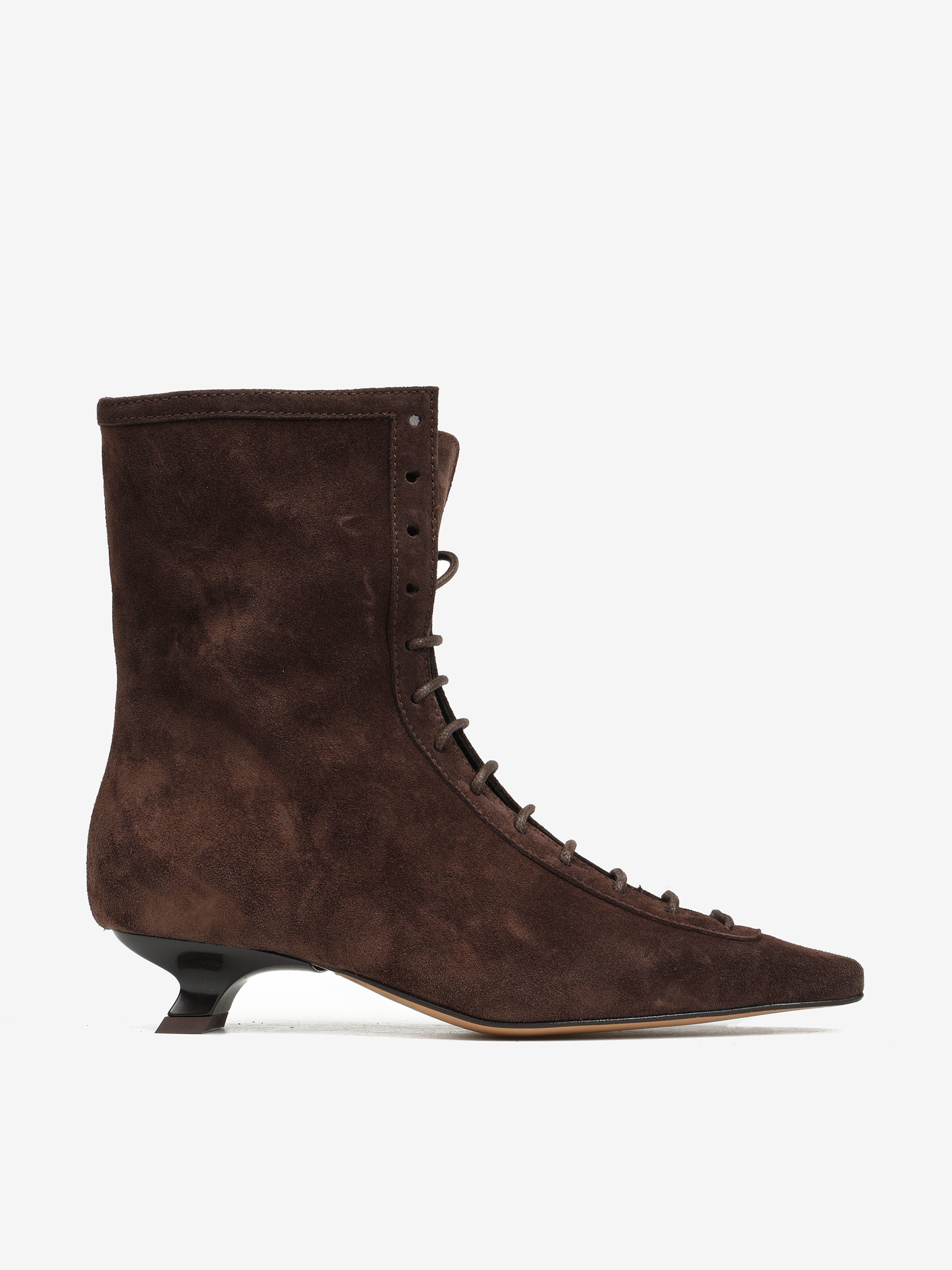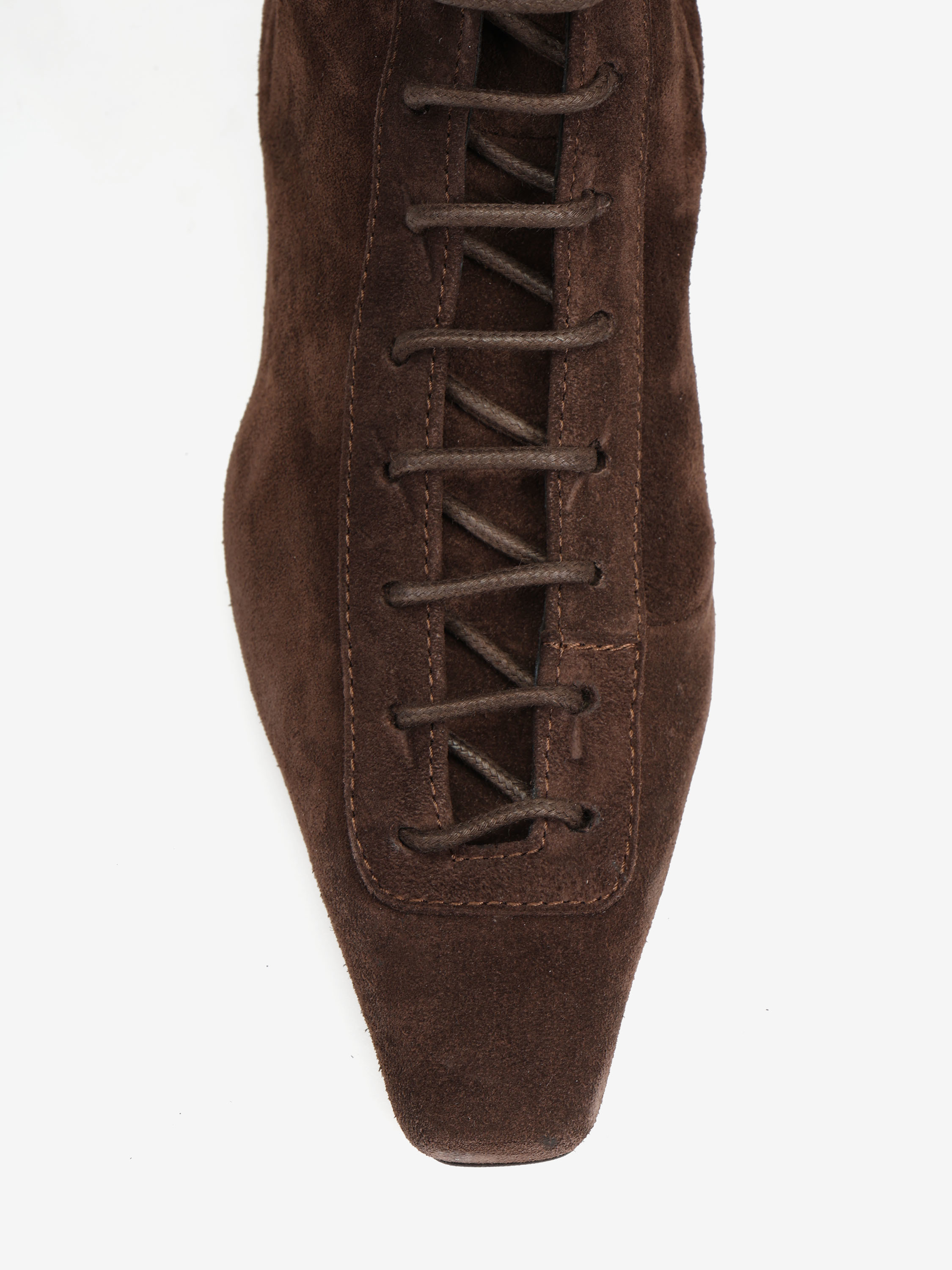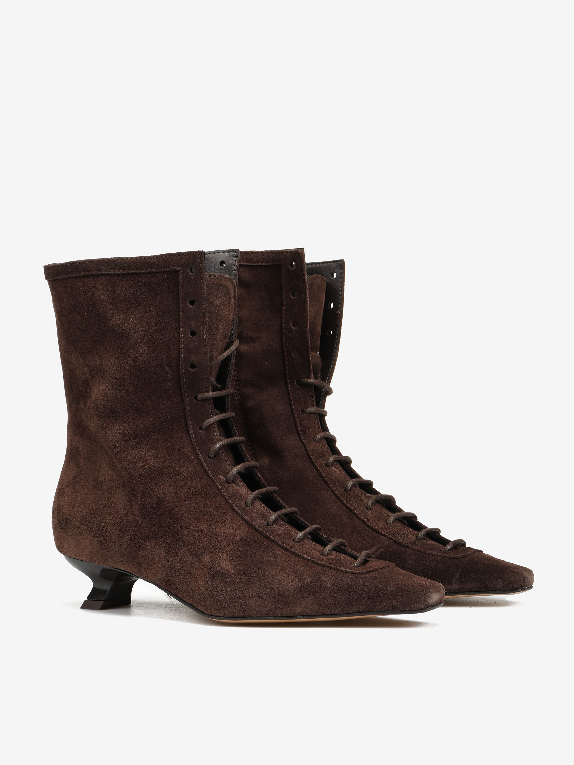 Zamszowe botki na niskiej szpilce, z wiązaniem na sznurówki i zapięciem na suwak. Wydłużone, kwadratowe noski.
