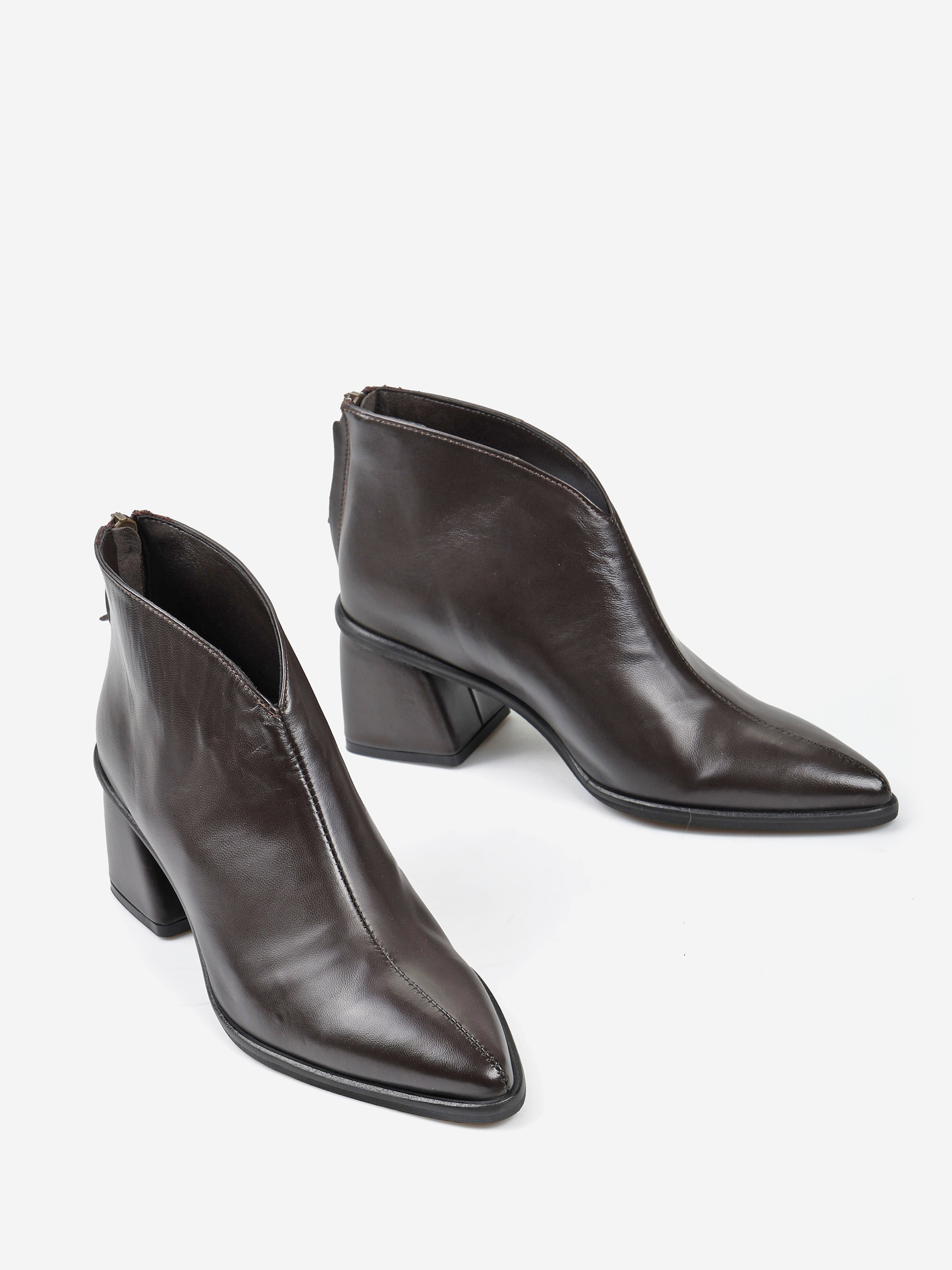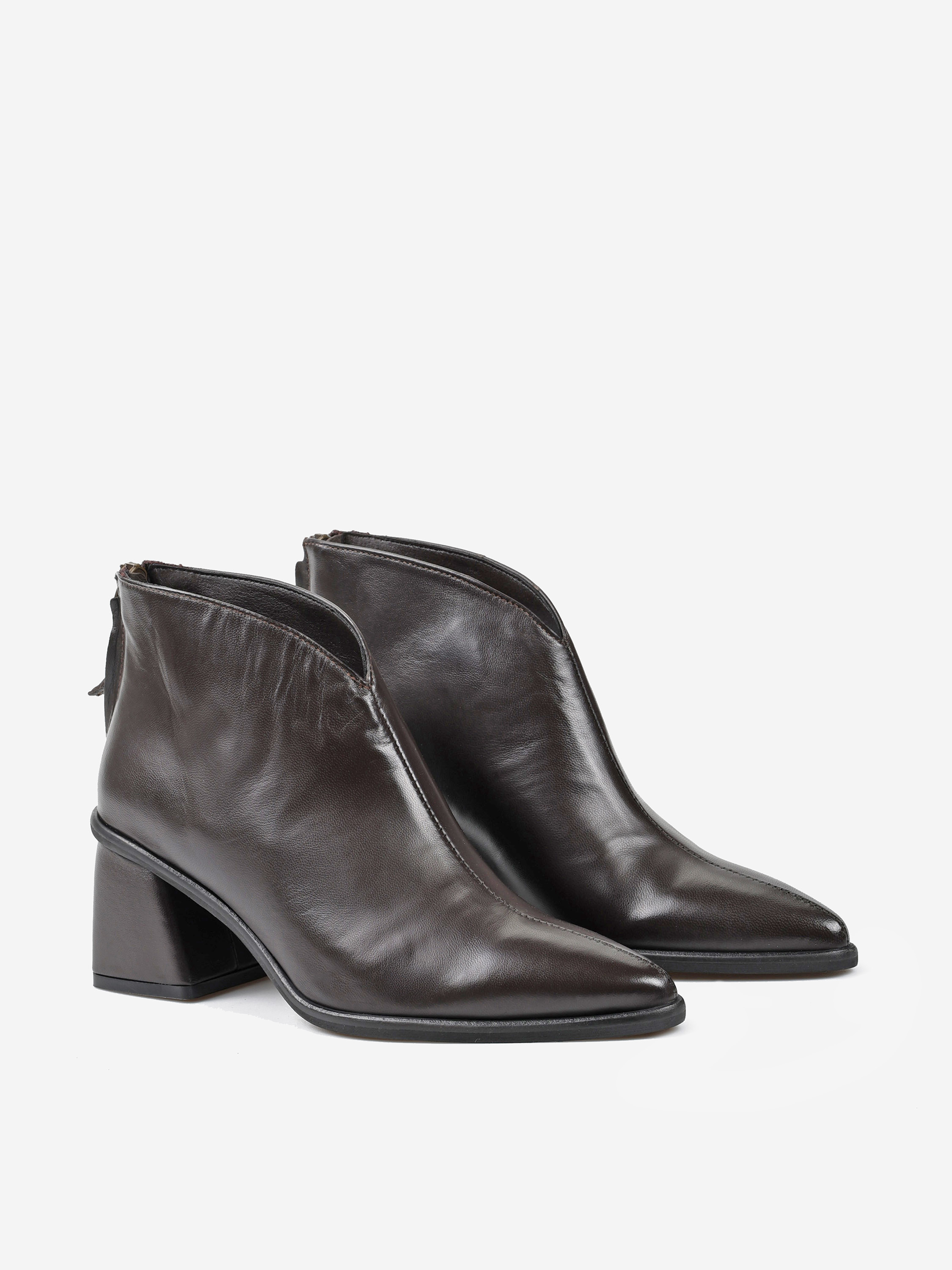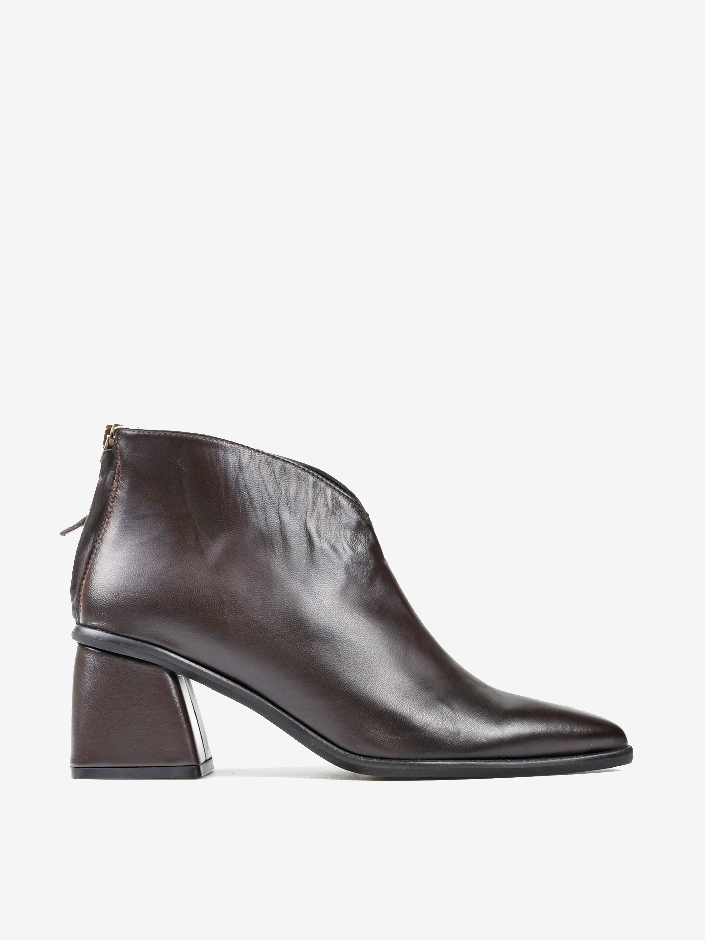 Niskie botki wykonane z miękkiej i delikatnej skóry. Rozszerzany obcas i noski w szpic.