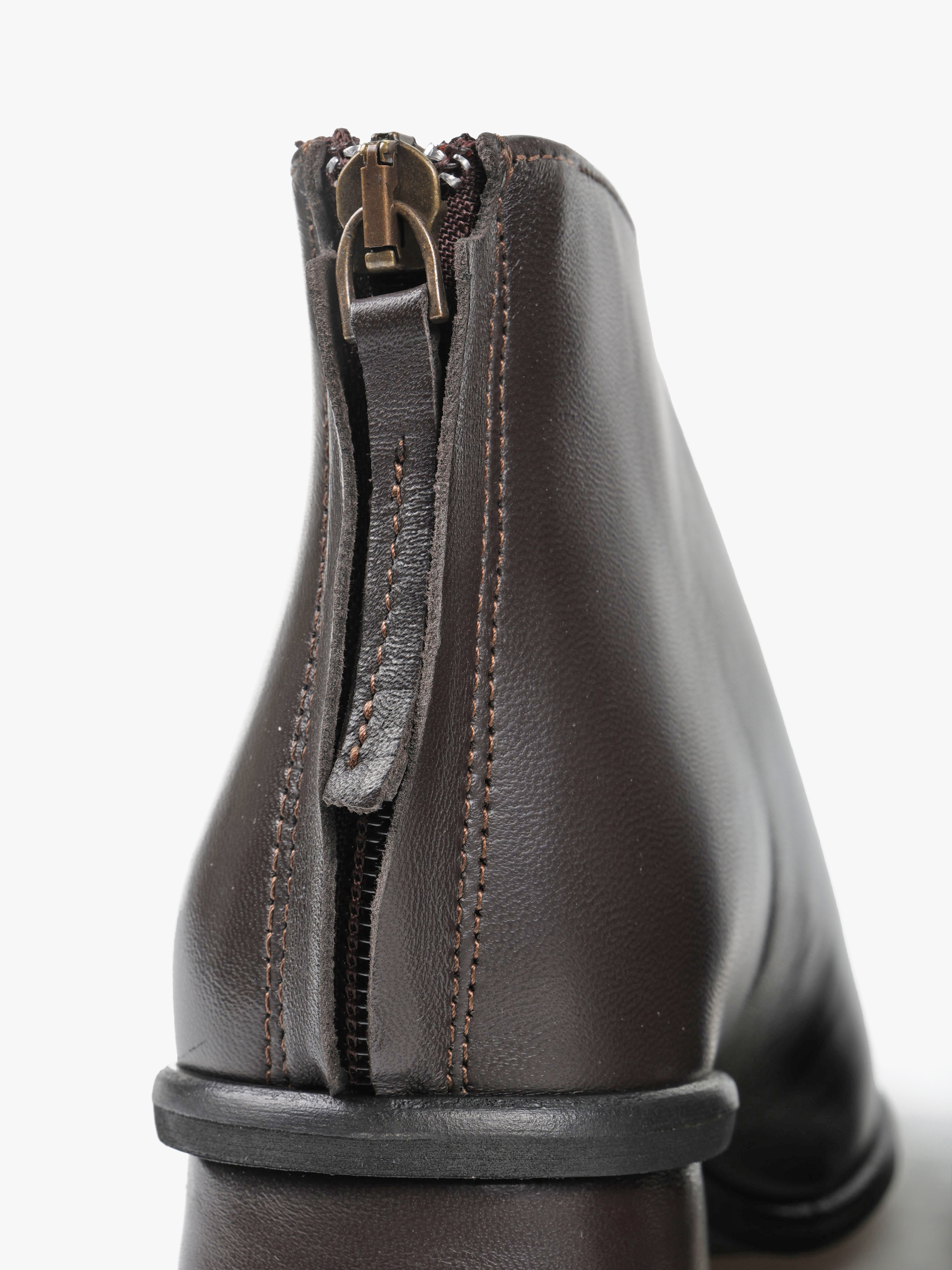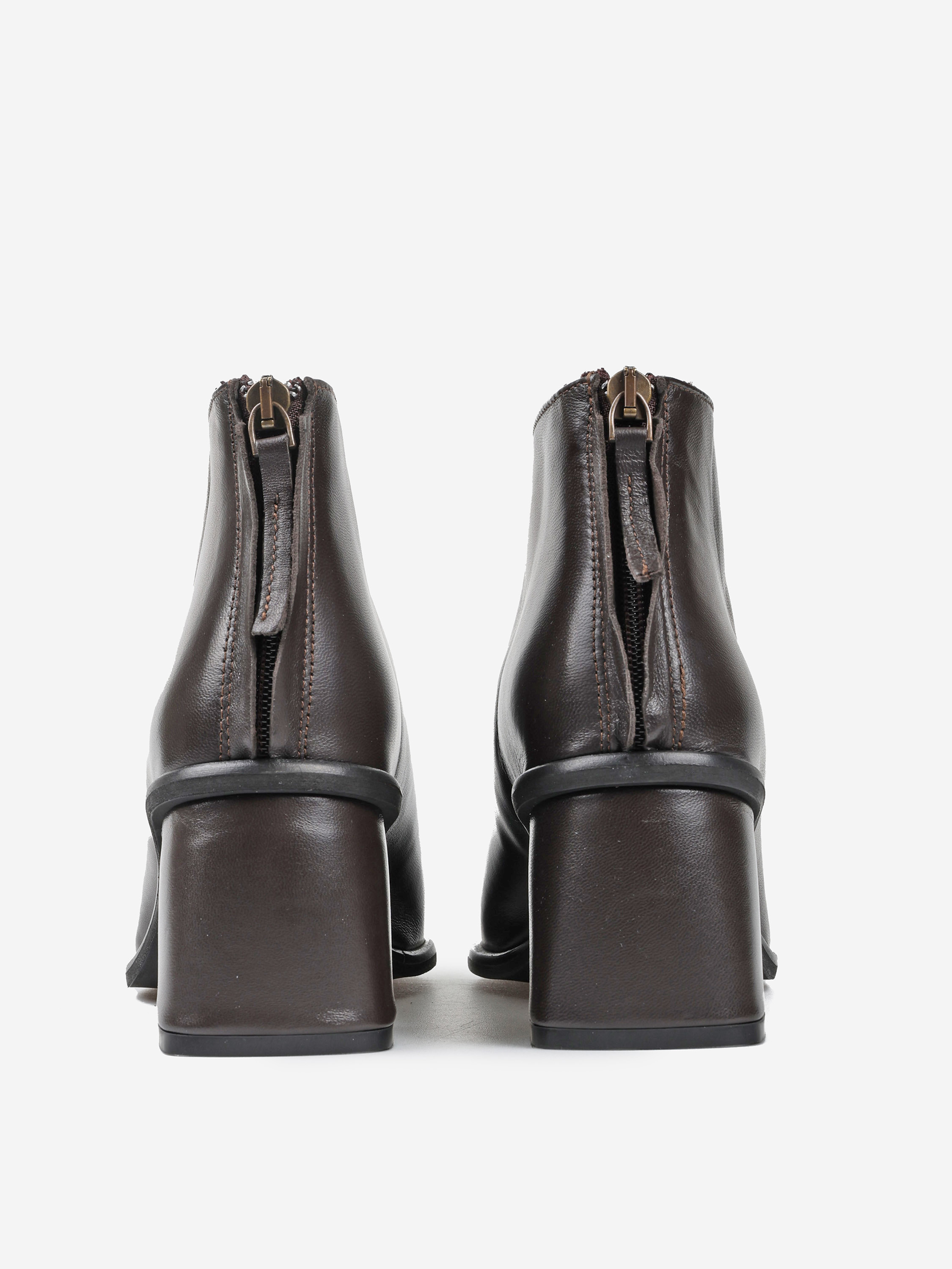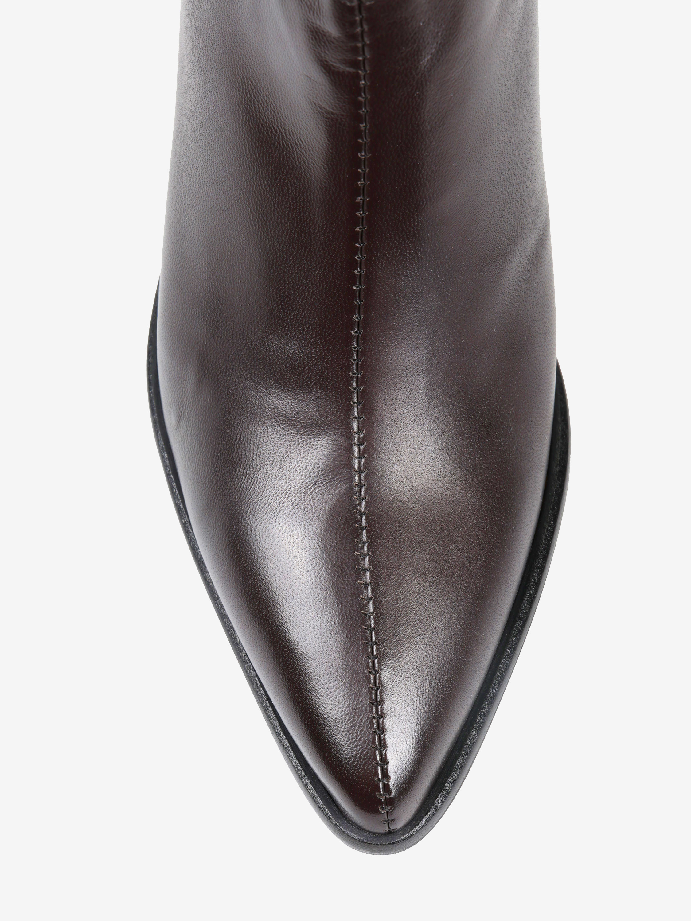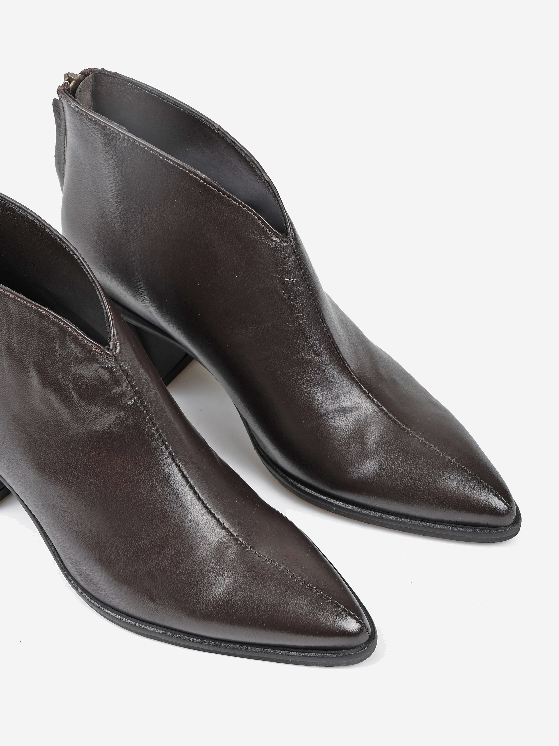 Niskie botki wykonane z miękkiej i delikatnej skóry. Rozszerzany obcas i noski w szpic.