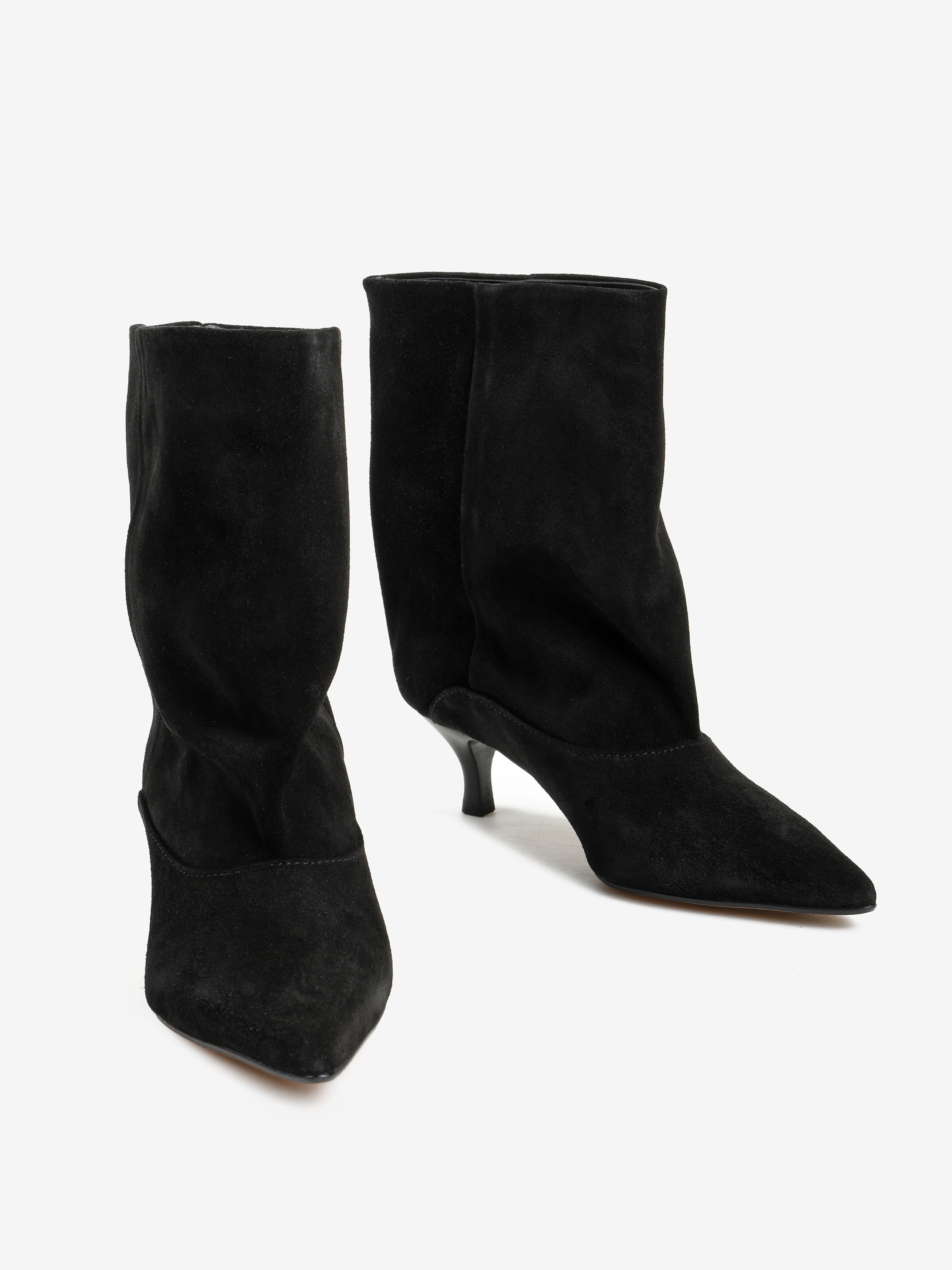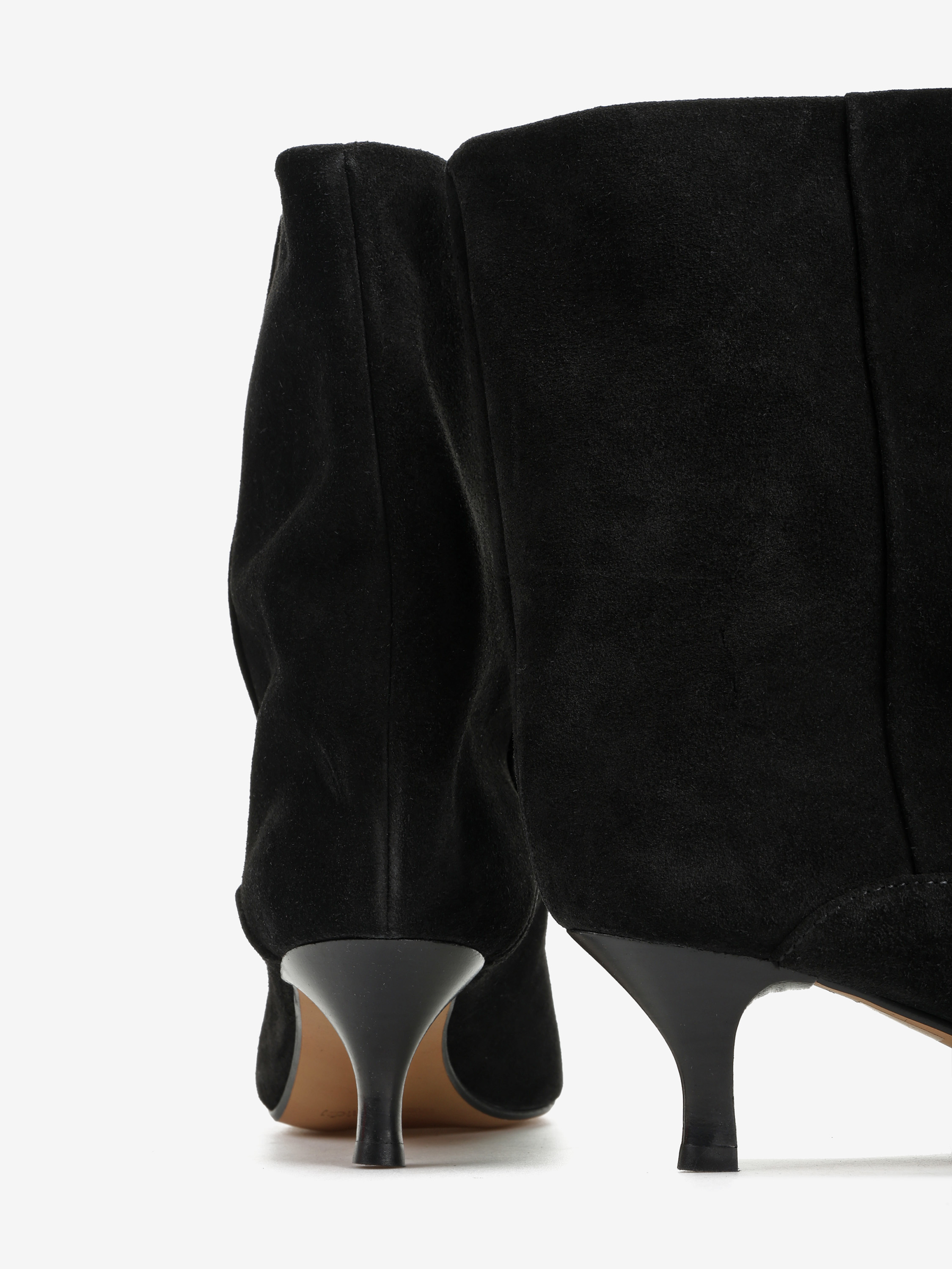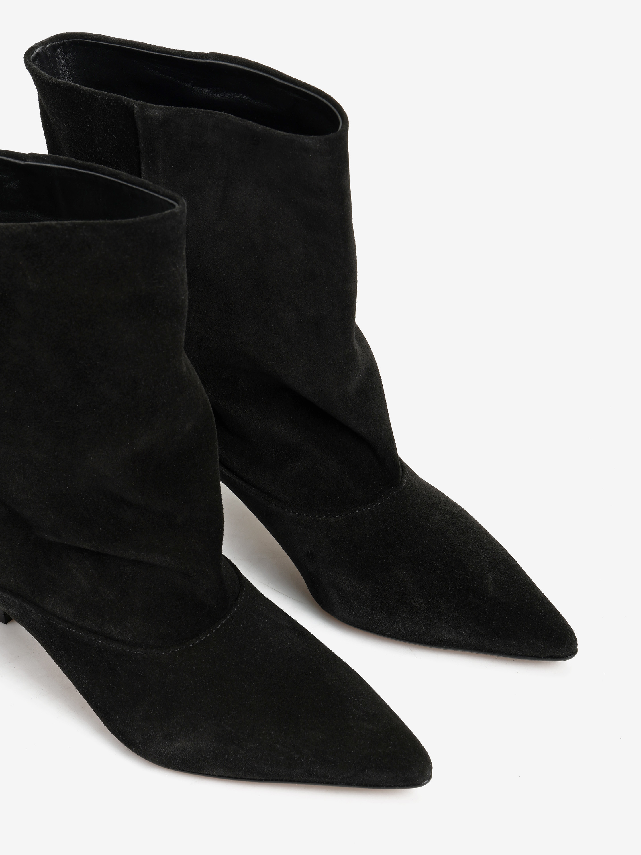 Botki na szpilce wykonane z czarnego zamszu. Szeroka cholewka i noski w szpic.