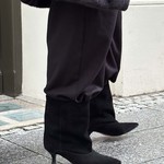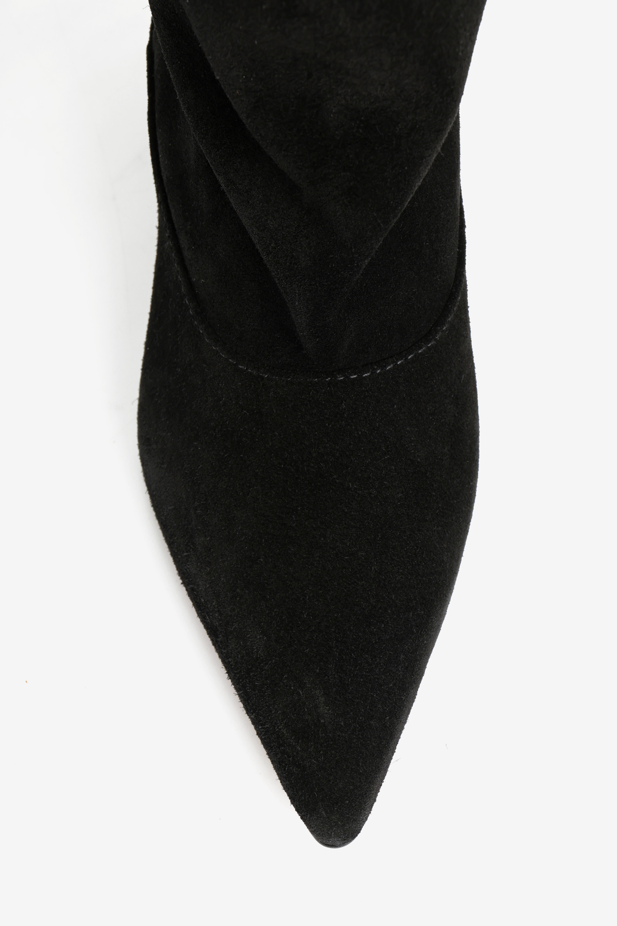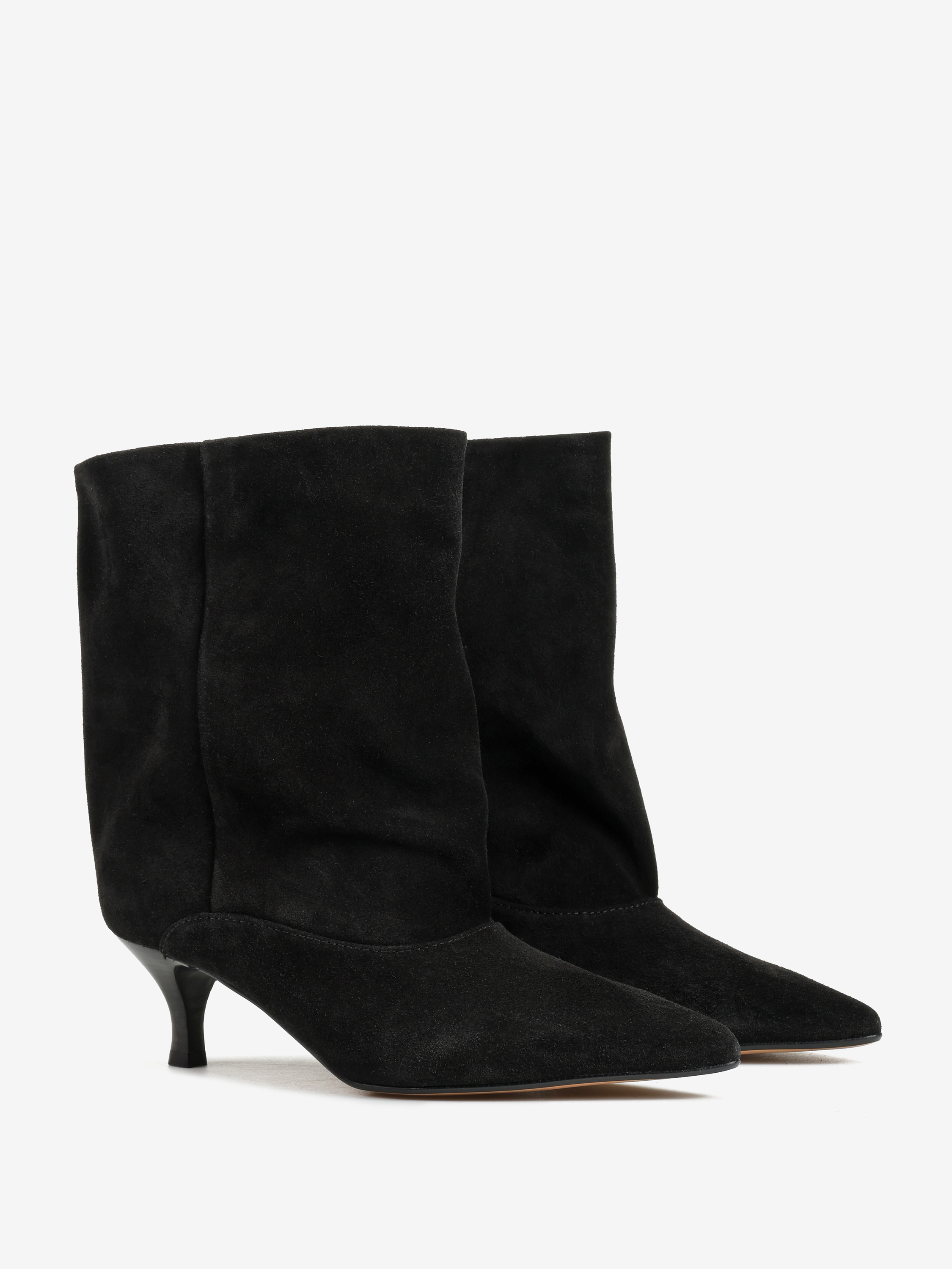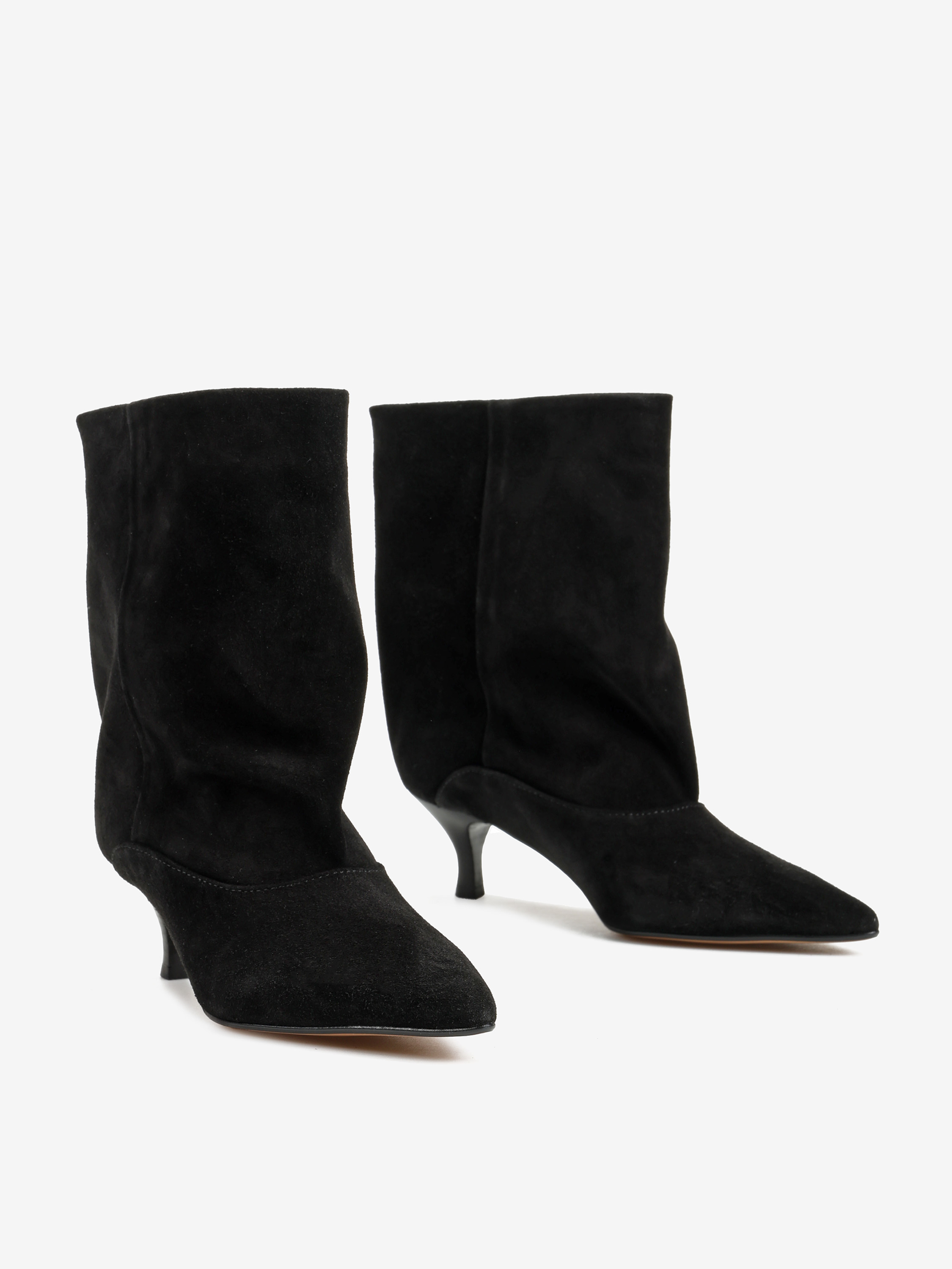 Botki na szpilce wykonane z czarnego zamszu. Szeroka cholewka i noski w szpic.