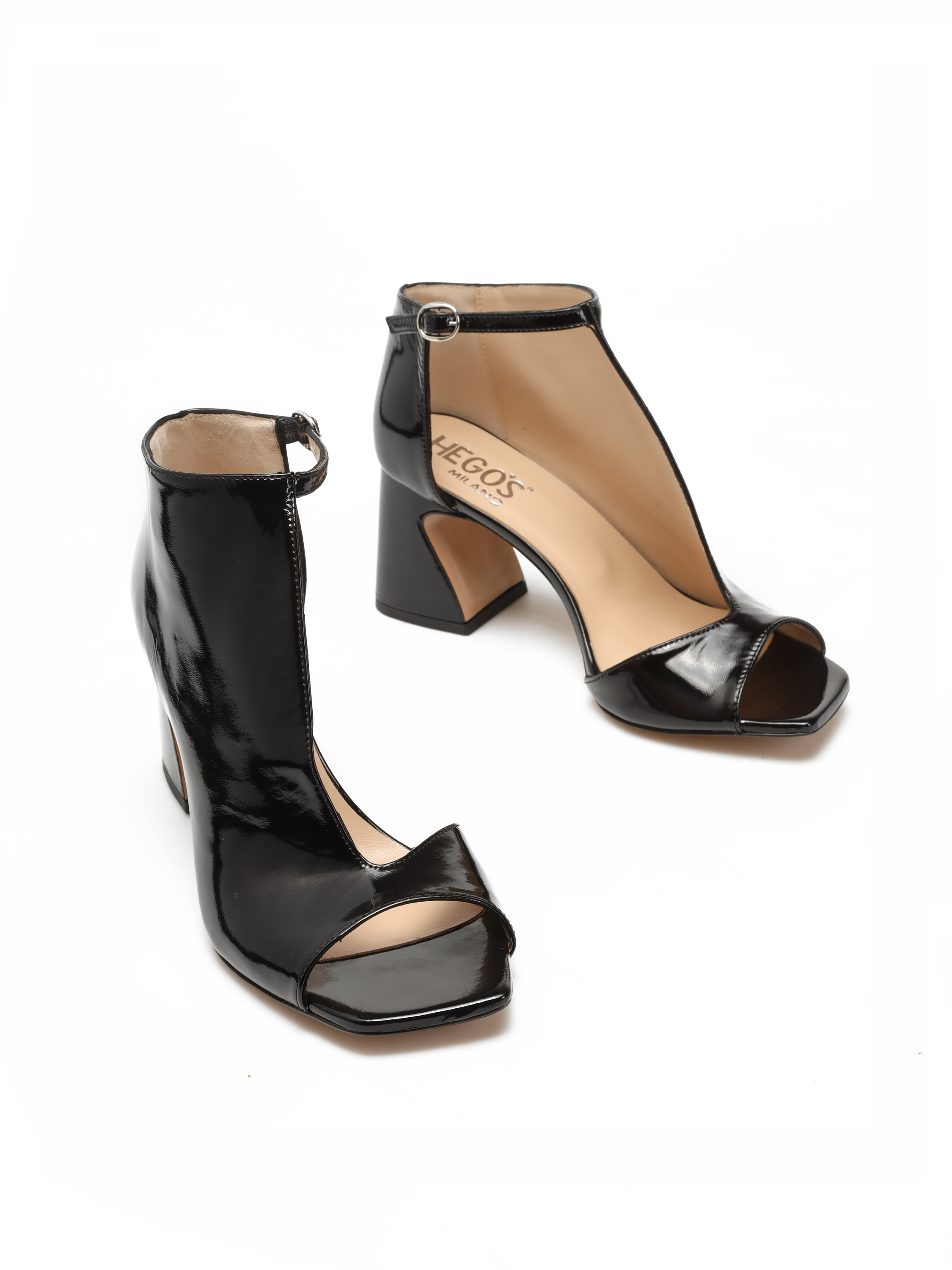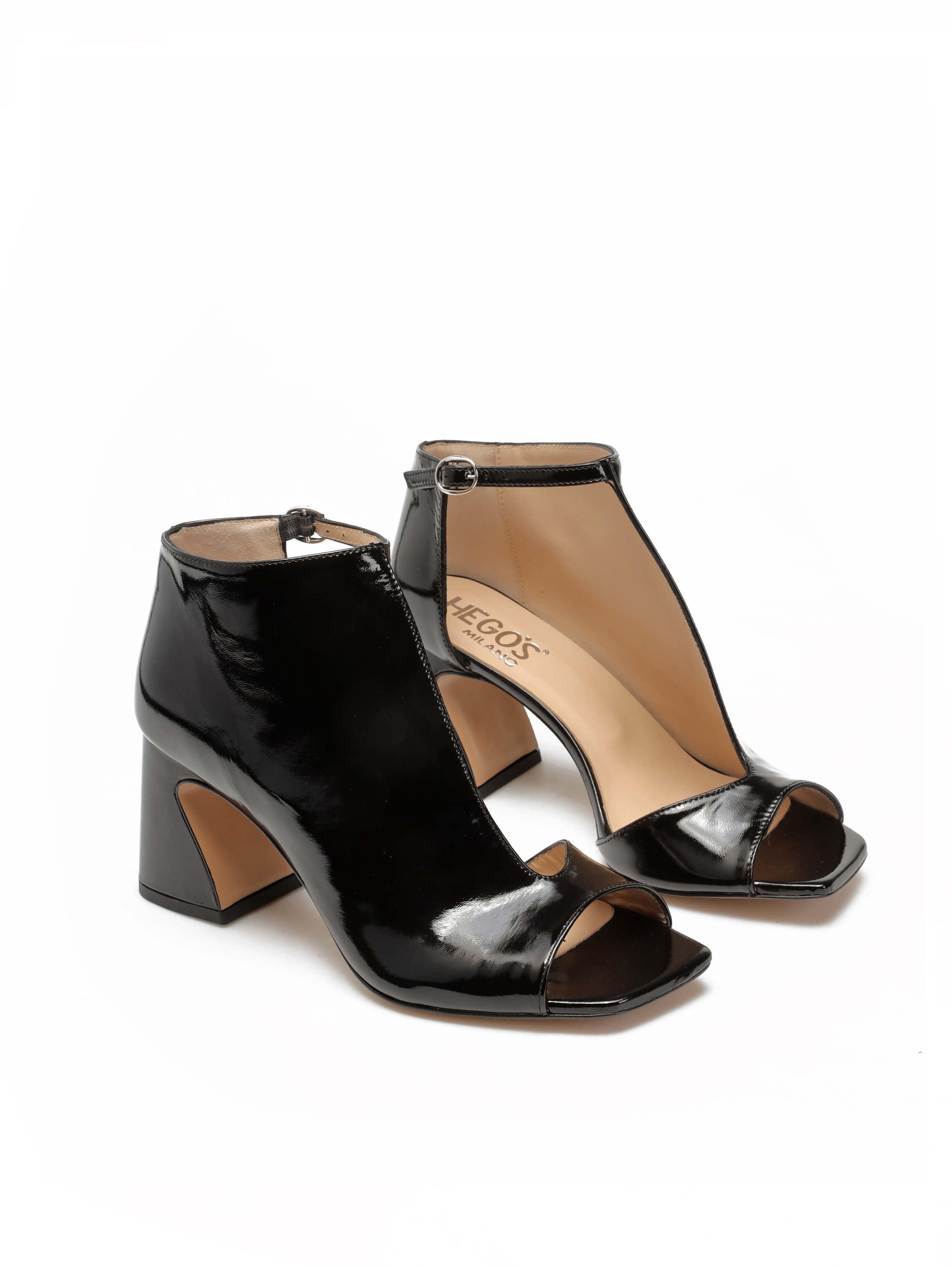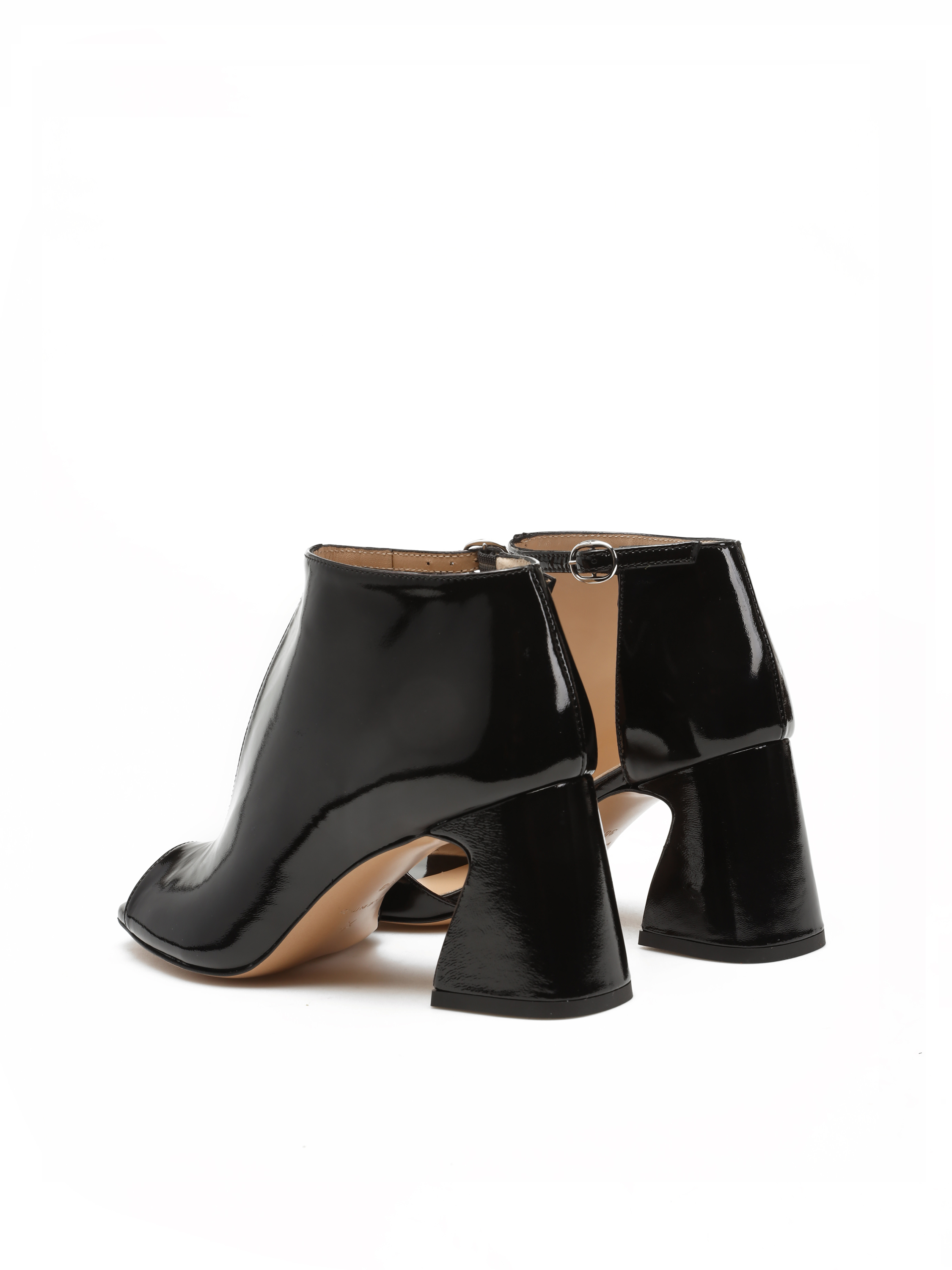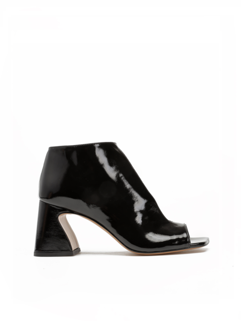 Botki z odkrytymi palcami to Trend sezonu. Cholewka za kostkę w czarnym kolorze wykonana jest z lakierowanej skóry. Zaprojektowana została tak, aby odkrywać wewnętrzną część stopy. Przy kostce zapinana regulowanym paskiem na sprzączkę. Model z modnym, geometrycznym obcasem.