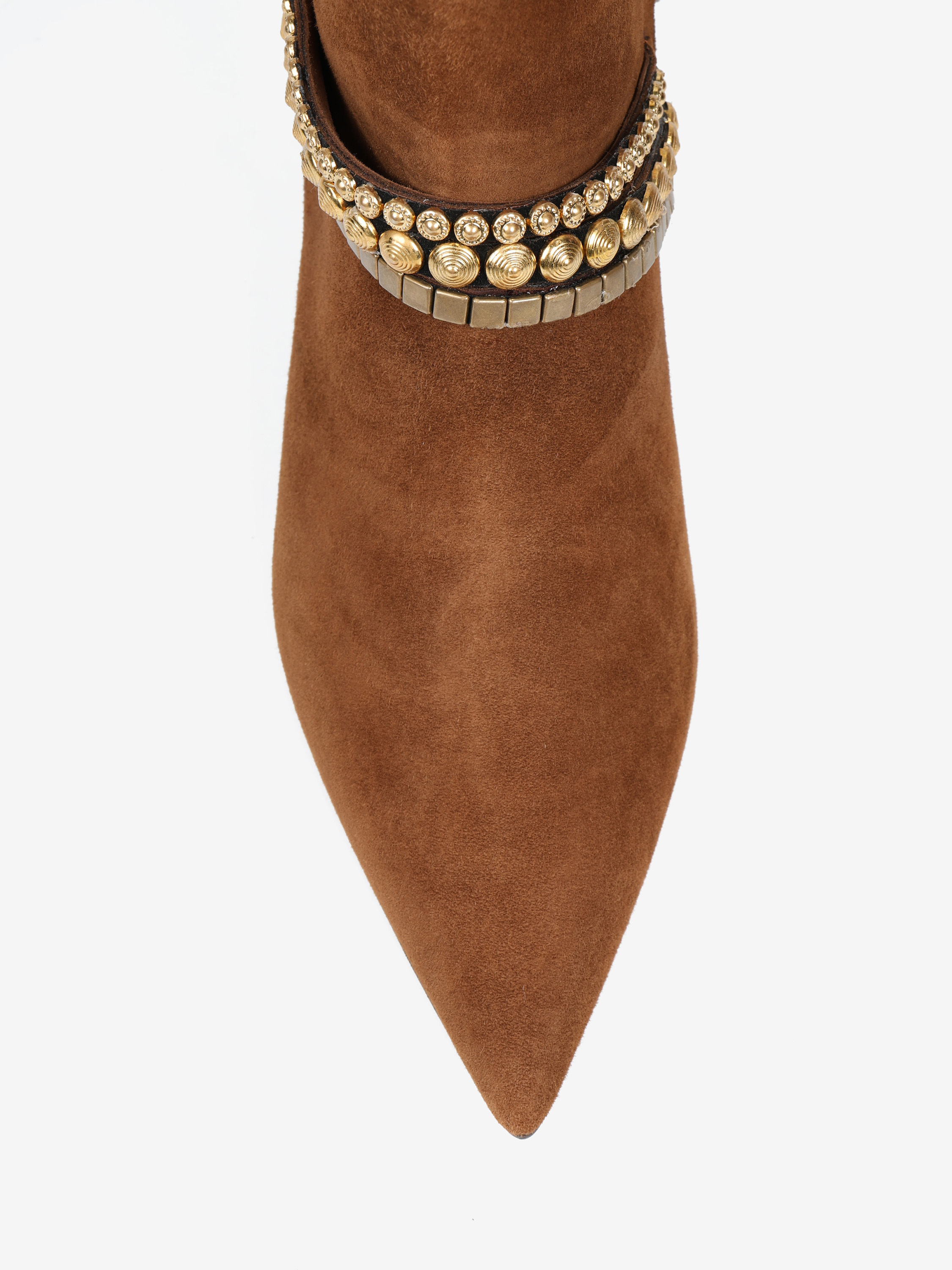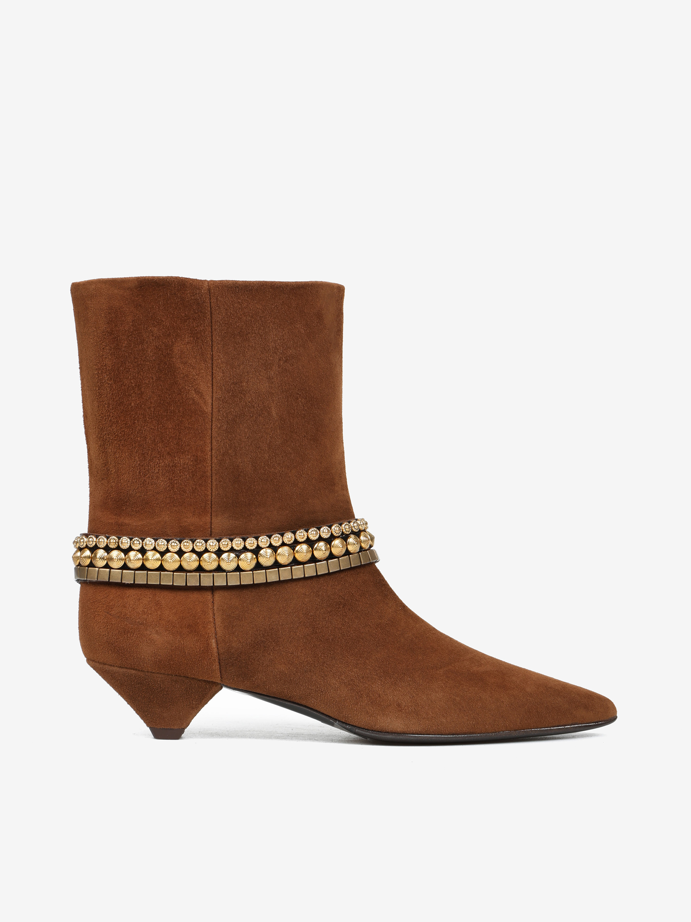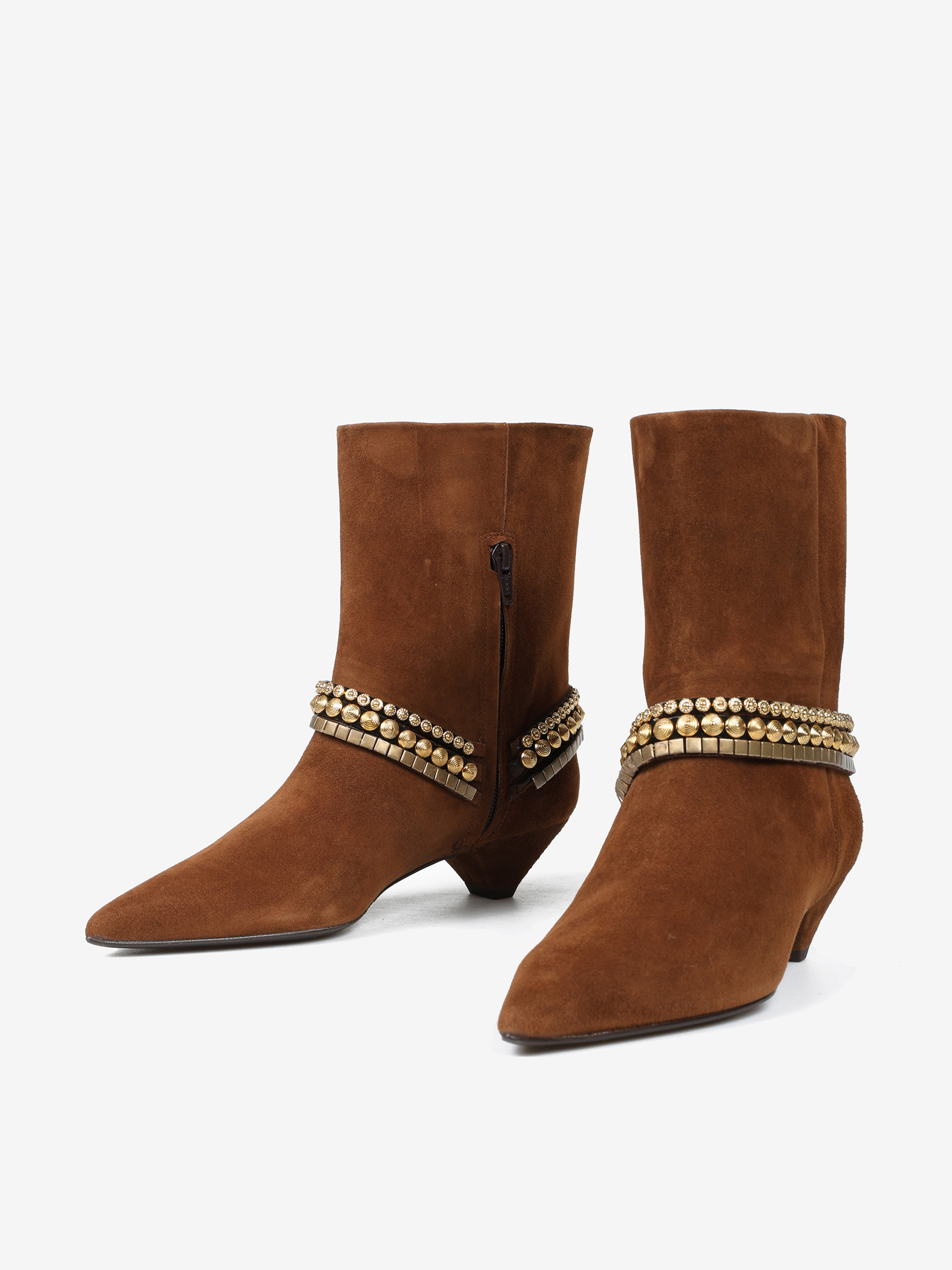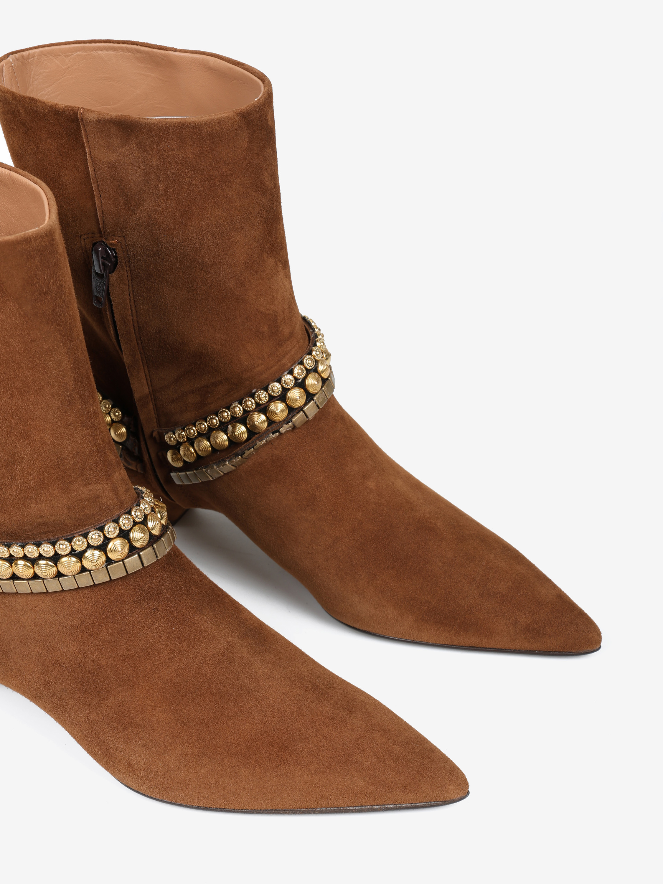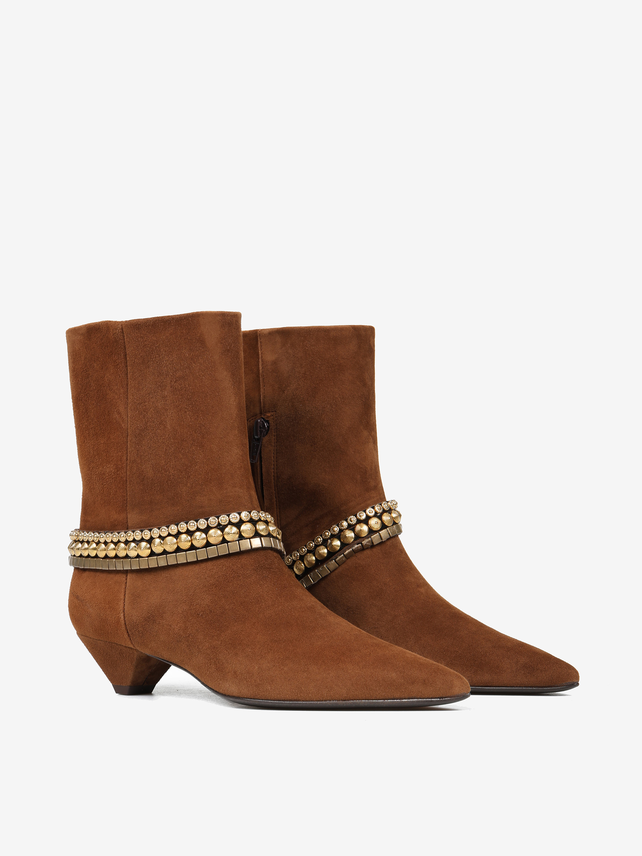 Zamszowe botki na niskiej szpilce, z noskiem w szpic. Zapięcie na suwak i ozdobne bransoletki na kostce.