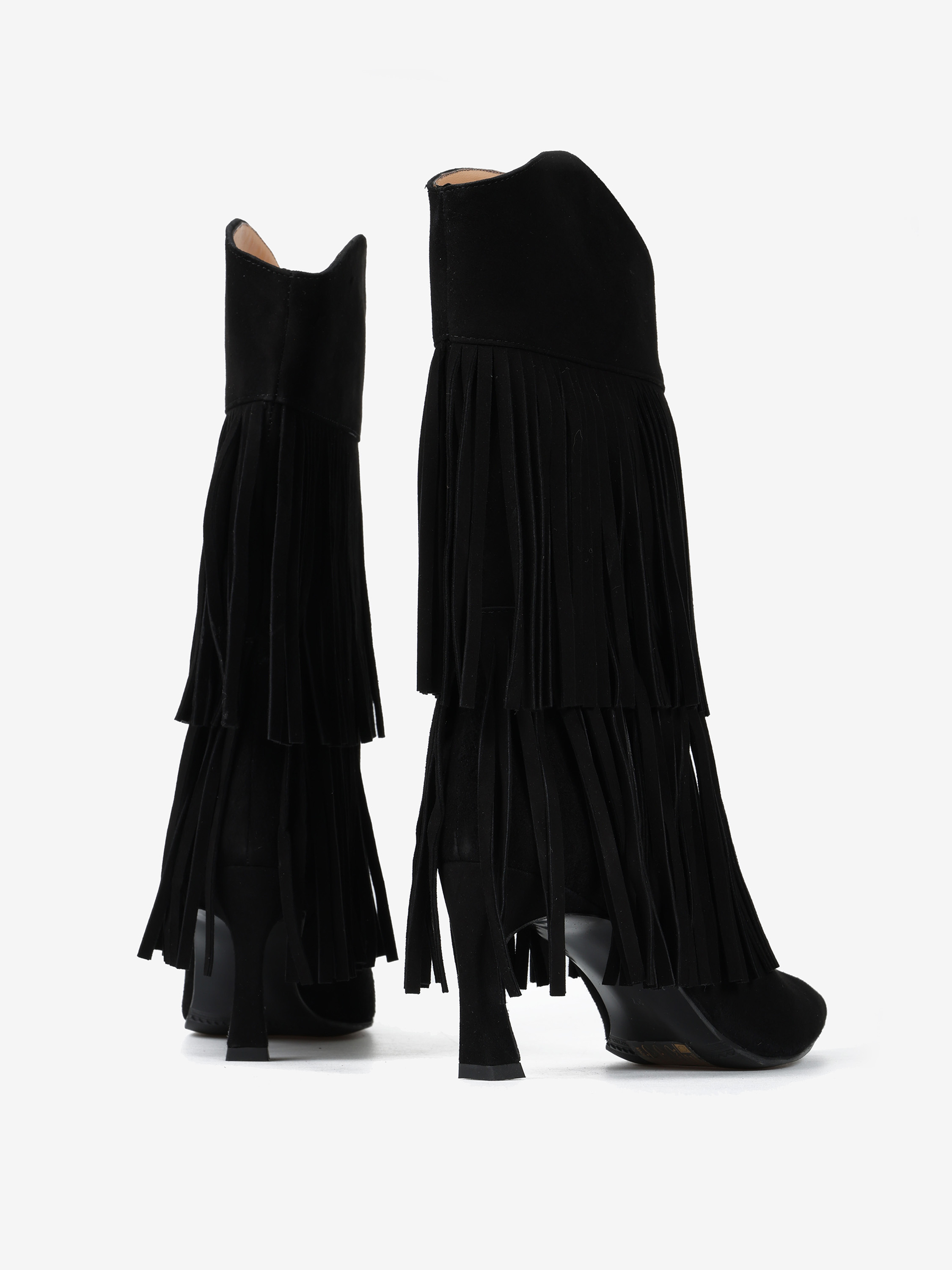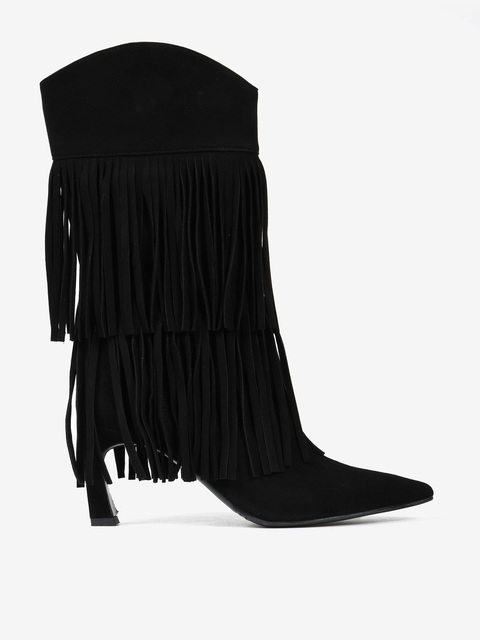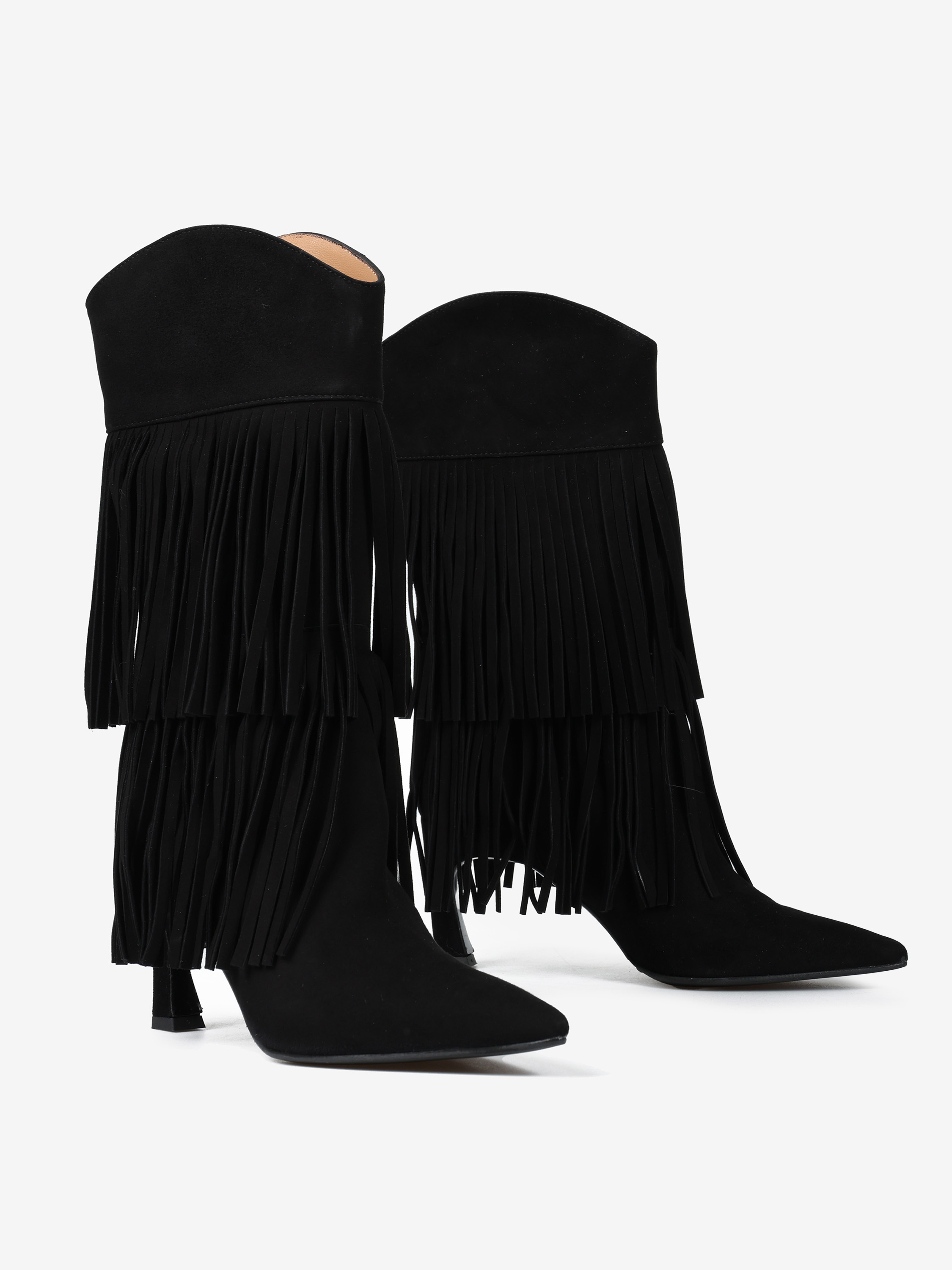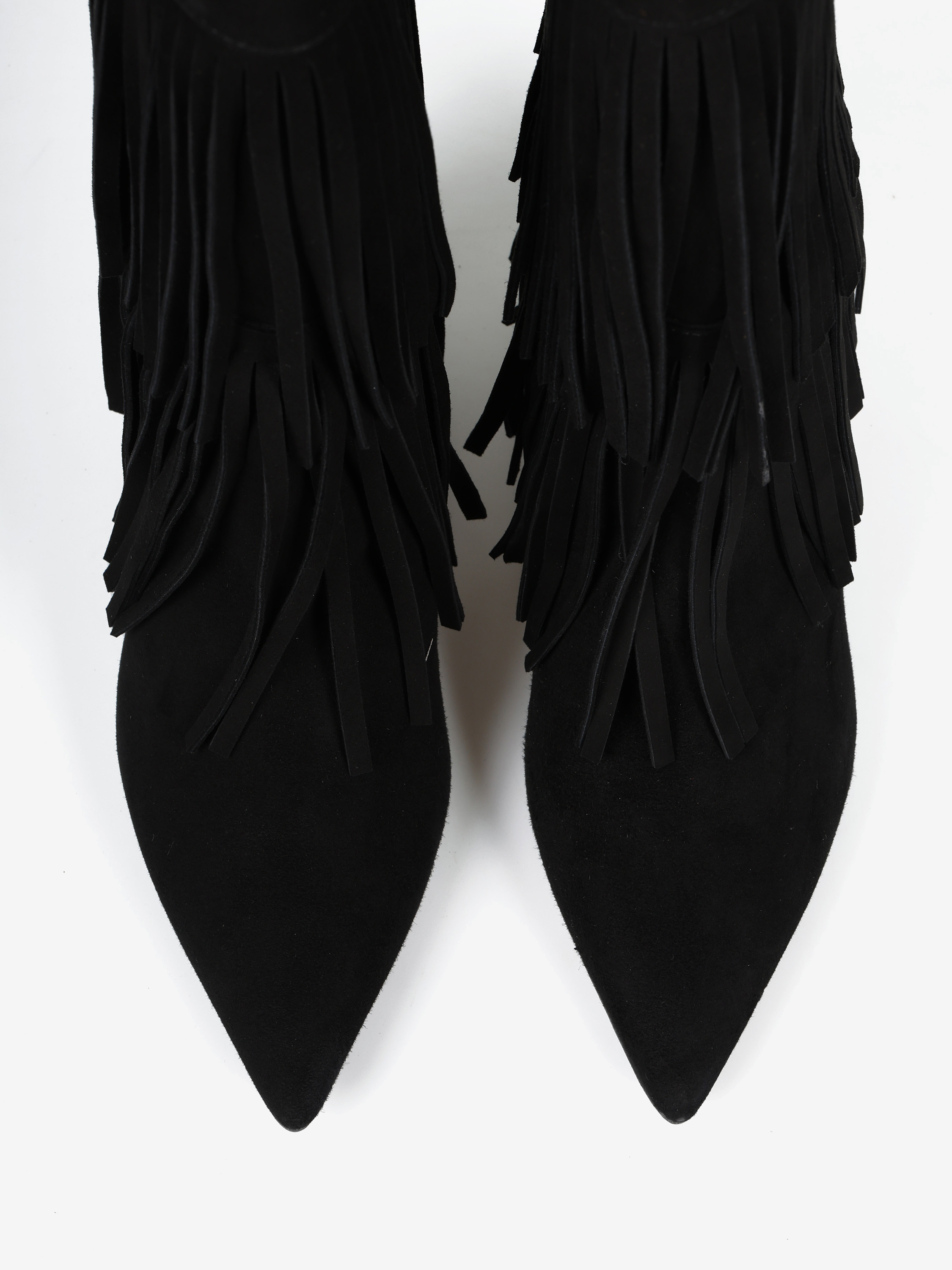 Wsuwane, zamszowe botki na szpilce. Noski w szpic i ozdobne frędzle na cholewce.