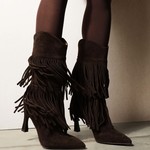 Wsuwane, zamszowe botki na szpilce. Noski w szpic i ozdobne frędzle na cholewce.