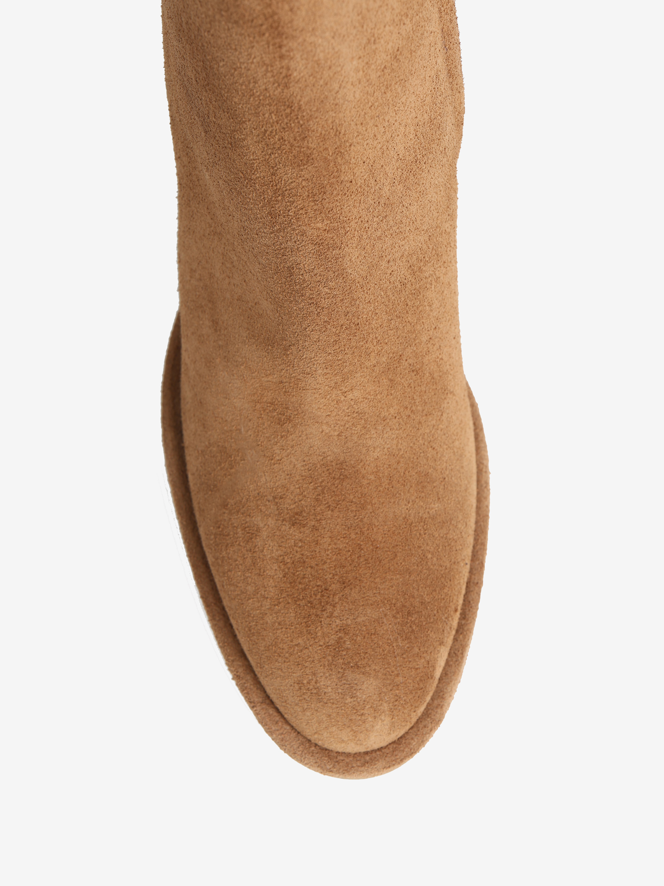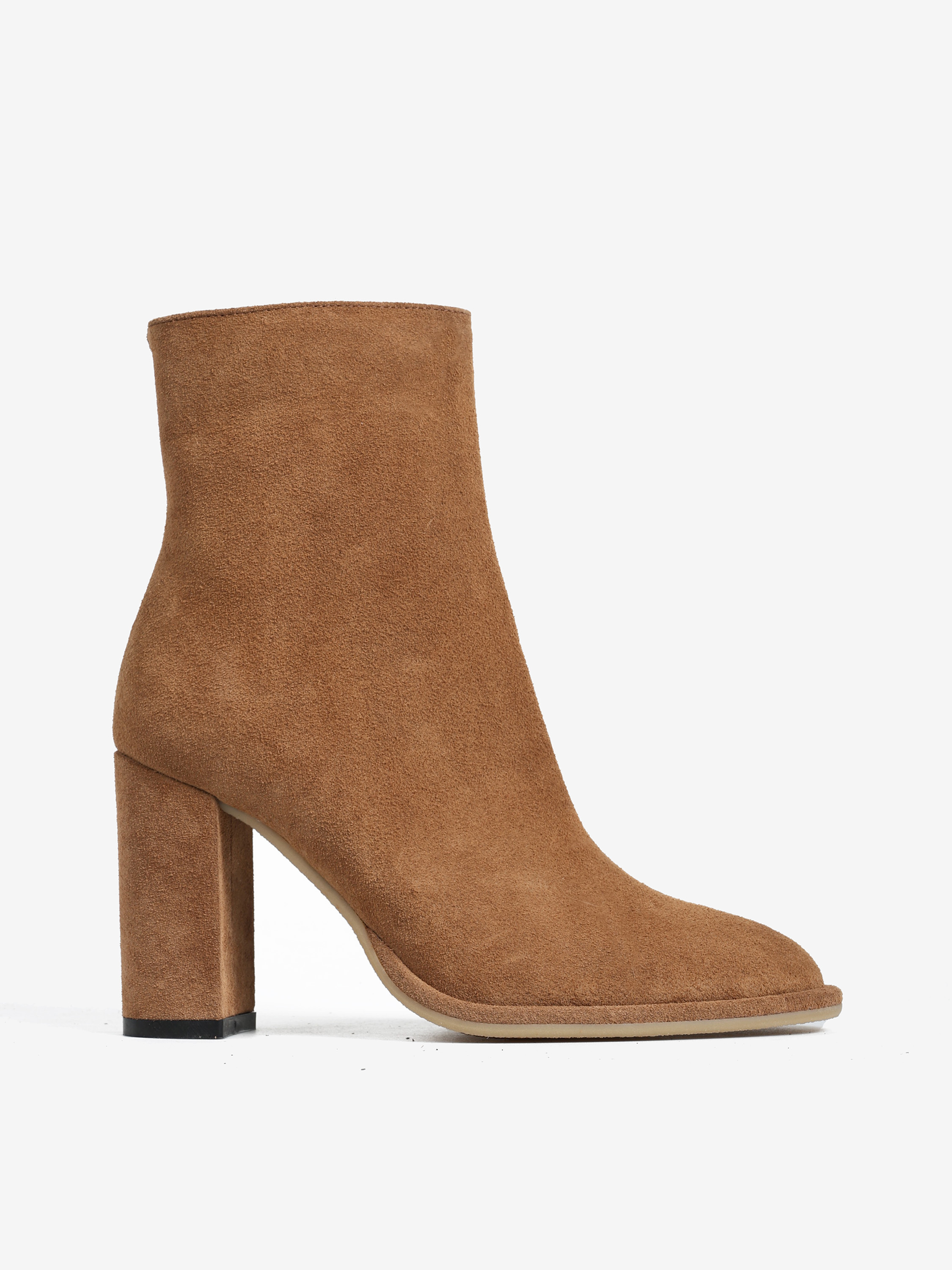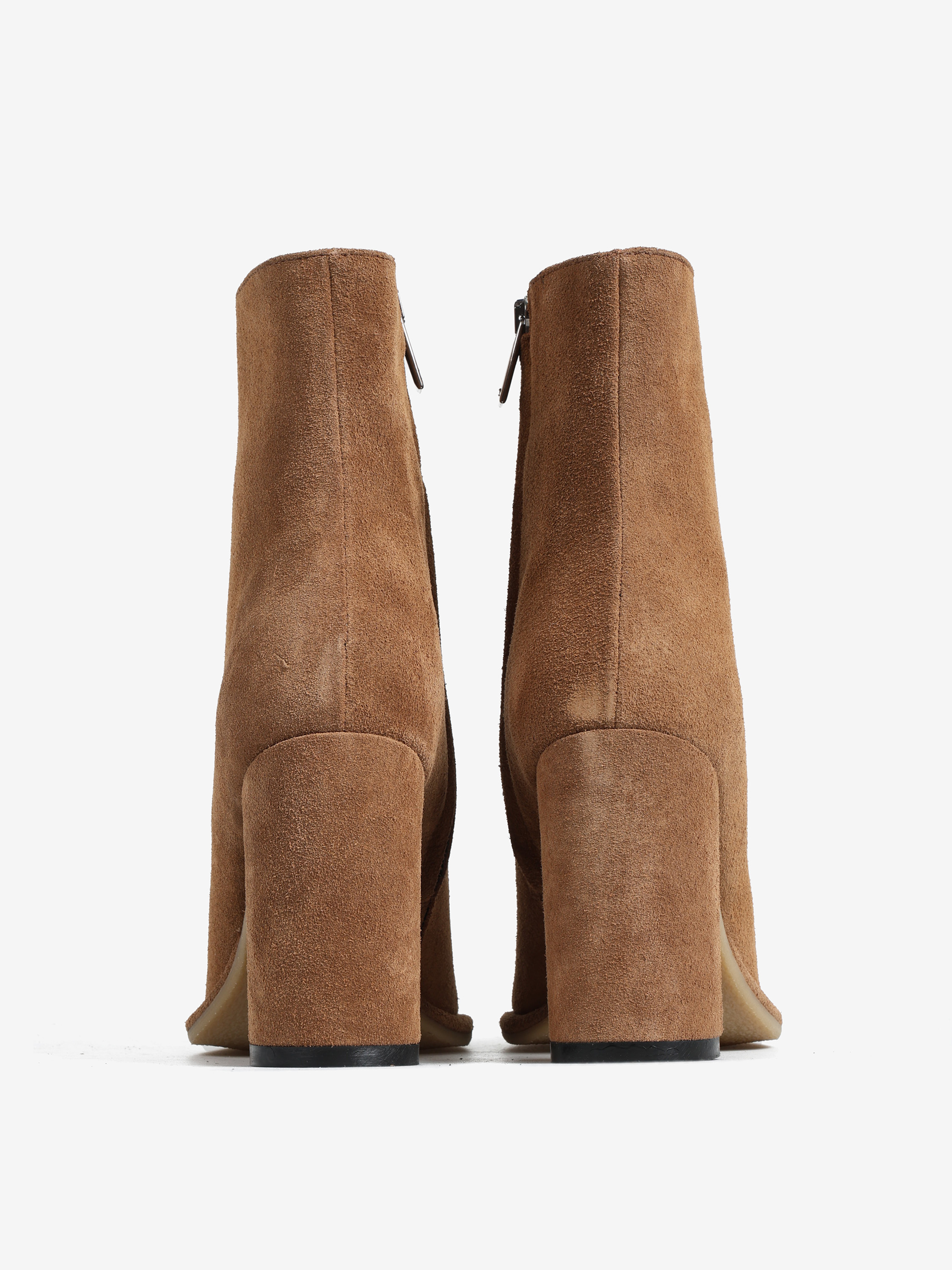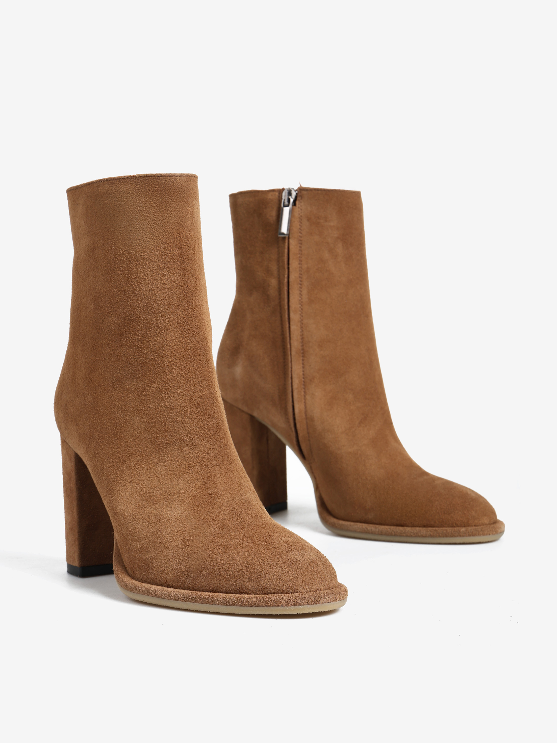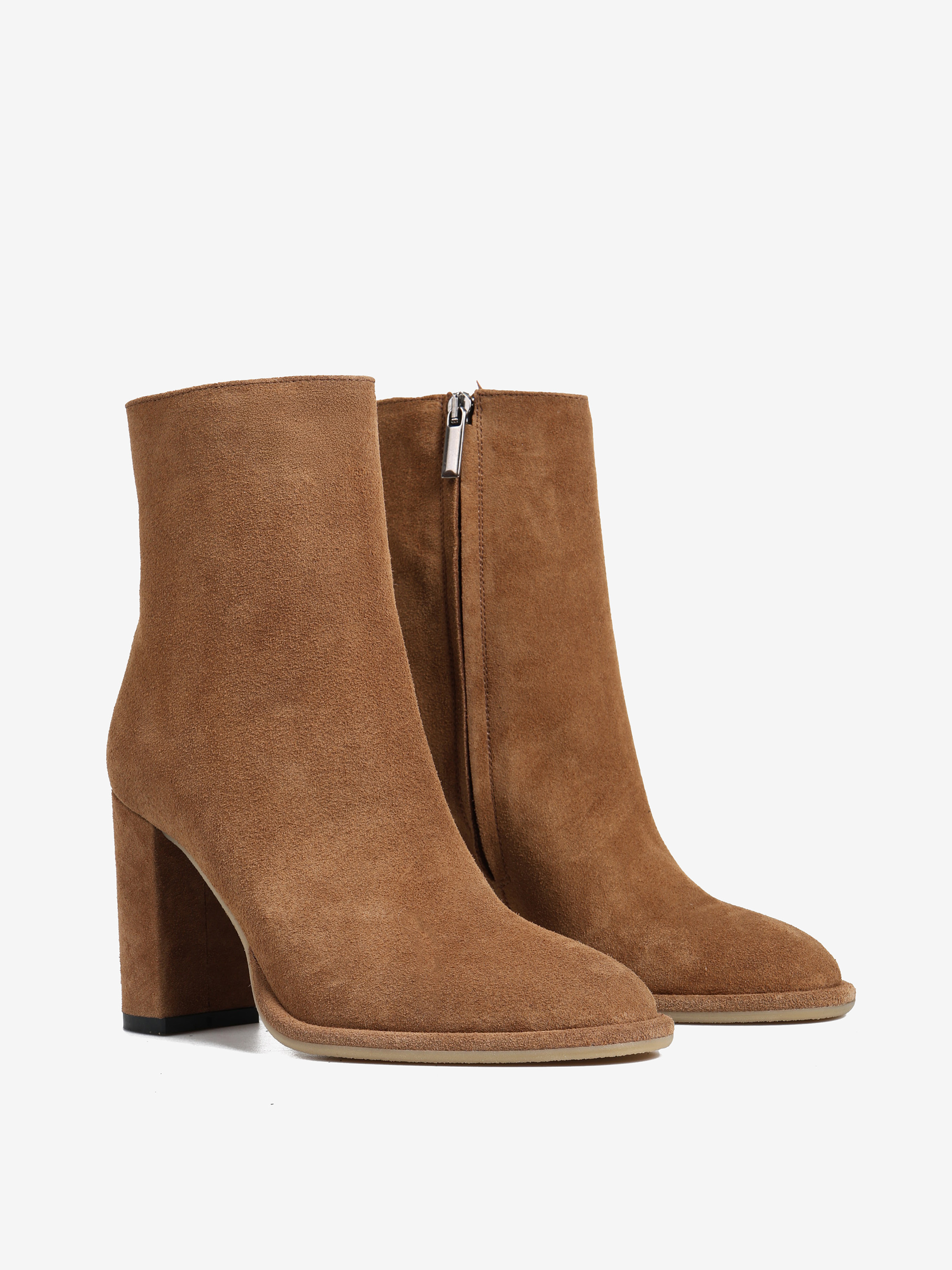 Zamszowe botki na wysokim słupku wykonane z rudego zamszu. Zapięcie na suwak.