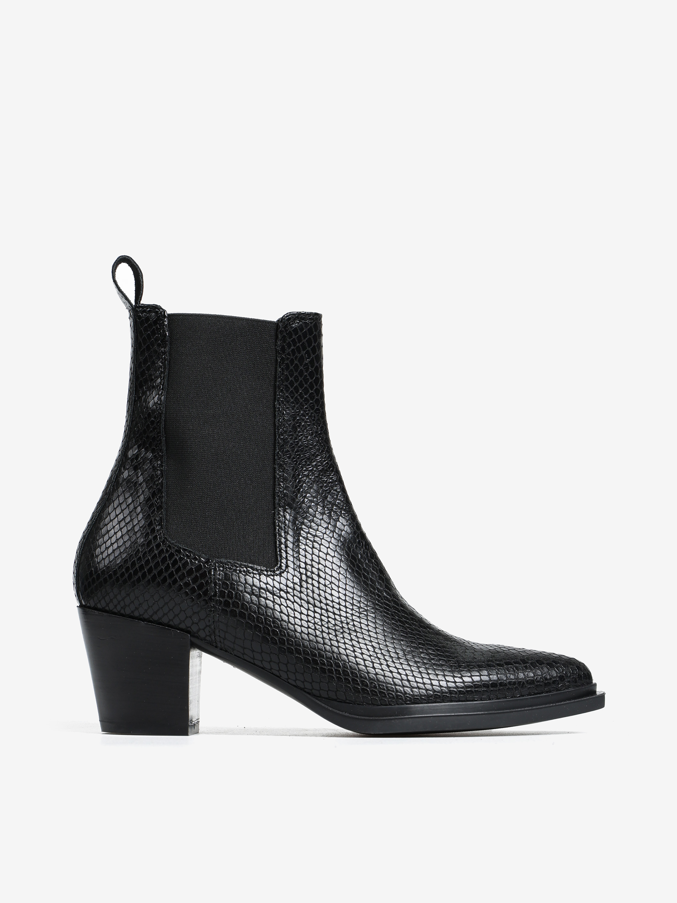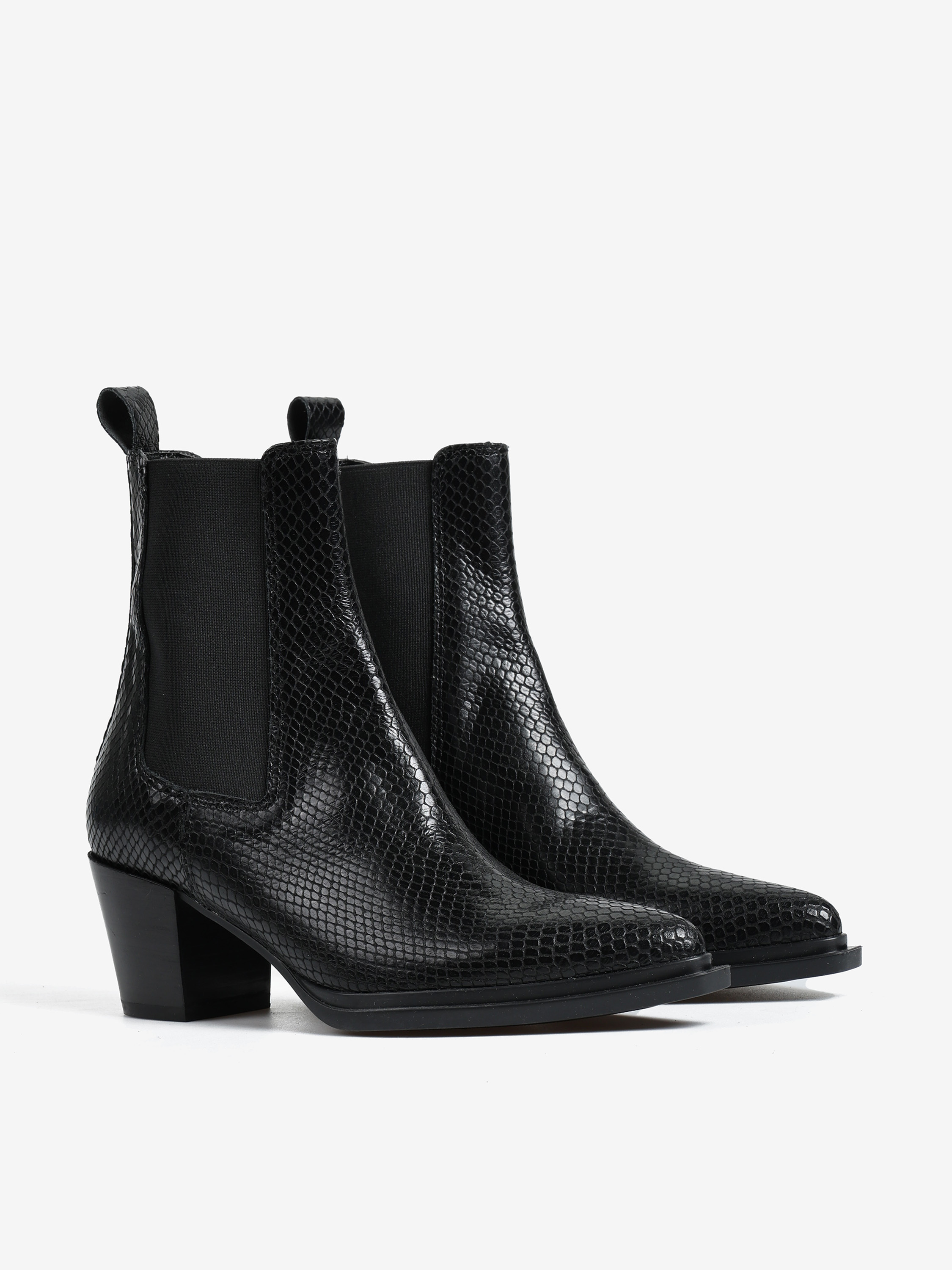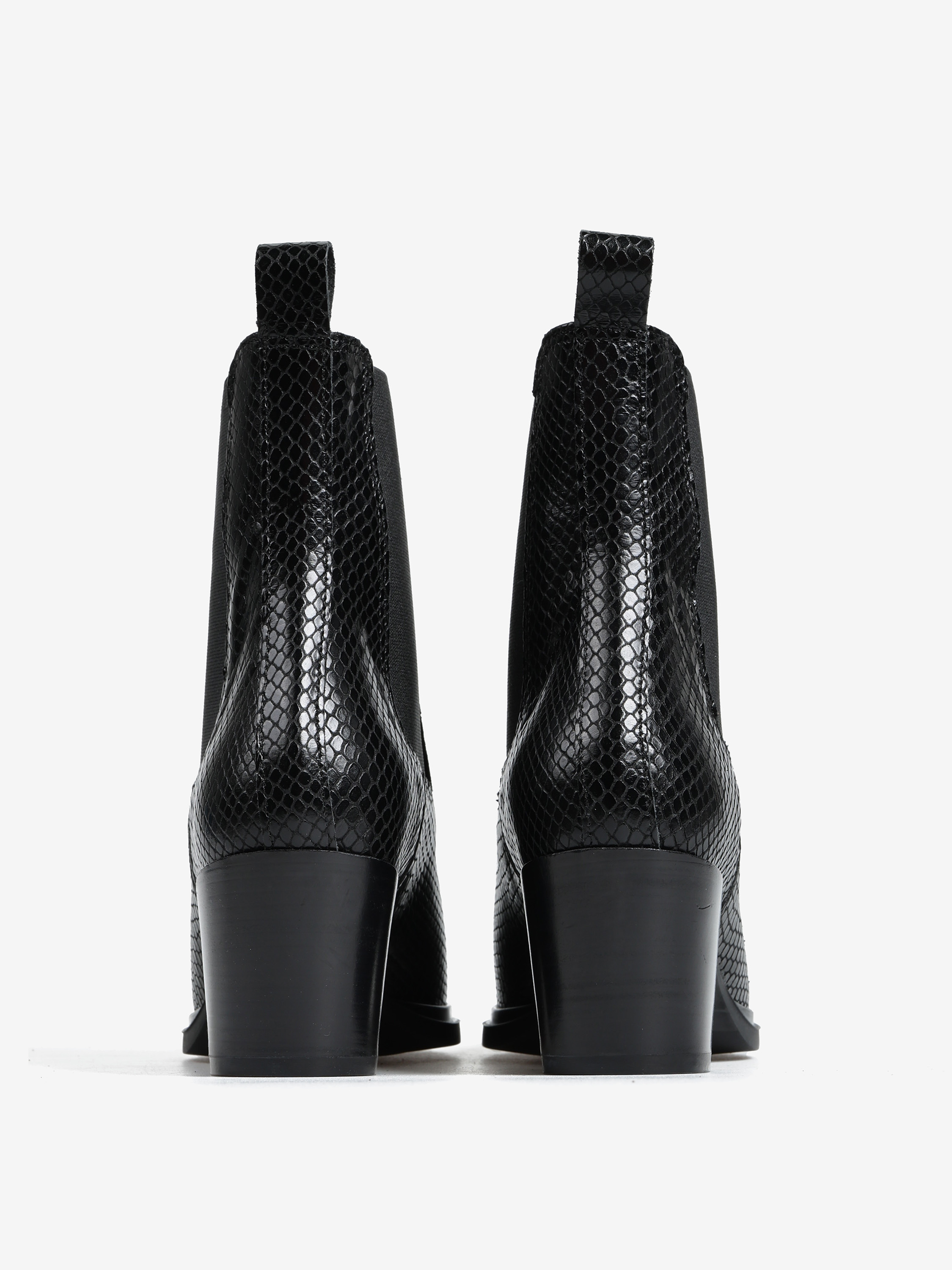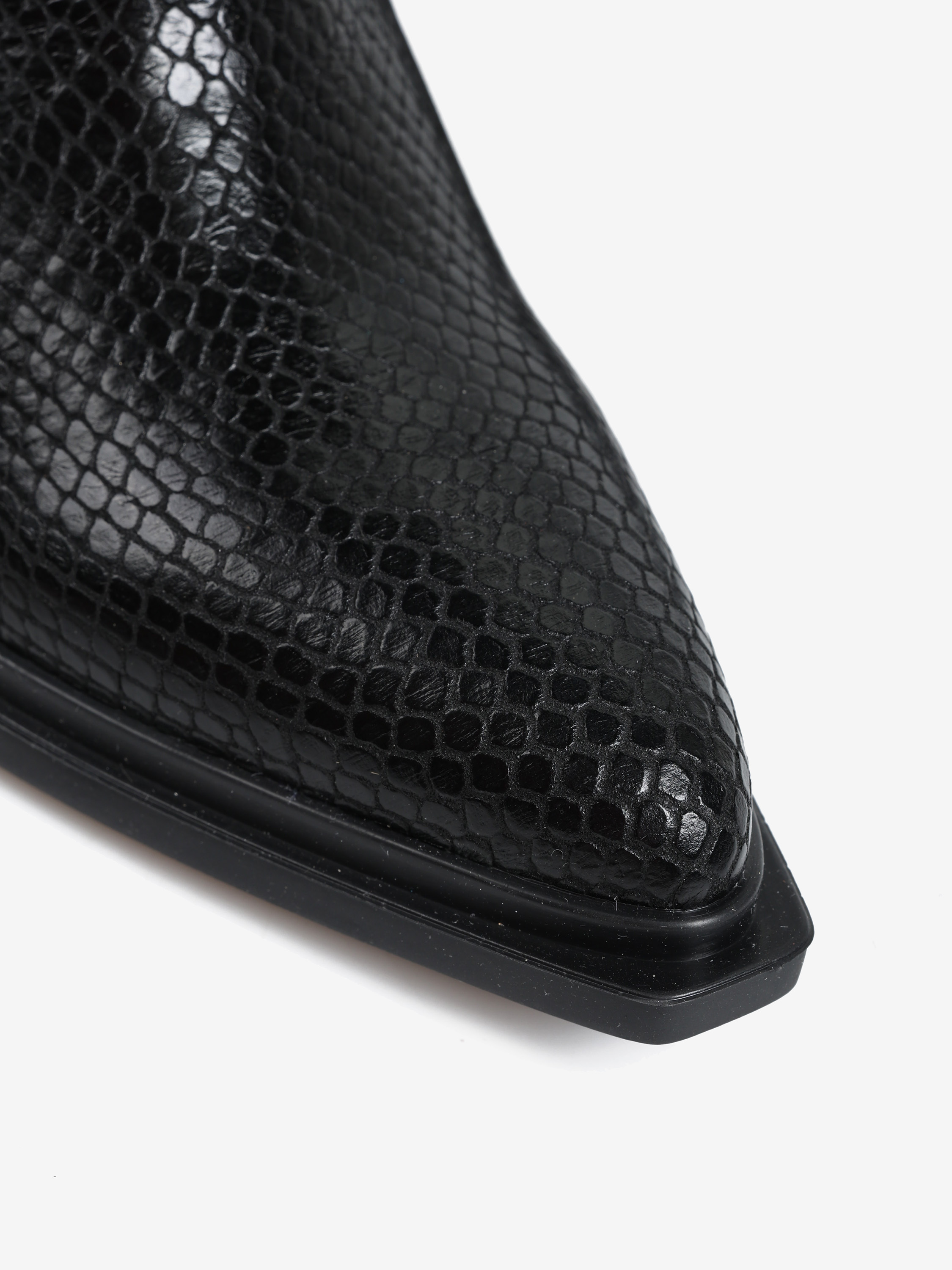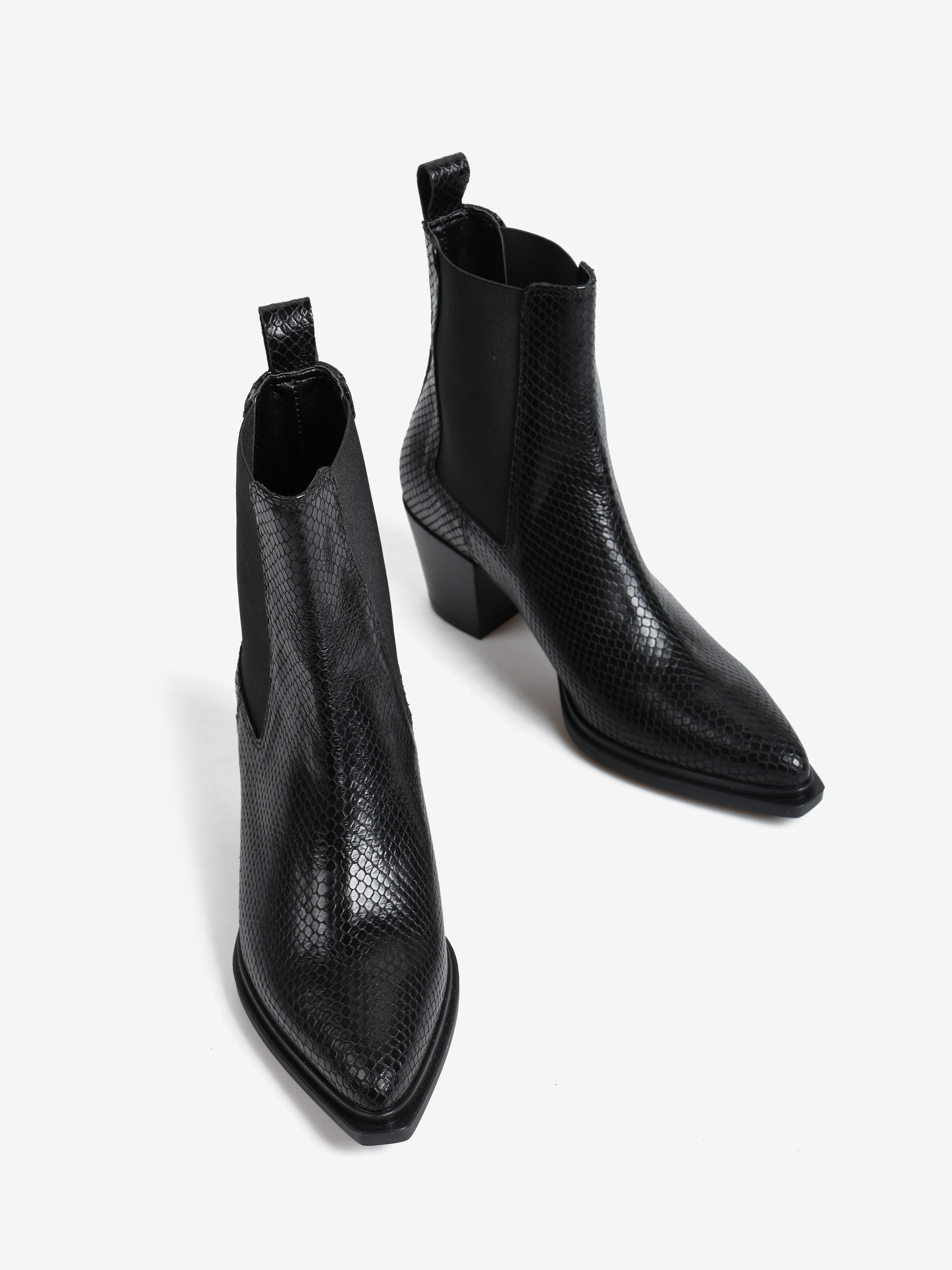 Wsuwane botki na słupku wykonane ze skóry naturalnej tłoczonej w wężową łuskę. Noski w szpic.