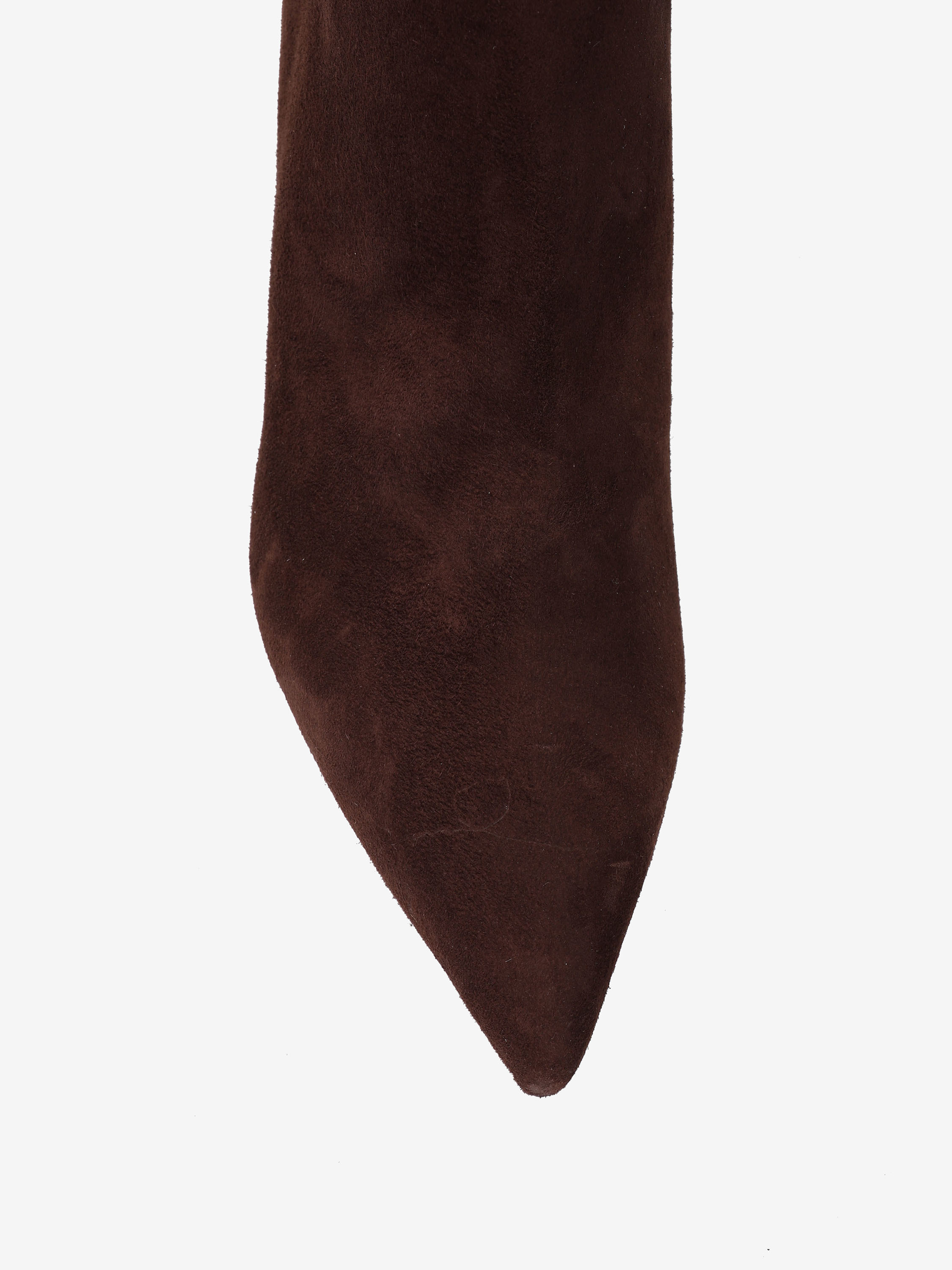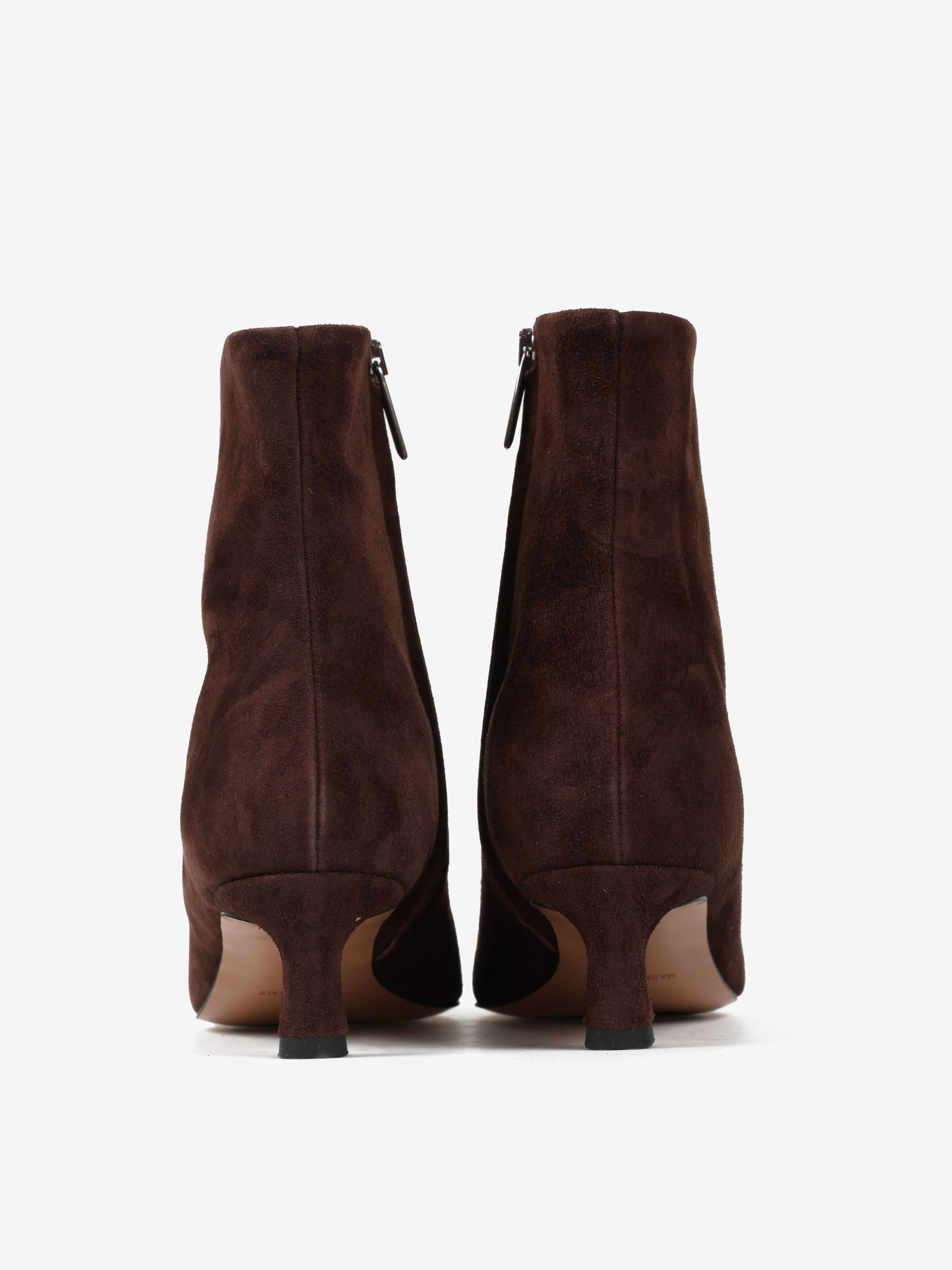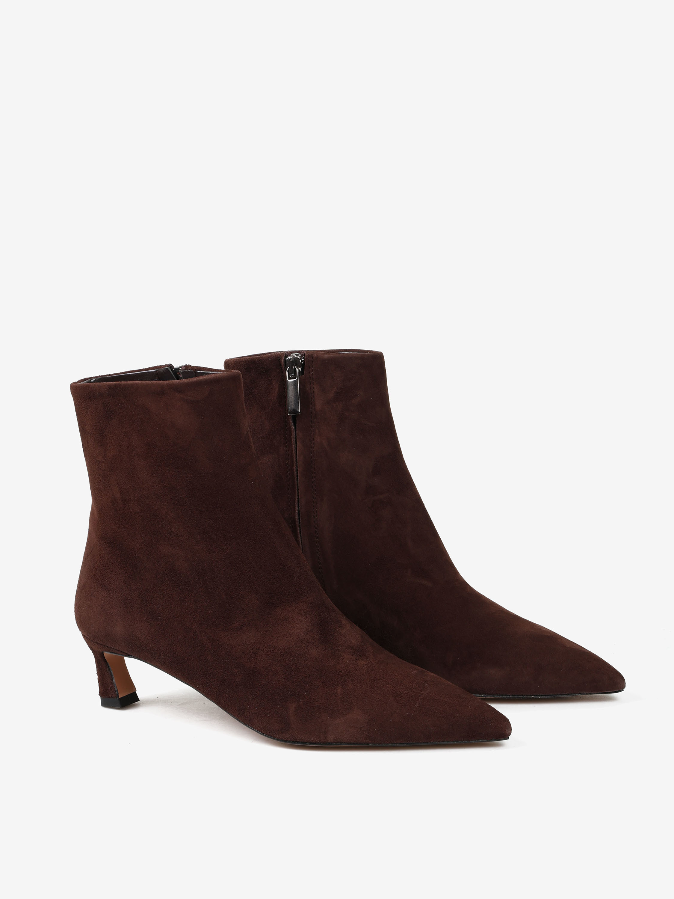 Proste, zamszowe botki na niskiej szpilce. Noski w szpic i zapięcie na suwak.