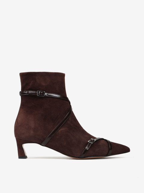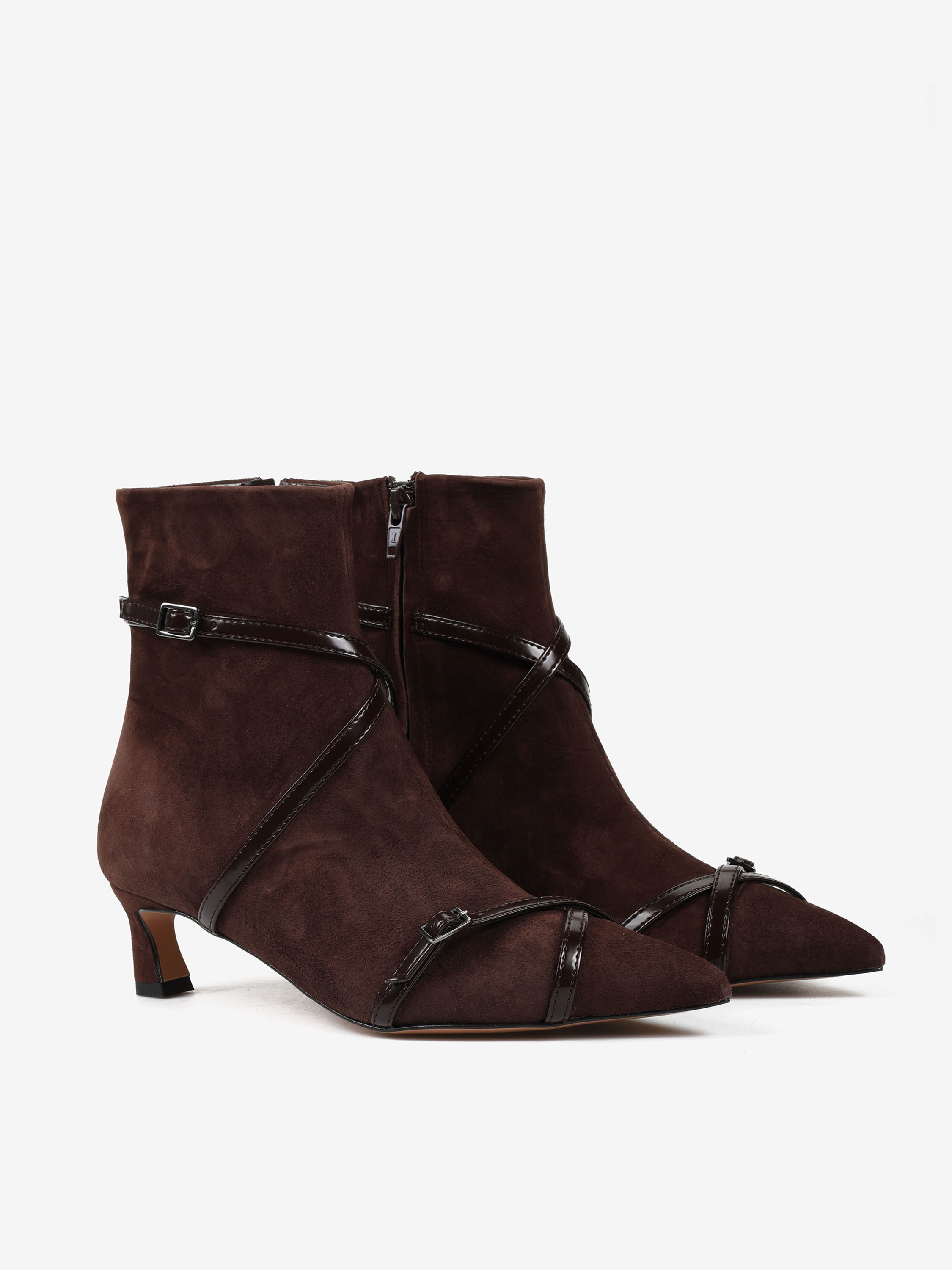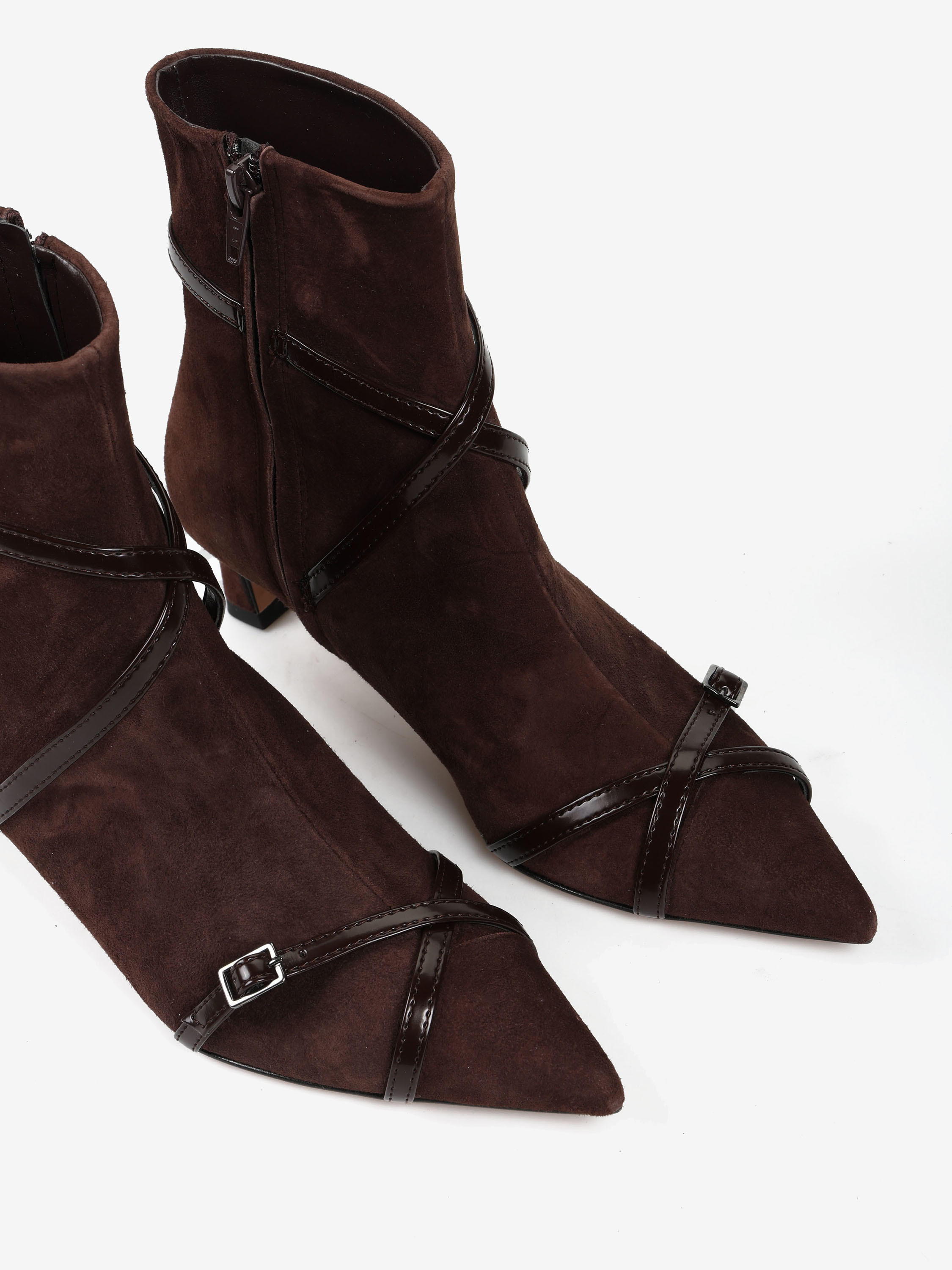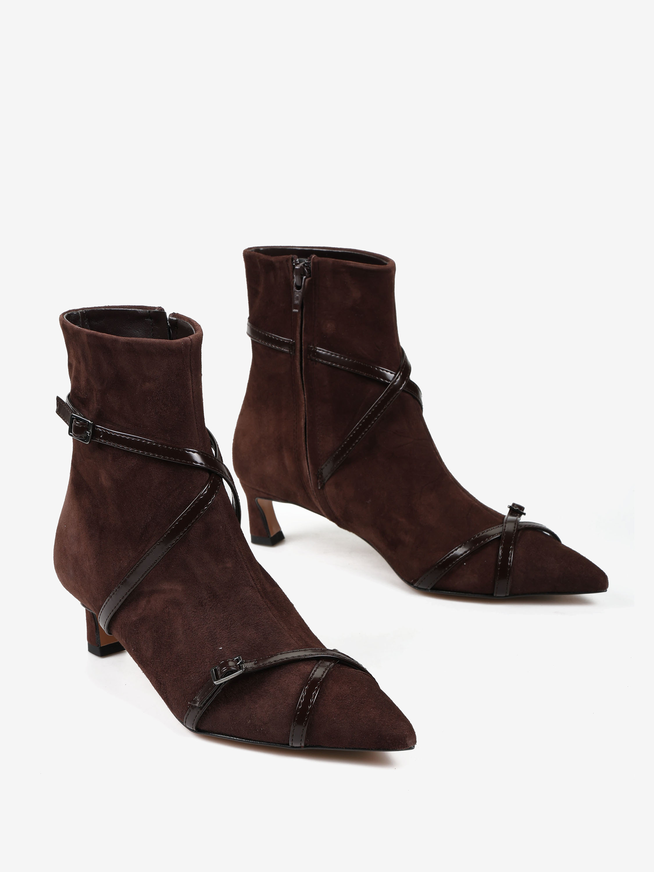 Zamszowe botki z ozdobnymi paseczkami, na niskiej szpilce. Noski w szpic i zapięcie na suwak.