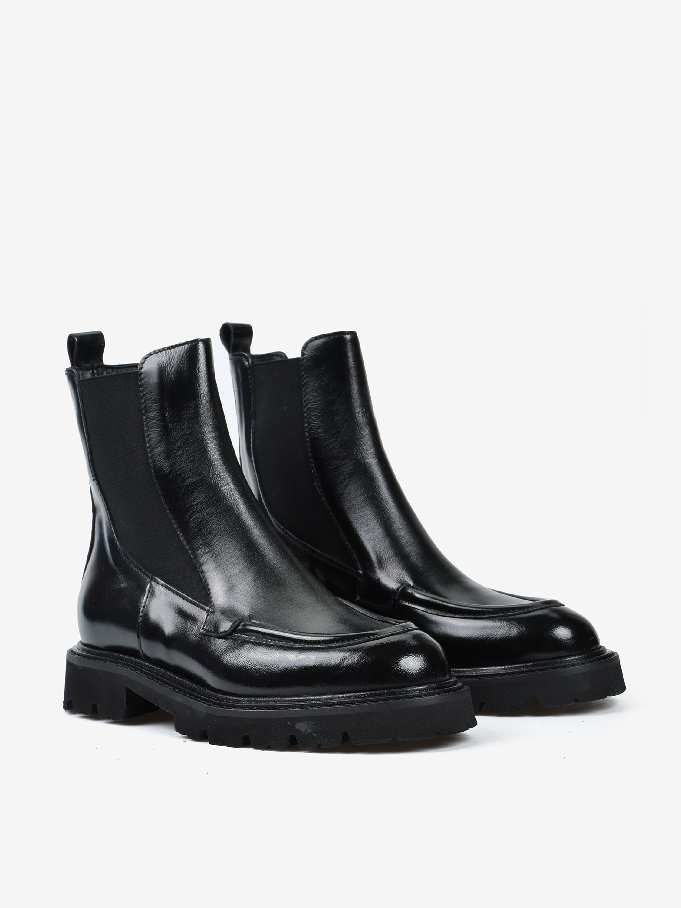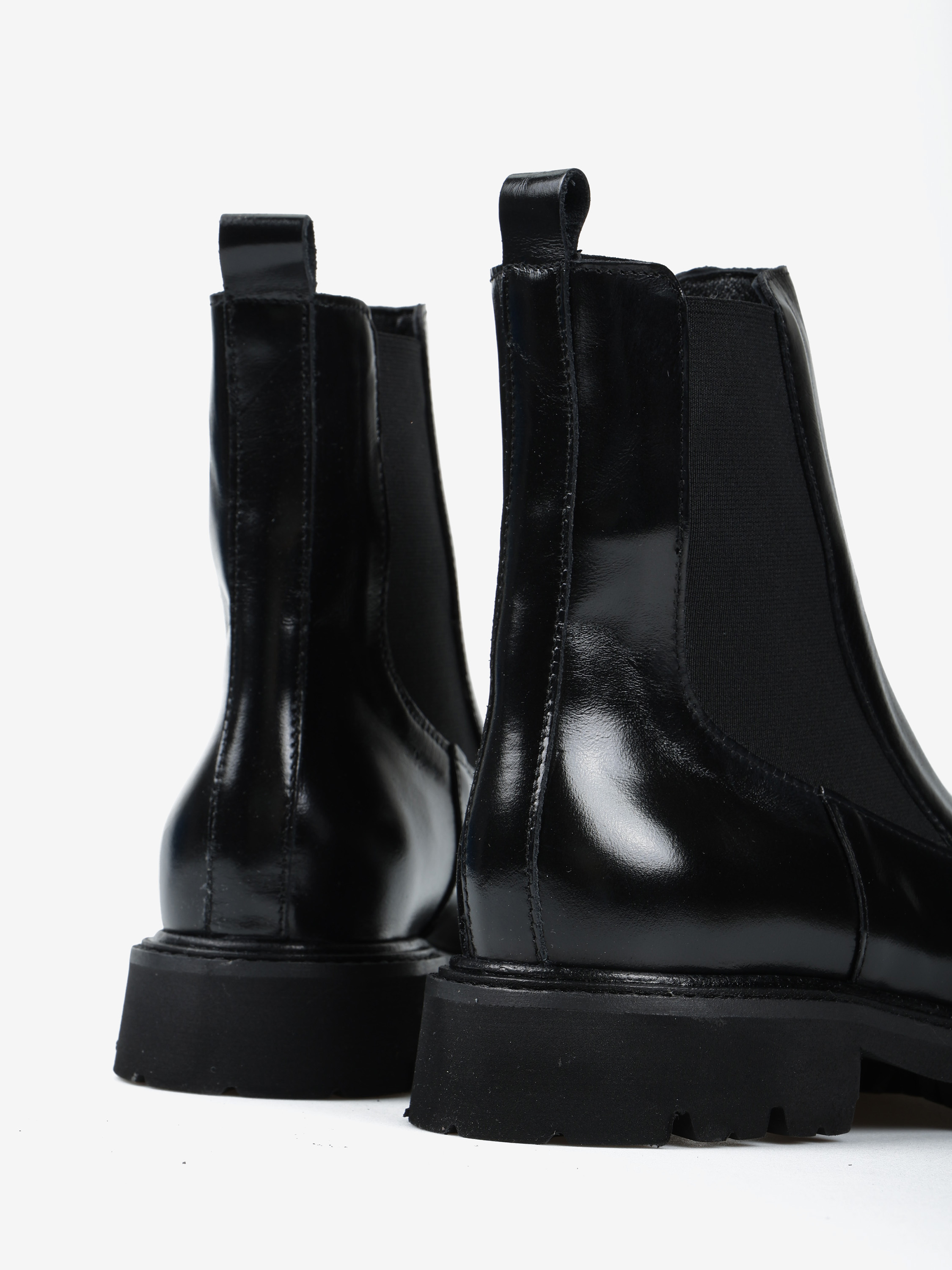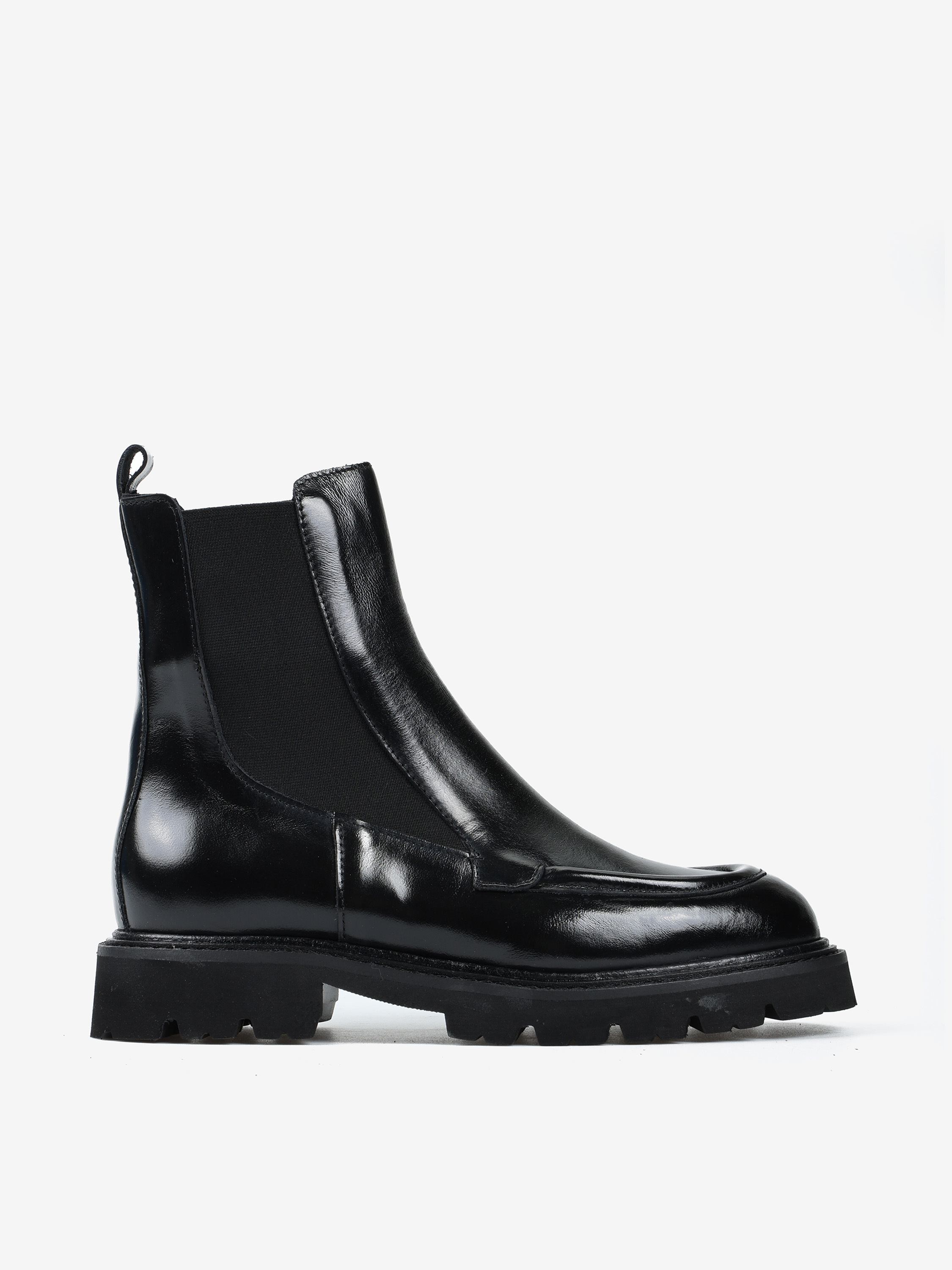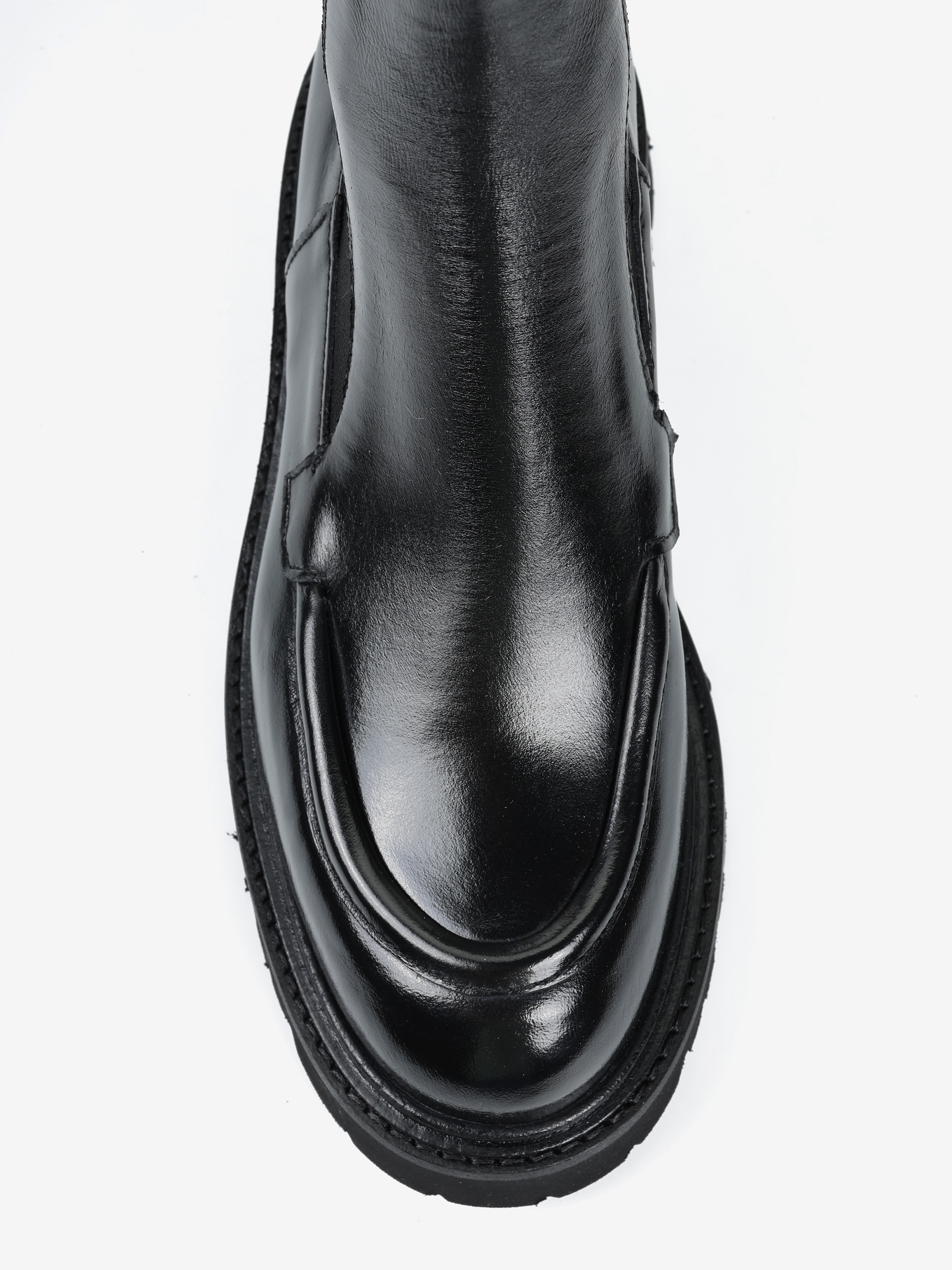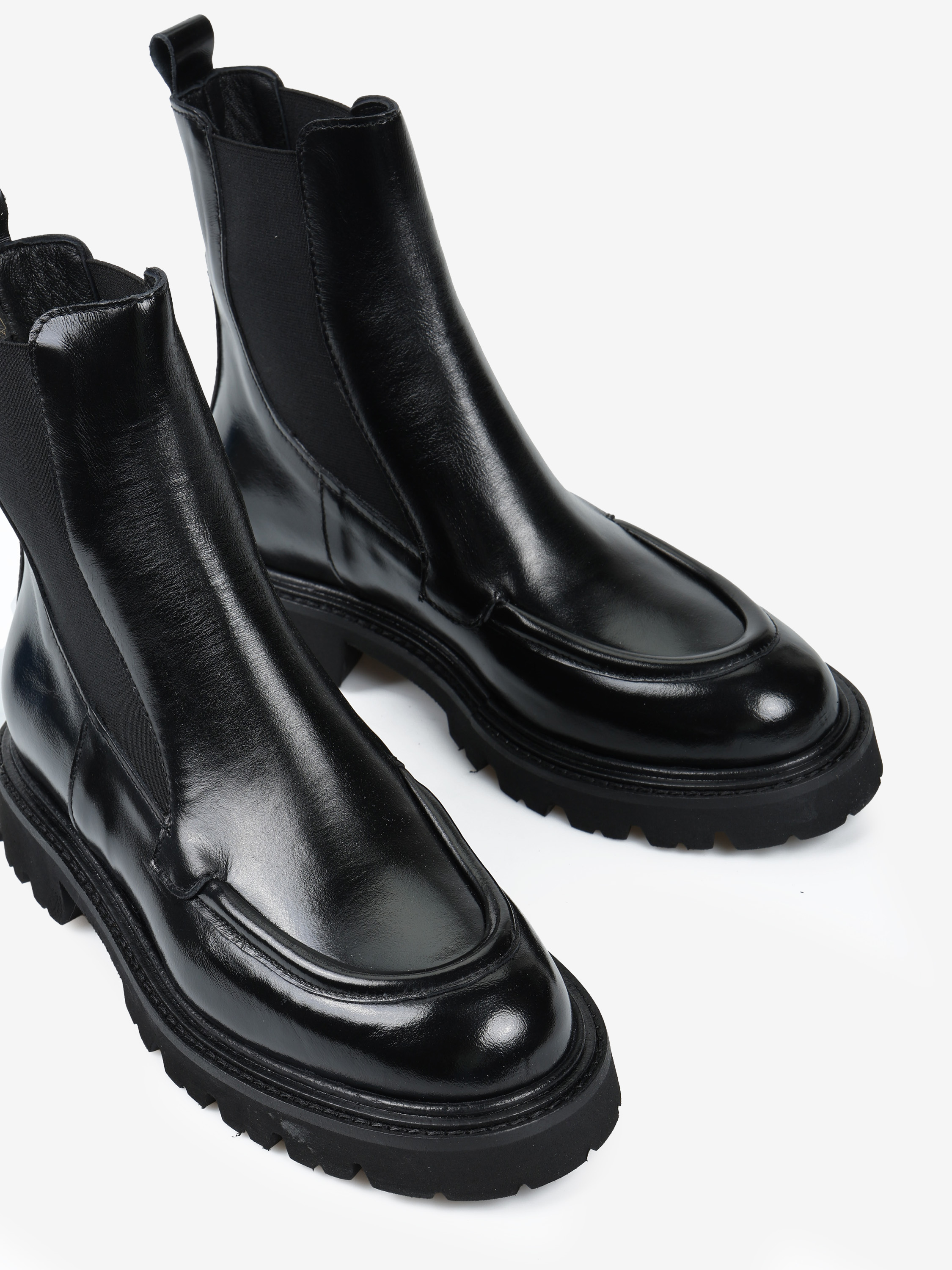 Klasyczne sztyblety na grubszej podeszwie wykonane z wysoko polerowanej skóry.