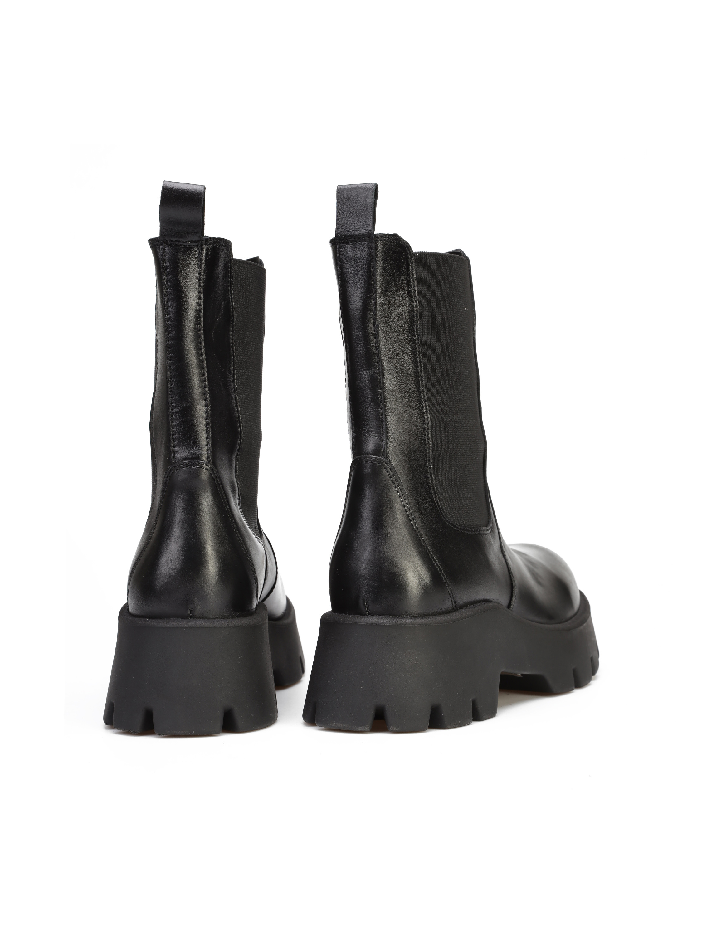 Sztyblety na platformie to must have sezonu. Wsuwana cholewka w czarnym kolorze wykonana jest z naturalnej skóry. Posiada wszytą elastyczną gumę, dzięki czemu idelanie dopasuje się do Twojej nogi. Lekkie i stylowe.