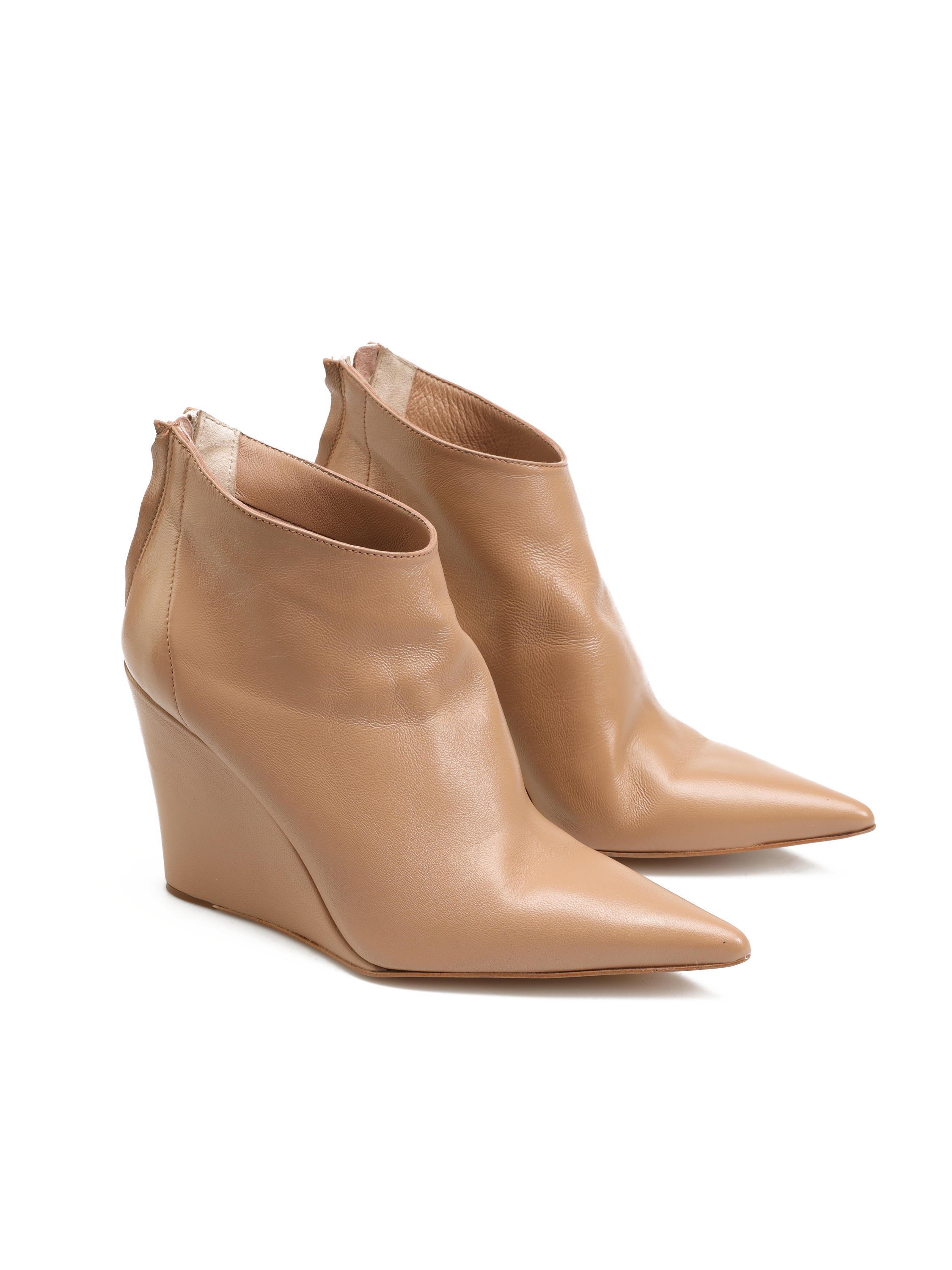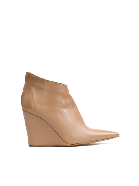 Botki na koturnie HEGO'S Milano w całości wykonane są z naturalnej skóry licowej NAPPA. Cholewka w beżowym kolorze natury posiada zapięcie na zamek błyskawiczny ułatwiający zakładanie i zdejmowanie obuwia. Wysoka koturna oraz nosek w szpic wpisują się w Trendy sezonu.