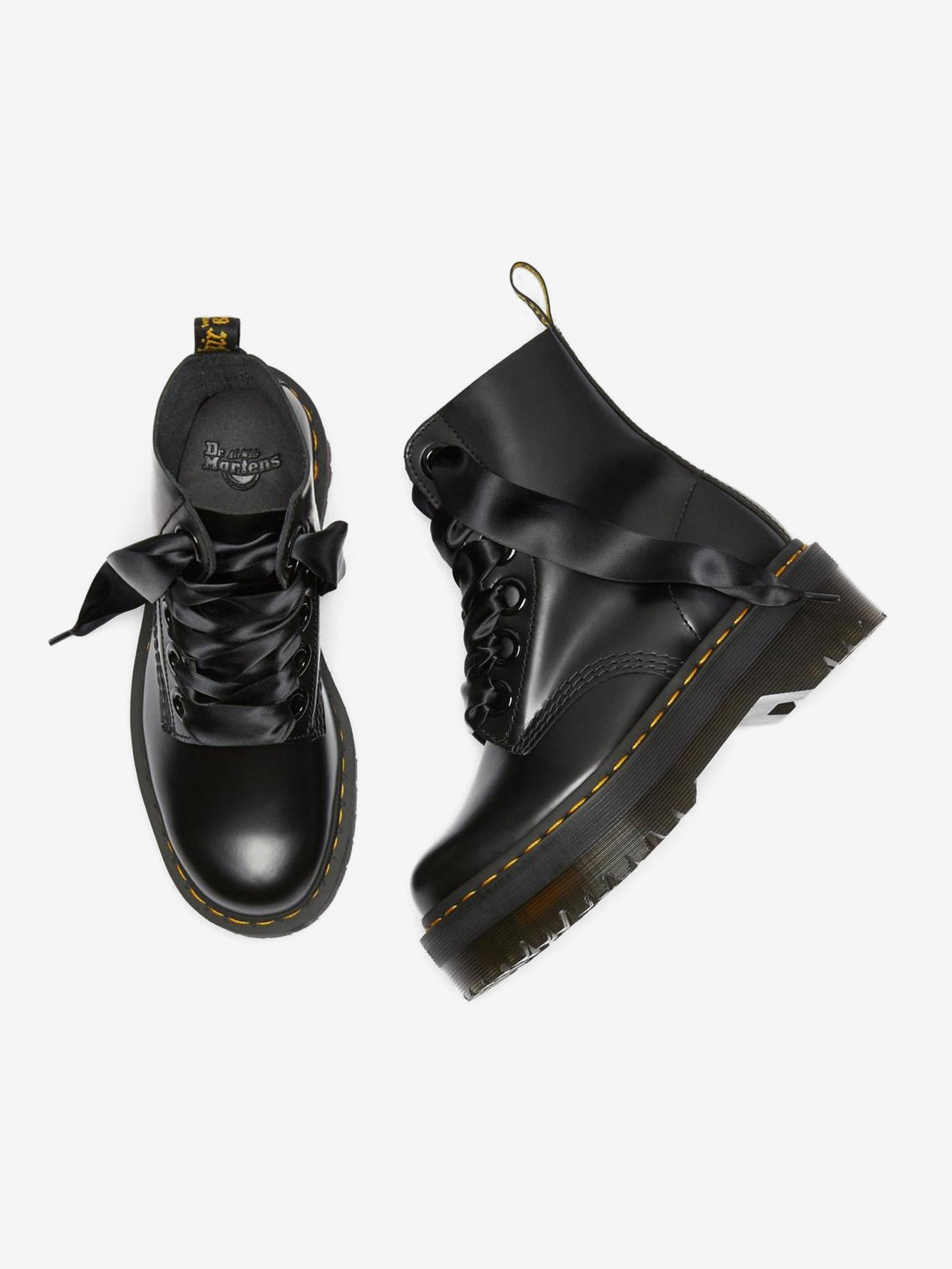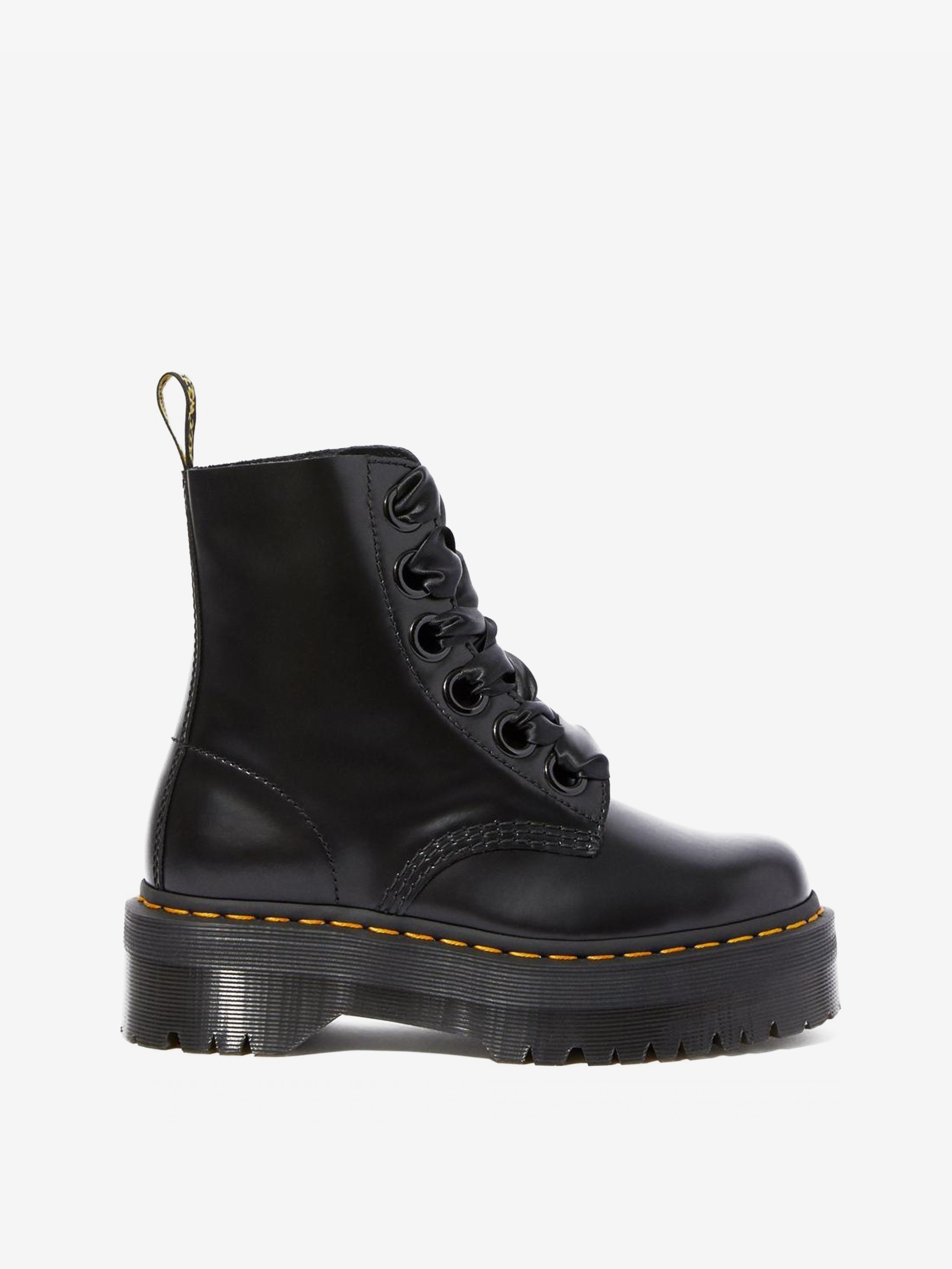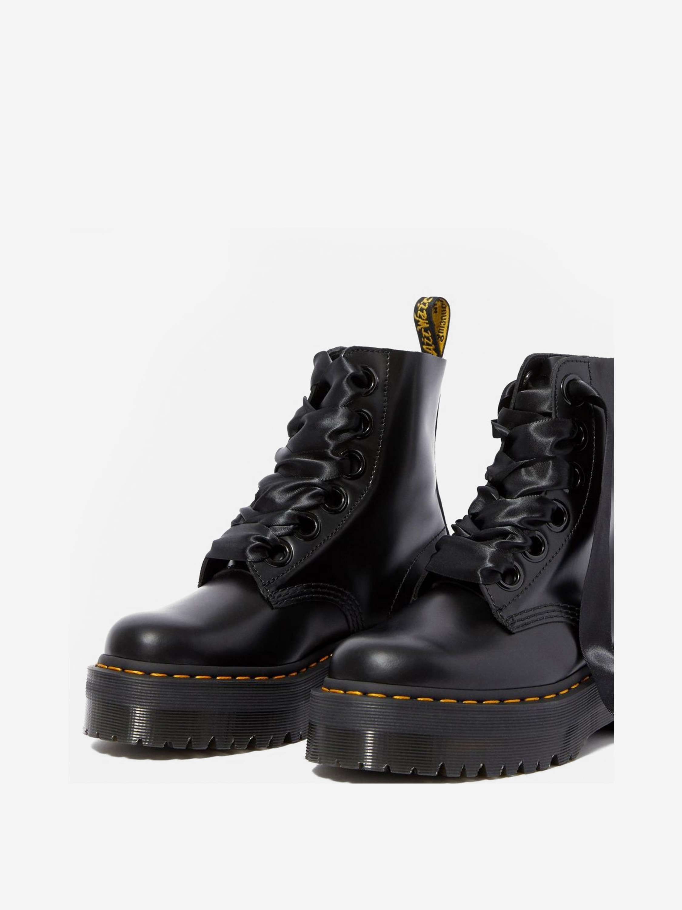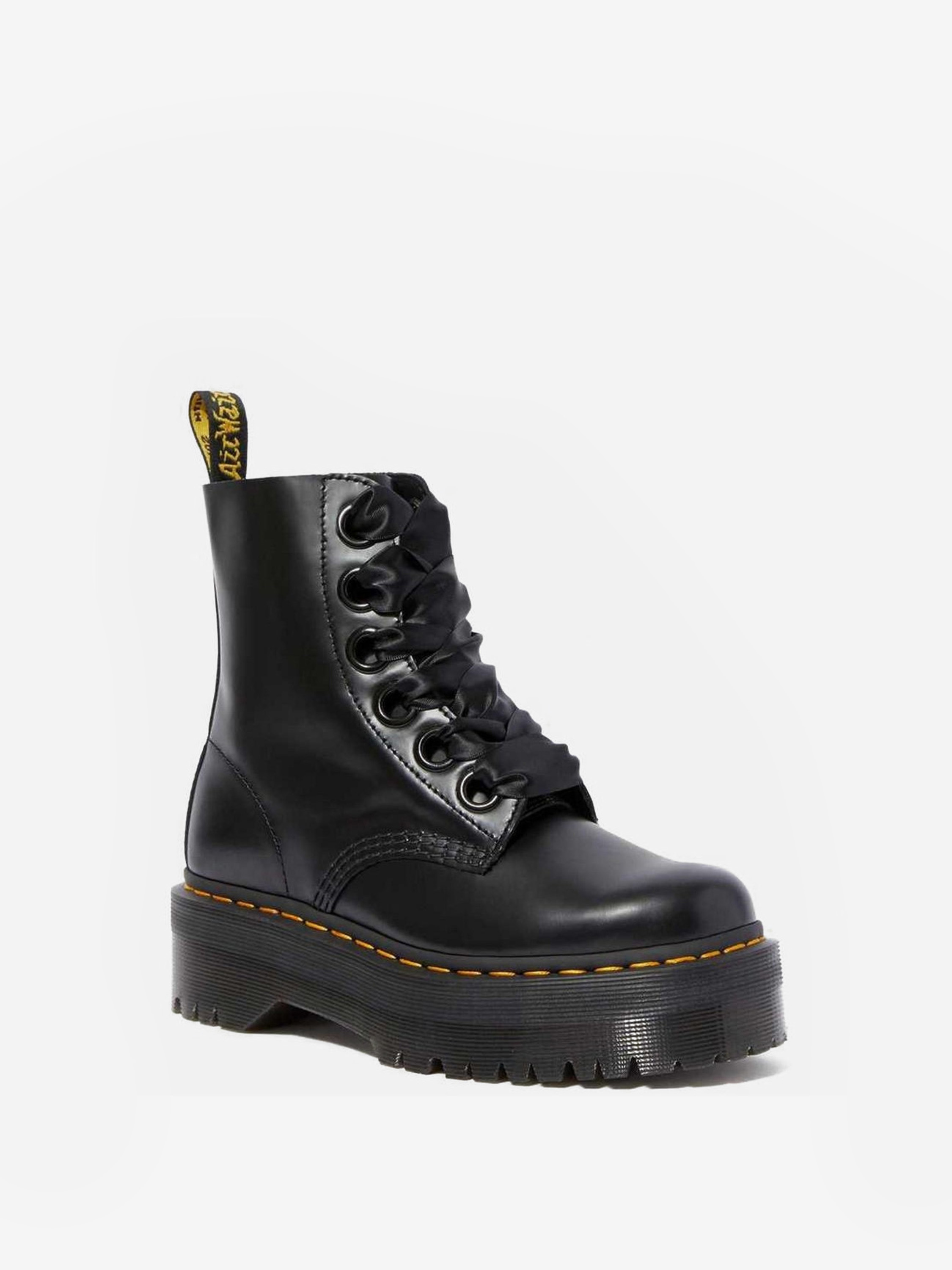 Oryginalne, kultowe, wytrzymałe i z charakterem - to idealne określenie na buty marki Dr. Martens. Ponadczasowe modele, które wpisały się w kanony popkultury, do dziś cieszą się wielką popularnością. Model Molly w czarnej wersji kolorystycznej z charakterystycznym, żółtym przeszyciem odzwierciedla klasyczny krój, który tym razem wzbogacony został o platformę. Dzięki solidnej cholewce ze skóry oraz odpornej na ścieranie podeszwie z wbudowaną poduszką powietrzną są niezwykle wygodne i posłużą przez lata.