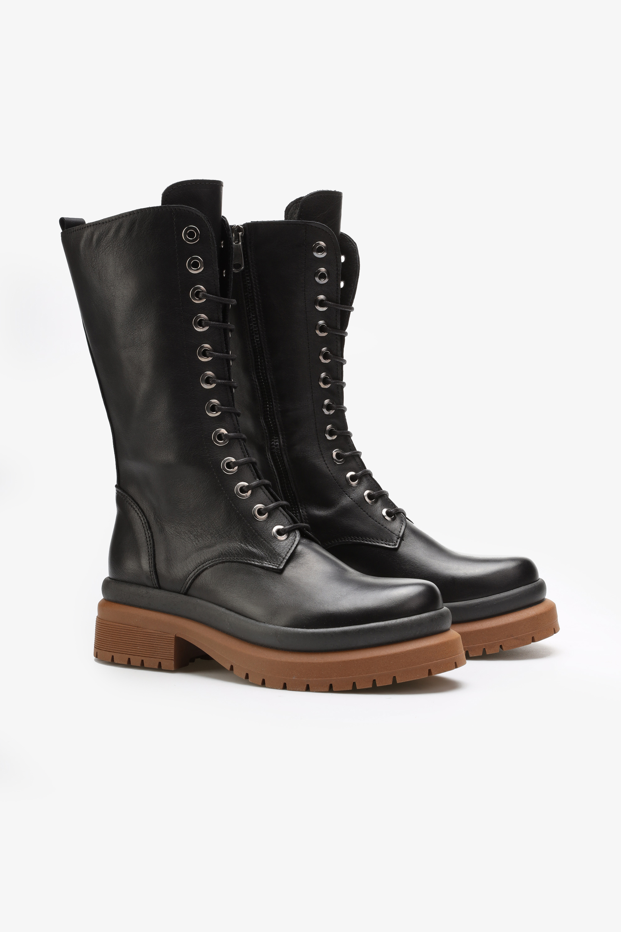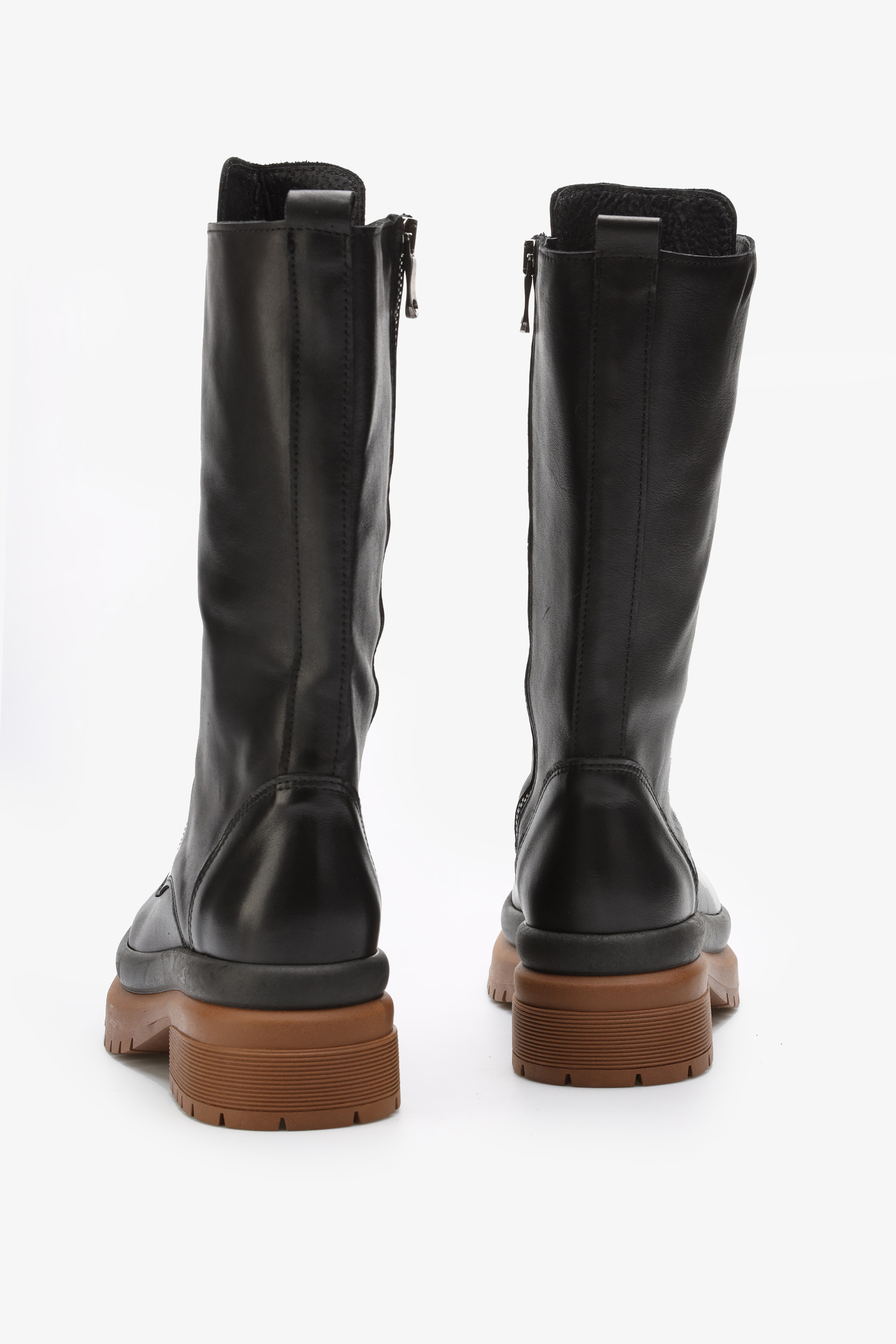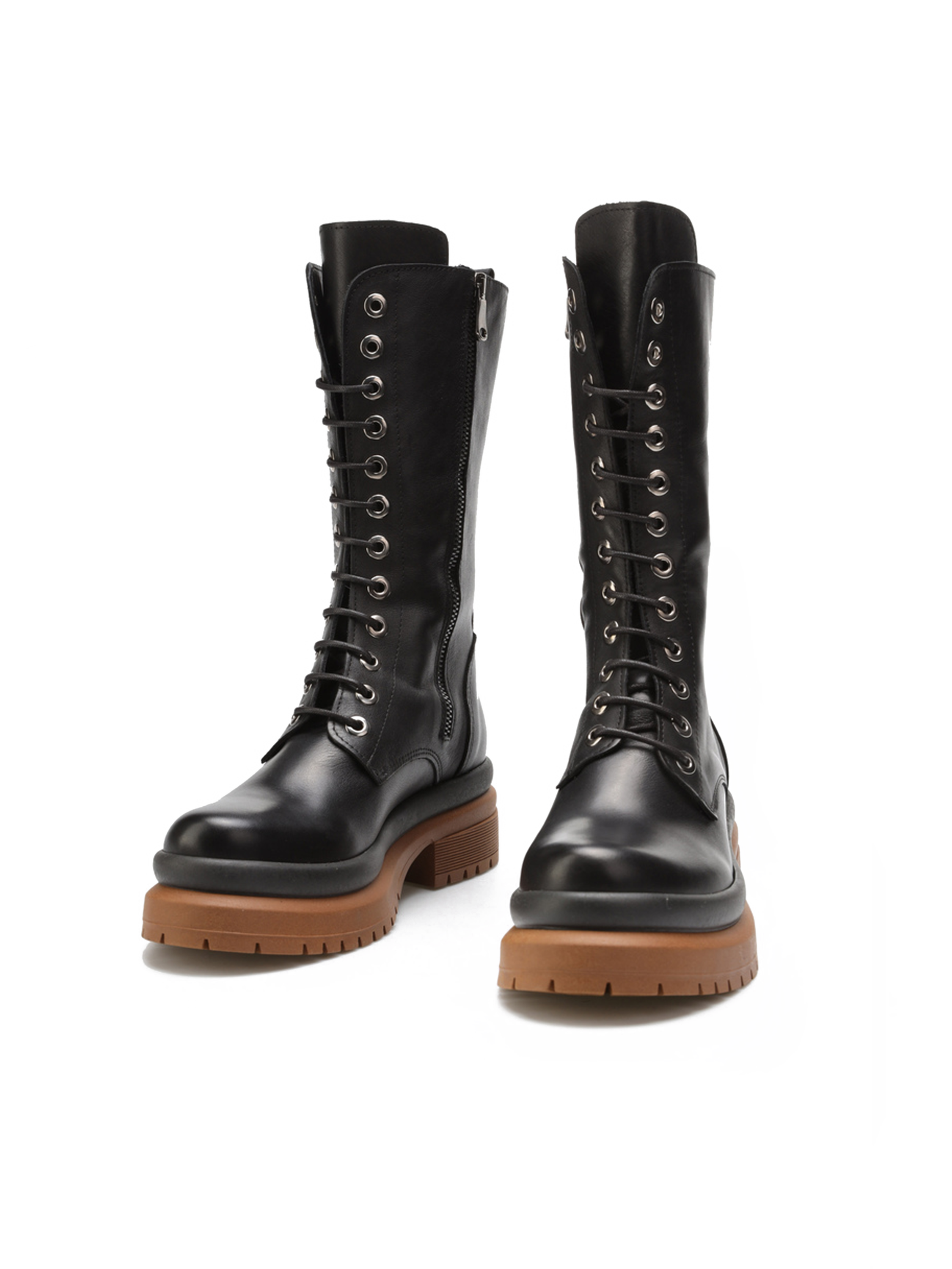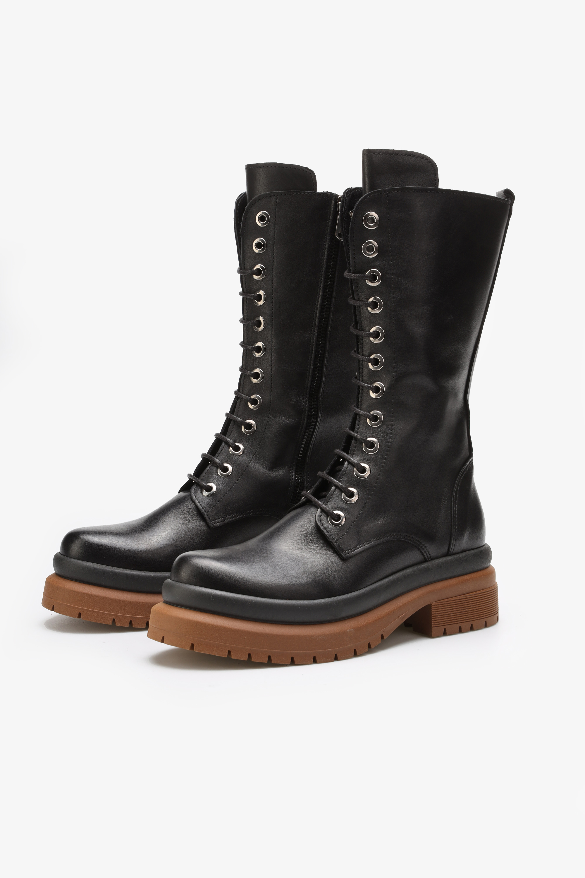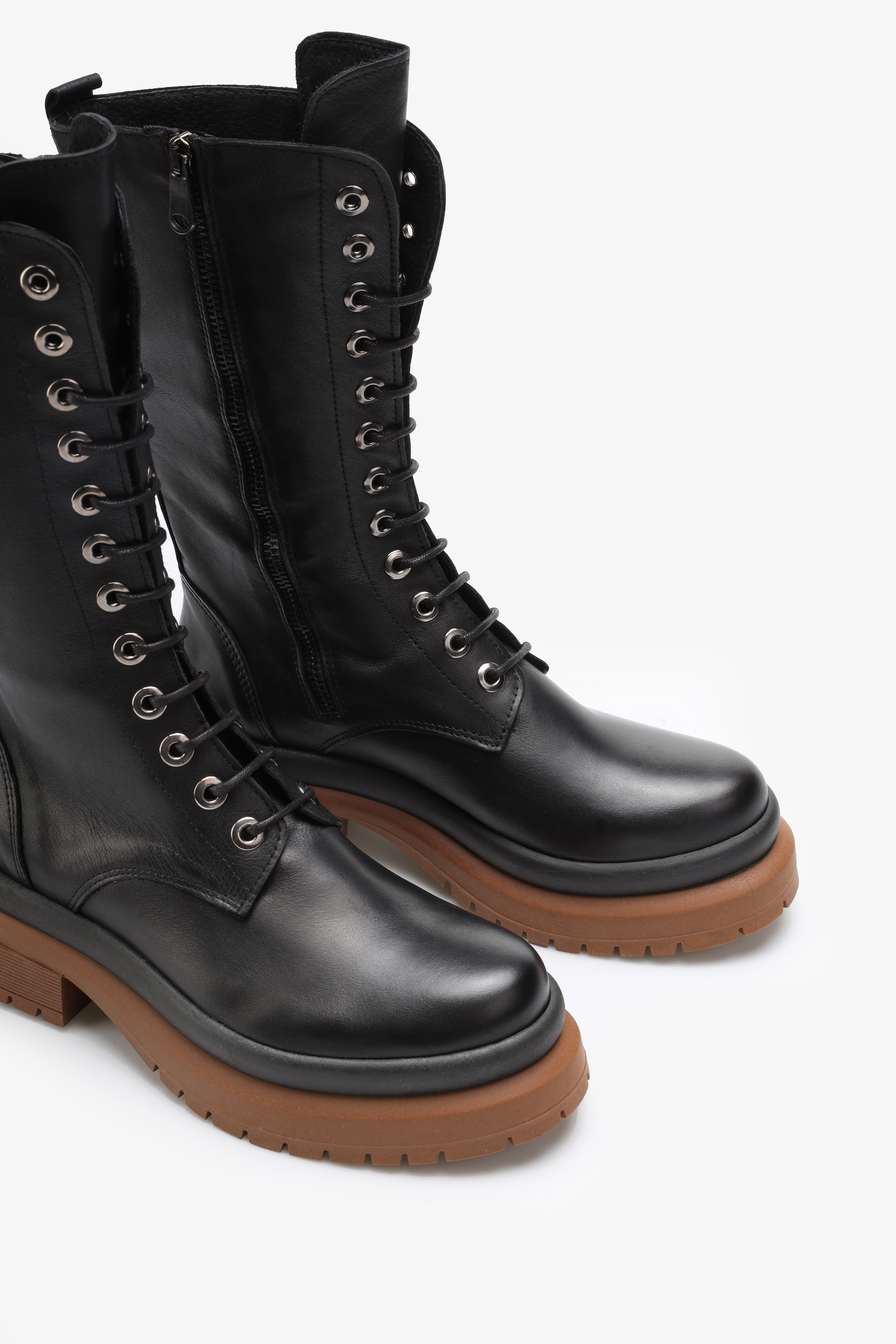 Czarne botki w całości wykonane są z włoskiej naturalnej skóry licowej. Wysoka cholewka za kostkę idealnie przylega do nogi. Wzbogacona została o srebrne nity przy sznurowaniach, które nadają jej charakteru. Wpisująca się w najnowsze Trendy kolorowa podeszwa z wyraźnie zaznaczonym bieżnikiem zapewni trwałość i przyczepność. Ukryty od wewnętrznej strony zamek błyskawiczny ułatwia zakładanie i zdejmowanie obuwia.