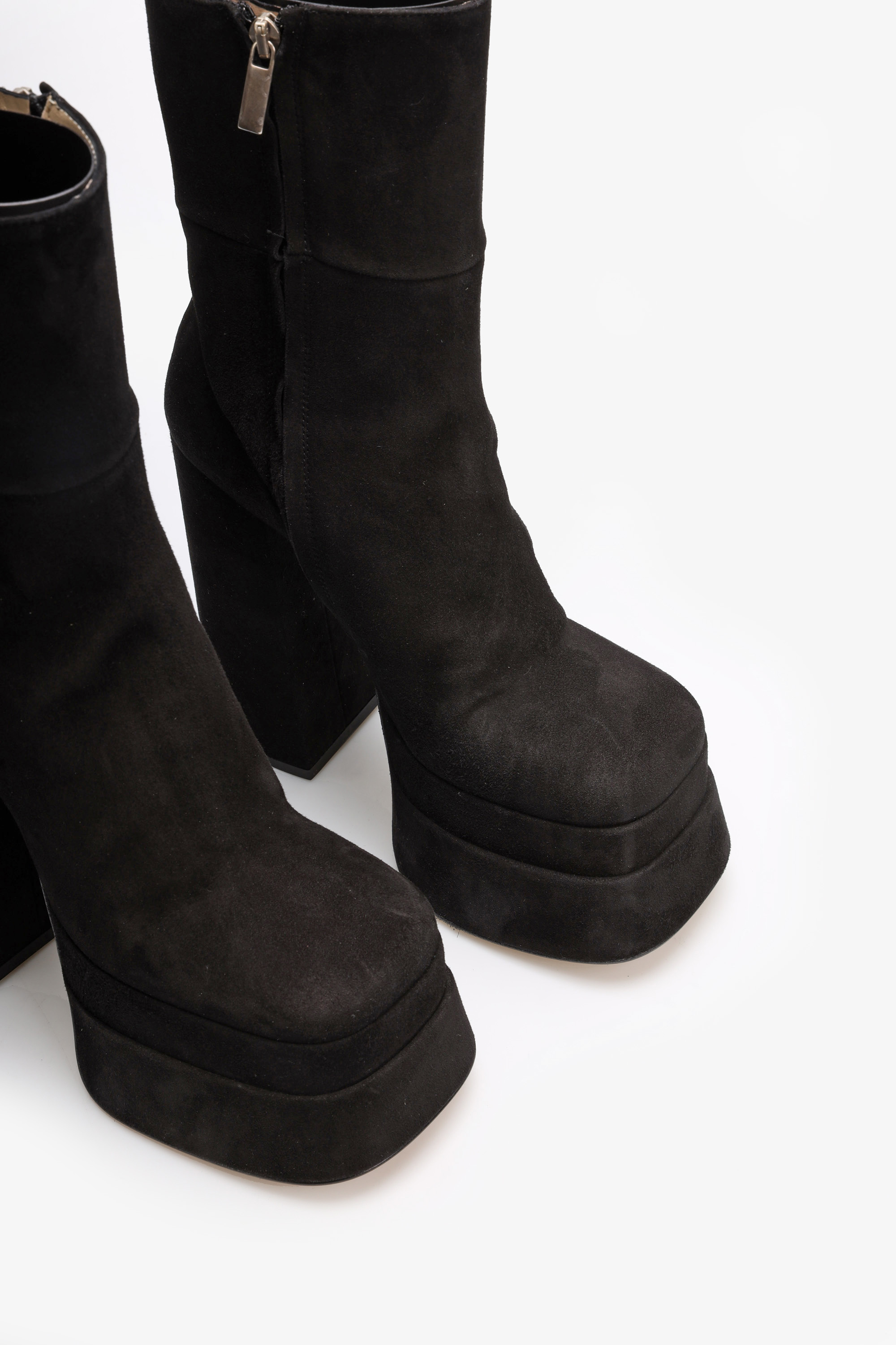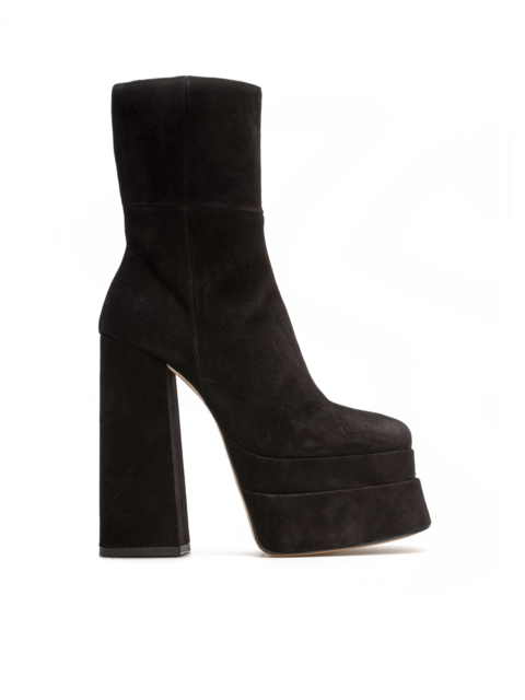 Wykonane są z najwyższej jakości włoskiej skóry zamszowej. Wpisująca się w najnowsze Trendy masywna podeszwa na platformie oraz słupkowy obcas zapewniają wygodę oraz stabilny krok. Kwadratowy nosek w połączeniu z ponadczasowym czarnym kolorem tworzą idealną całość.