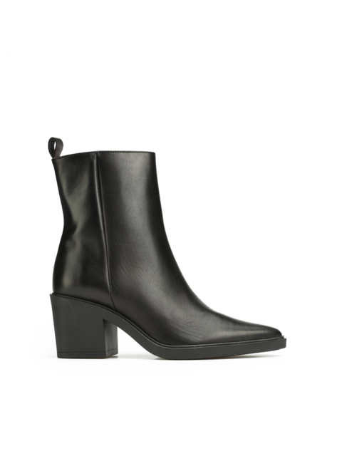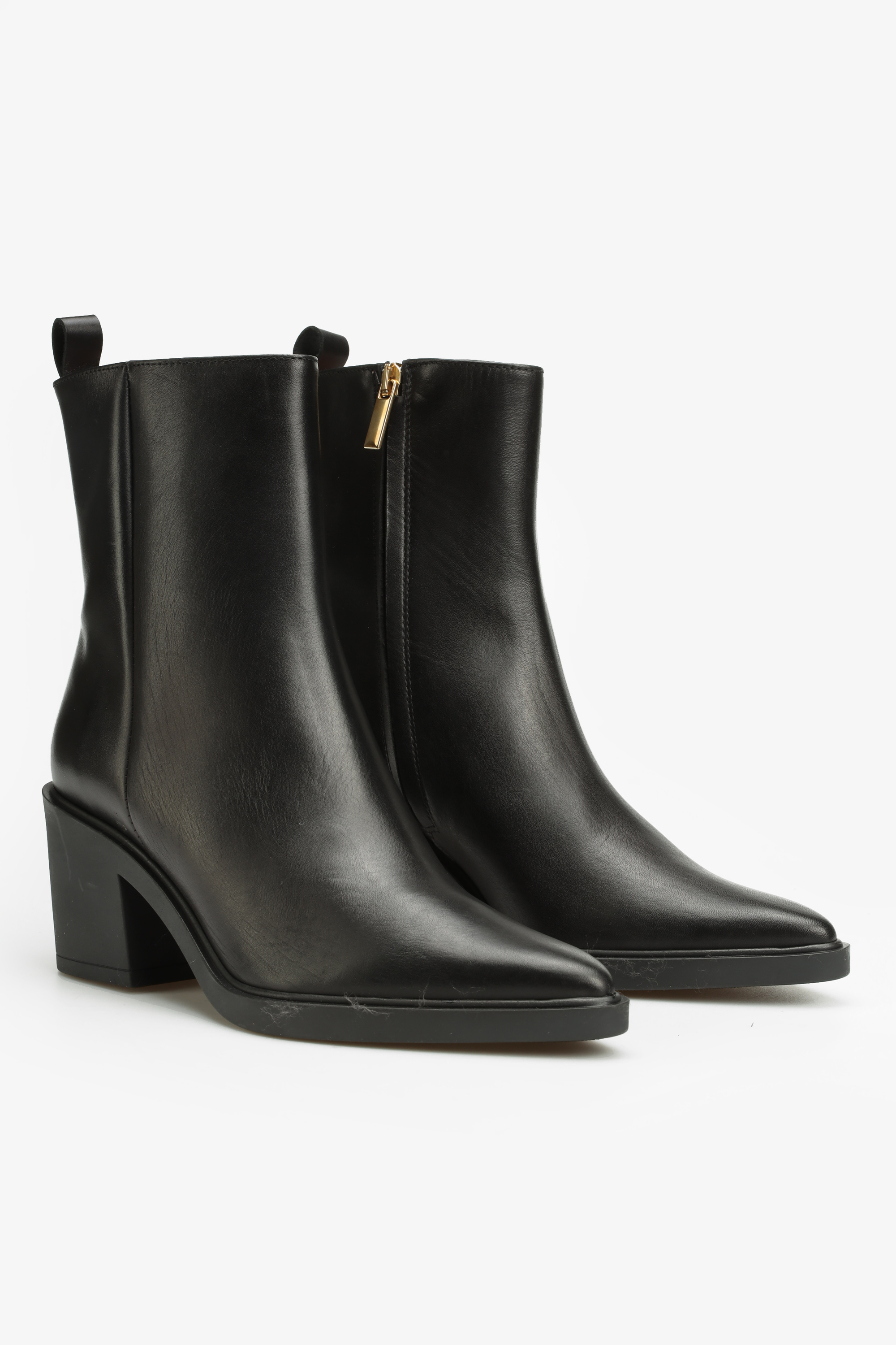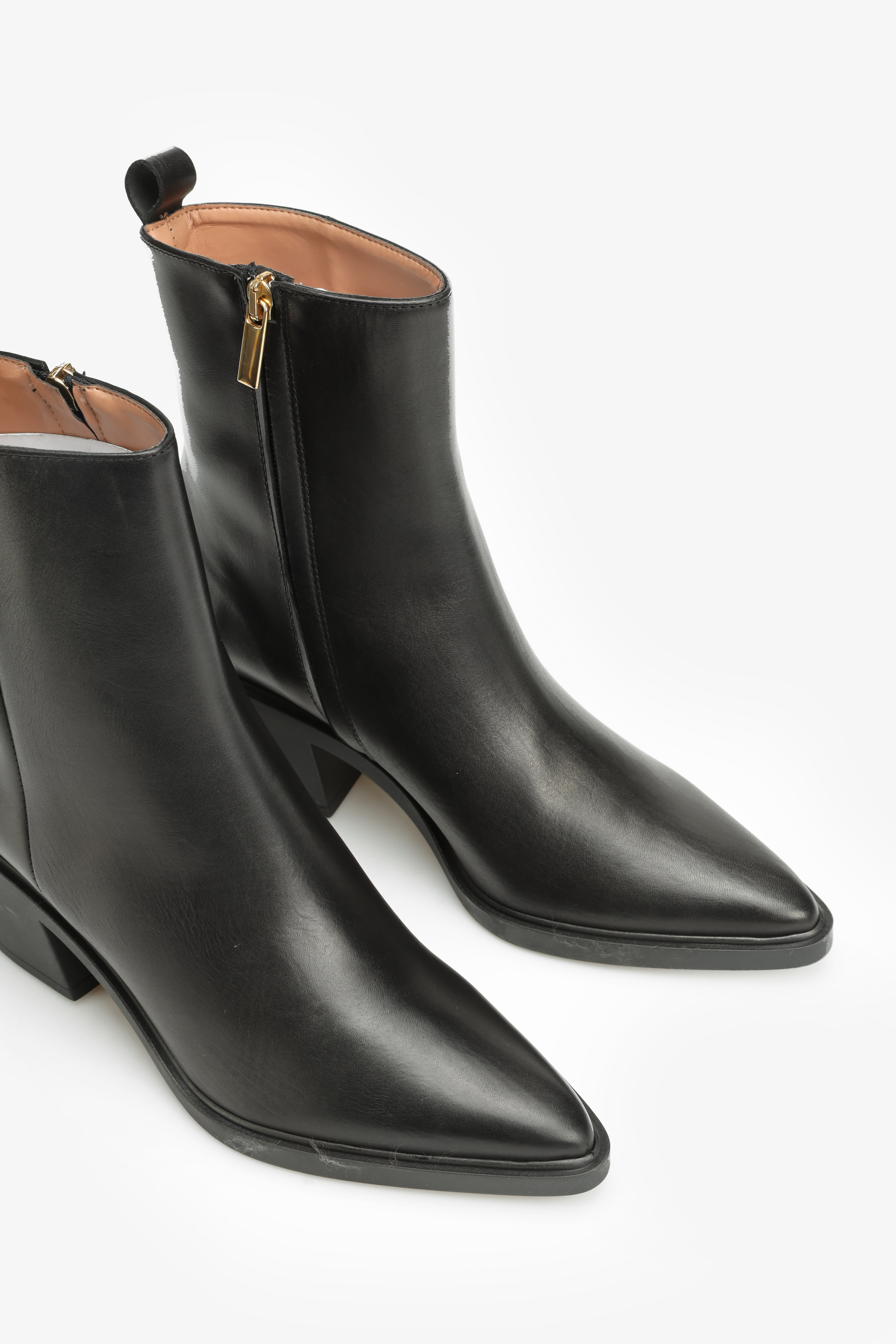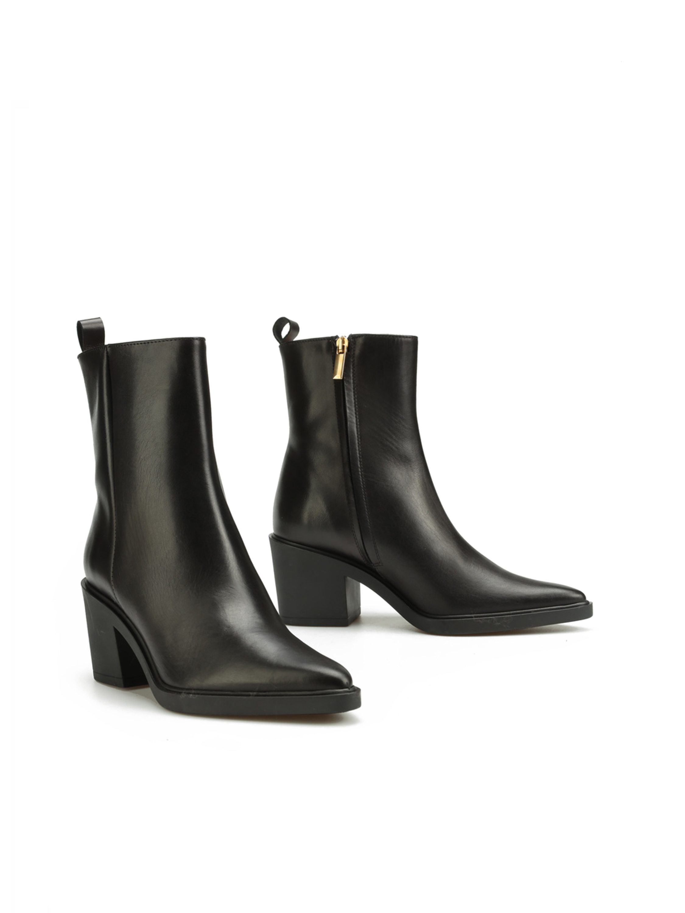 Krótkie skórzane kowbojki HEGO'S Milano to model prosto z włoskich ulic. Cholewka za kostkę w ponadczasowym, czarnym kolorze wykonana jest z naturalnej skóry licowej. Charakterystyczny dla tego fasonu ścięty obcas i nosek w szpic idealnie wpisują się w Trendy sezonu. Ukryty od wewnętrznej strony zamek błyskawiczny ułatwia zakładanie i zdejmowanie obuwia. Prosty fason w modowym kolorze będzie doskonałym uzupełnieniem kapsułowej garderoby kobiety.