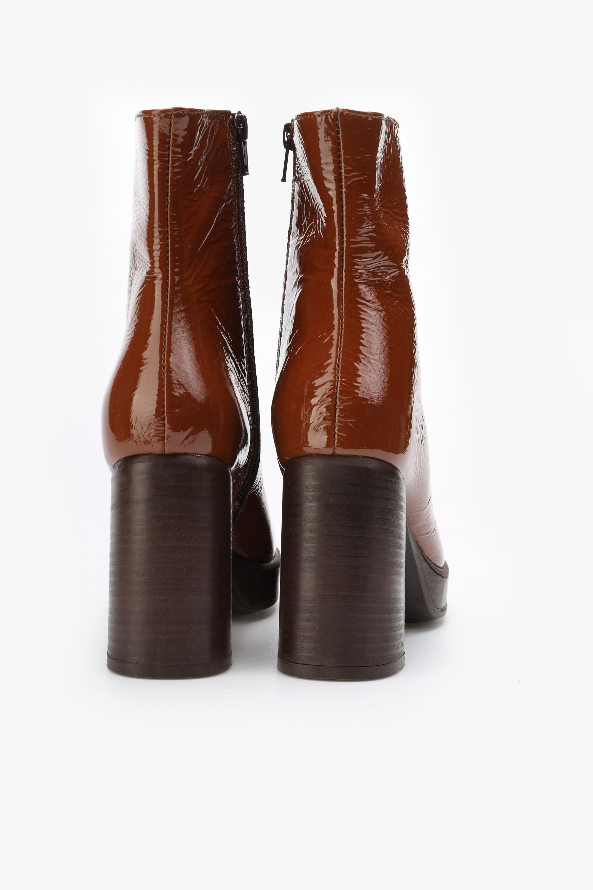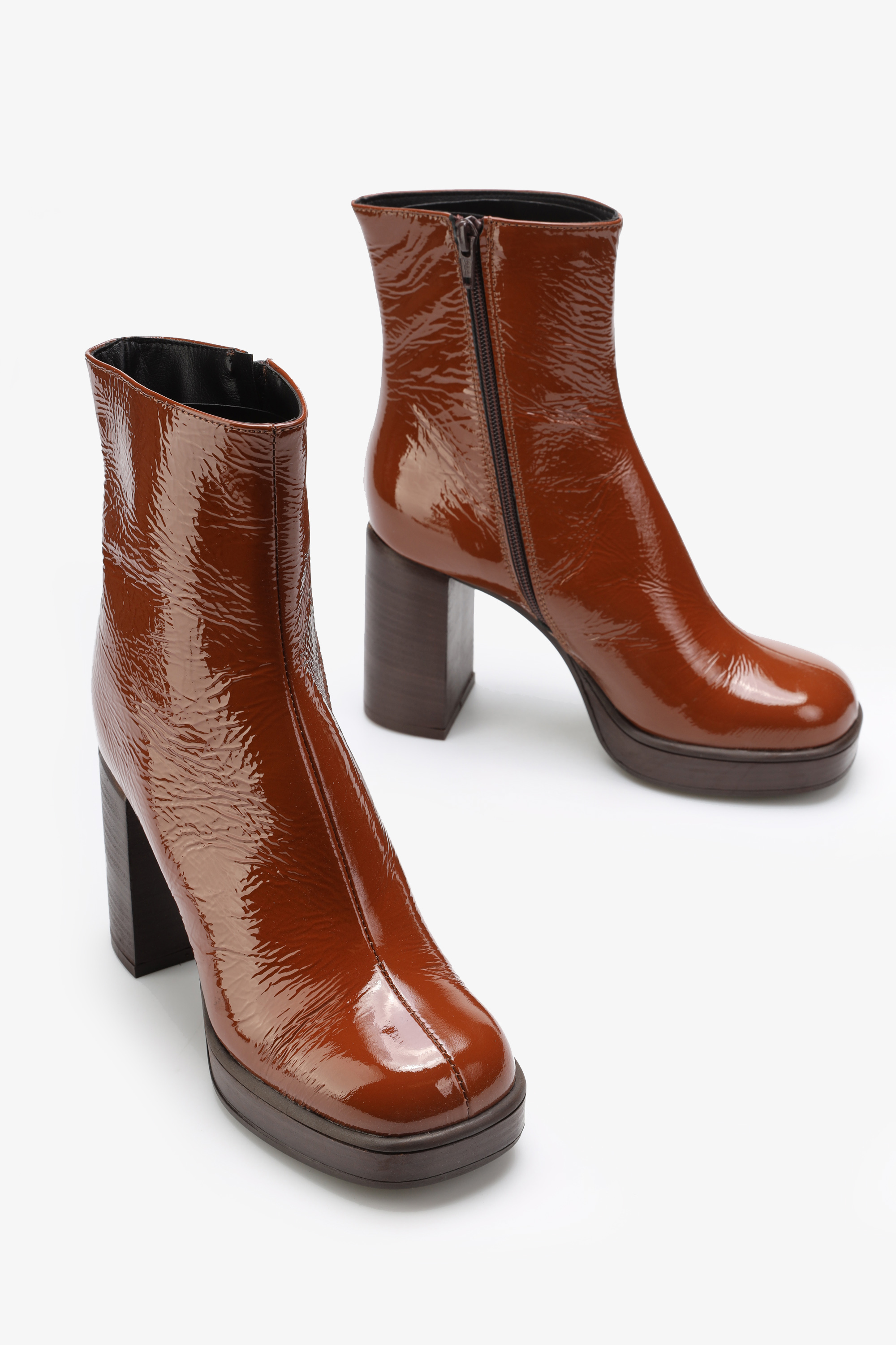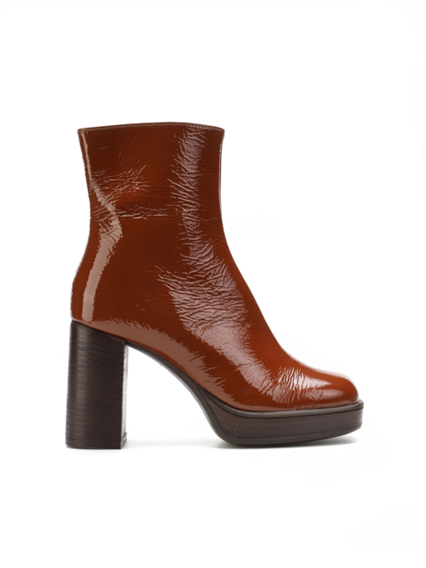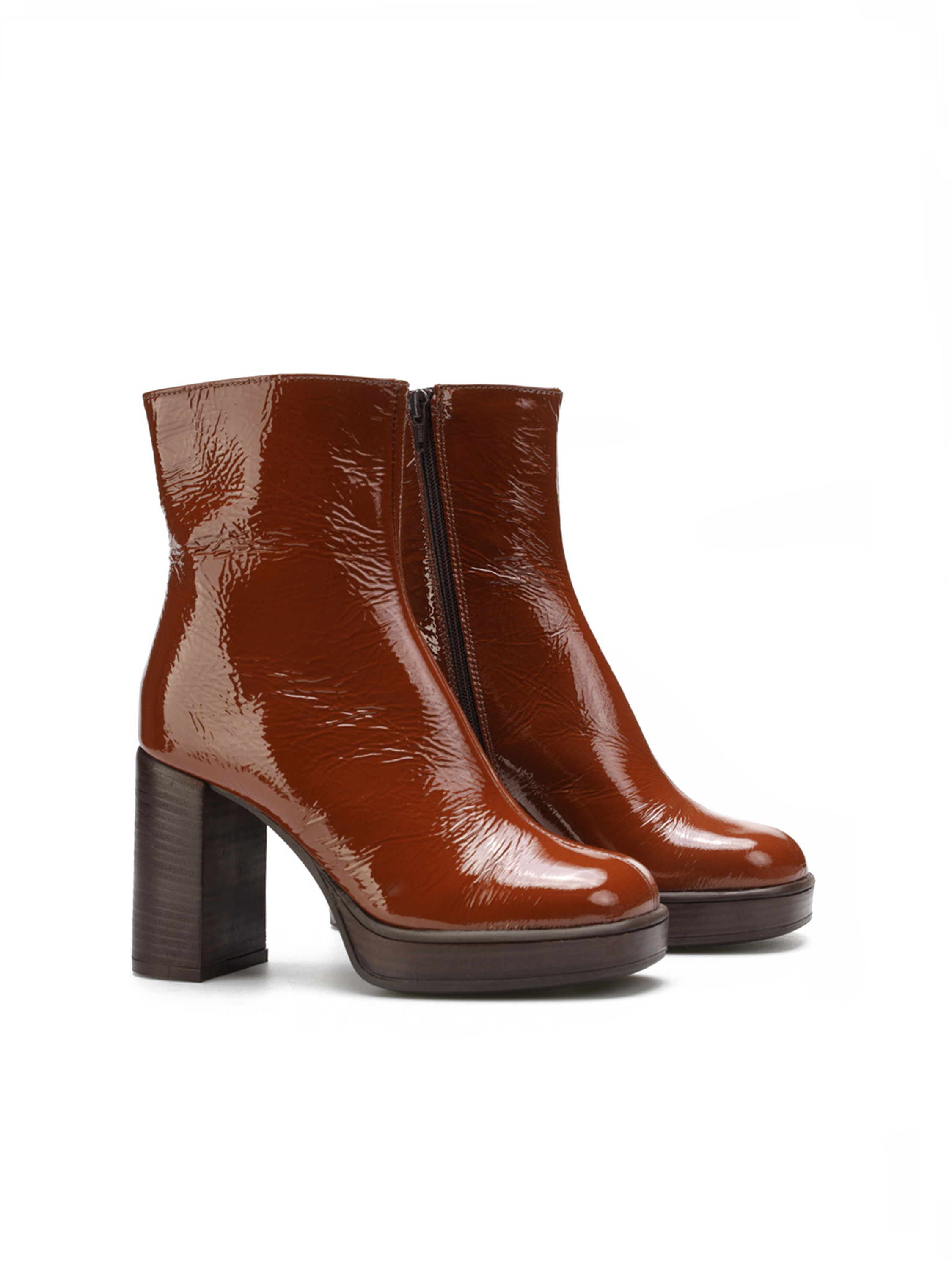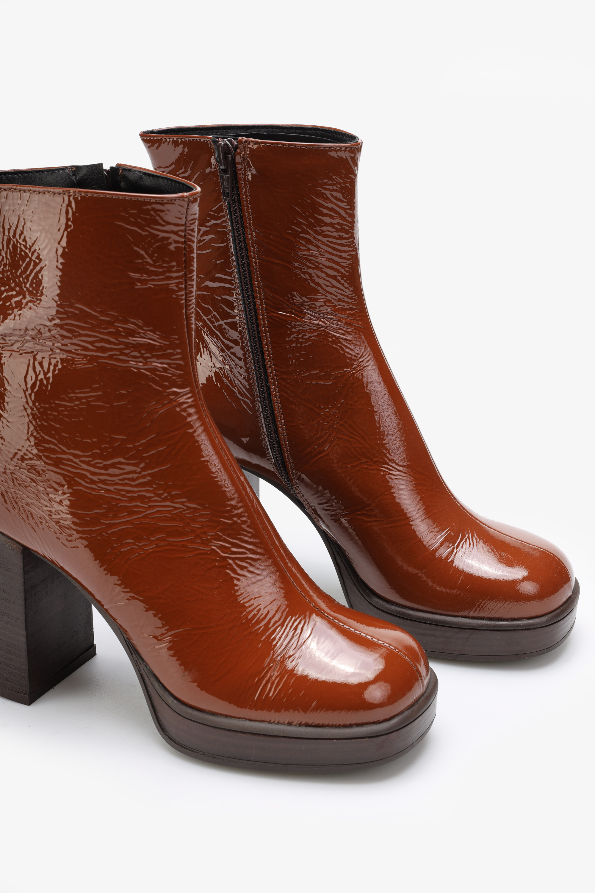 Stylowe botki w całości wykonane zostały z włoskiej skóry naturalnej. Lakierowana cholewka za kostkę w rudym kolorze doskonale przylega do nogi. Delikatne marszczenia na całej jej długości wyglądają nowocześnie i oryginalnie. Najmodniejsza w tym sezonie podeszwa na platformie i wysoki, słupkowy obcas odpowiadają za komfort w noszeniu obuwia.