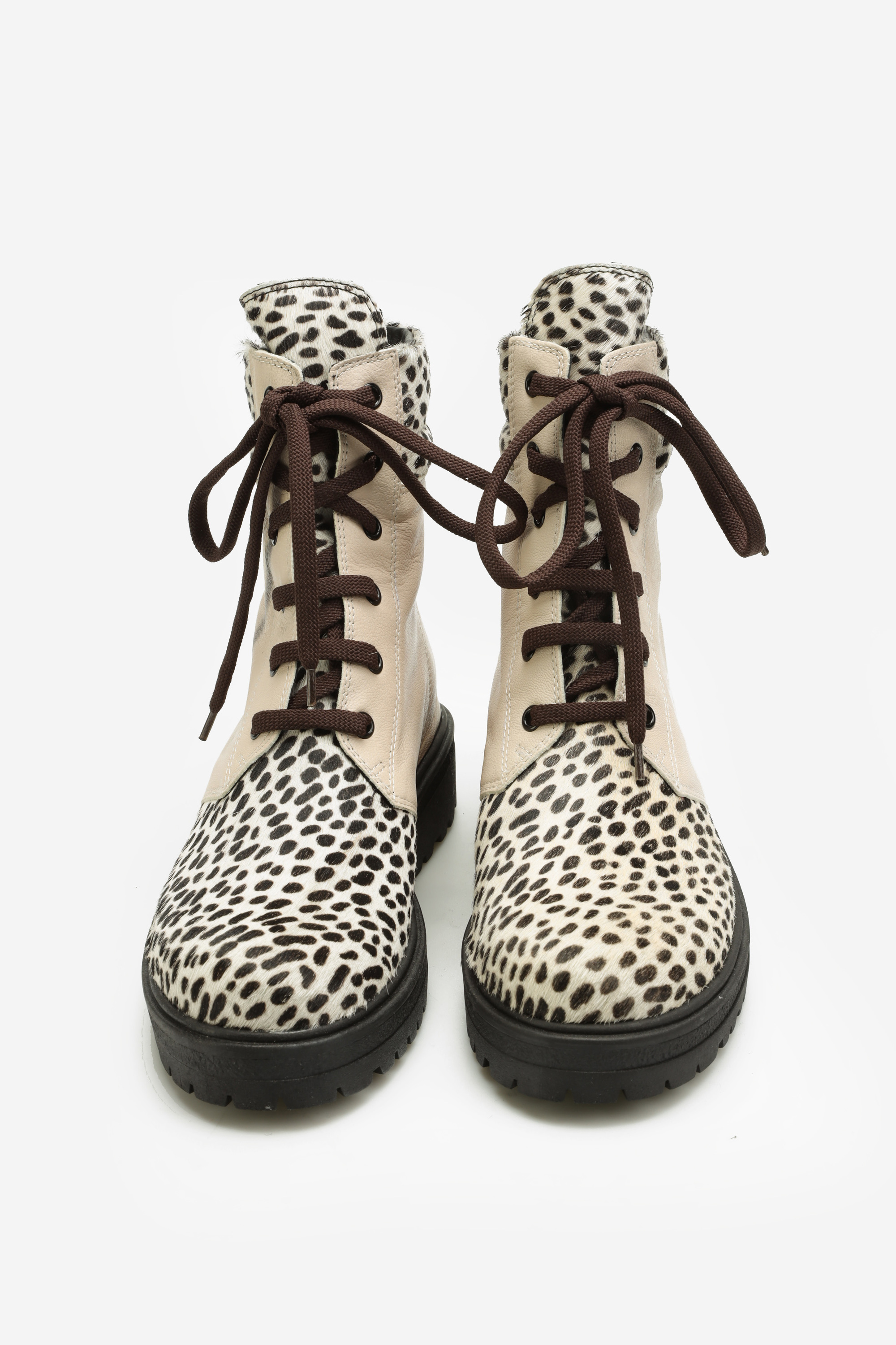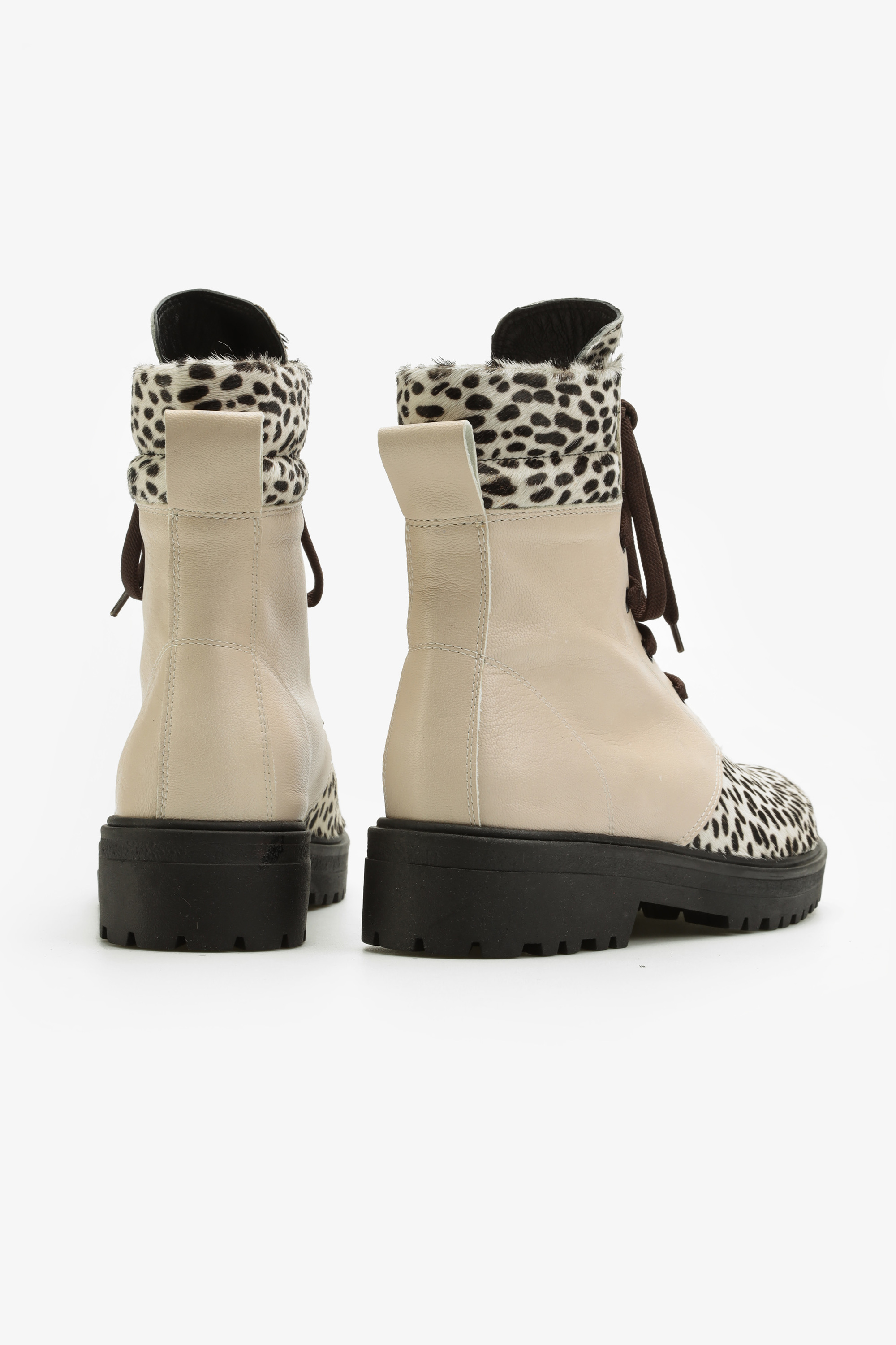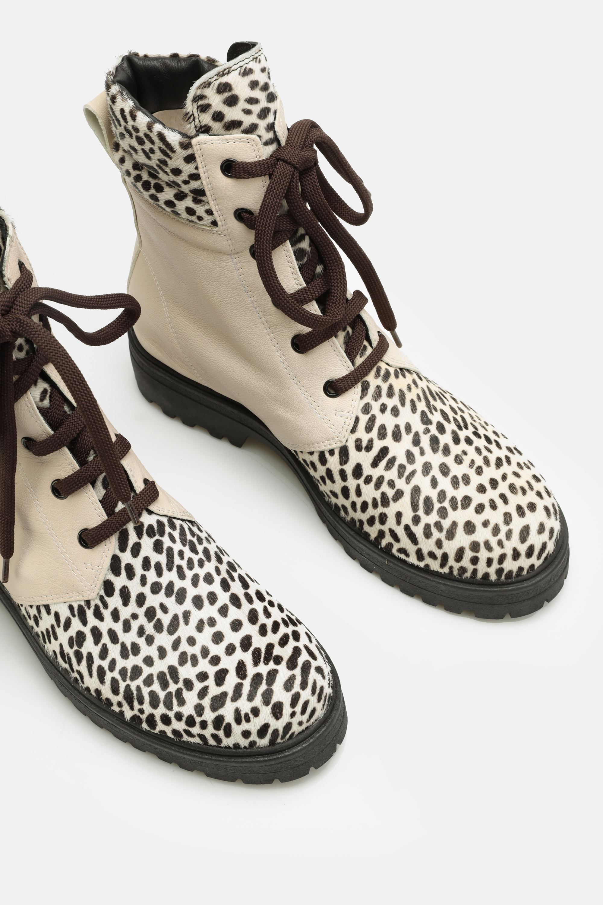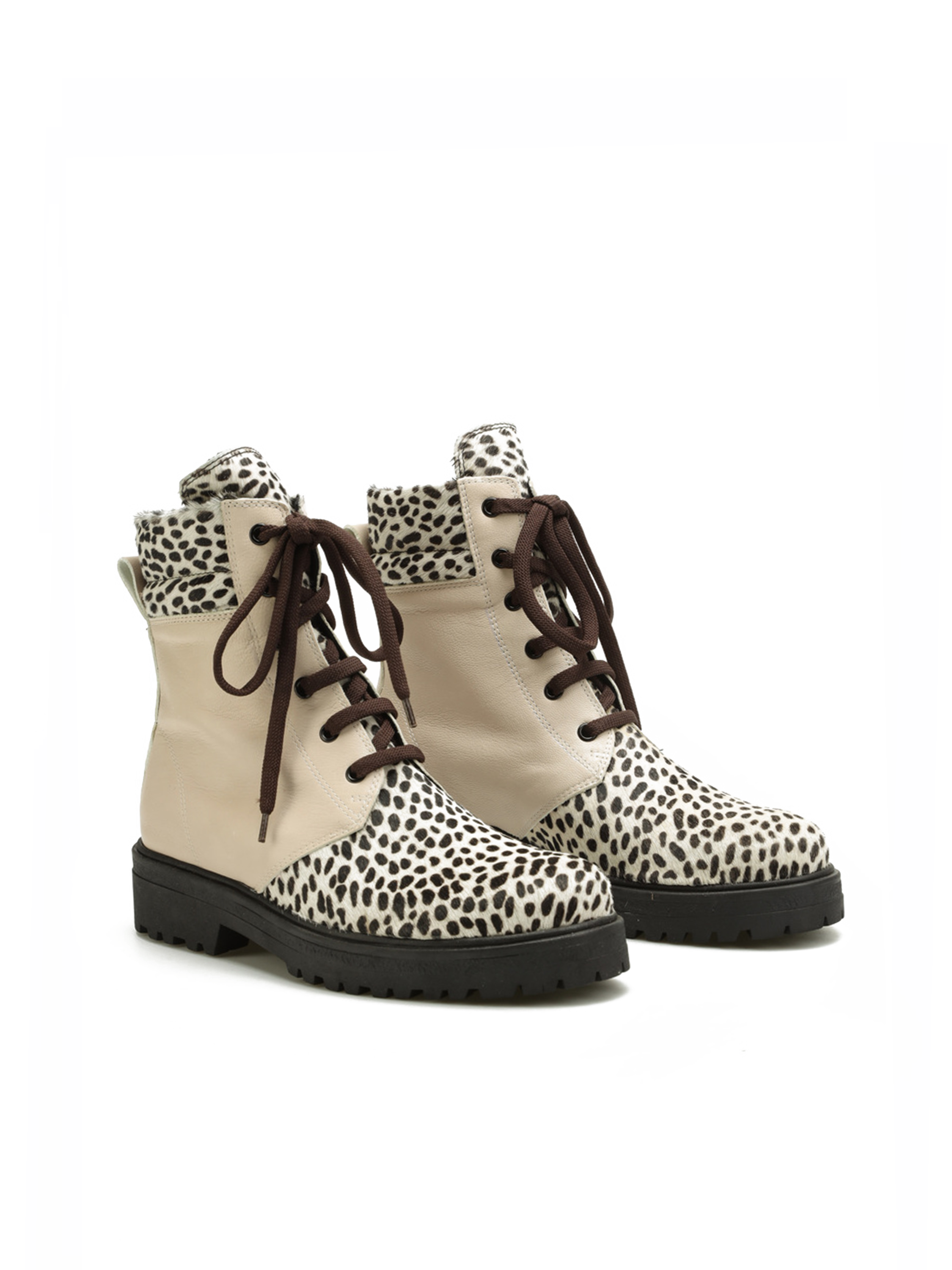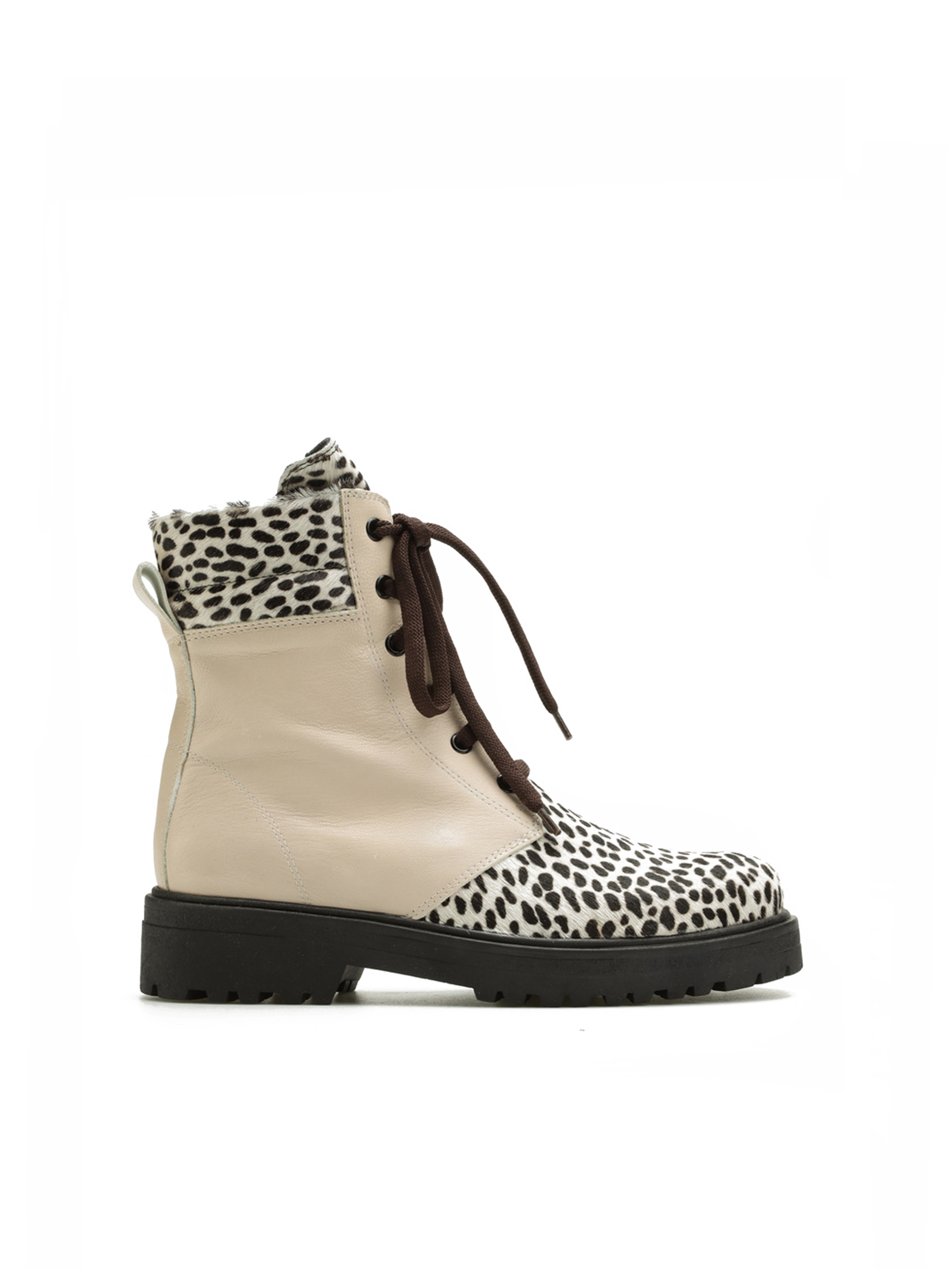 Kremowa cholewka za kostkę wykonana jest z naturalnej skóry licowej. Wzbogacona została o najmodniejszy w tym sezonie zwierzęcy print. Sznurowane zapięcie pozwala dopasować cholewkę do stopy. Płaski obcas i skórzana wkładka odpowiadają za wygodę i komfort.