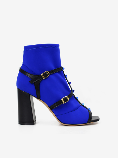 Zgrabne botki HEGO'S w kolorze chabrowym, z odkrytymi palcami, osadzone na 9,5-centymetrowym słupku w kolorze czarnym, z cholewką łączącą elastyczną skarpetę z lycry oraz skórzany wierzch sandała. Całość ozdabiają ćwieki w kolorze niebieskim. Skórzana wkładka, wnętrze z lycry, podeszwa z wysokogatunkowego tworzywa.