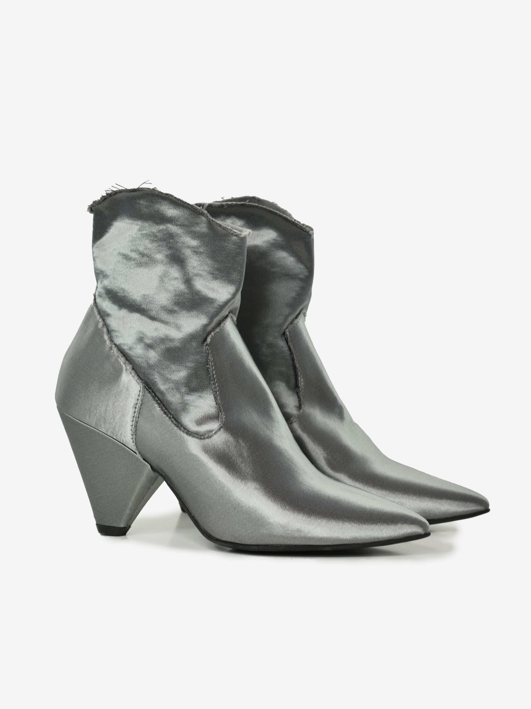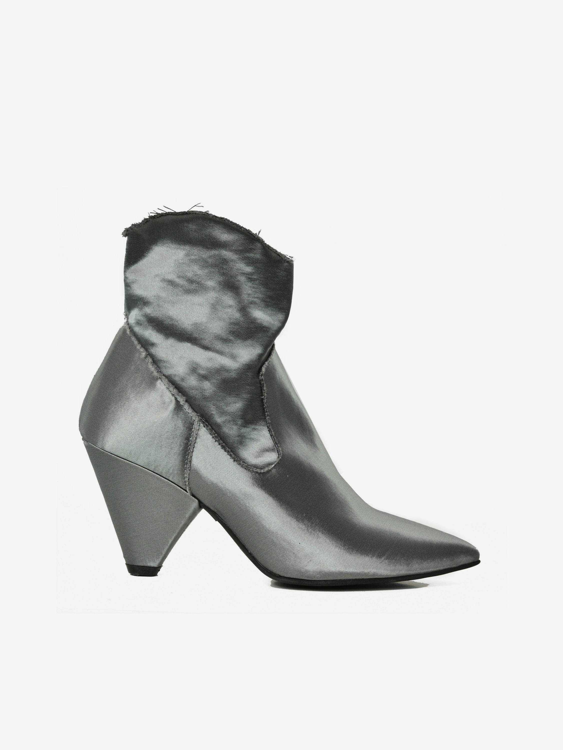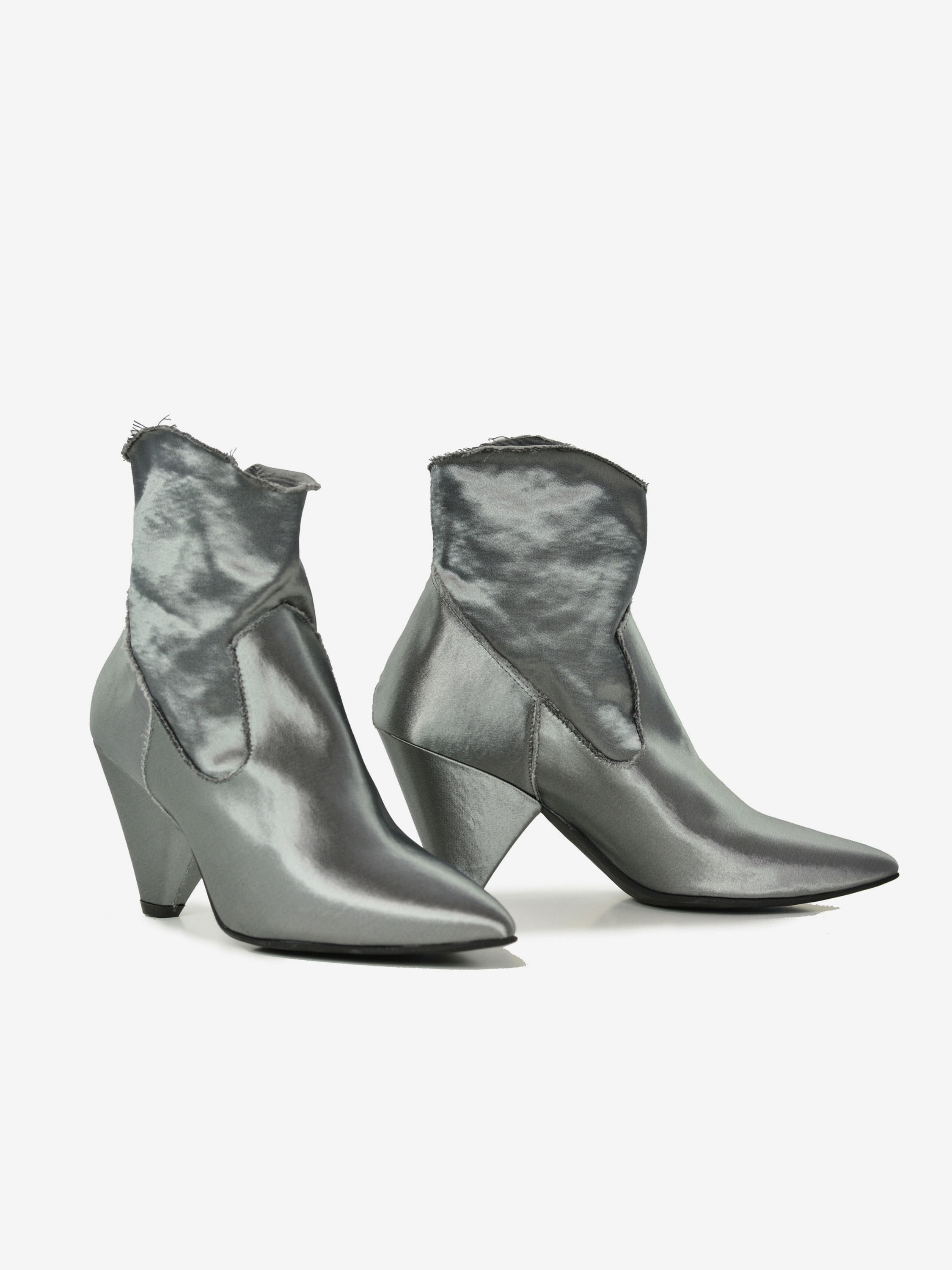 Satynowe botki HEGO'S w kolorze szarym, na  modnym, stożkowym obcasie o wysokości 8 cm. Botki wciągane. Cholewka wykonana z elastycznej satyny. Nosek w czubek. Skórzana wkładka. Wnętrze częściowo materiałowe, częściowo satynowe. Podeszwa z wysokogatunkowego tworzywa.