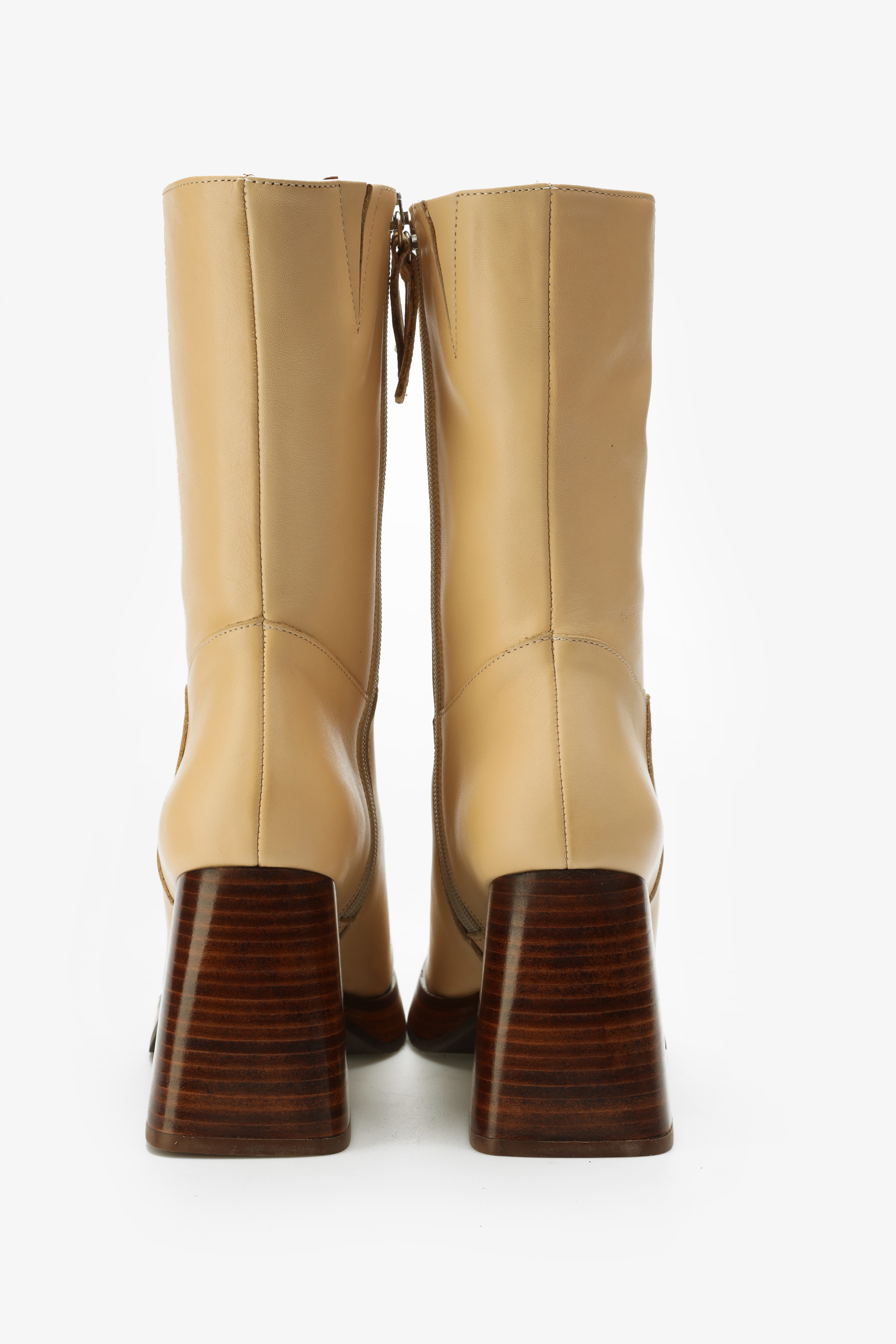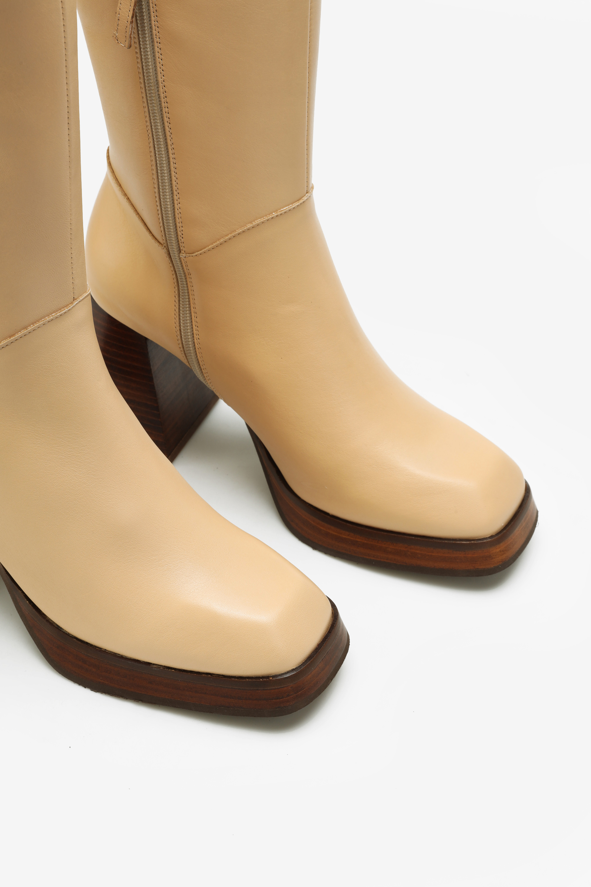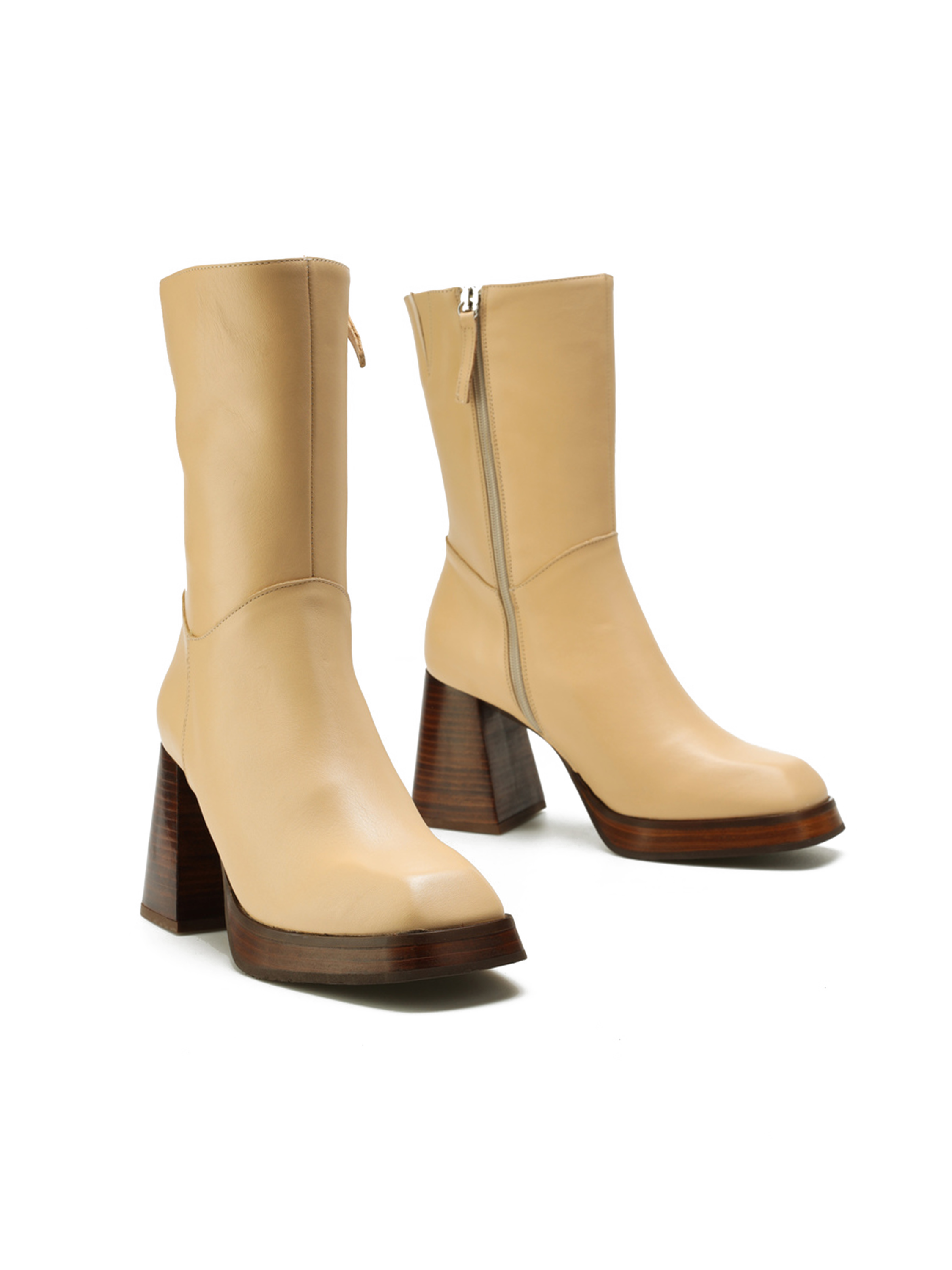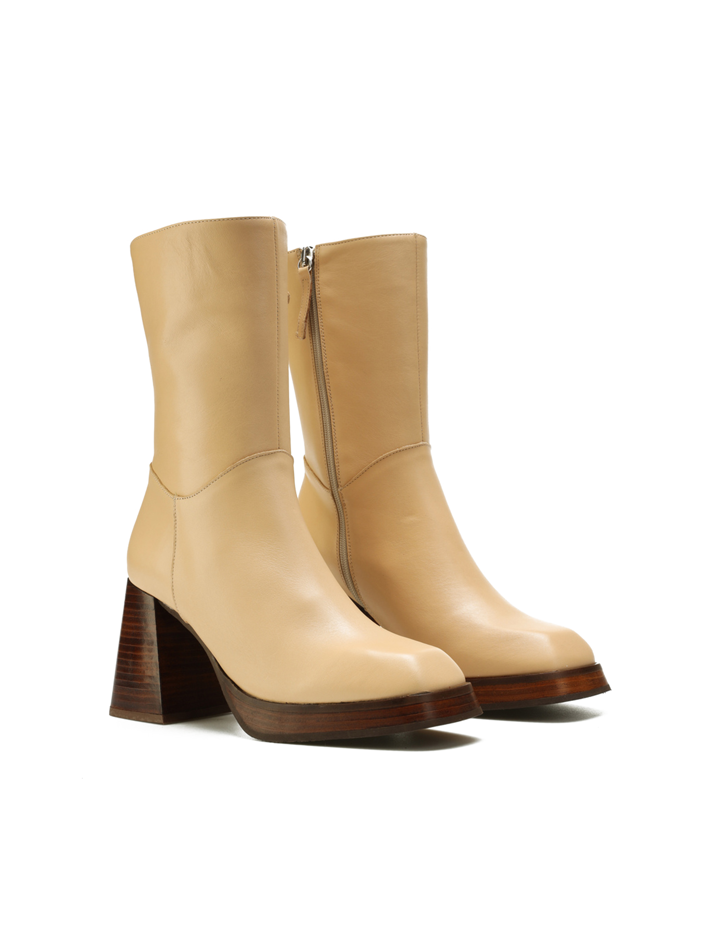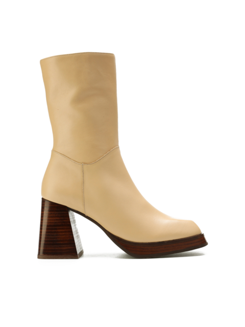 Dopasowana cholewka za kostkę w kremowym kolorze wykonana jest z włoskiej skóry naturalnej. Uzupełniona została o zamek błyskawiczny ułatwiający zakładanie i zdejmowanie obuwia. Kwadratowy nosek i stabilny obcas na słupku wpisują się w Trendy sezonu. Modna podeszwa na platformie w połączeniu ze skórzaną wkładką odpowiada za komfort i wygodę w noszeniu.