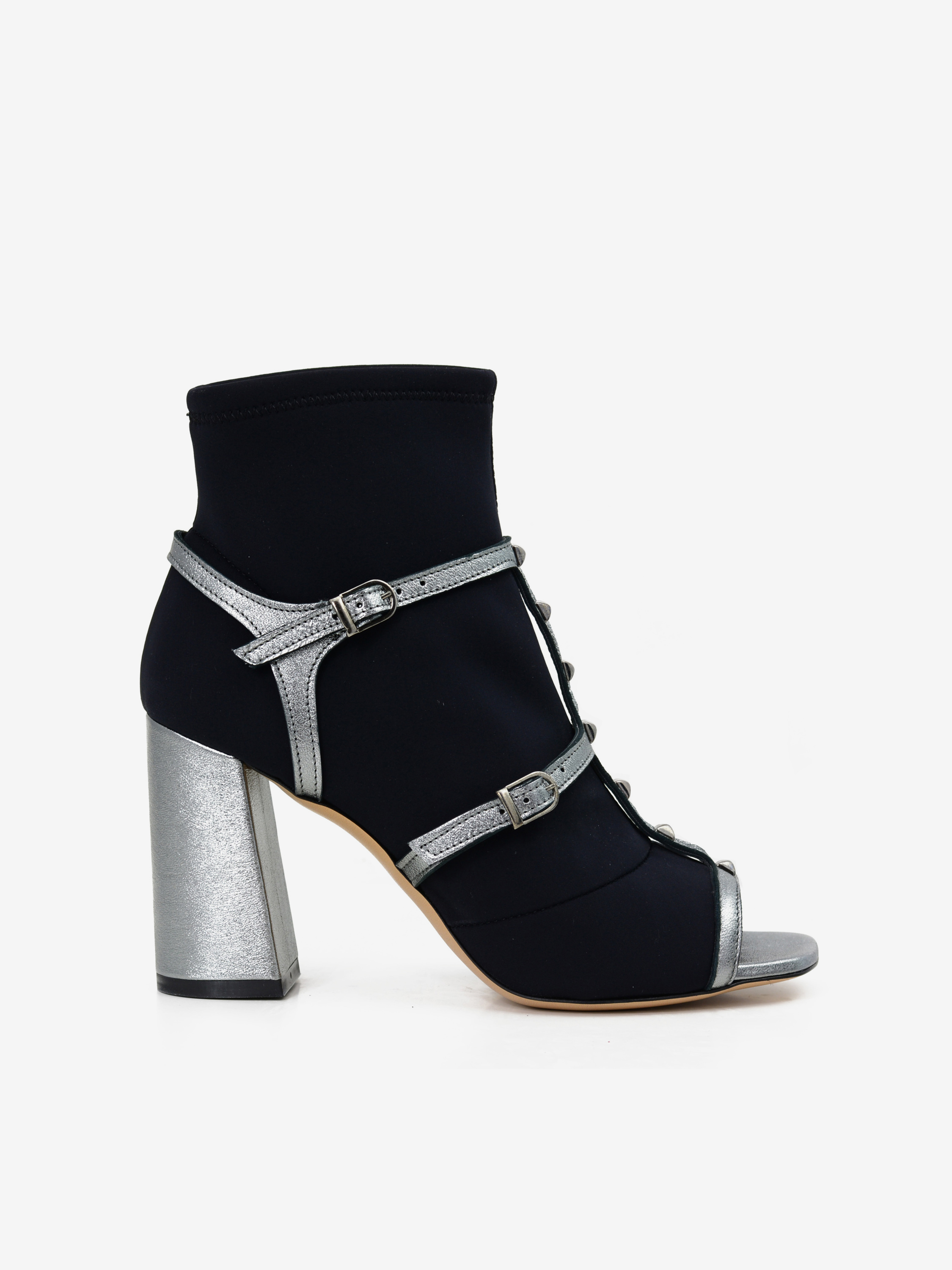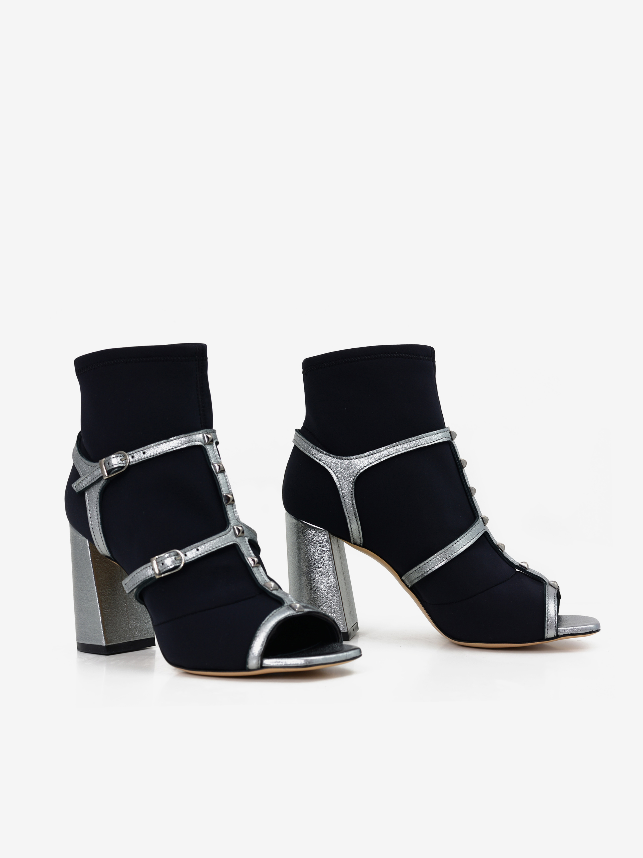 Zgrabne botki HEGO'S w kolorze czarnym, z odkrytymi palcami, osadzone na 9,5-centymetrowym słupku w kolorze srebrnym, z cholewką łączącą elastyczną skarpetę z lycry oraz skórzany wierzch sandała. Całość ozdabiają ćwieki w kolorze srebrnym. Skórzana wkładka, wnętrze z lycry, podeszwa z wysokogatunkowego tworzywa.