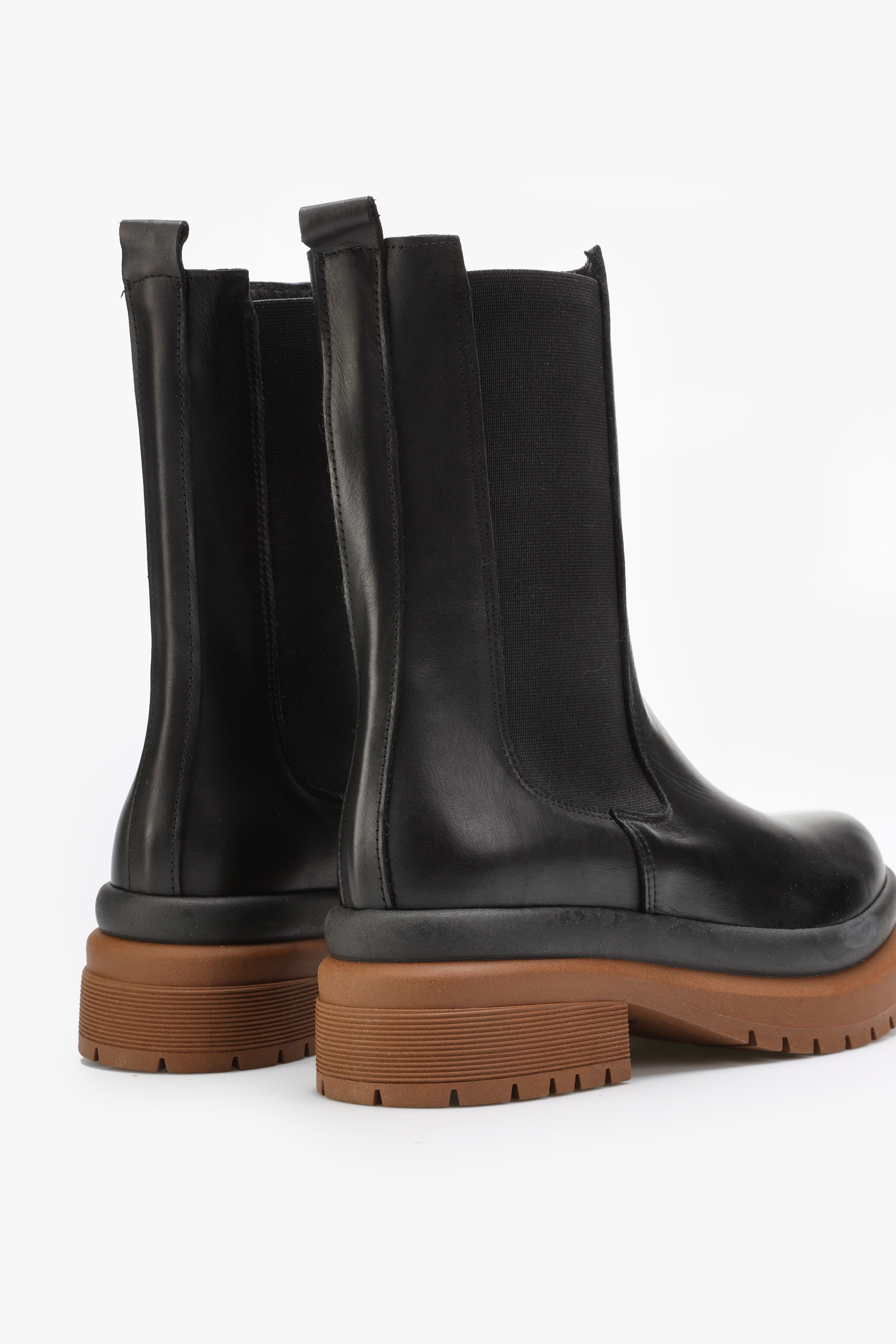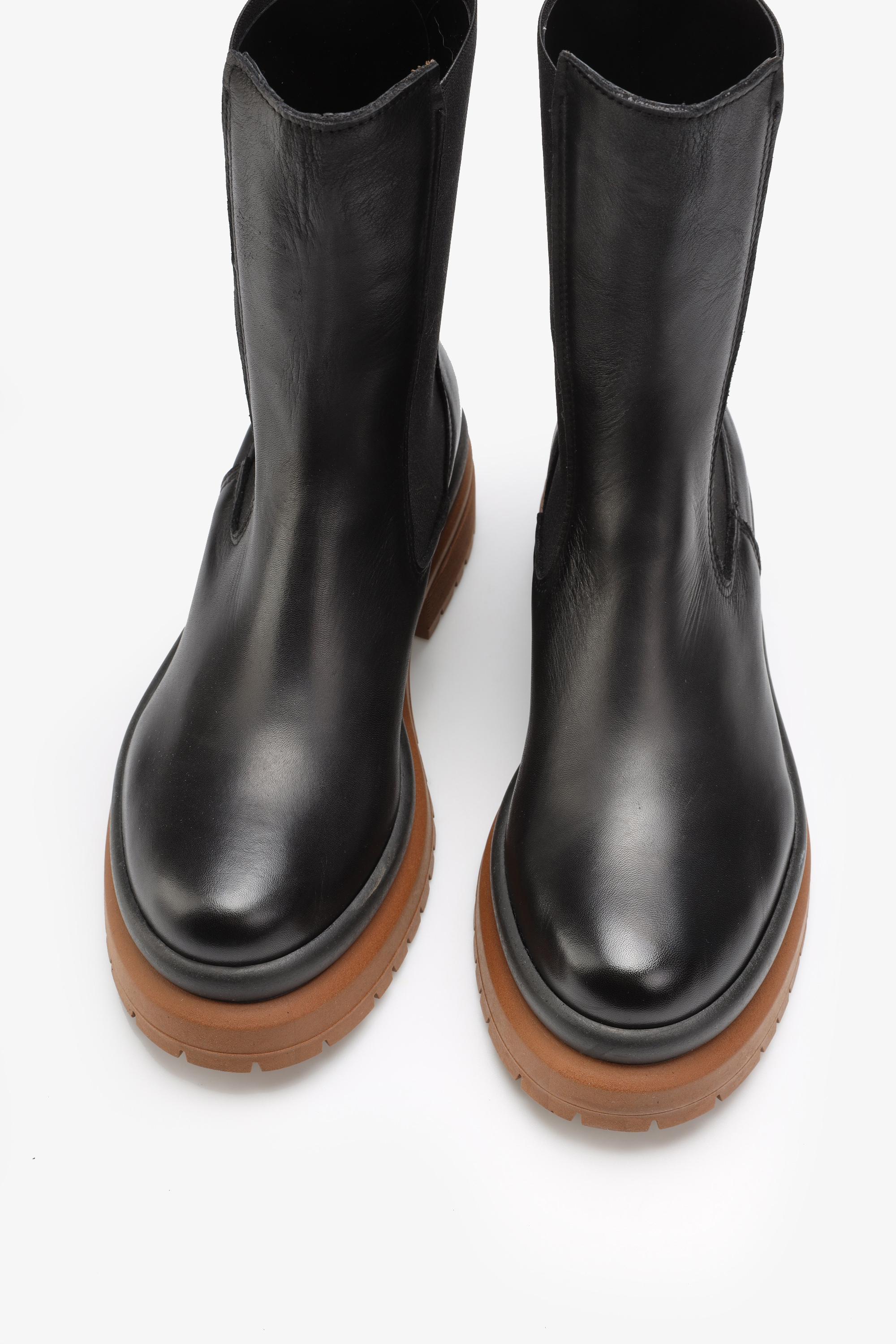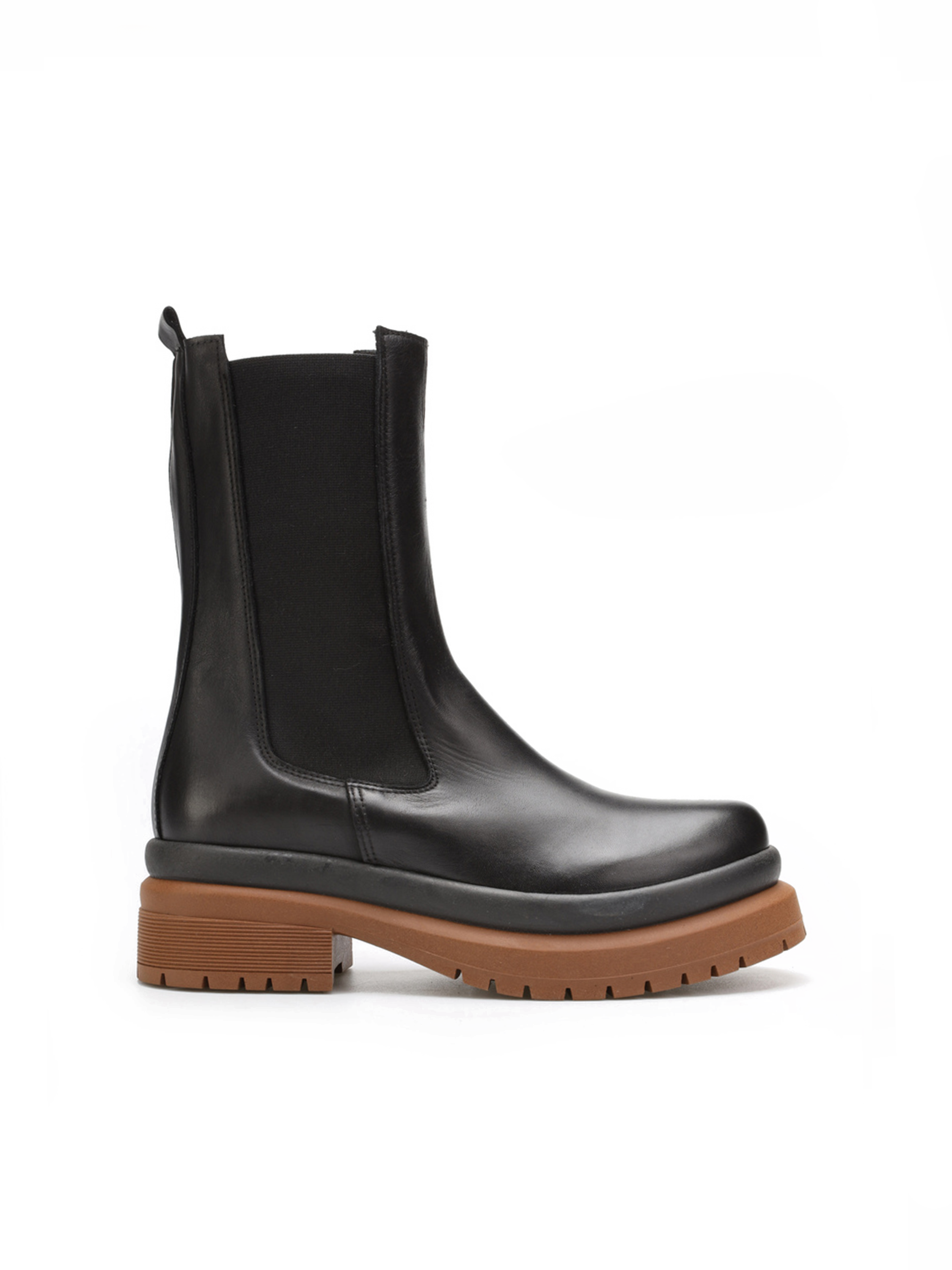 Czarna cholewka za kostkę wyposażona jest w elastyczną gumę, która ułatwia ich zakładanie i zdejmowanie. Umożliwia też ich dopasowanie do kształtu nogi. Gruba, masywna podeszwa na platformie idealnie wpisuje się w Trendy sezonu. Minimalistyczny fason typu chelsea w całości wykonany jest z włoskiej naturalnej skóry.