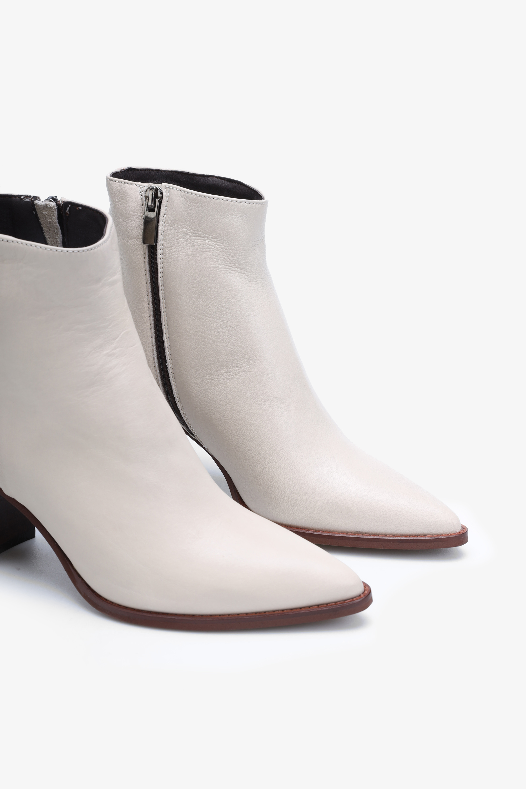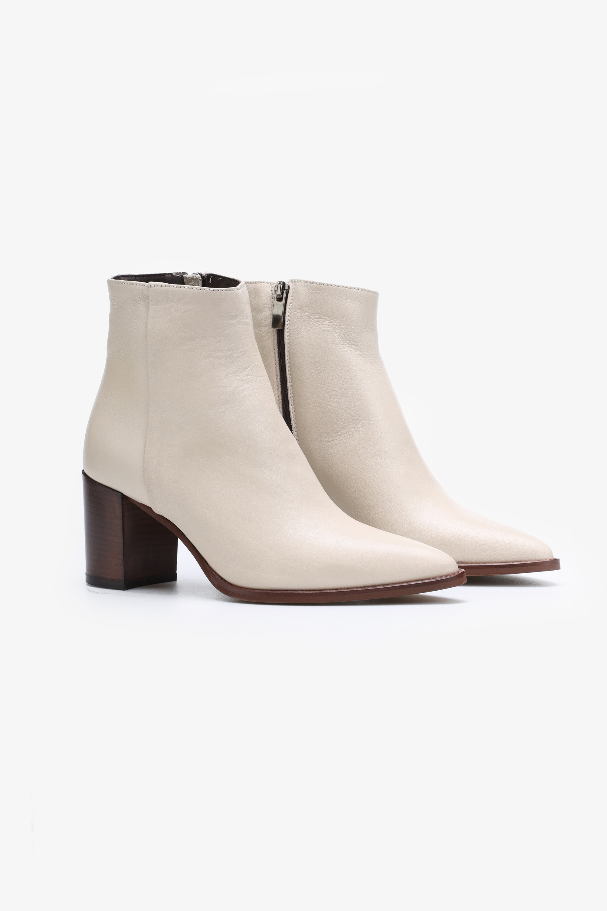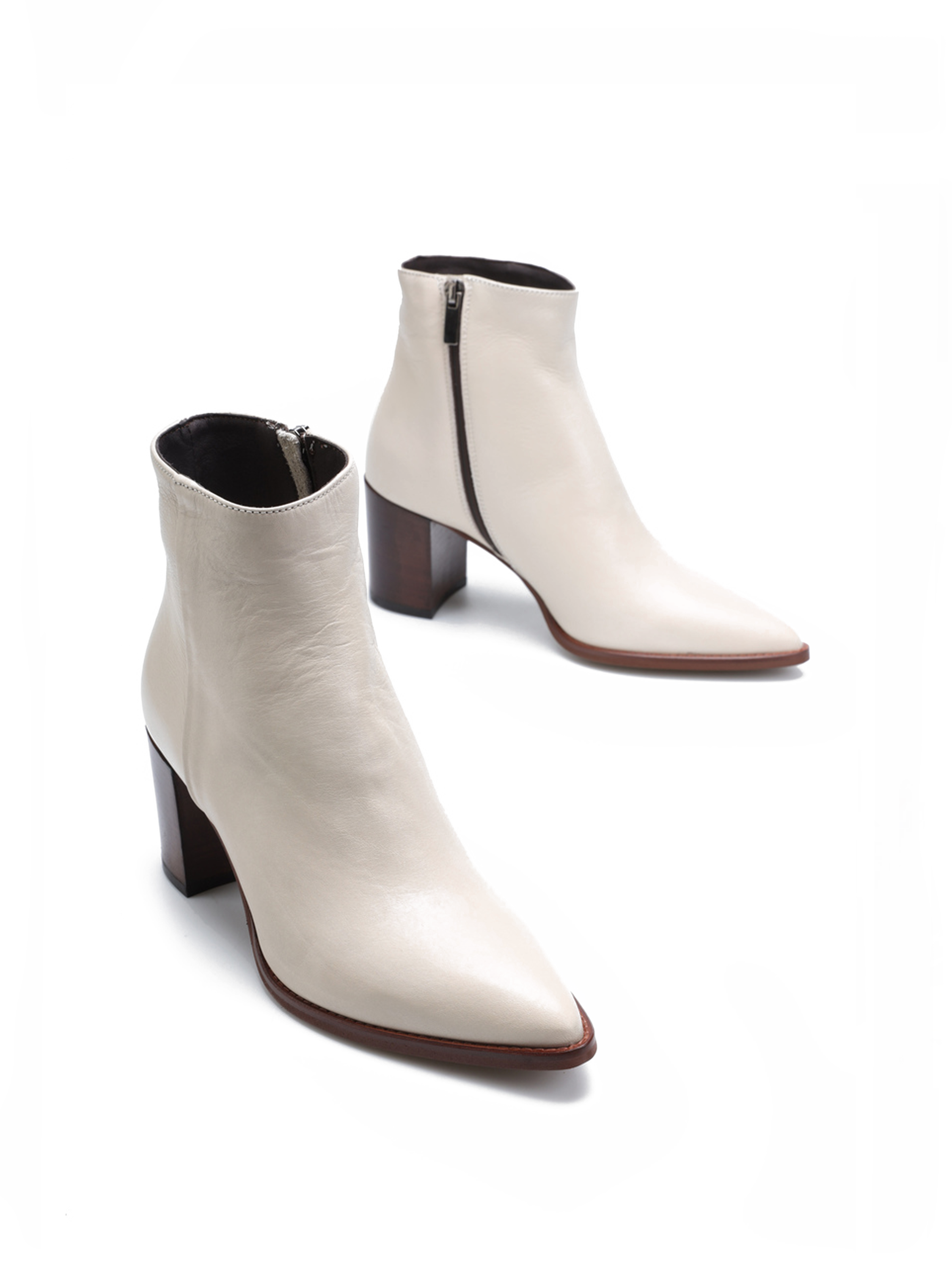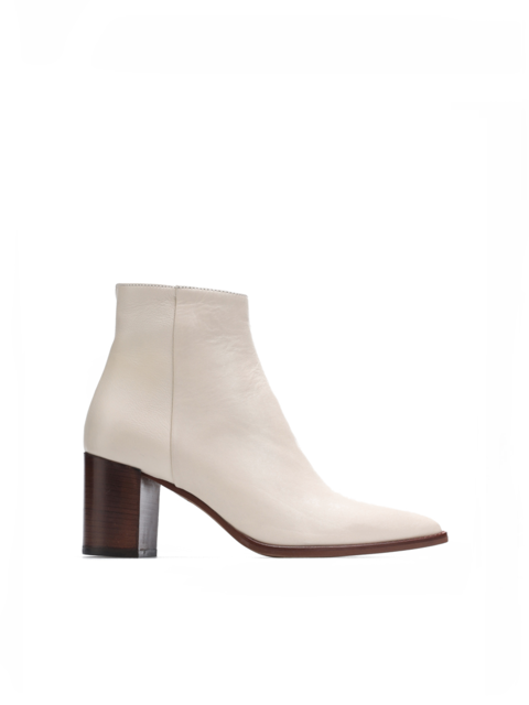 Wykonane są z włoskiej naturalnej skóry licowej. Kremowa cholewka za kostkę wyposażona została w zamek błyskawiczny ułatwiający zakładanie i zdejmowanie obuwia. Modny nosek w szpic i stabilny obcas na słupku idealnie wpisują się w Trendy sezonu. Kontrastowa podeszwa wystająca poza obrys buta przykuwa wzrok.