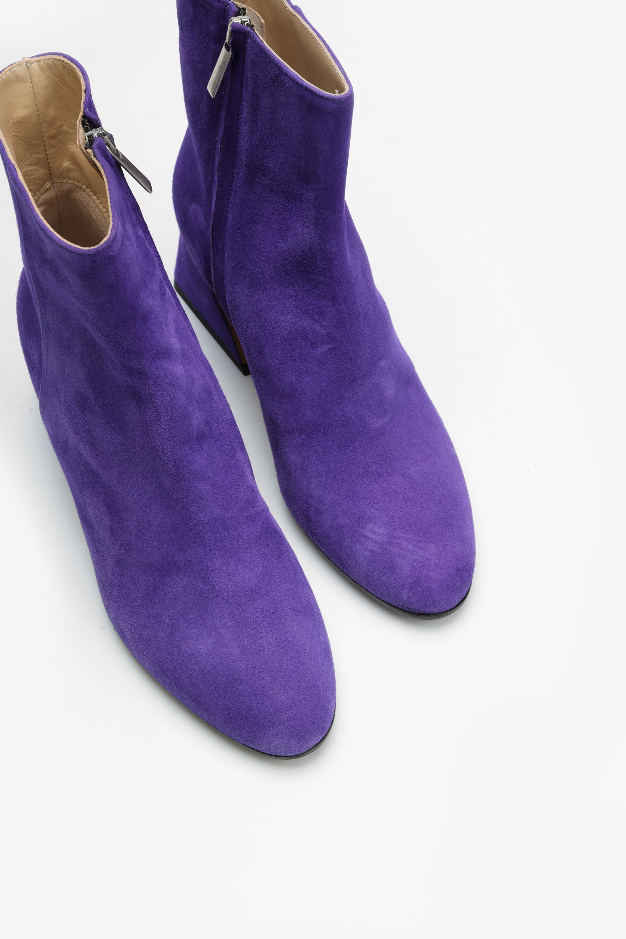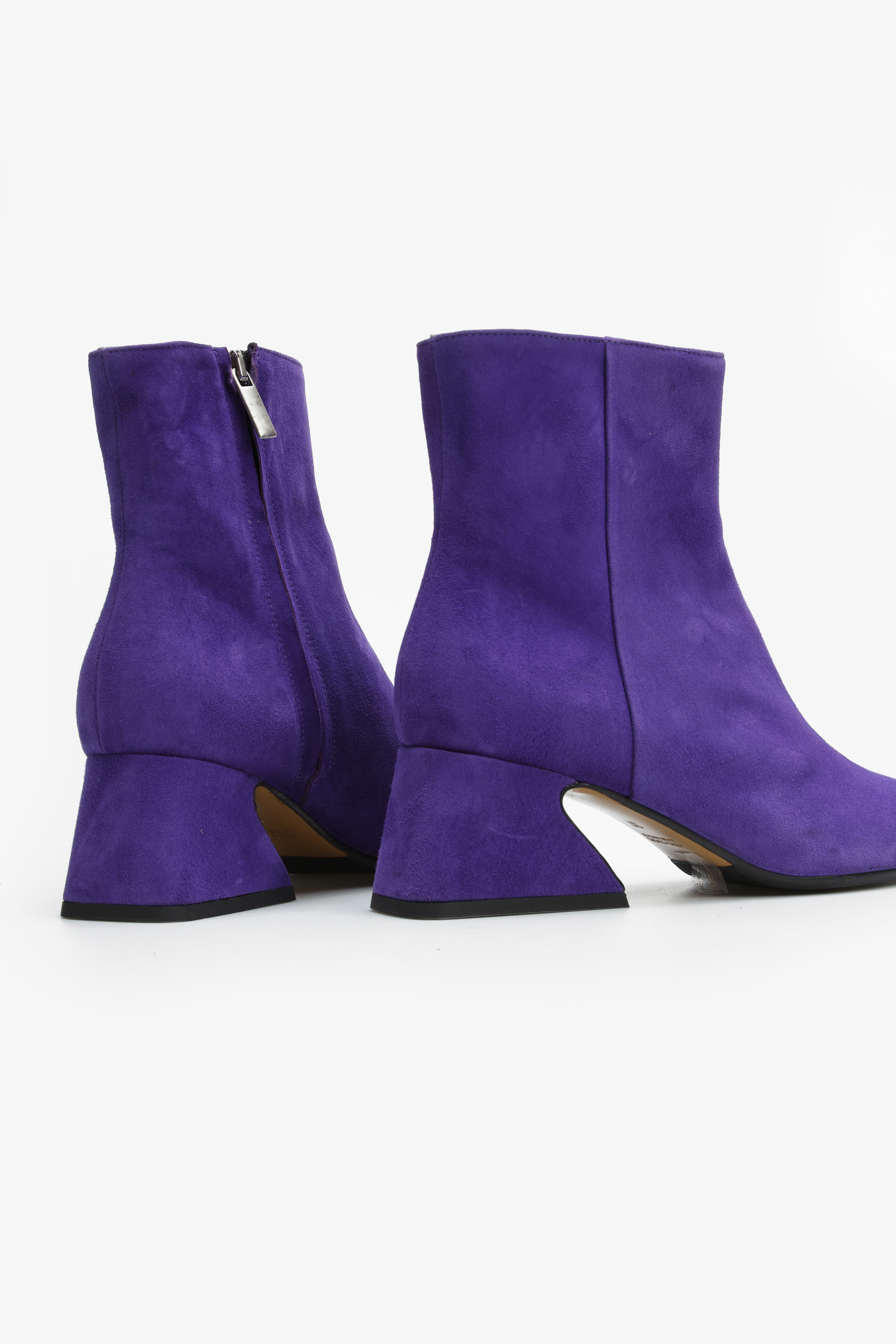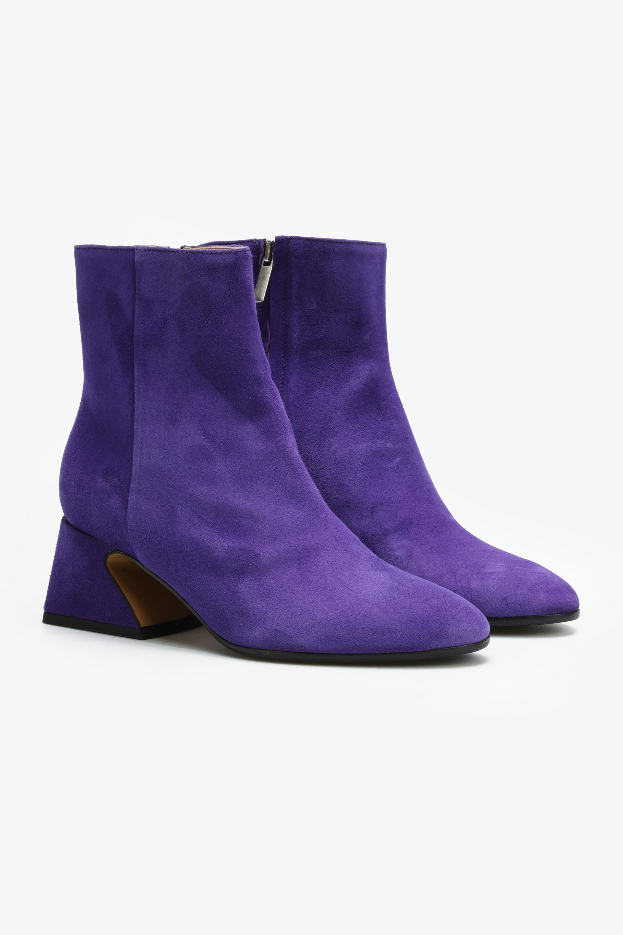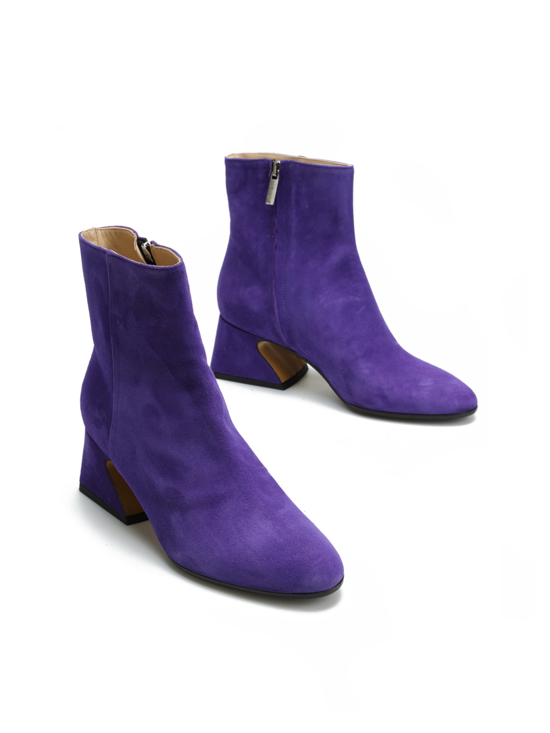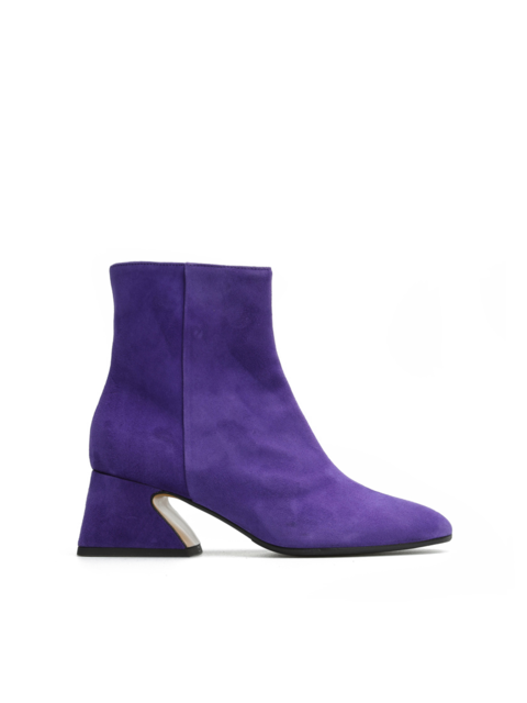 Stylowe botki w całości wykonane są z włoskiej zamszowej skóry. Wygodny, geometryczny obcas w połączeniu z modowym kolorem sprawia, że prosty krój nabiera oryginalnego designu.