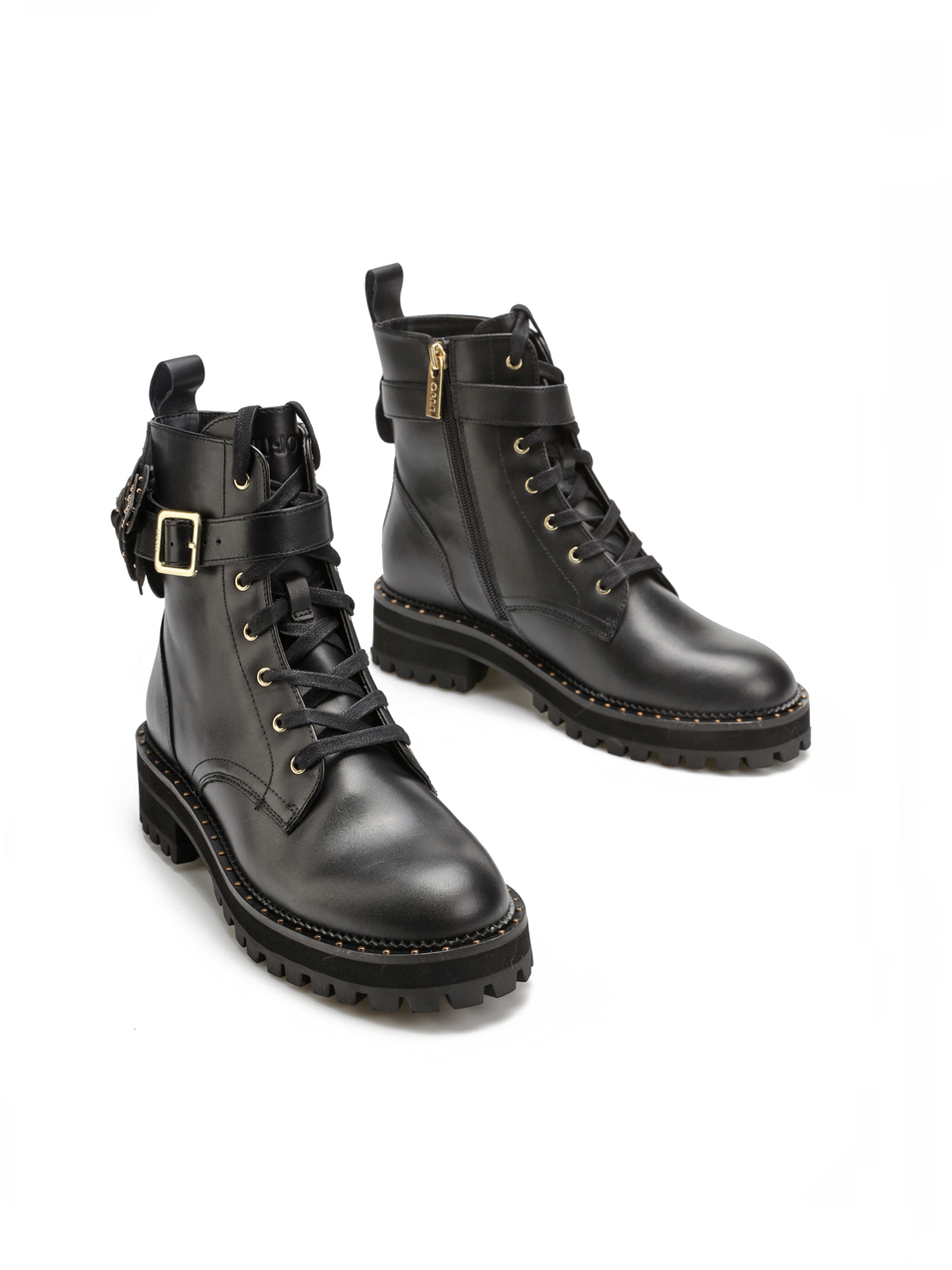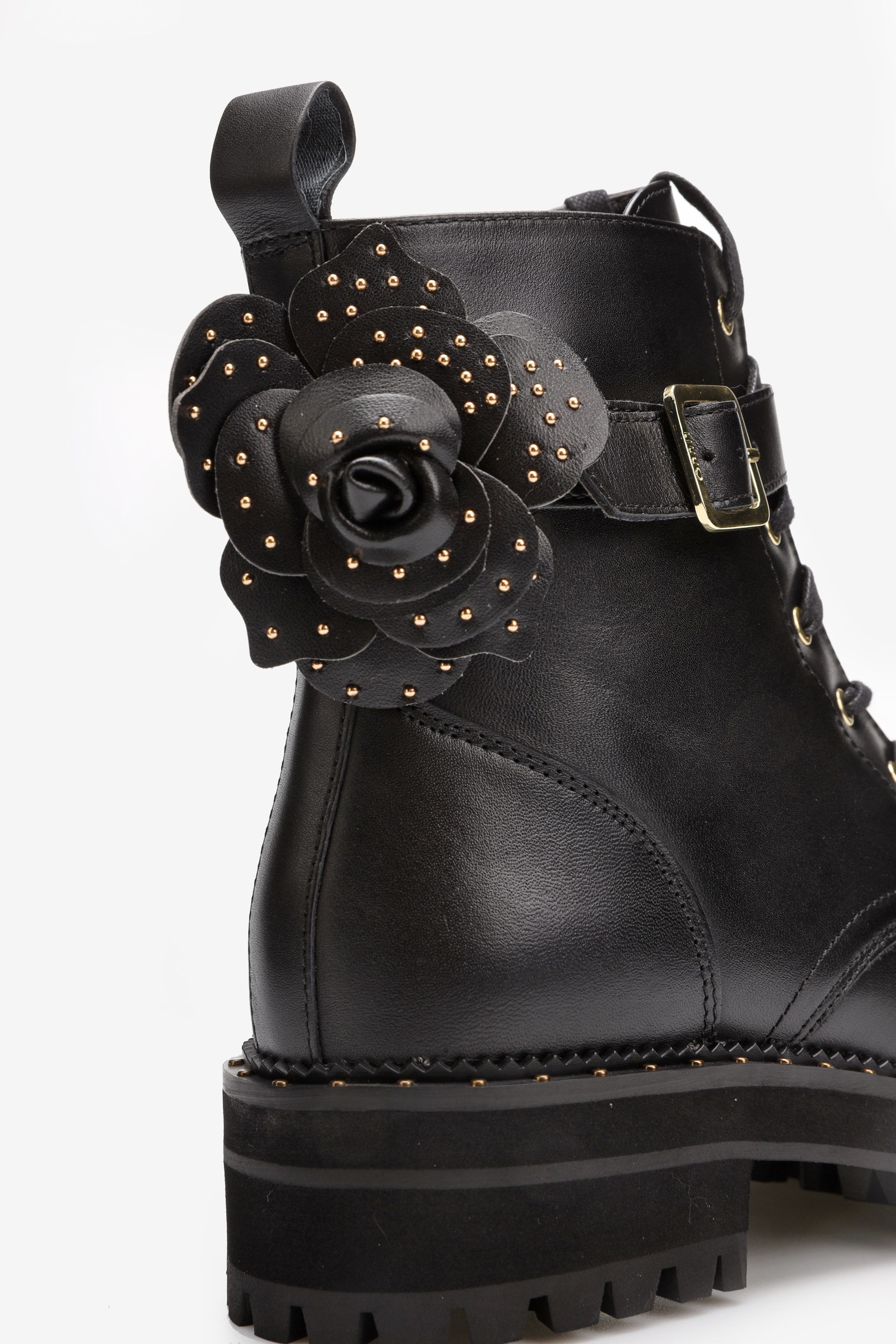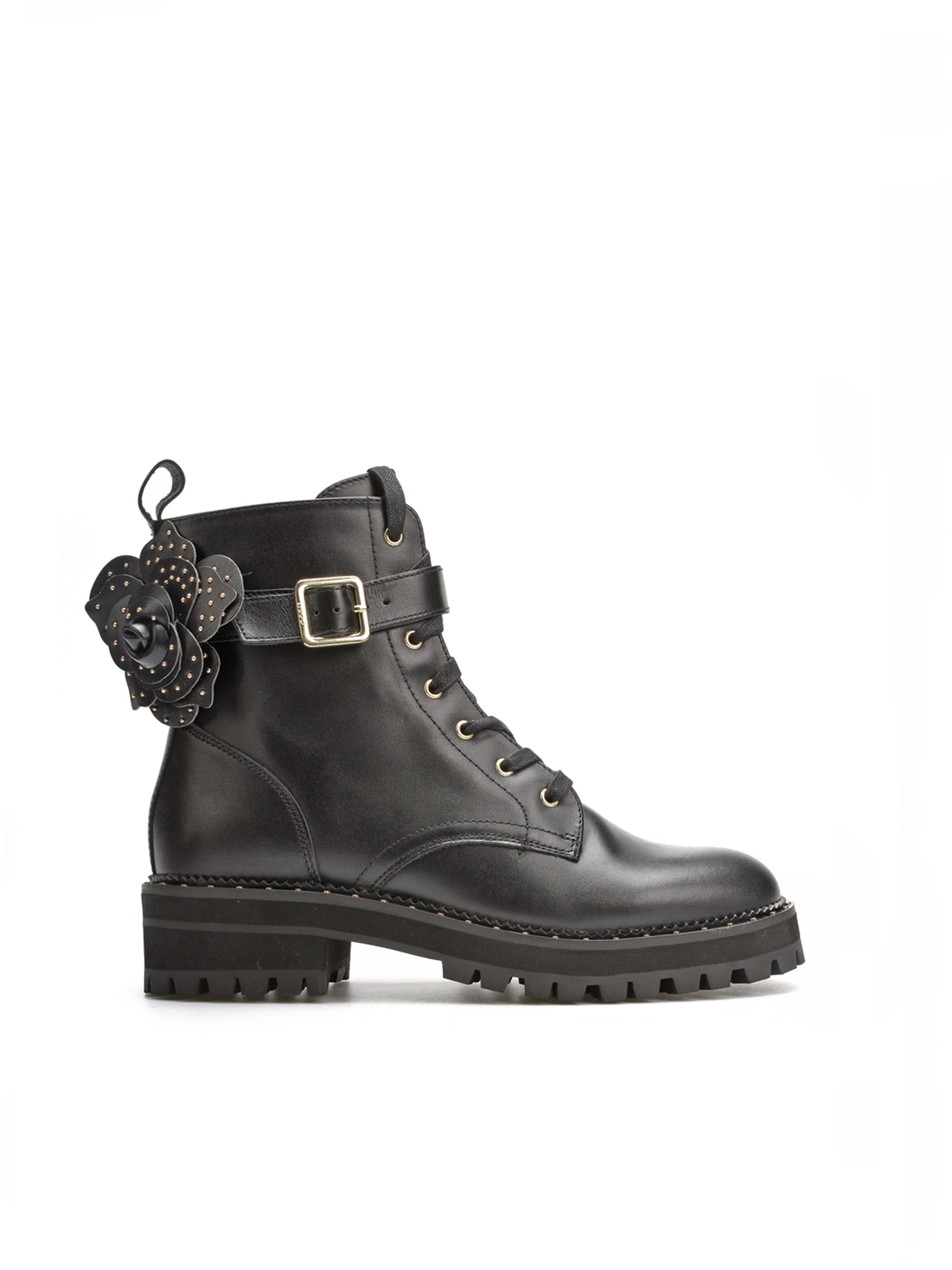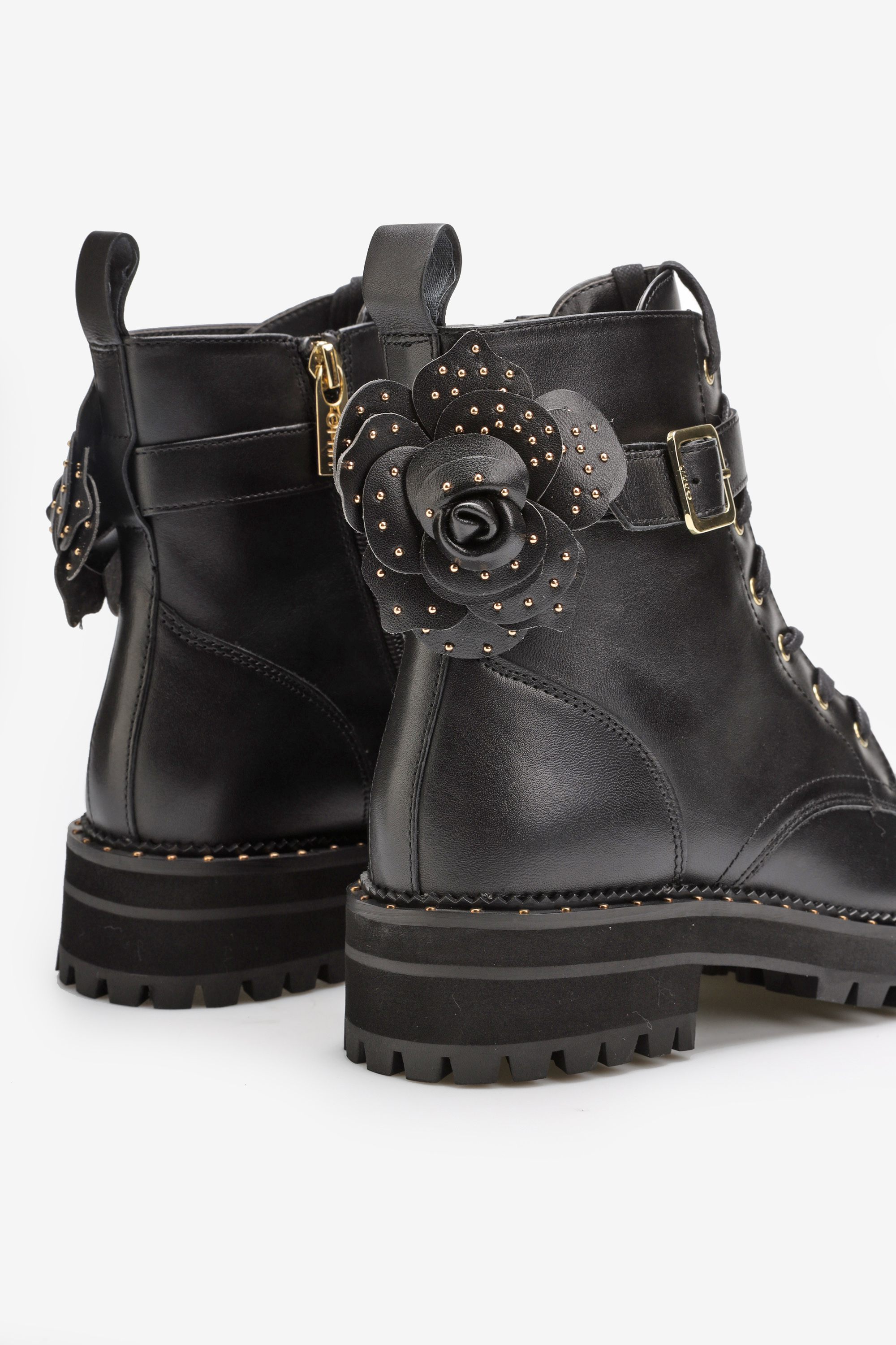 Sznurowane botki za kostkę w całości wykonane są z naturalnej skóry licowej. Czarna cholewka wzbogacona została o zamek błyskawiczny ułatwiający zakładanie i zdejmowanie obuwia. Gruba podeszwa wystająca poza obrys buta w połączeniu ze skórzaną wkładką opdowiada za komfort i wygodę. Detale w postaci złotych elementów oraz ozdobny kwiat przy pasku nadają całości oryginalnego wyglądu.