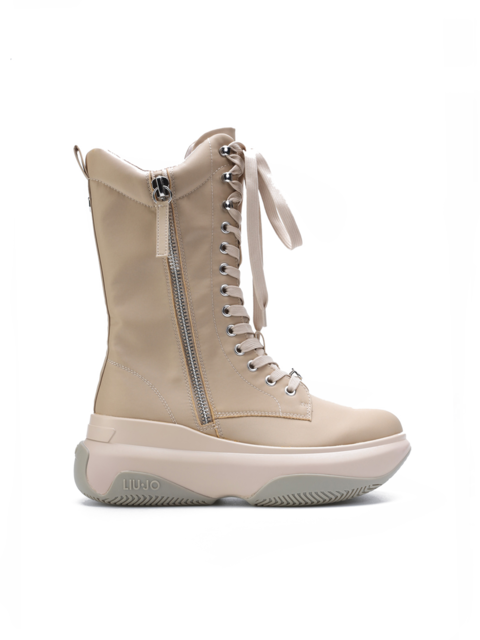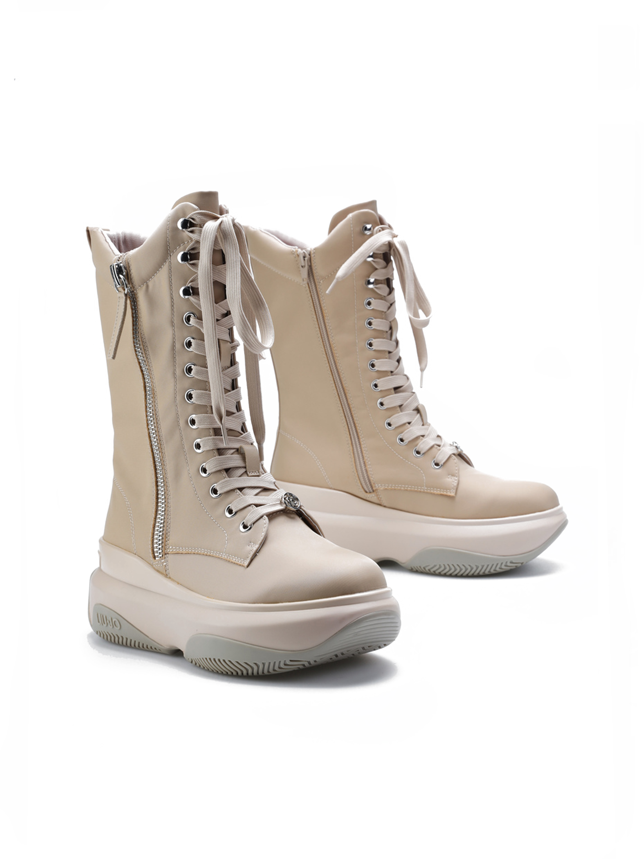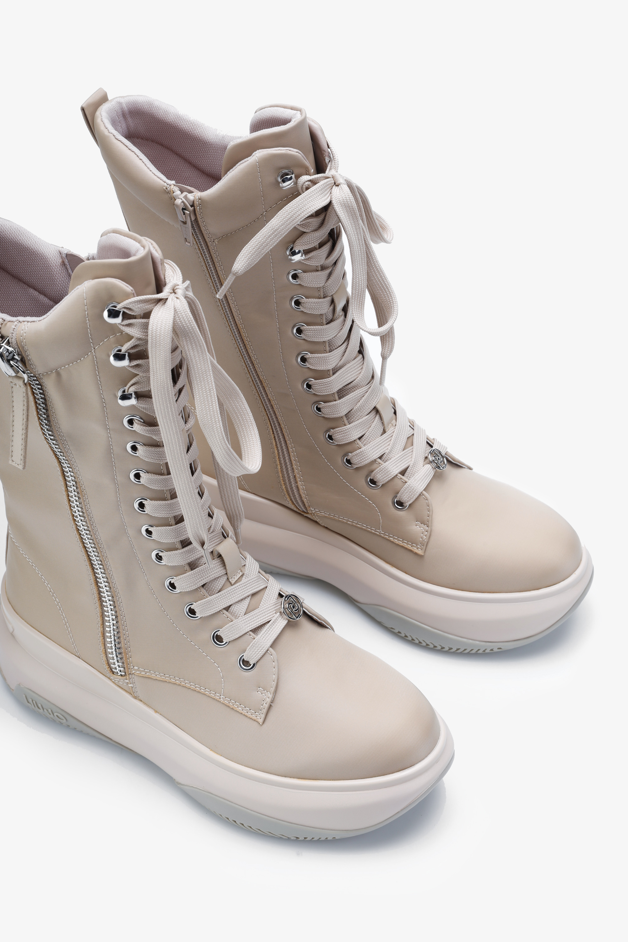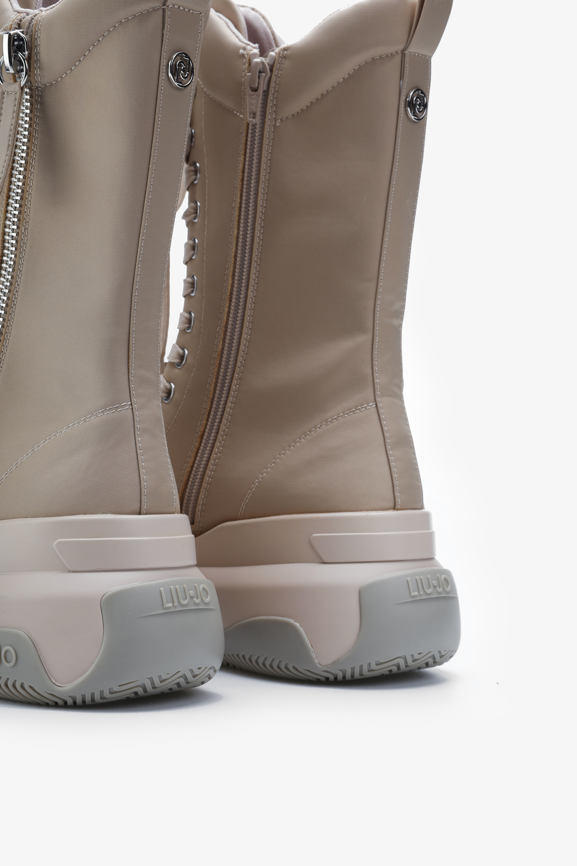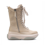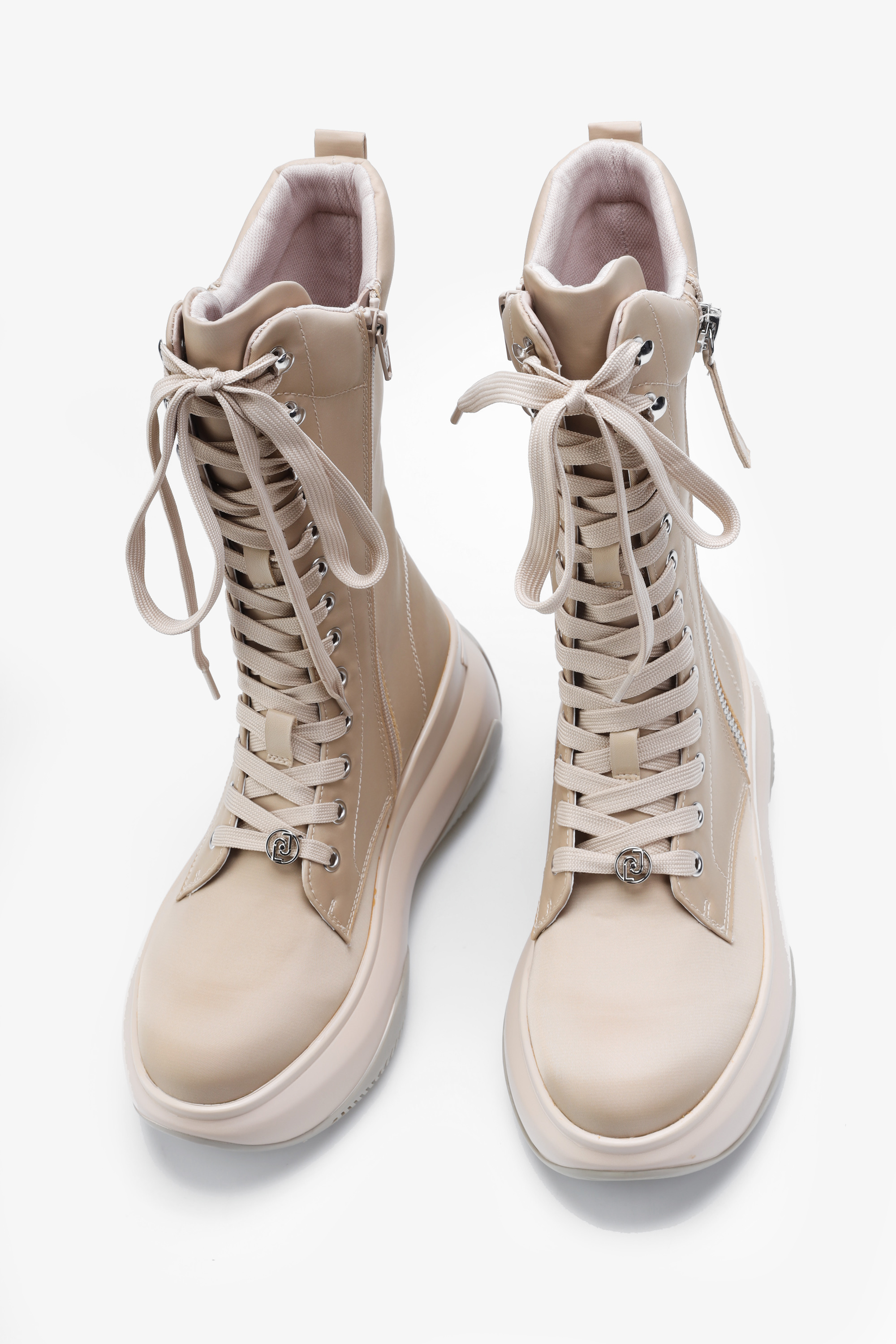 Botki damskie w beżowym kolorze natury wykonane są z wysokogatunkowych materiałów. Sznurowana cholewka za kostkę wzbogacona została o zamek błyskwiczny ułatwiający zakładanie i zdejmowanie obuwia. Gruba, gumowa podeszwa na platformie to must have sezonu. Odpowiada ona za wygodę i komfort chodzenia przez cały dzień.