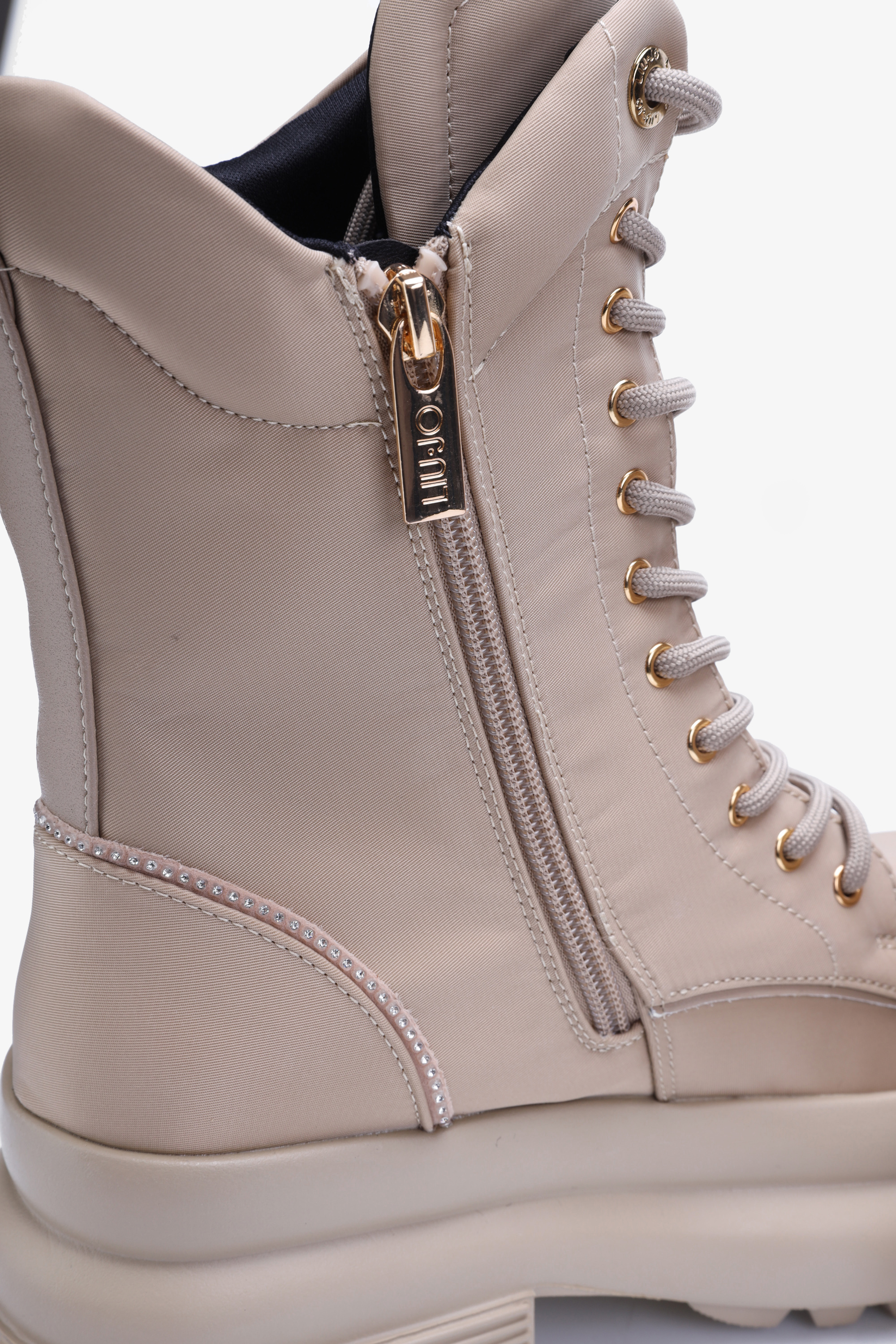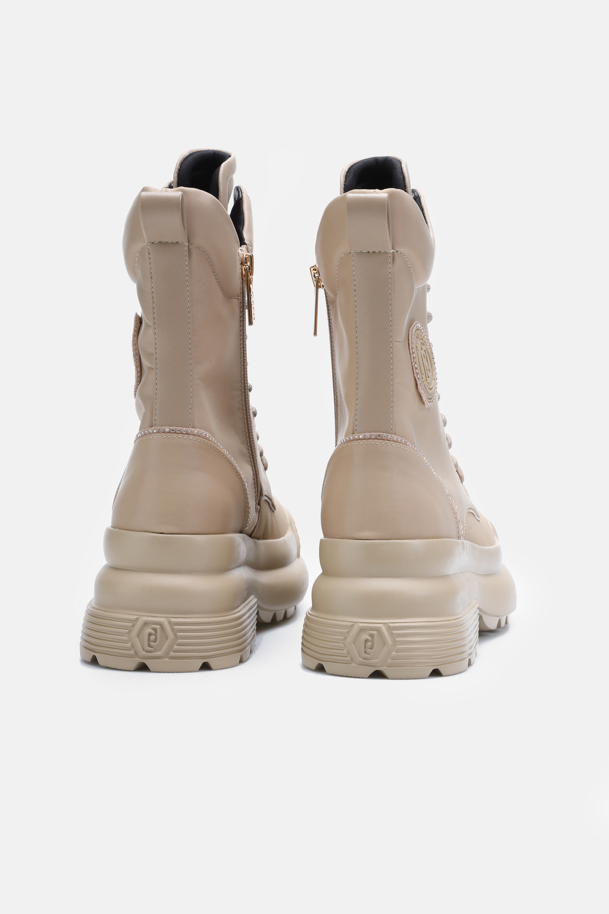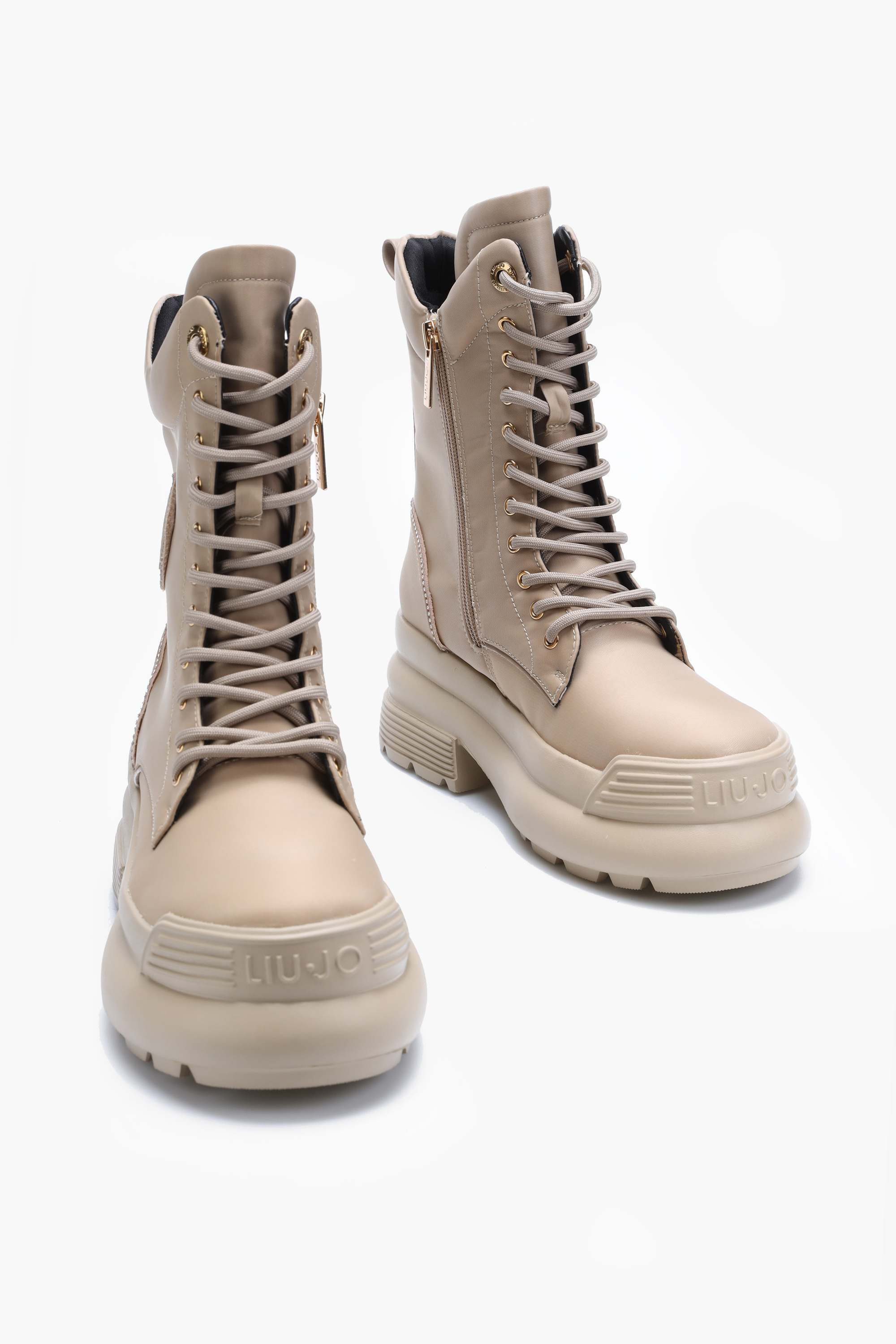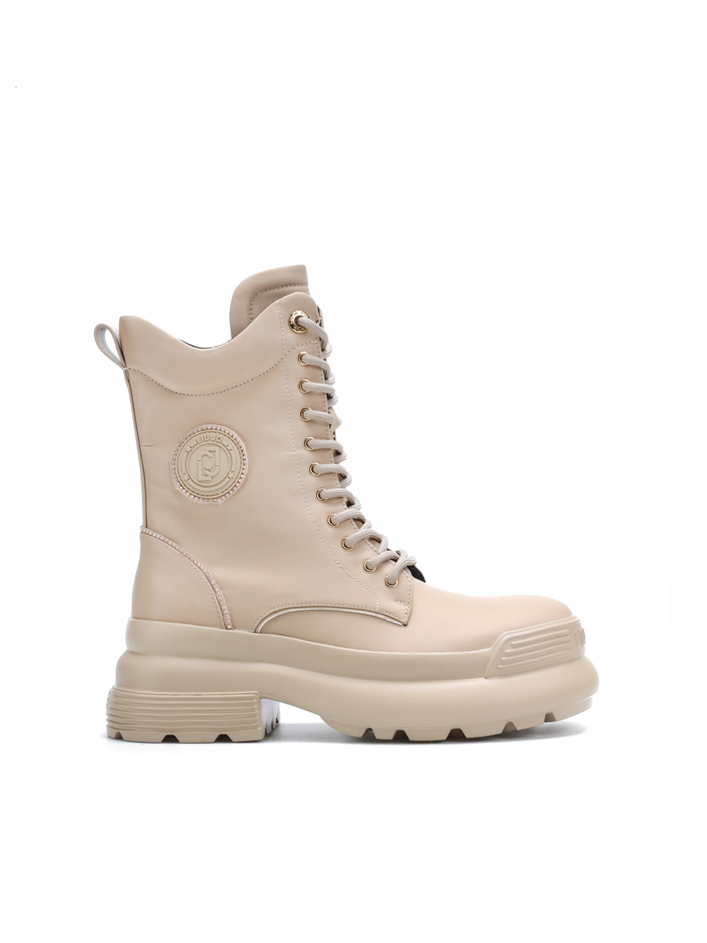 Botki damskie w beżowym kolorze natury wykonane są z wysokogatunkowych materiałów. Sznurowana cholewka za kostkę wzbogacona została o zamek błyskwiczny ułatwiający zakładanie i zdejmowanie obuwia. Gruba podeszwa na platformie to must have sezonu. Odpowiada ona za wygodę i komfort chodzenia przez cały dzień. Logo marki Liu Jo znajdujące się na zewnętrznej stronie cholewki to minimalistyczny detal przykuwający wzrok.