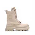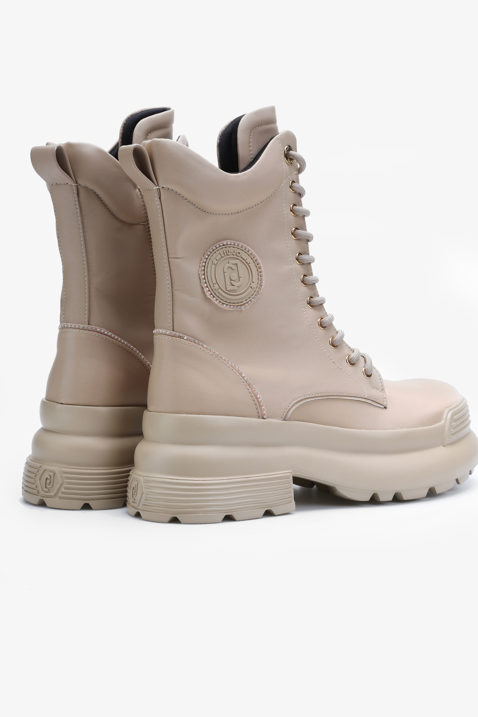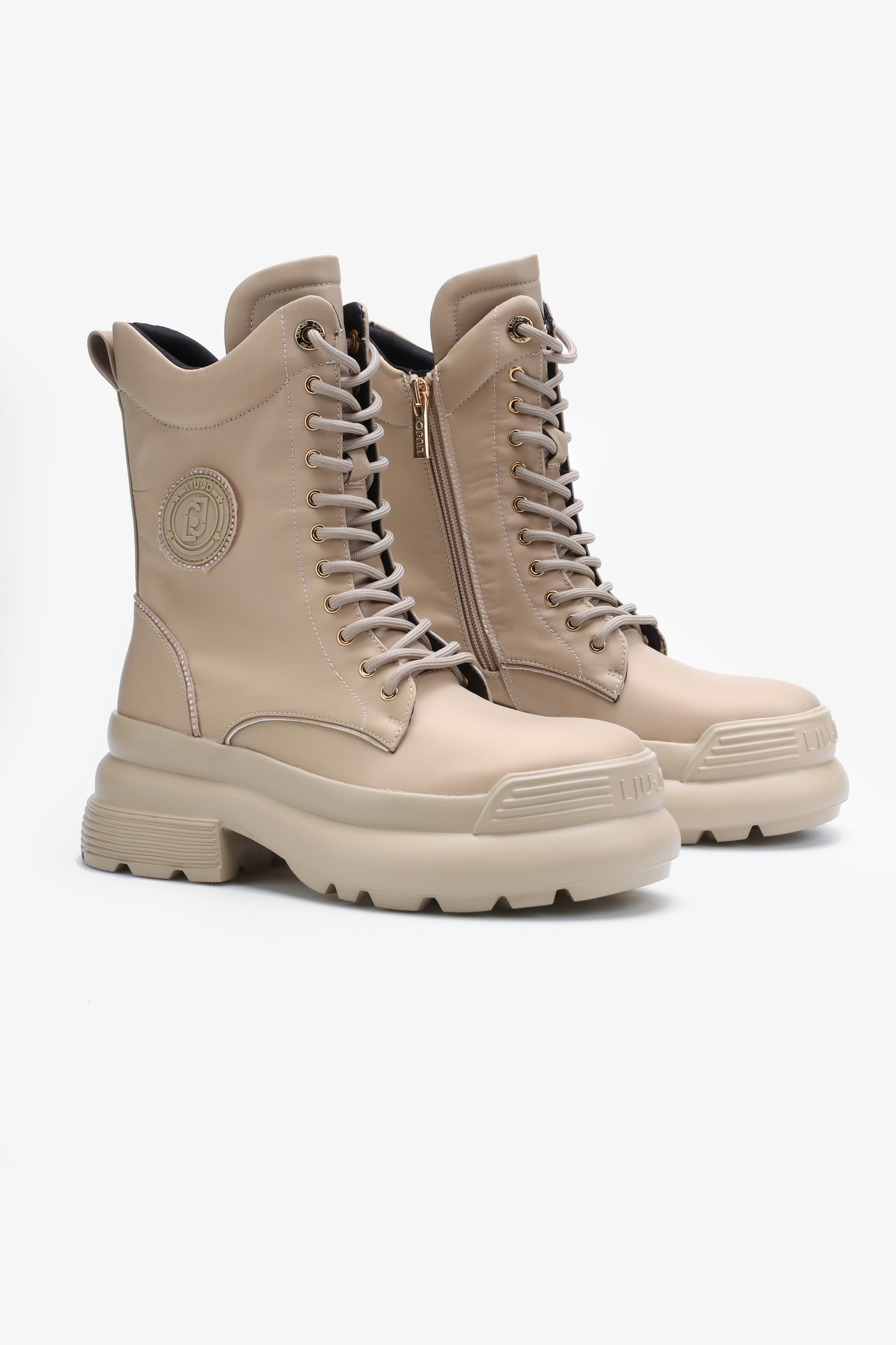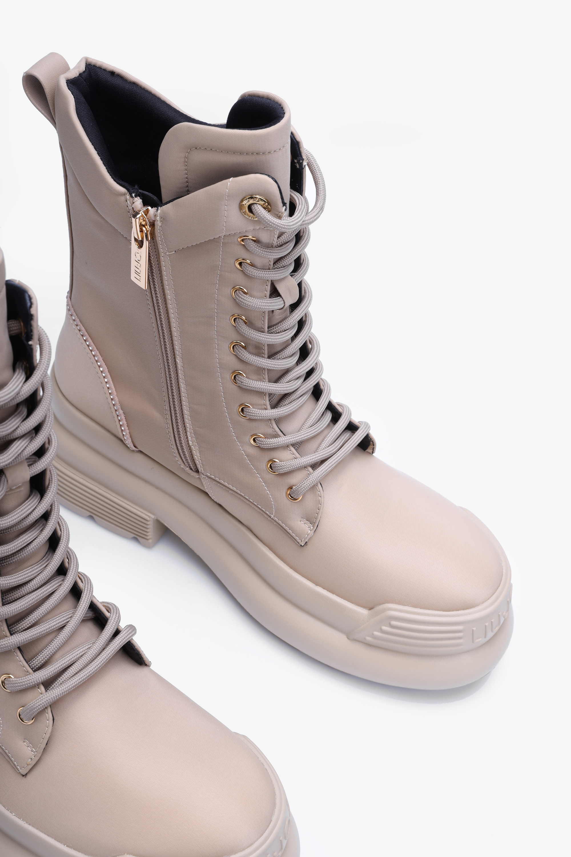 Botki damskie w beżowym kolorze natury wykonane są z wysokogatunkowych materiałów. Sznurowana cholewka za kostkę wzbogacona została o zamek błyskwiczny ułatwiający zakładanie i zdejmowanie obuwia. Gruba podeszwa na platformie to must have sezonu. Odpowiada ona za wygodę i komfort chodzenia przez cały dzień. Logo marki Liu Jo znajdujące się na zewnętrznej stronie cholewki to minimalistyczny detal przykuwający wzrok.