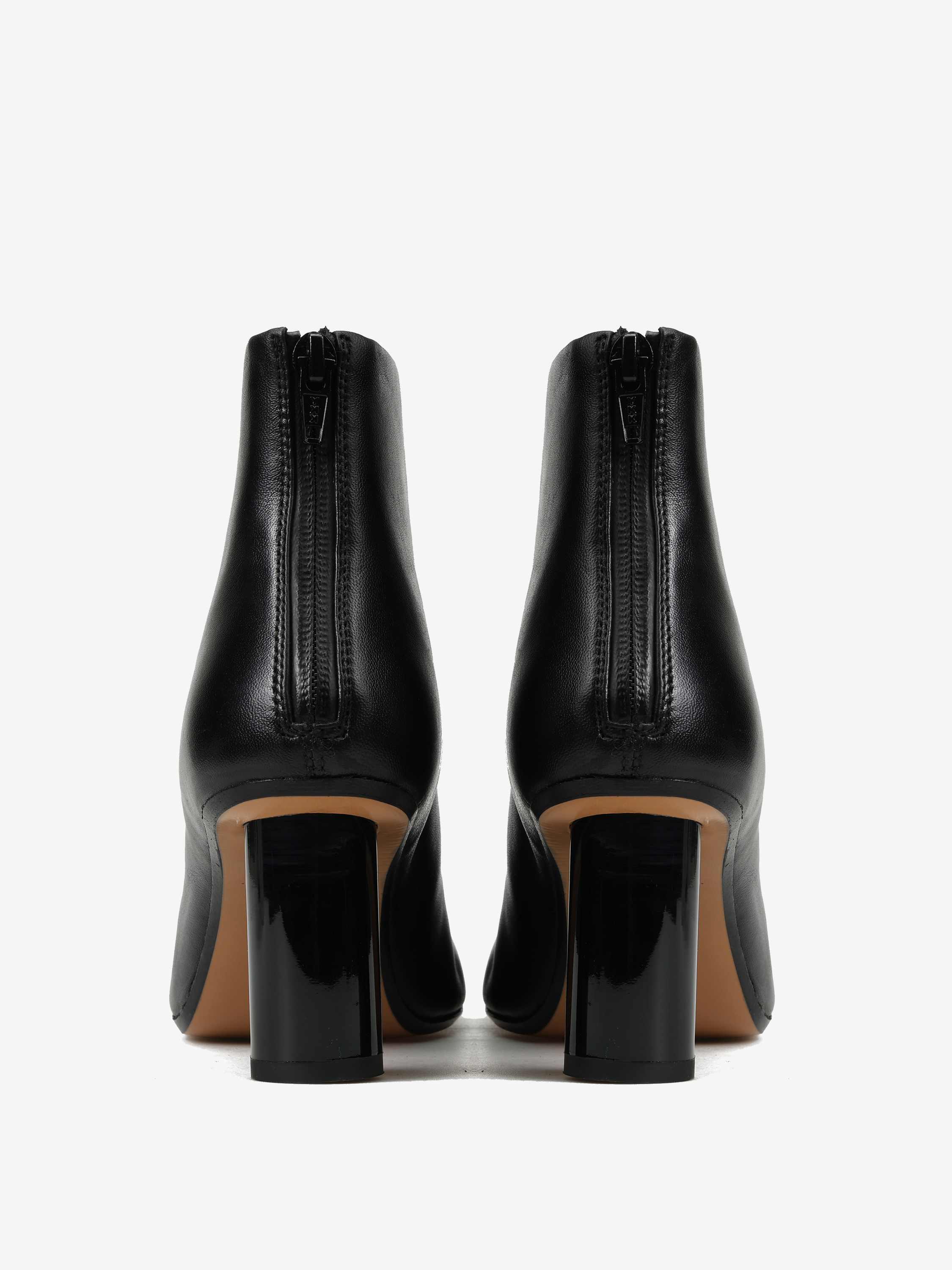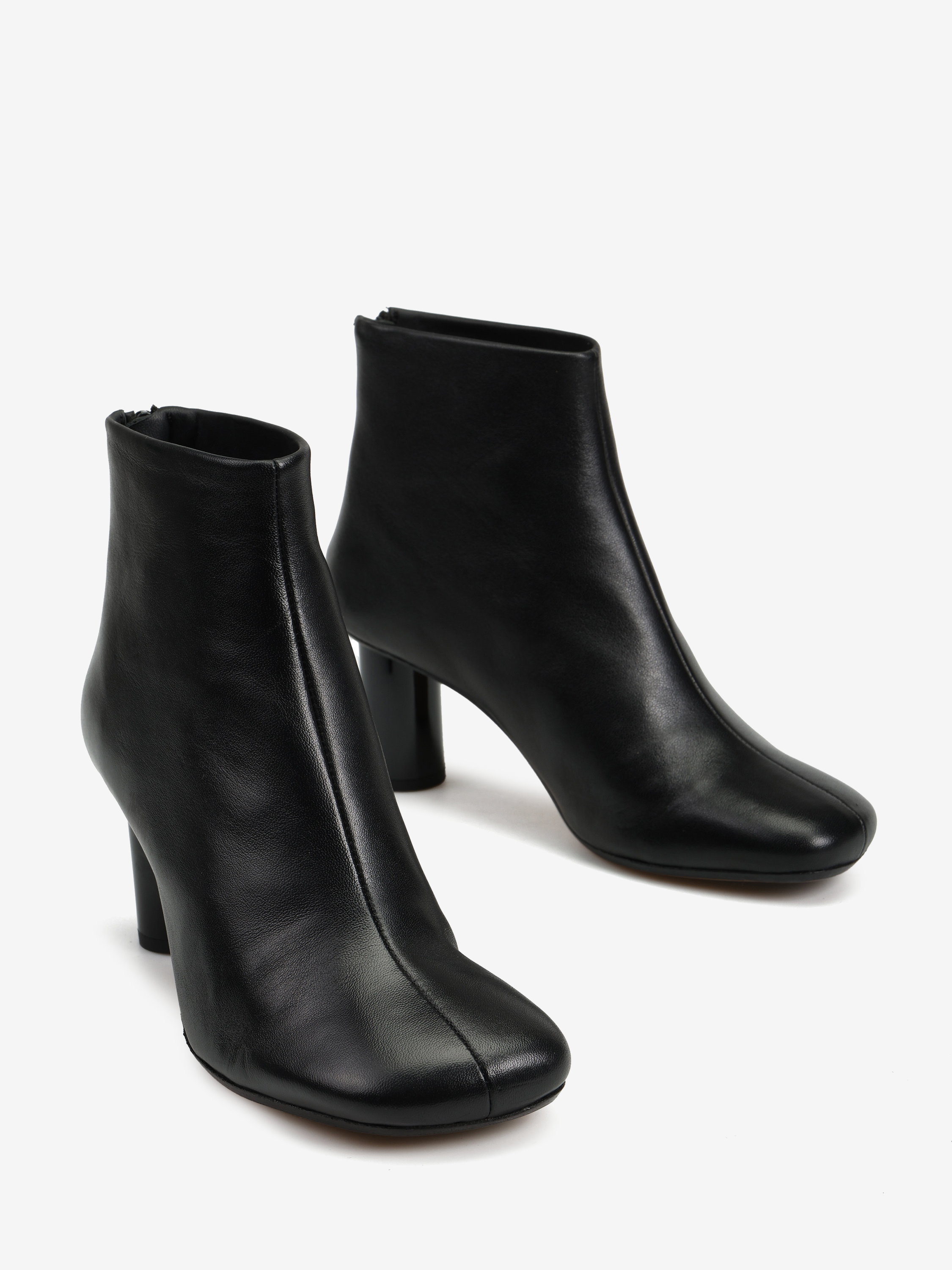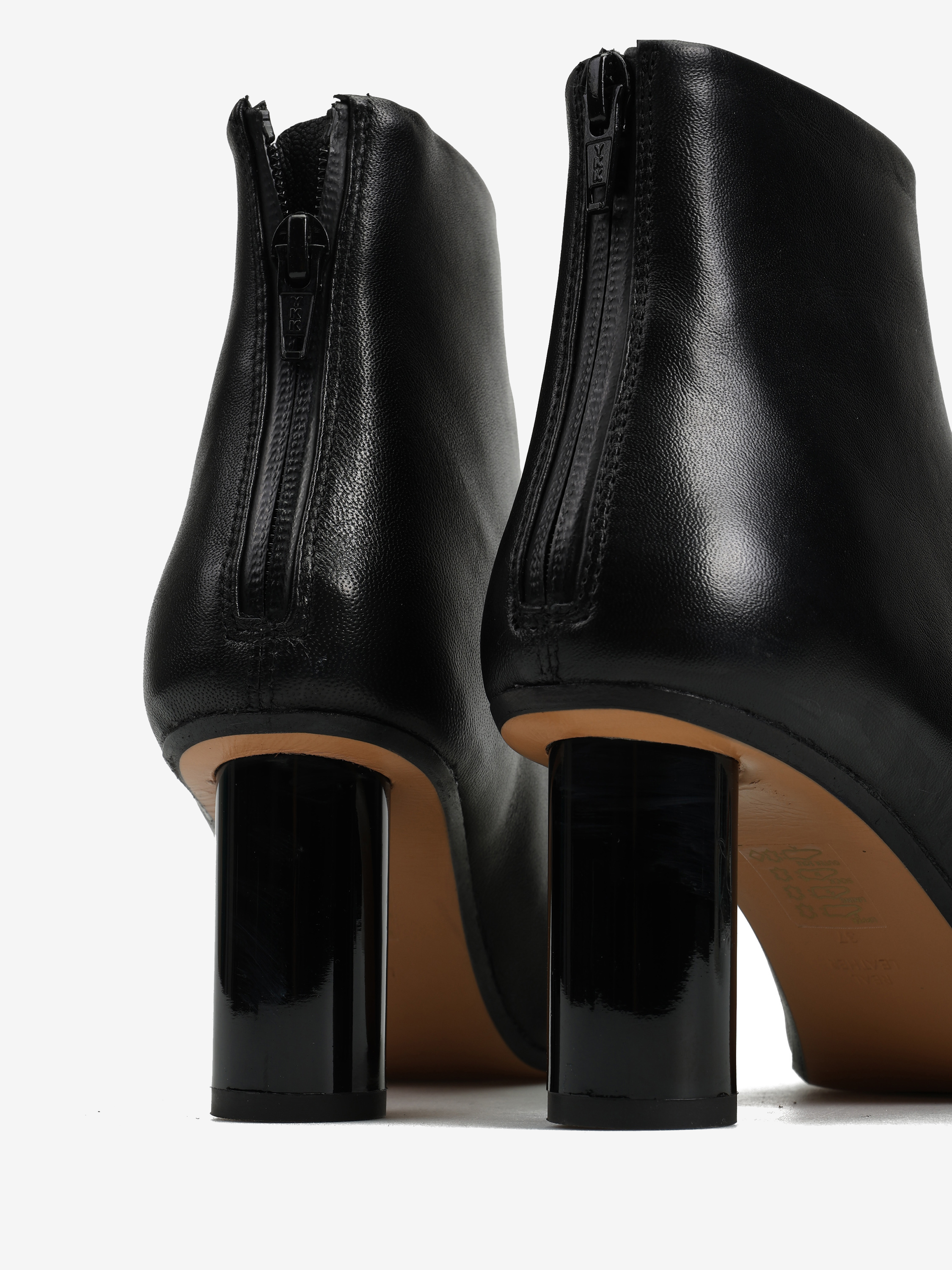 Botki na słupku, zapinane na suwak na pięcie. Asymetryczne noski.