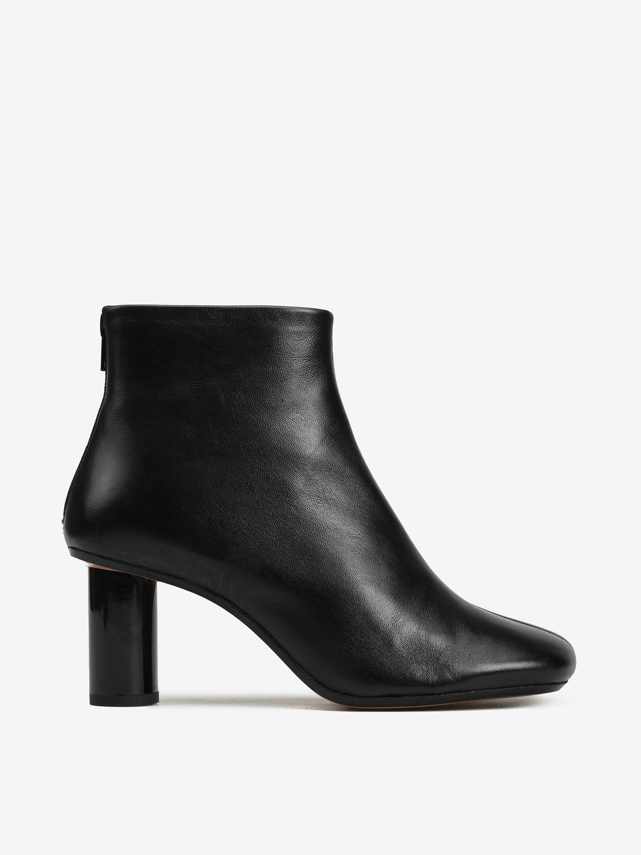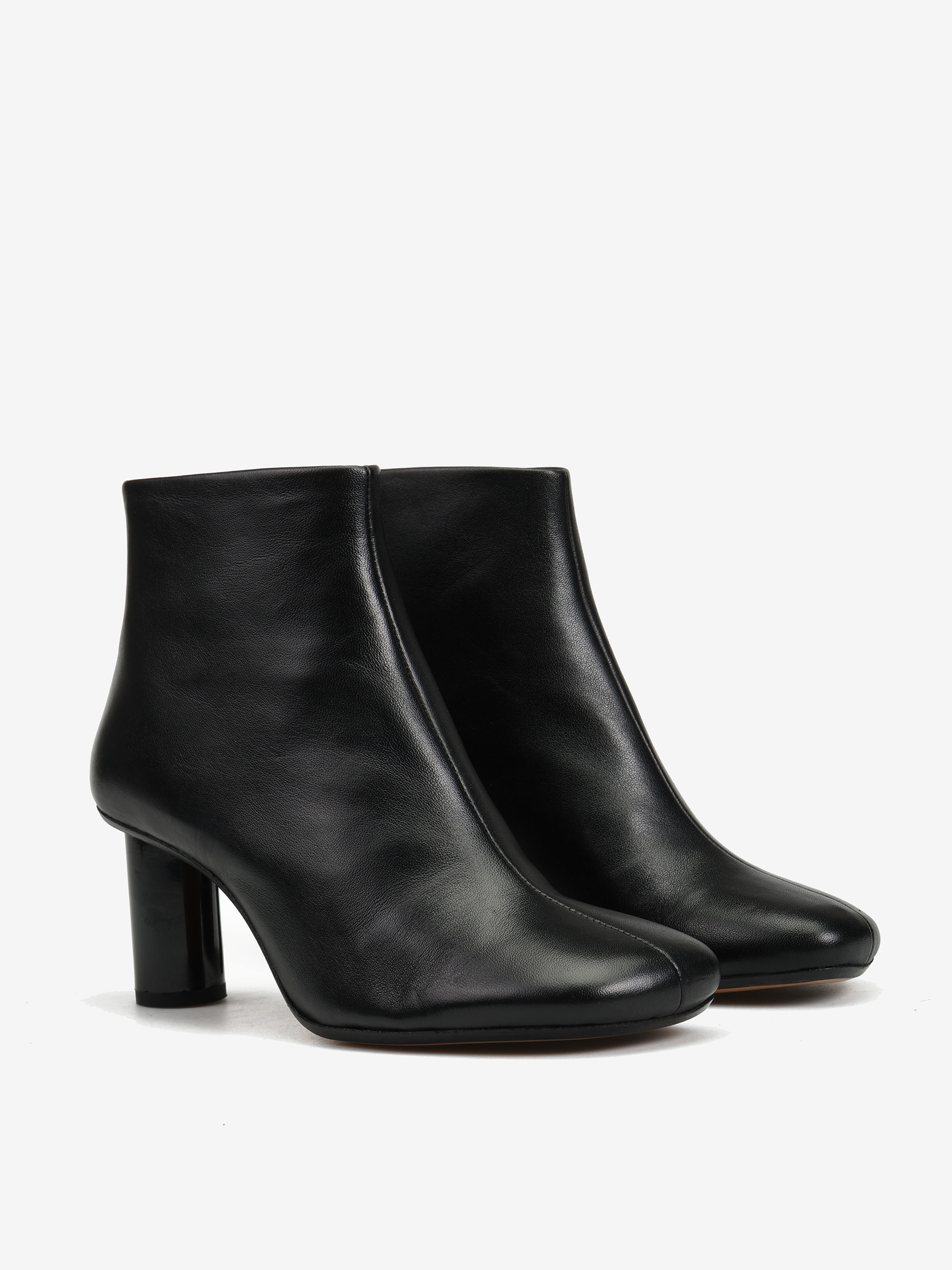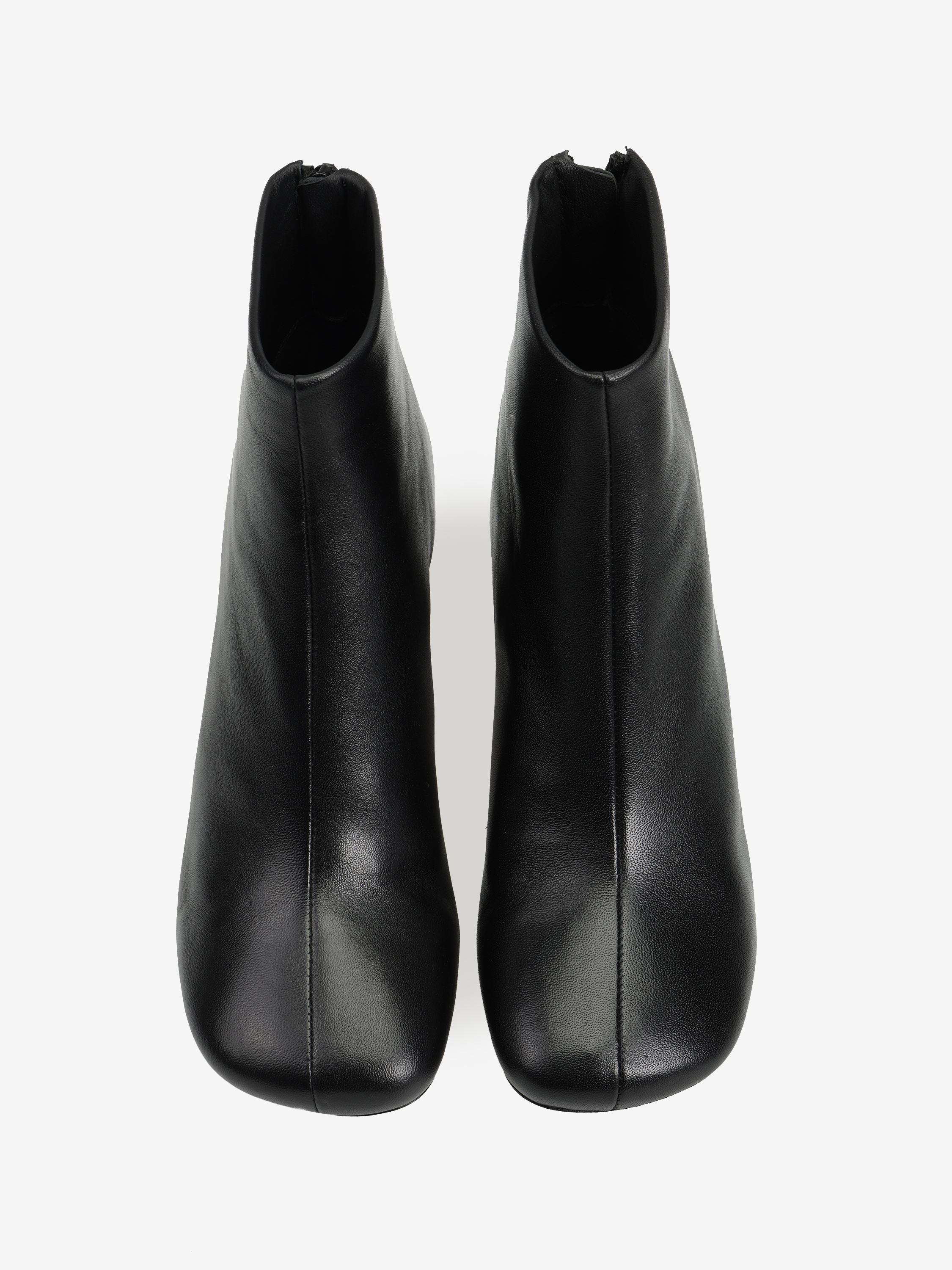 Botki na słupku, zapinane na suwak na pięcie. Asymetryczne noski.