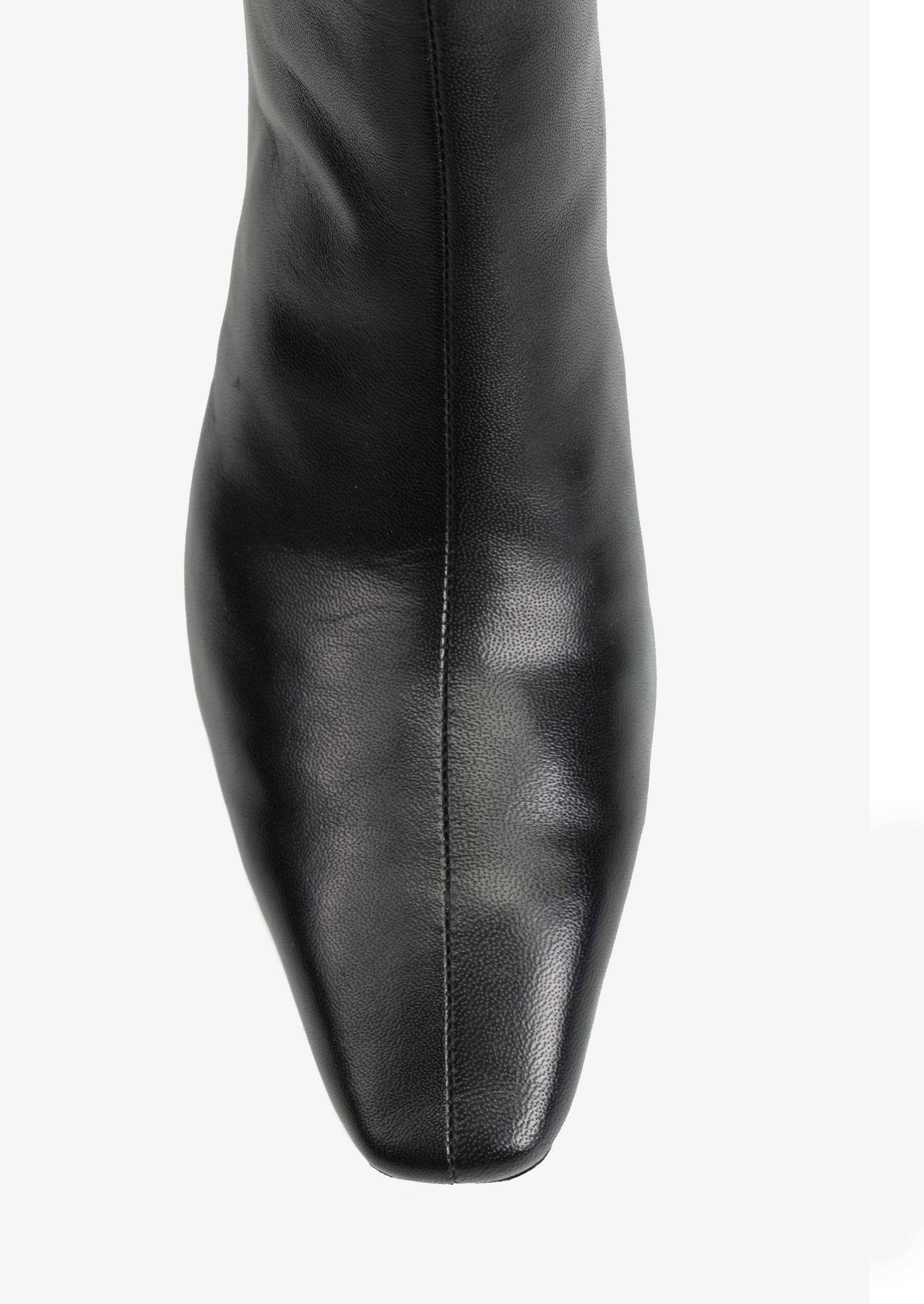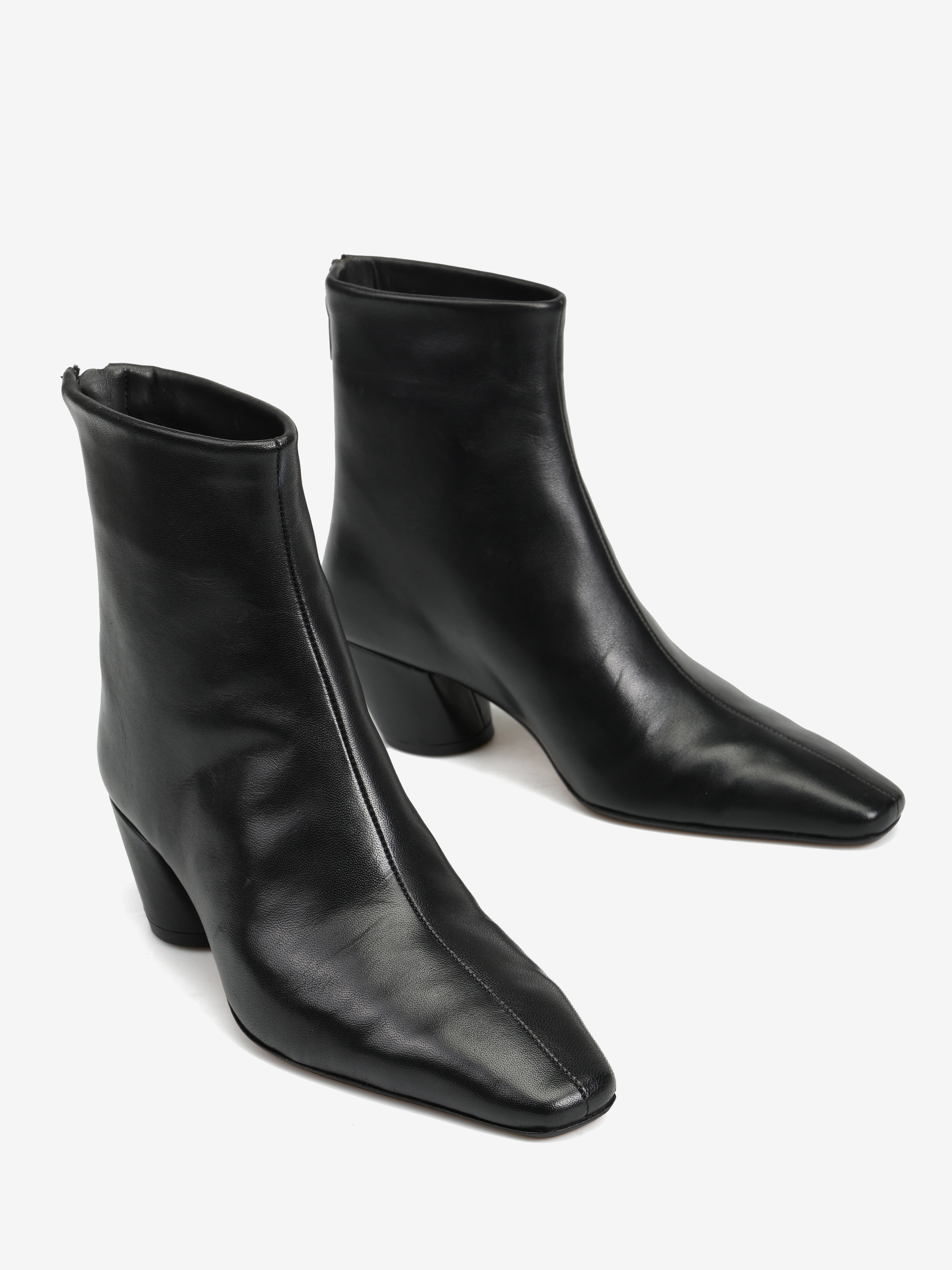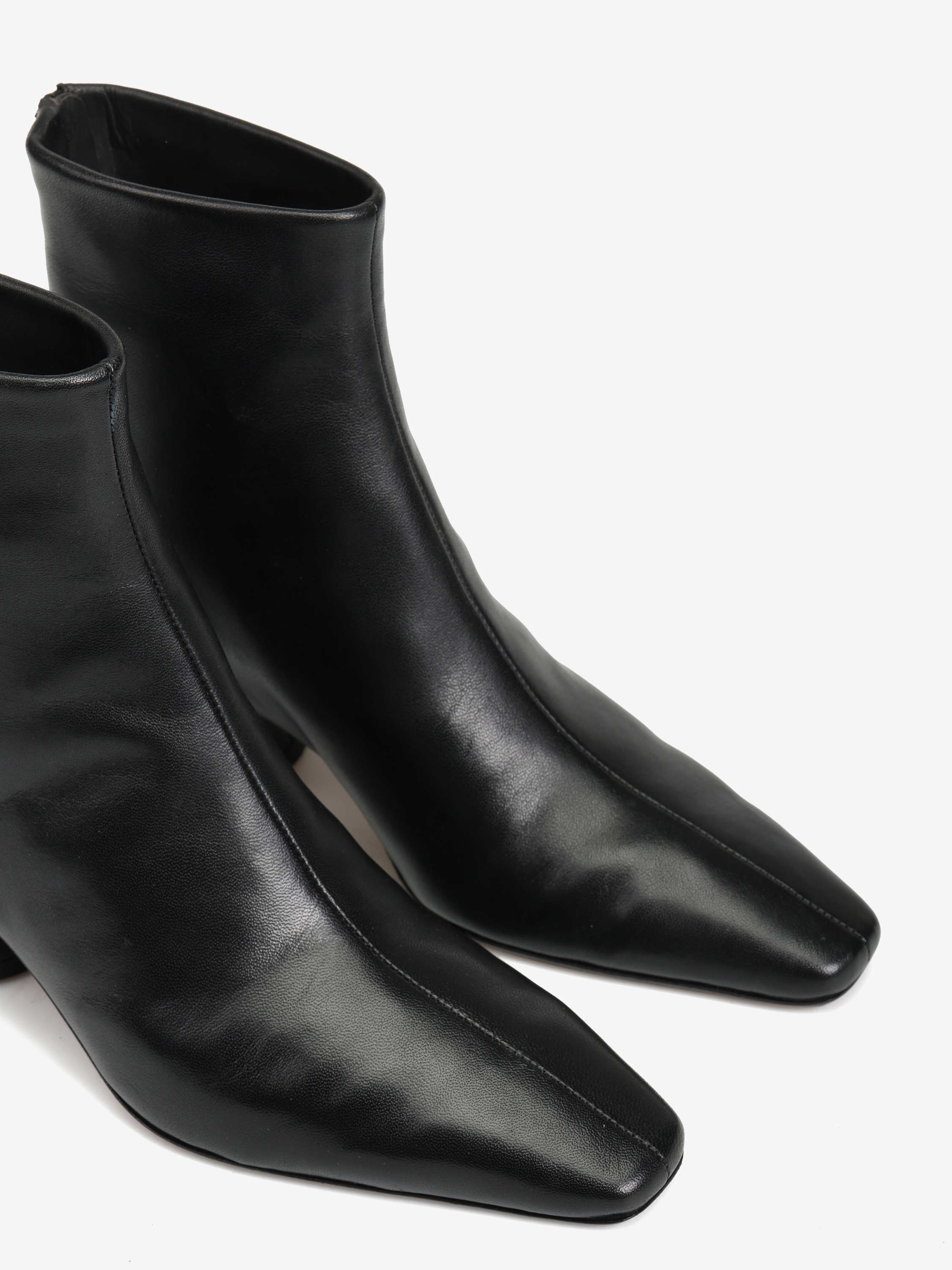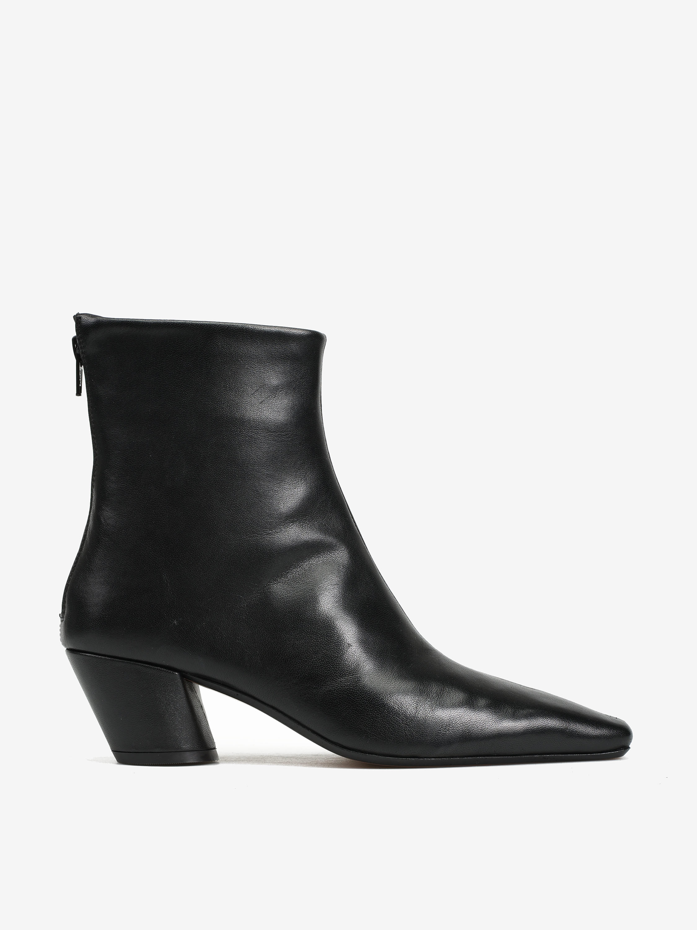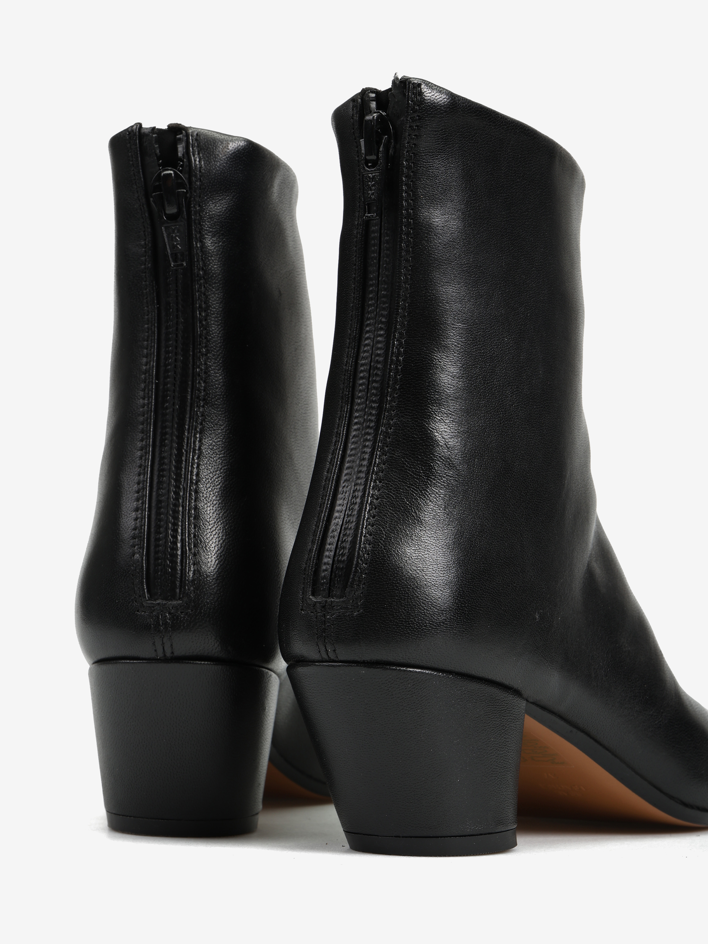Skórzane botki ze ściętym obcasem i zapięciem na suwak. Wydłużone, kwadratowe noski.