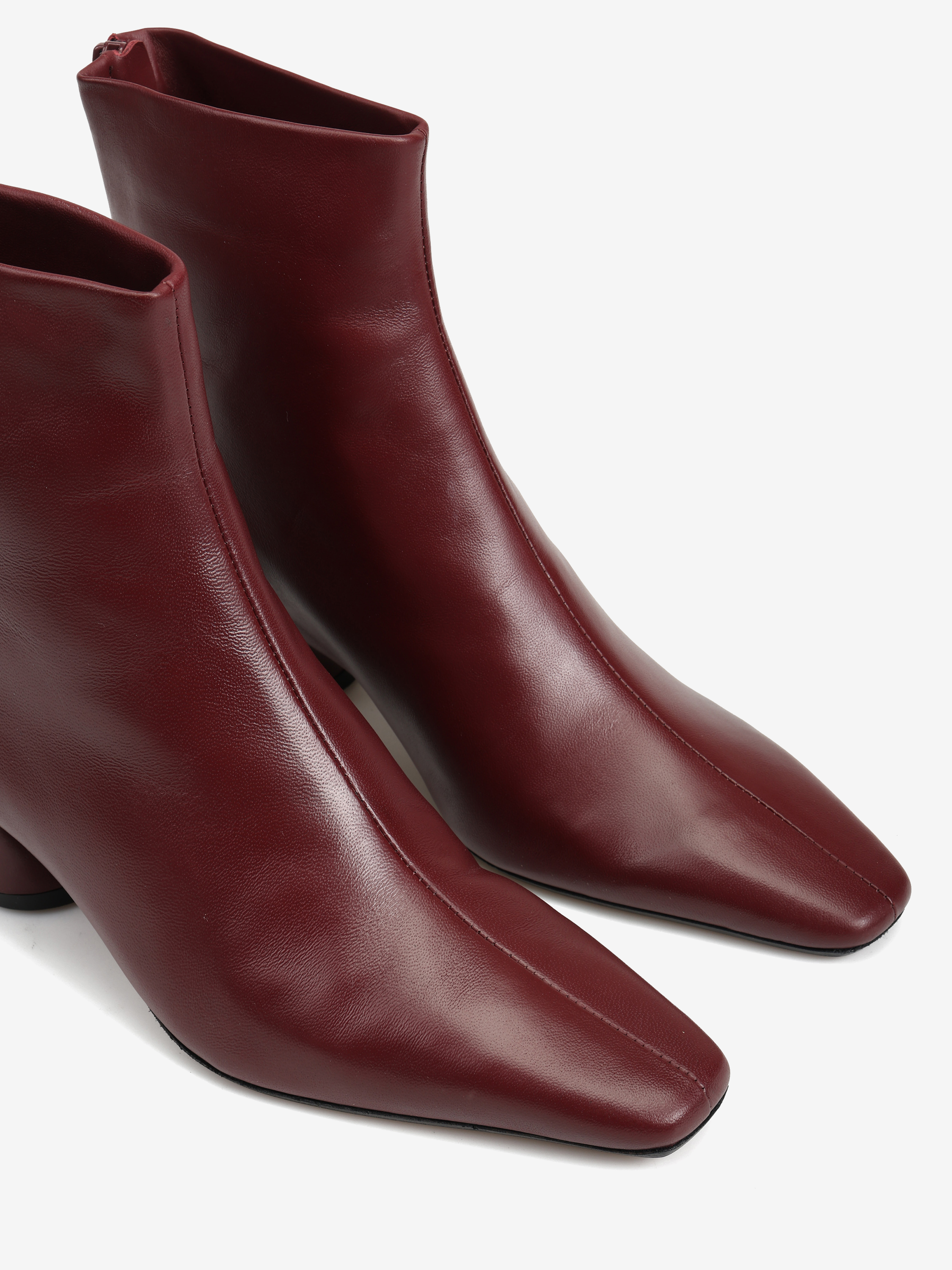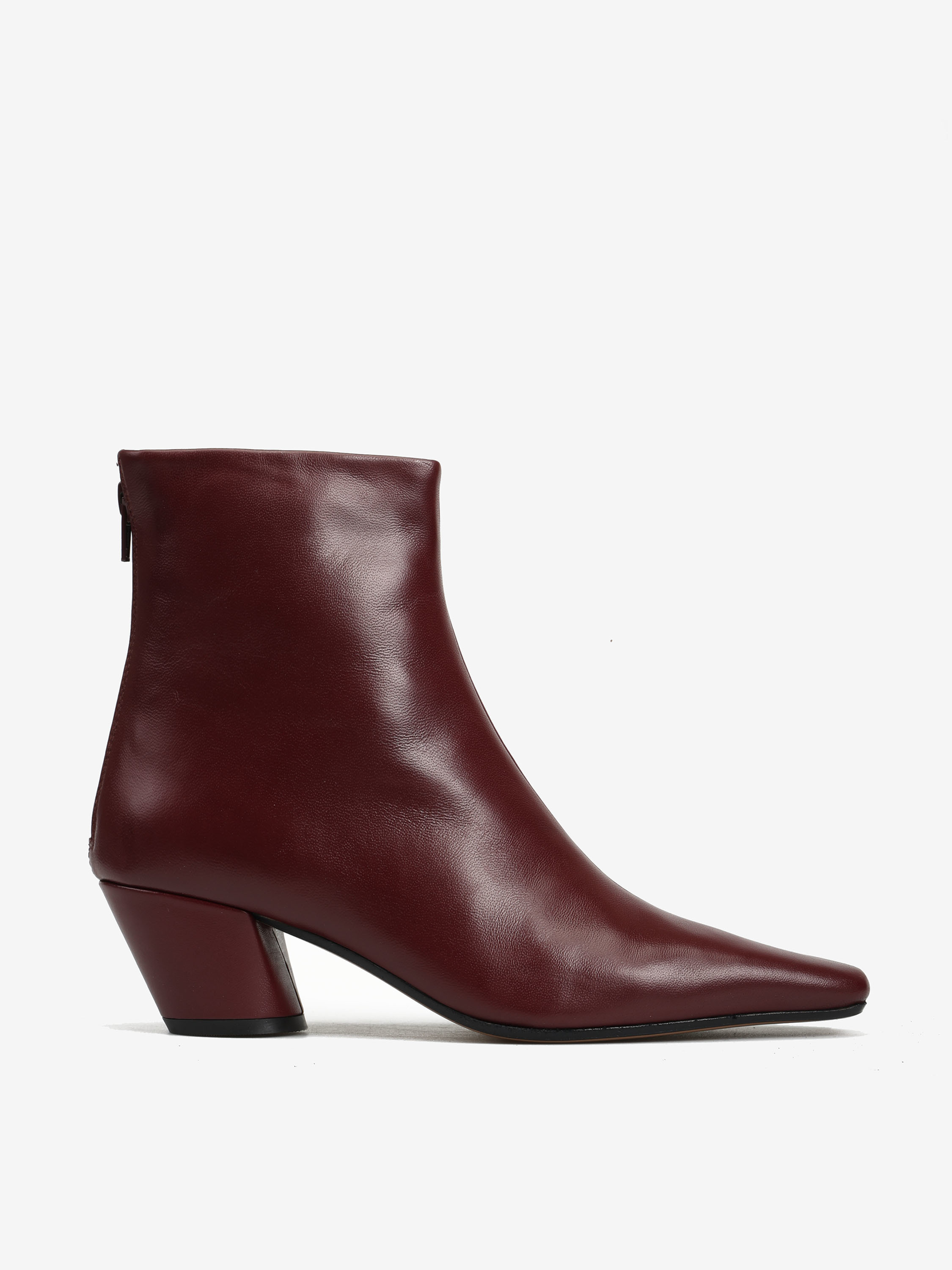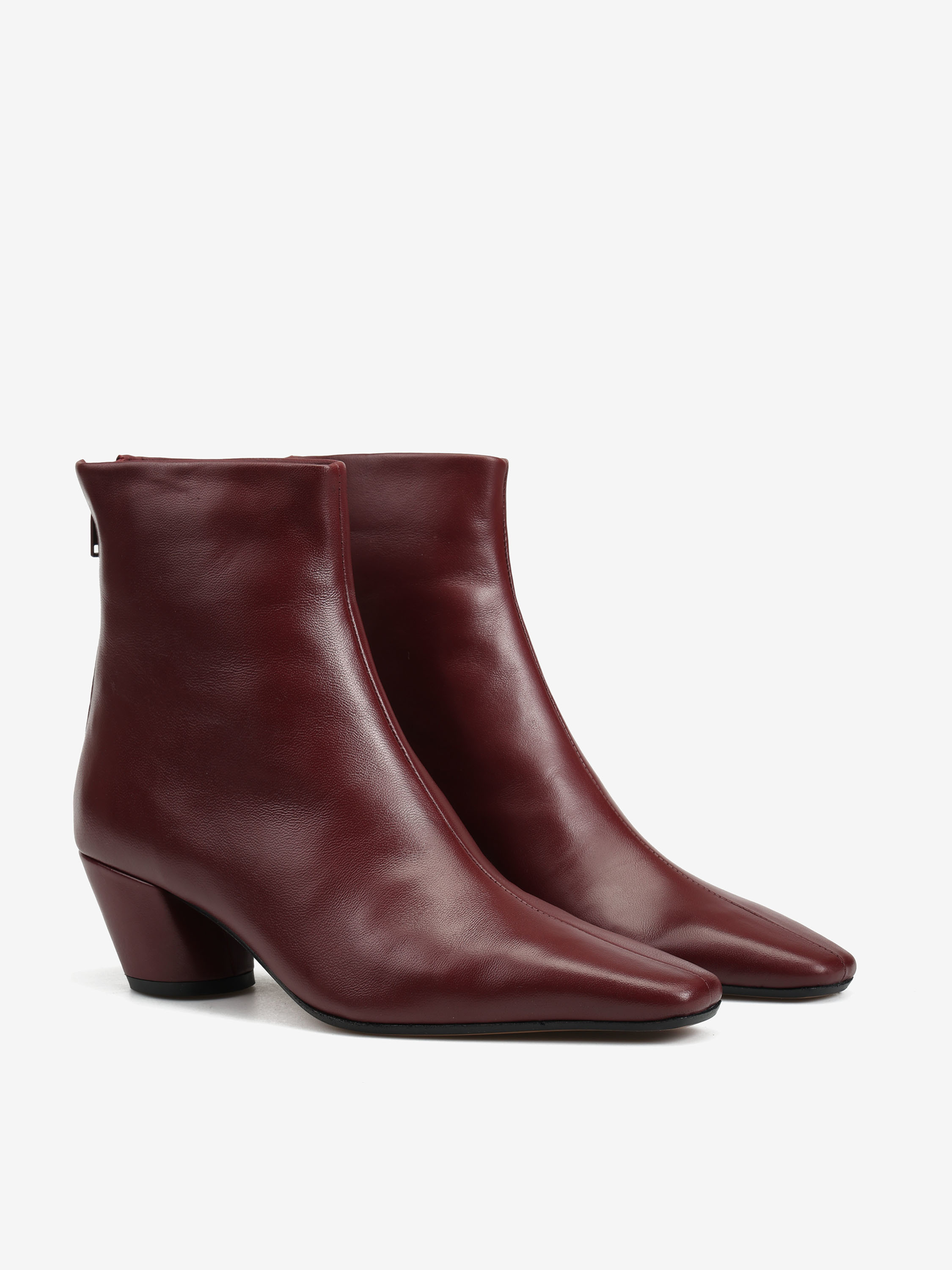Skórzane botki ze ściętym obcasem i zapięciem na suwak. Wydłużone, kwadratowe noski.