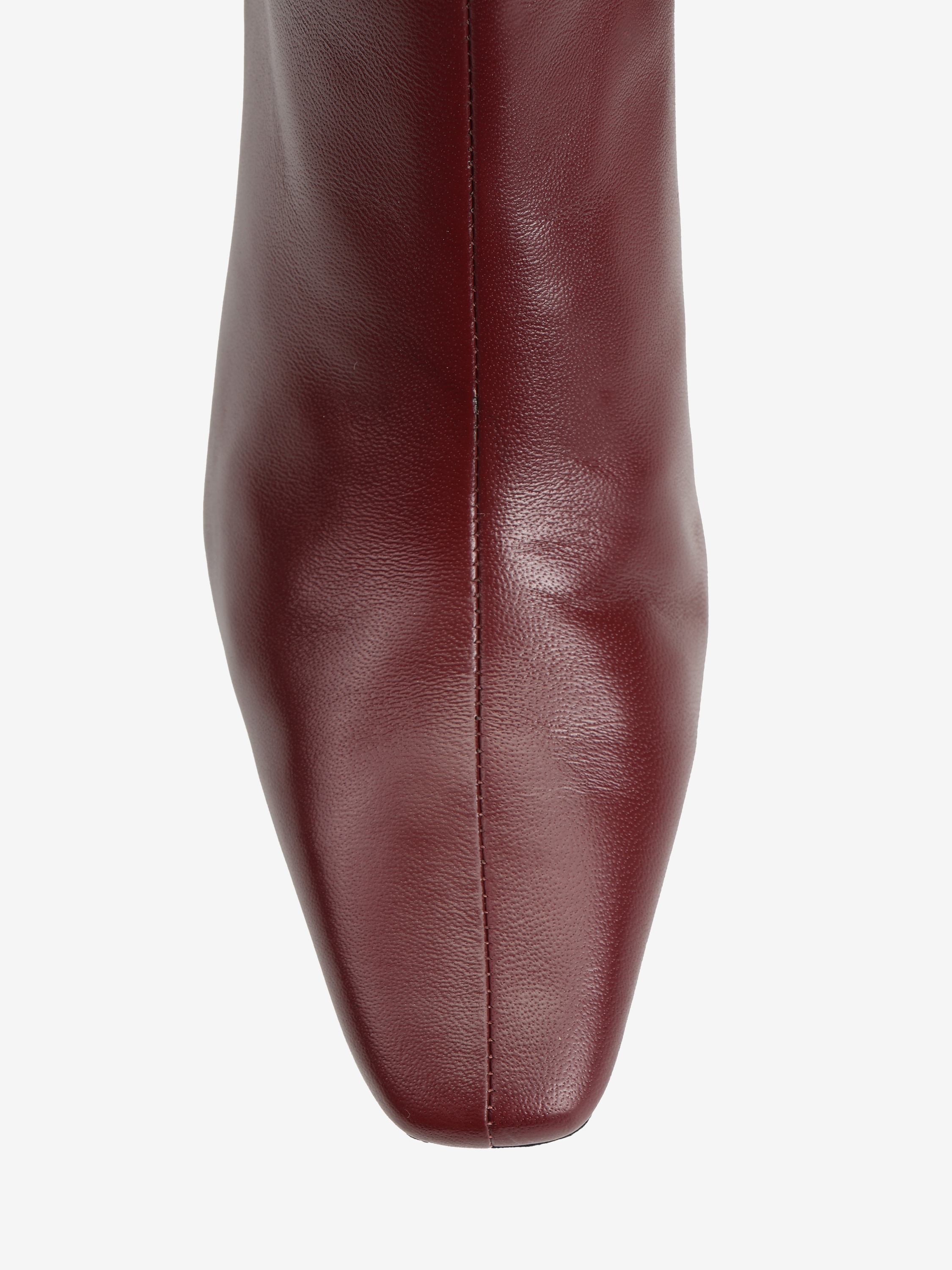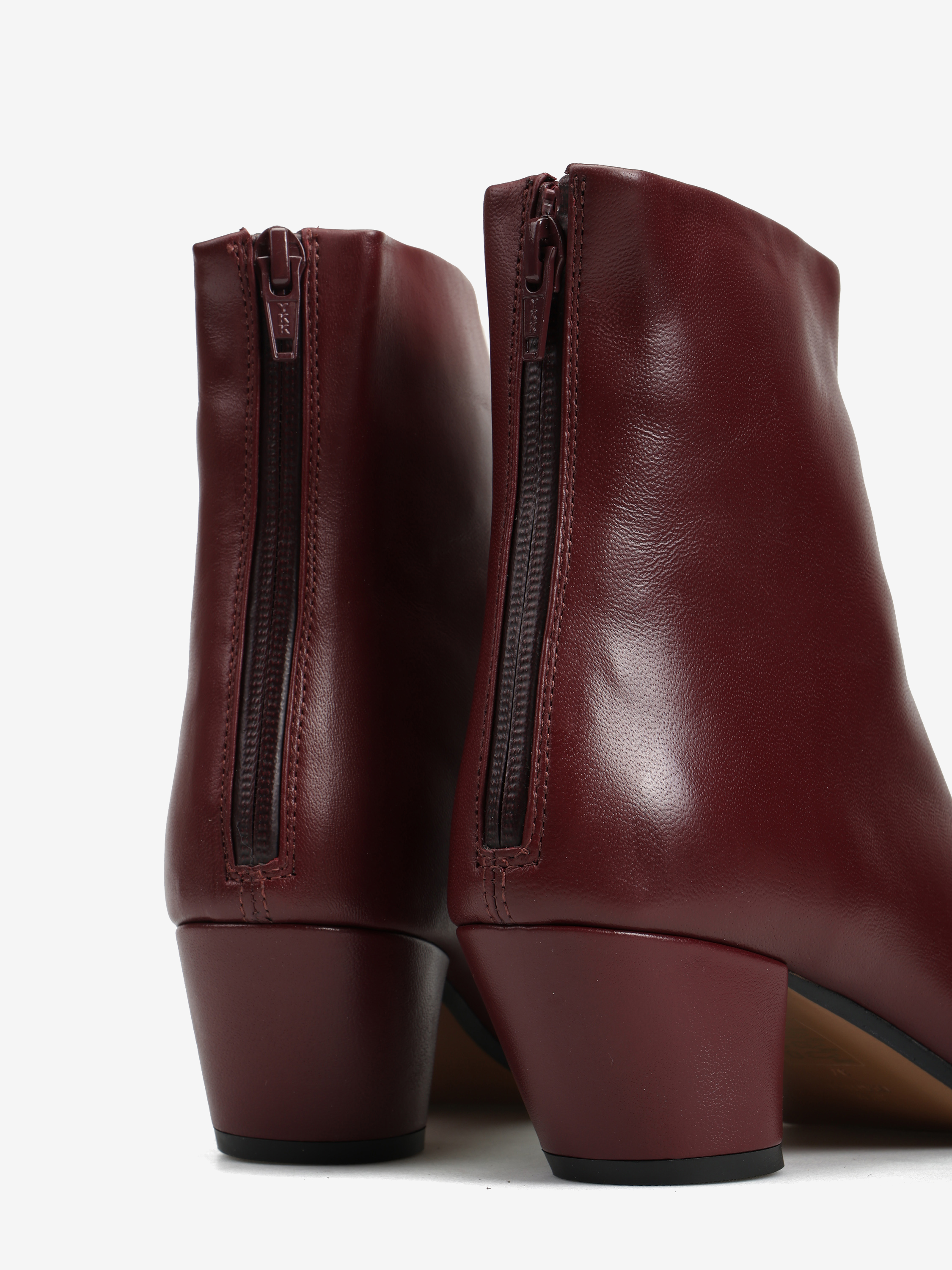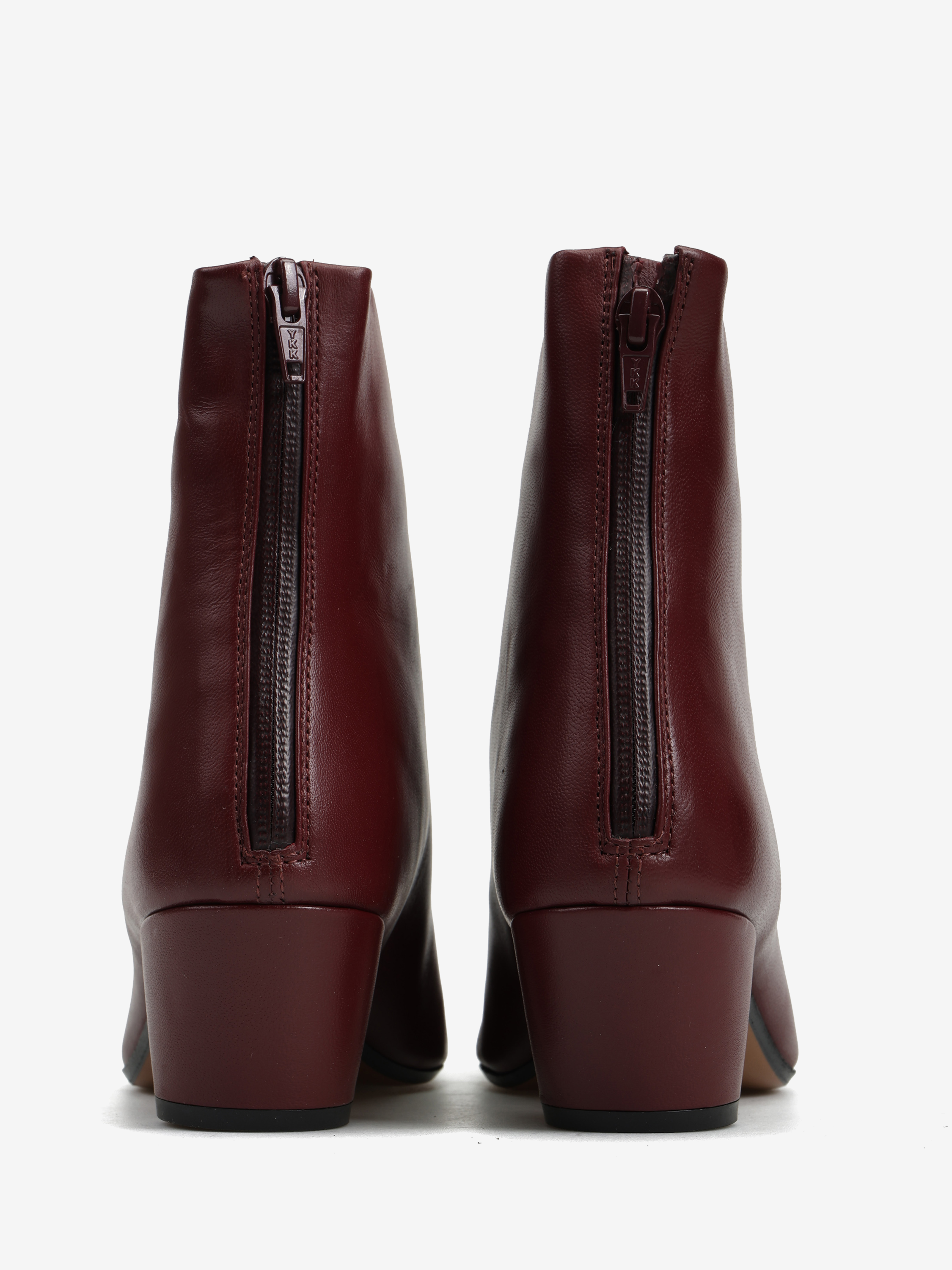 Skórzane botki ze ściętym obcasem i zapięciem na suwak. Wydłużone, kwadratowe noski.