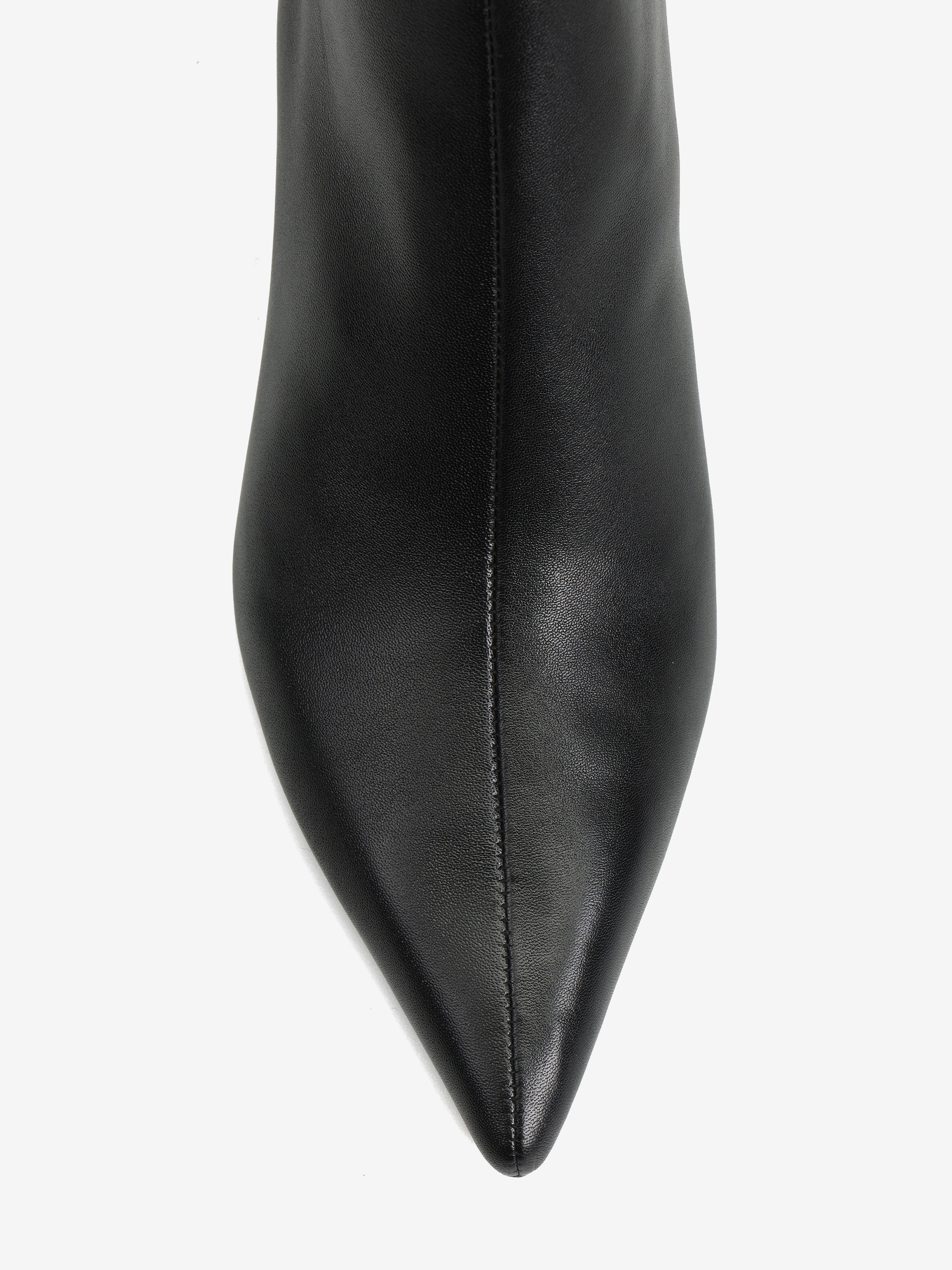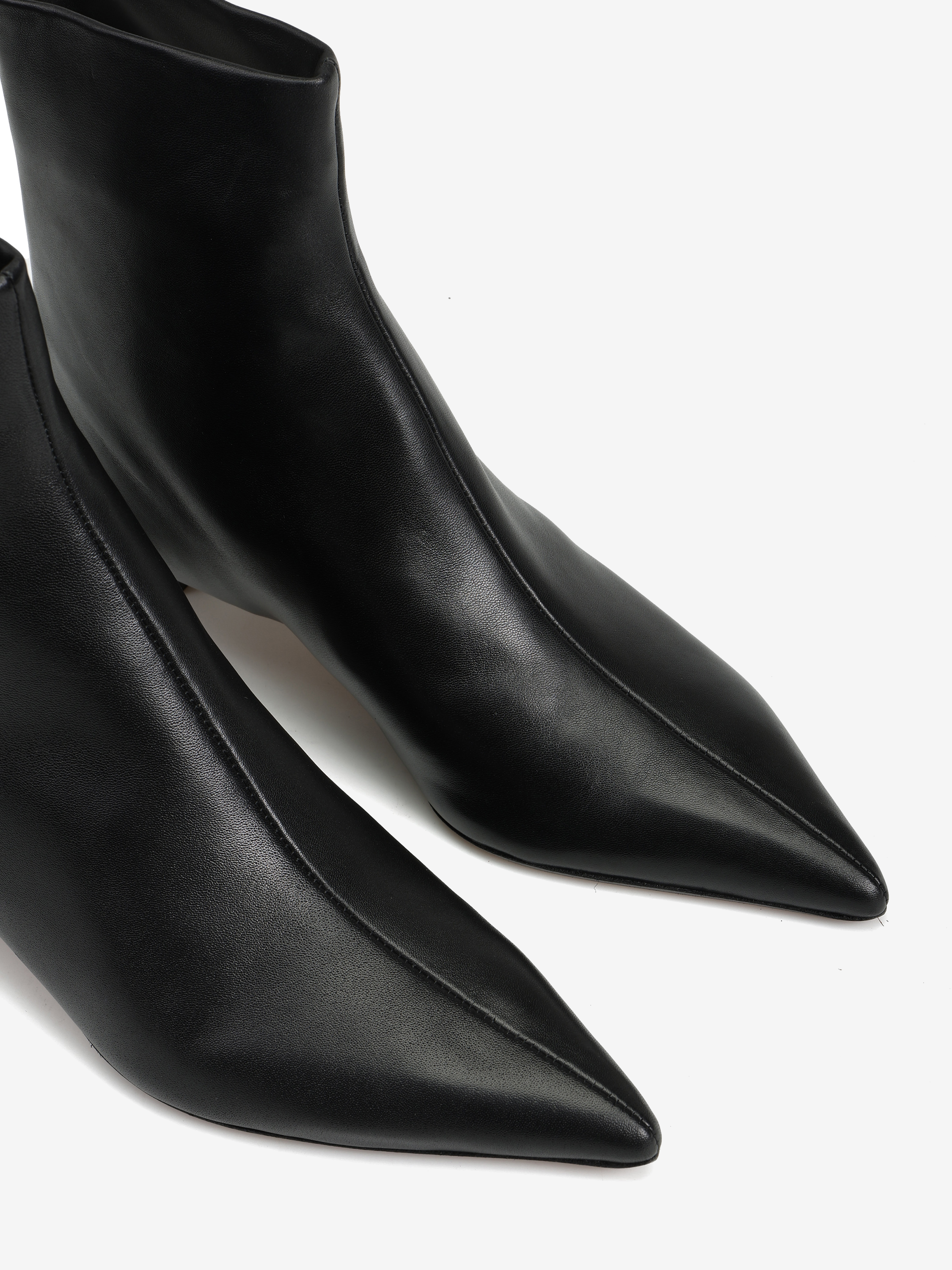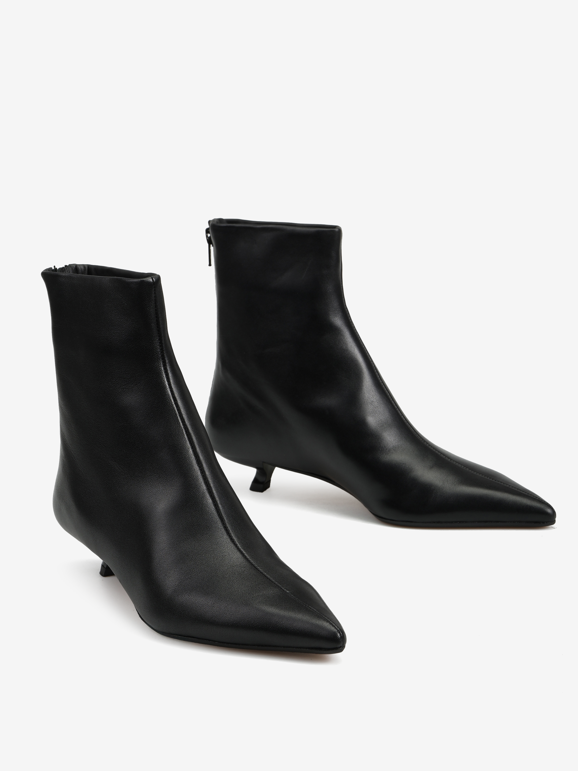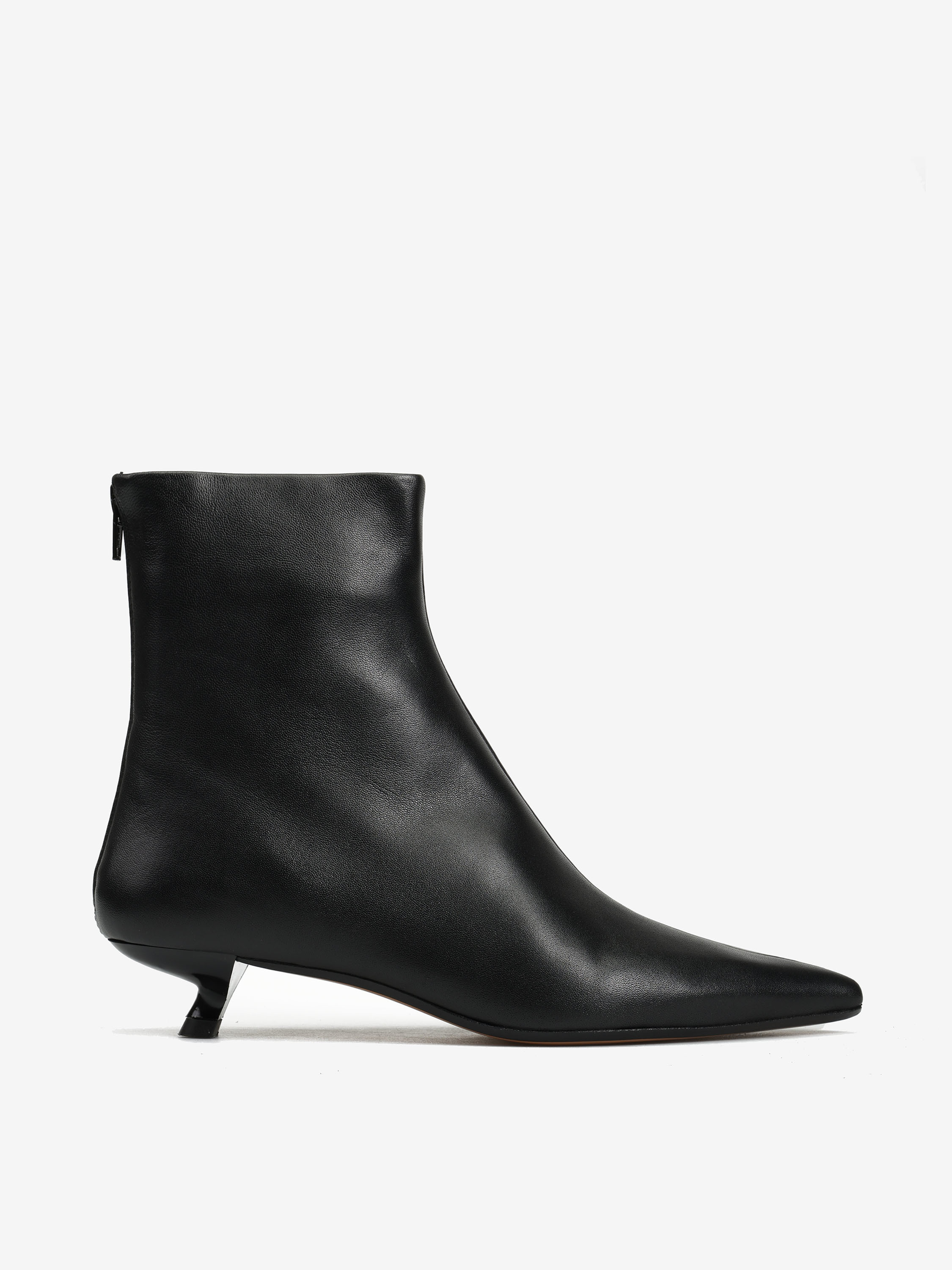 Skórzane botki na niskiej, profilowanej szpilce. Noski w szpic i zapięcie na suwak.