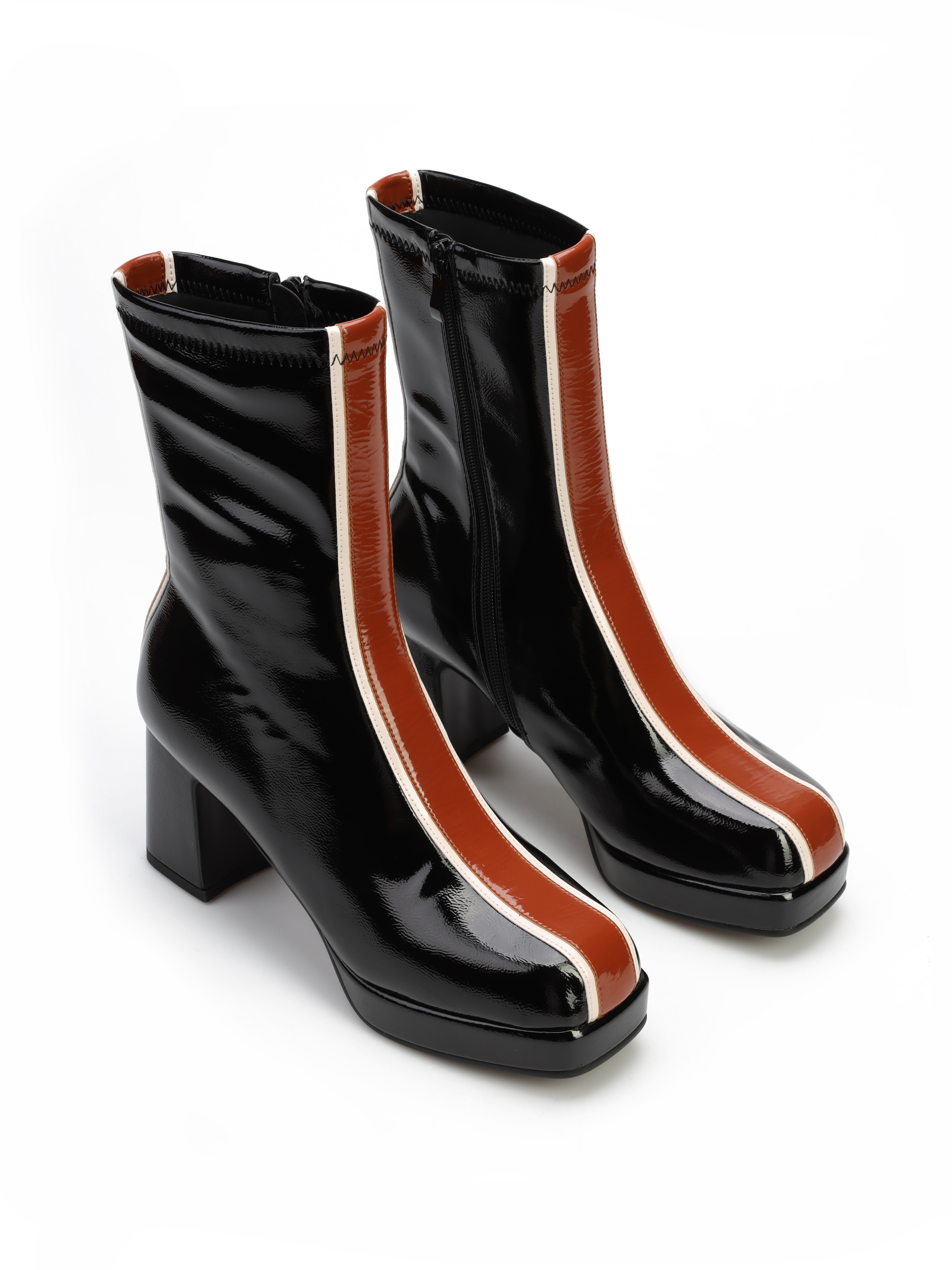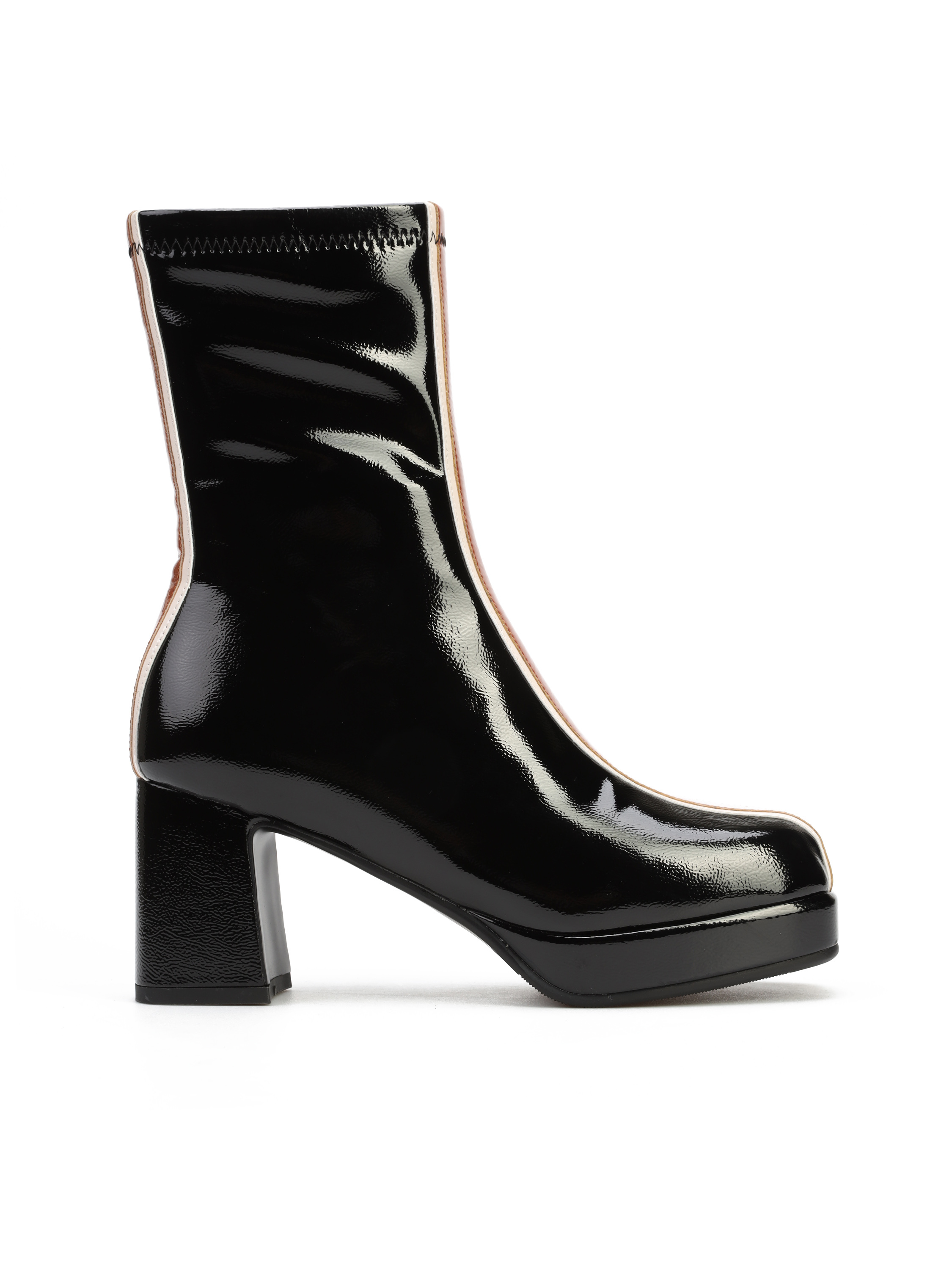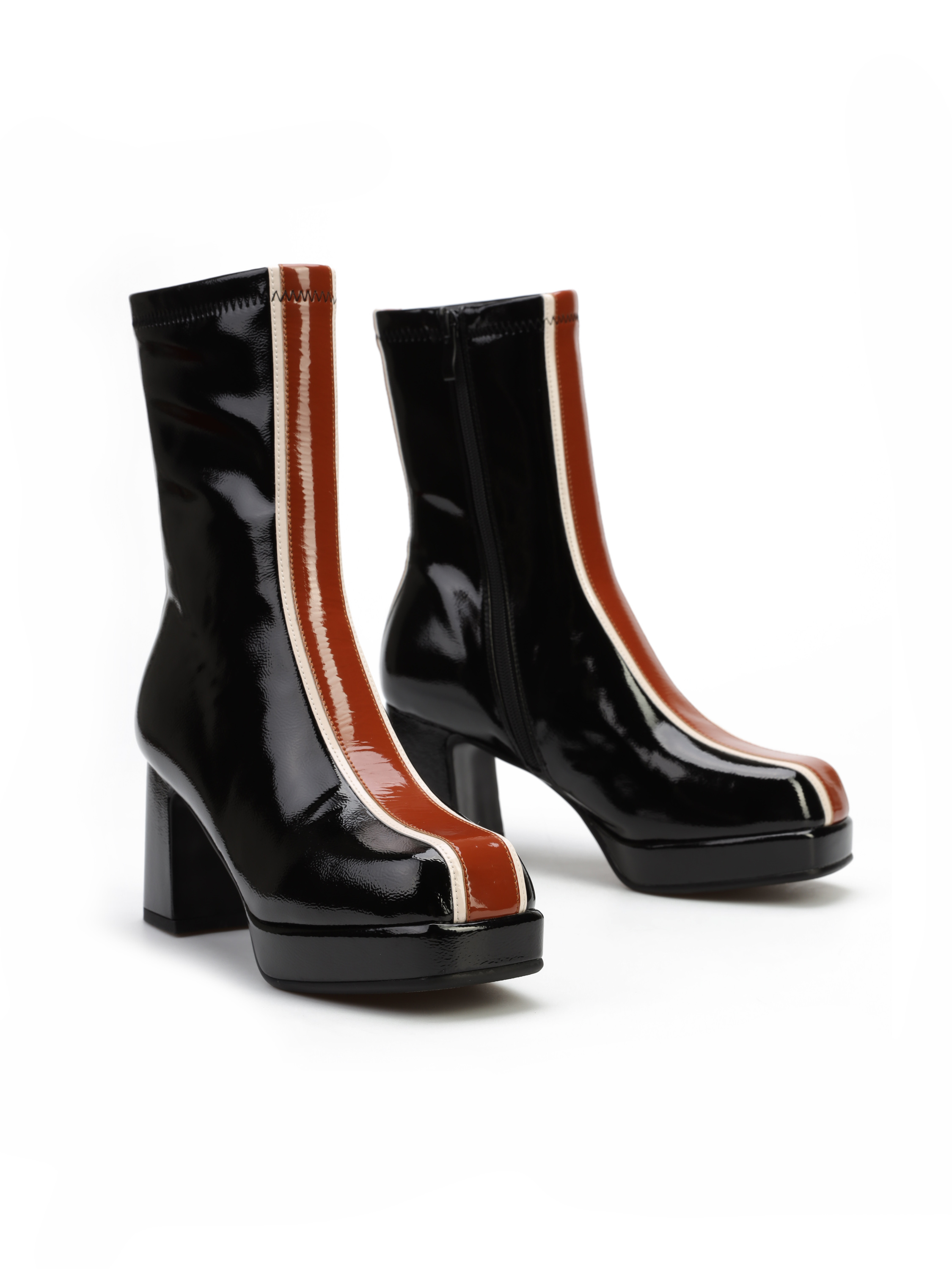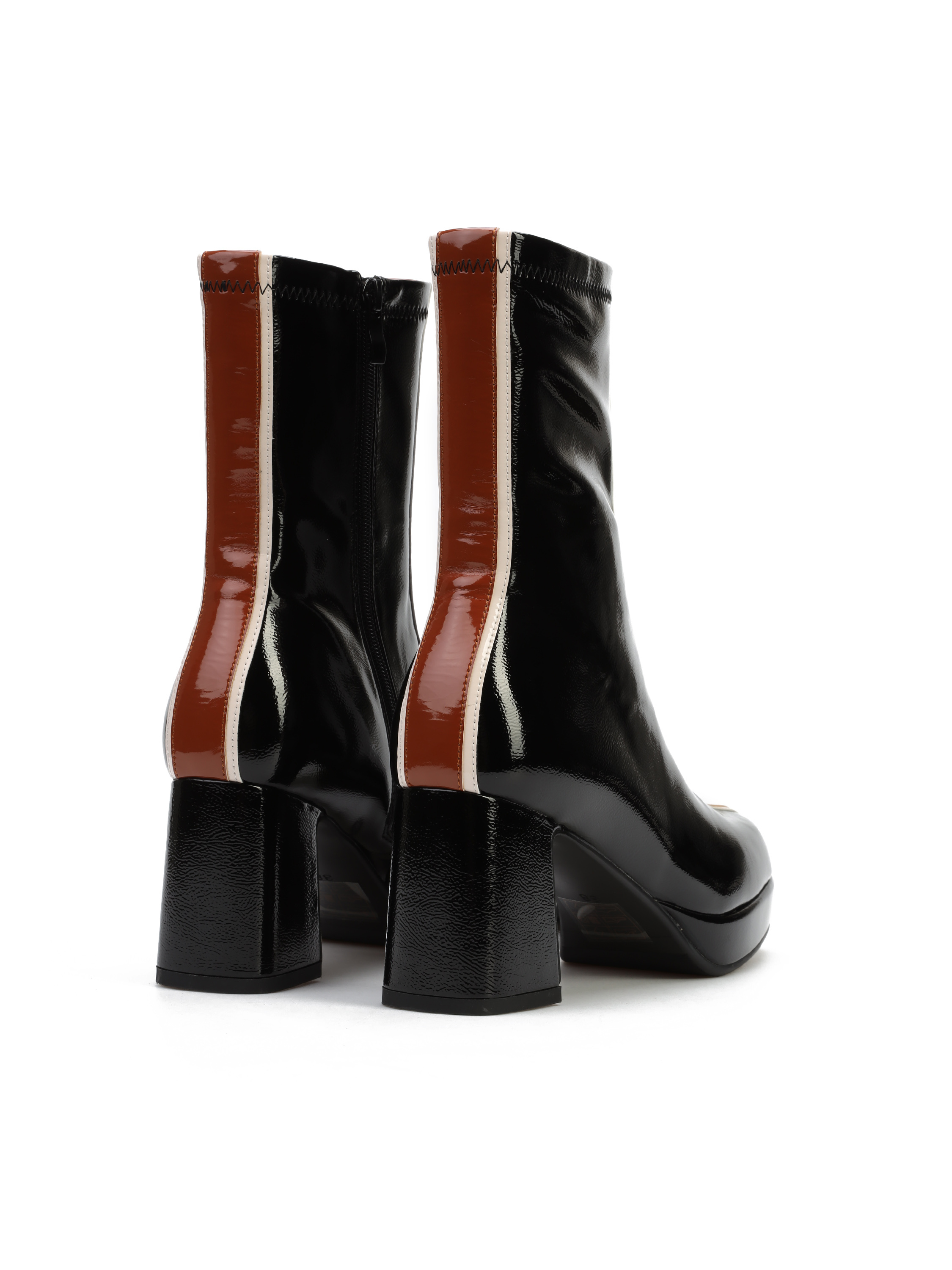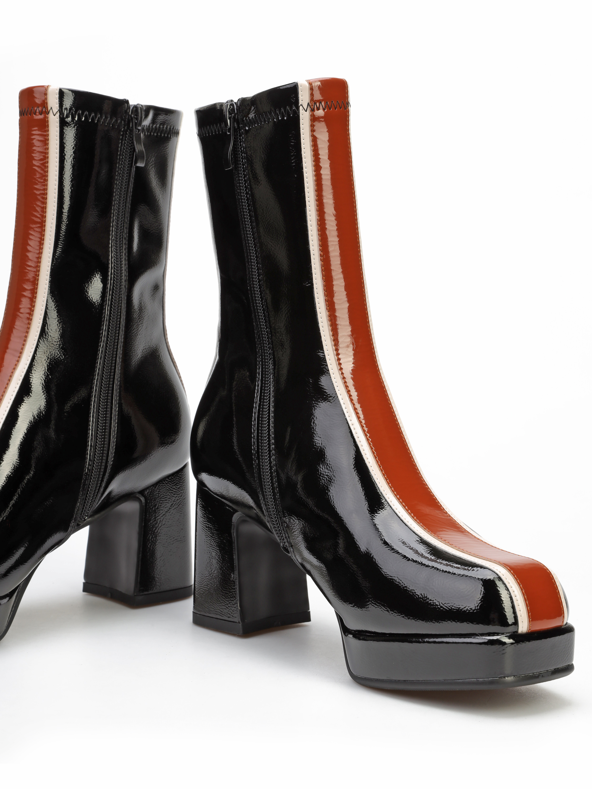 Botki na platformie to Trend sezonu. Błyszcząca cholewka za kostkę posiada zamek błyskawiczny. Wzbogacona została o modny, wyrazisty wzór. Model osadzony na stabilnym obcasie na słupku.