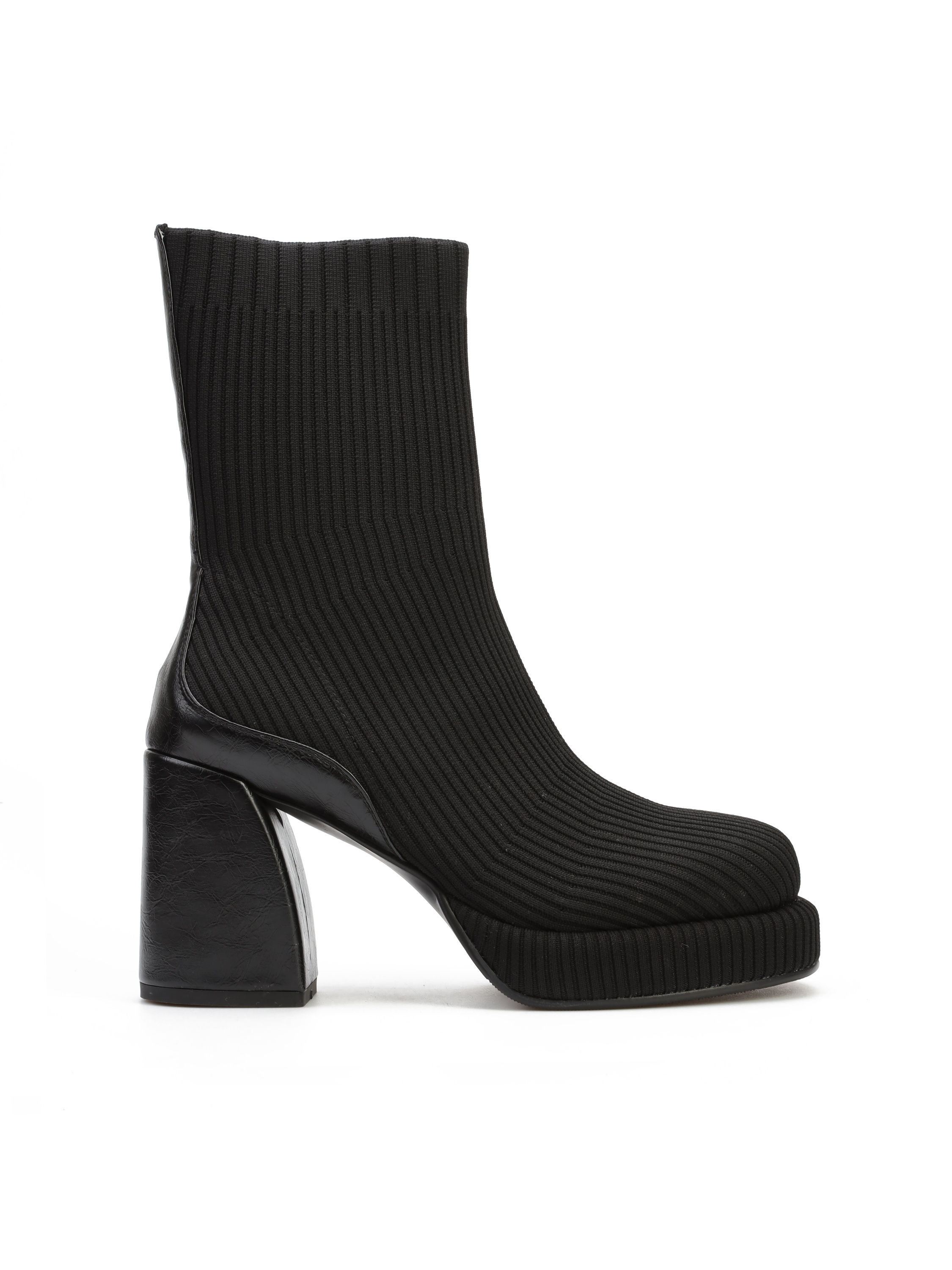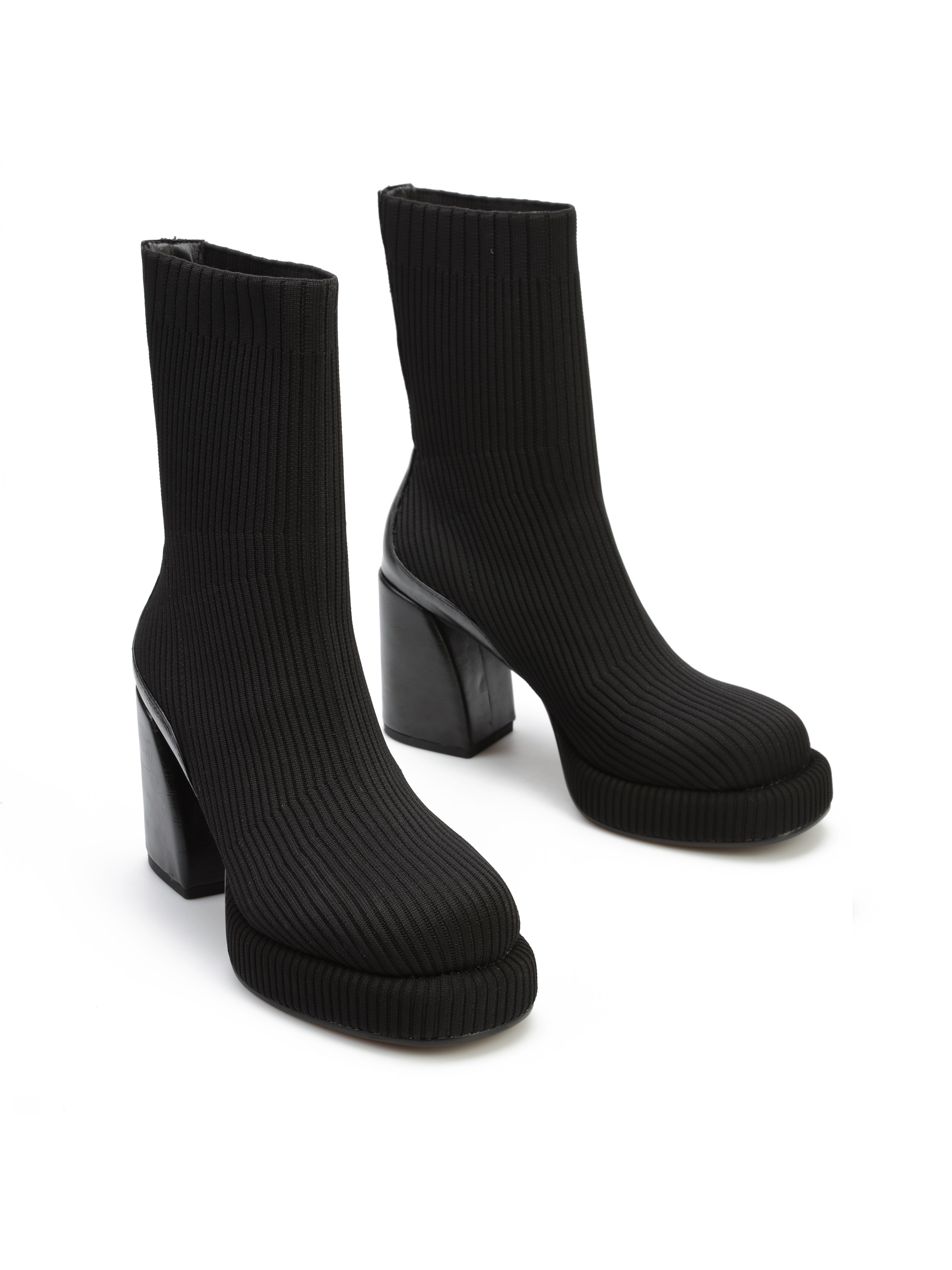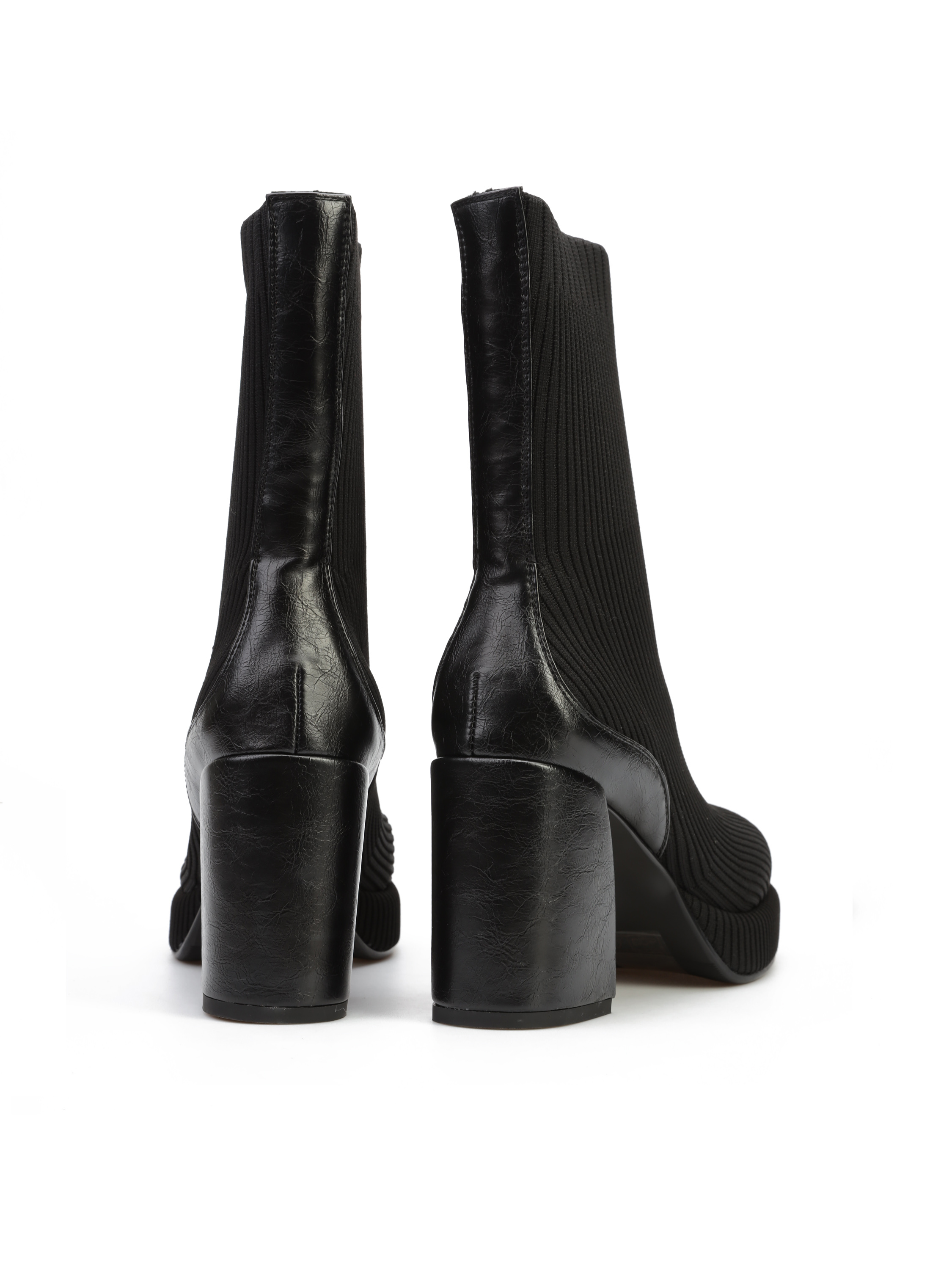 Wsuwane botki z elastyczną cholewką w stylu "Socks boots" przylegają do nogi jak druga skóra. Model za kostkę z wygodnym, stabilnym obcasem na słupku oraz podeszwą na platformie. Modne połączenie faktur wpisuje się w Trendy sezonu.