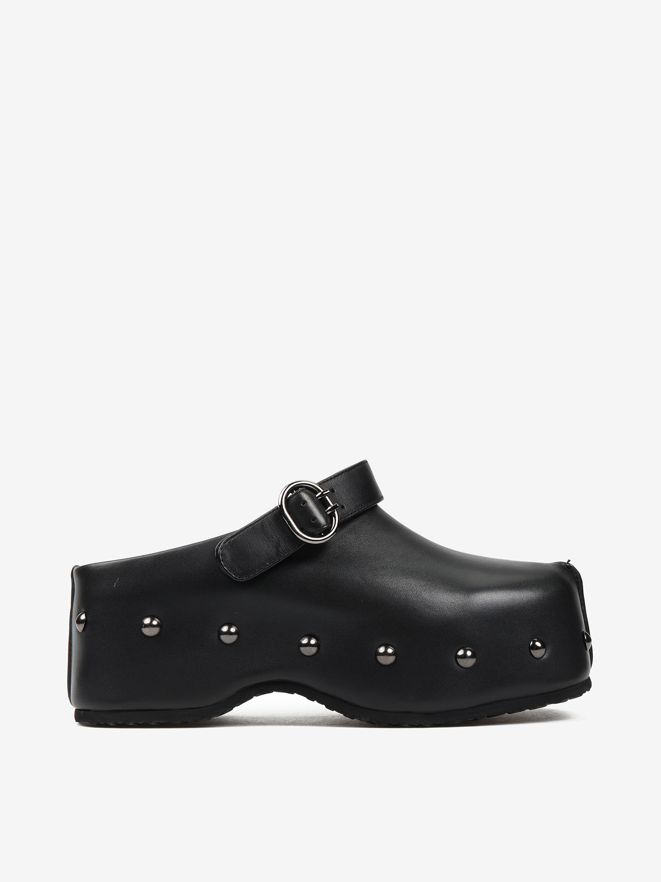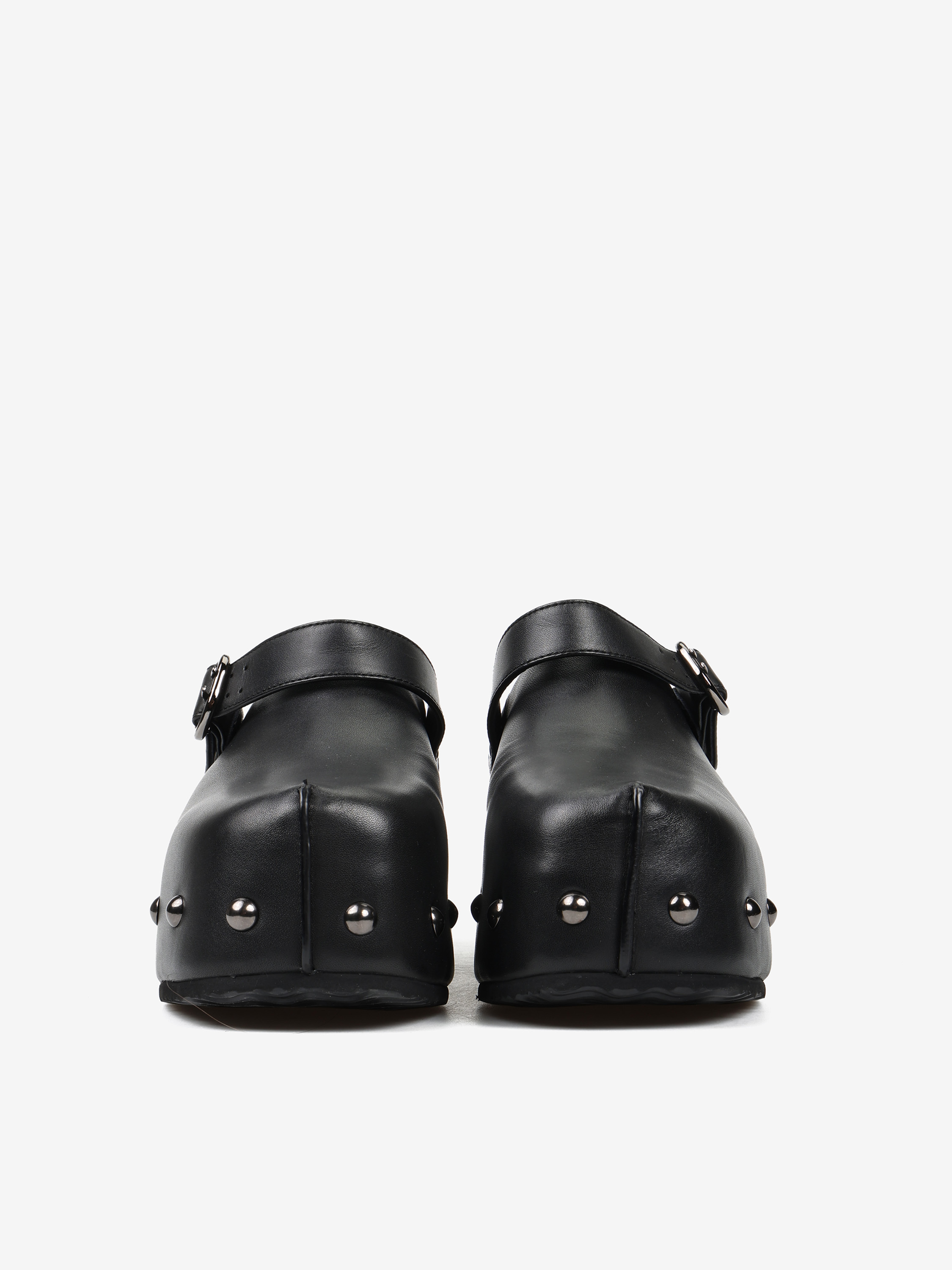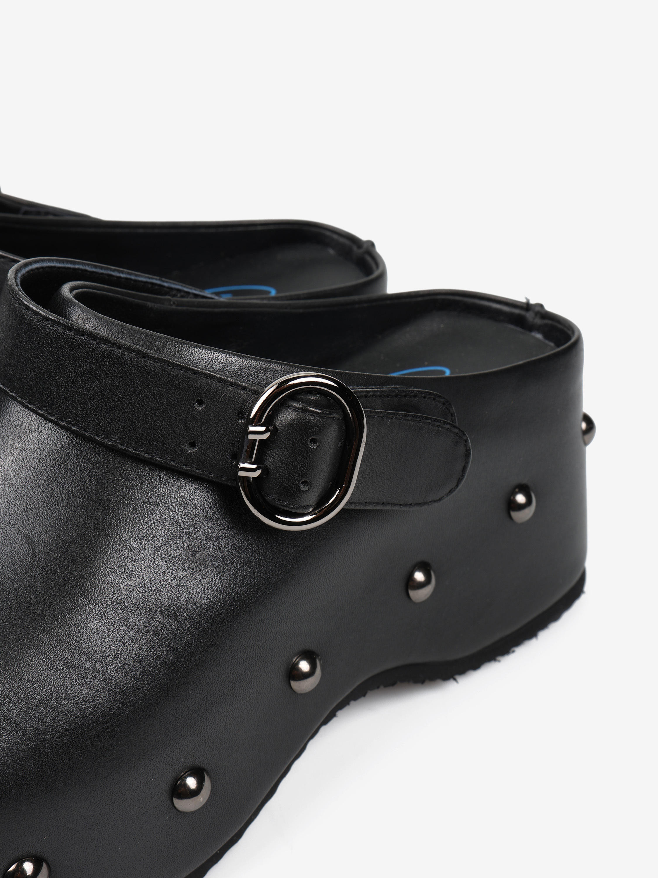 Chodaki na platformie z ozdobnymi ćwiekami i regulowanym paskiem.