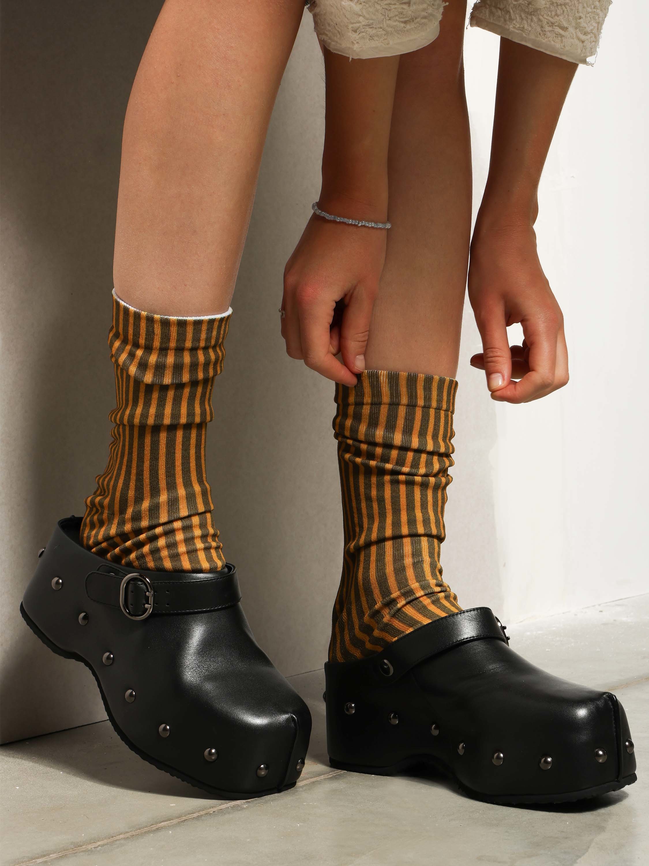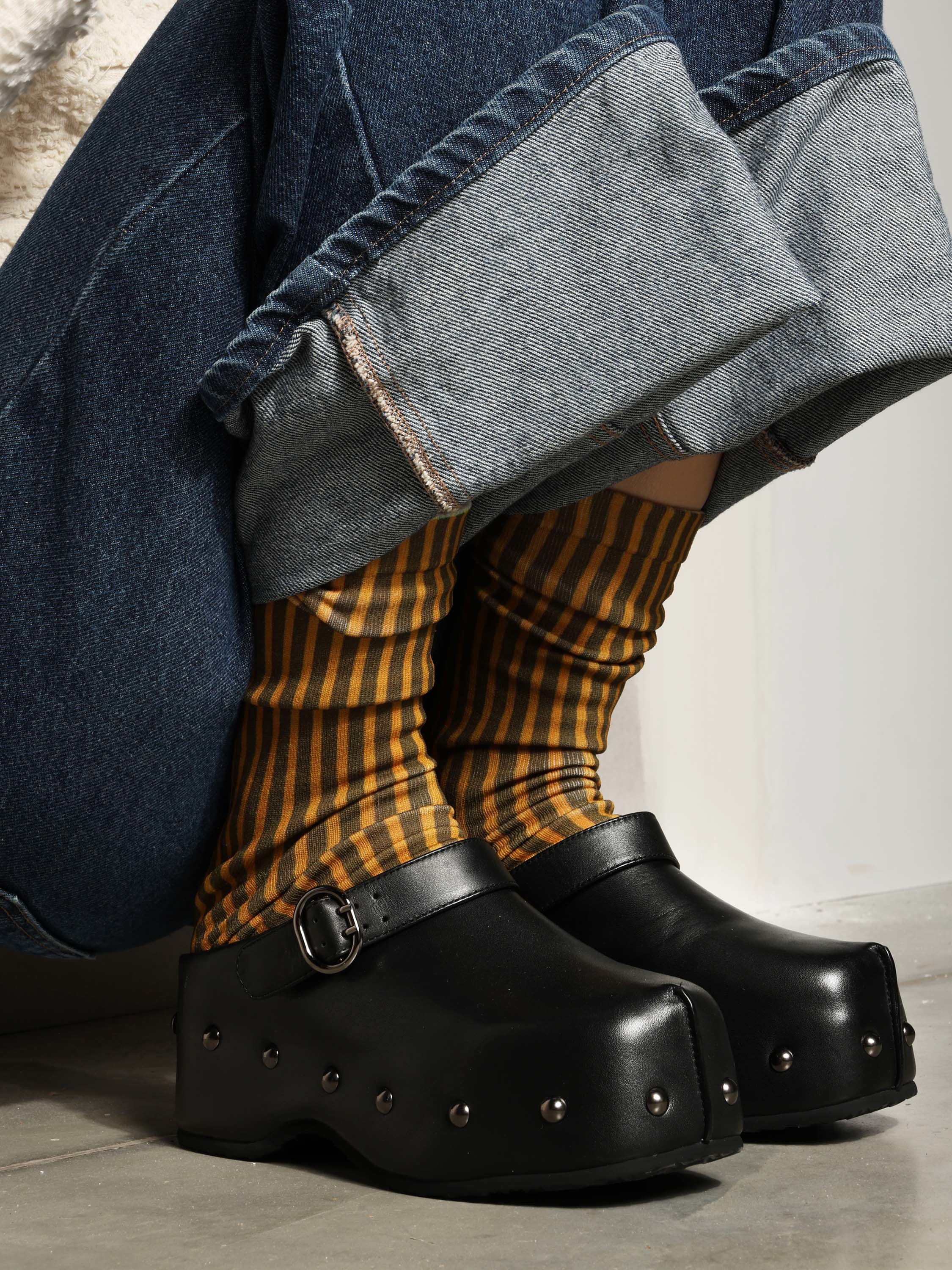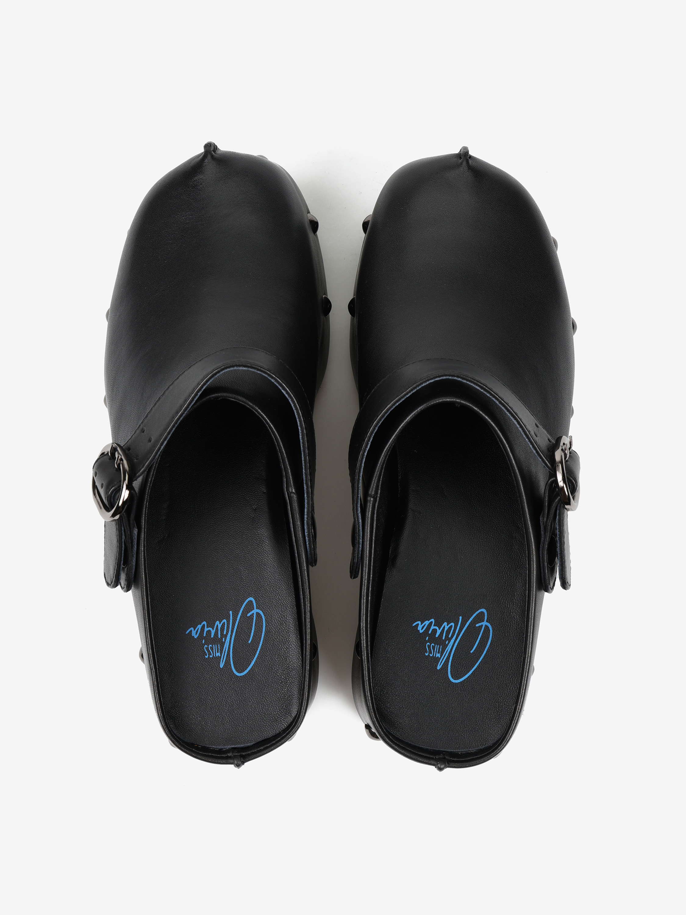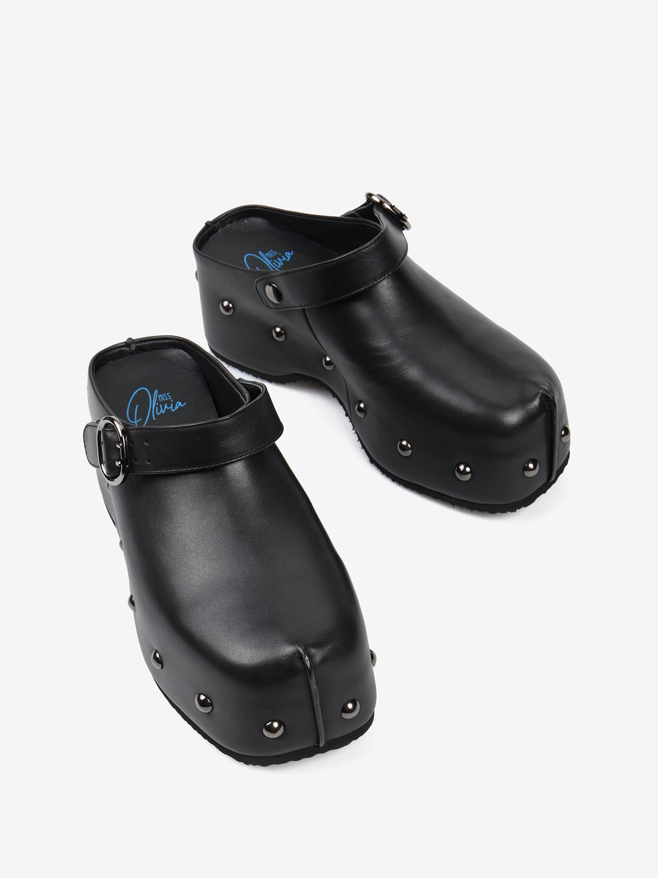 Chodaki na platformie z ozdobnymi ćwiekami i regulowanym paskiem.
