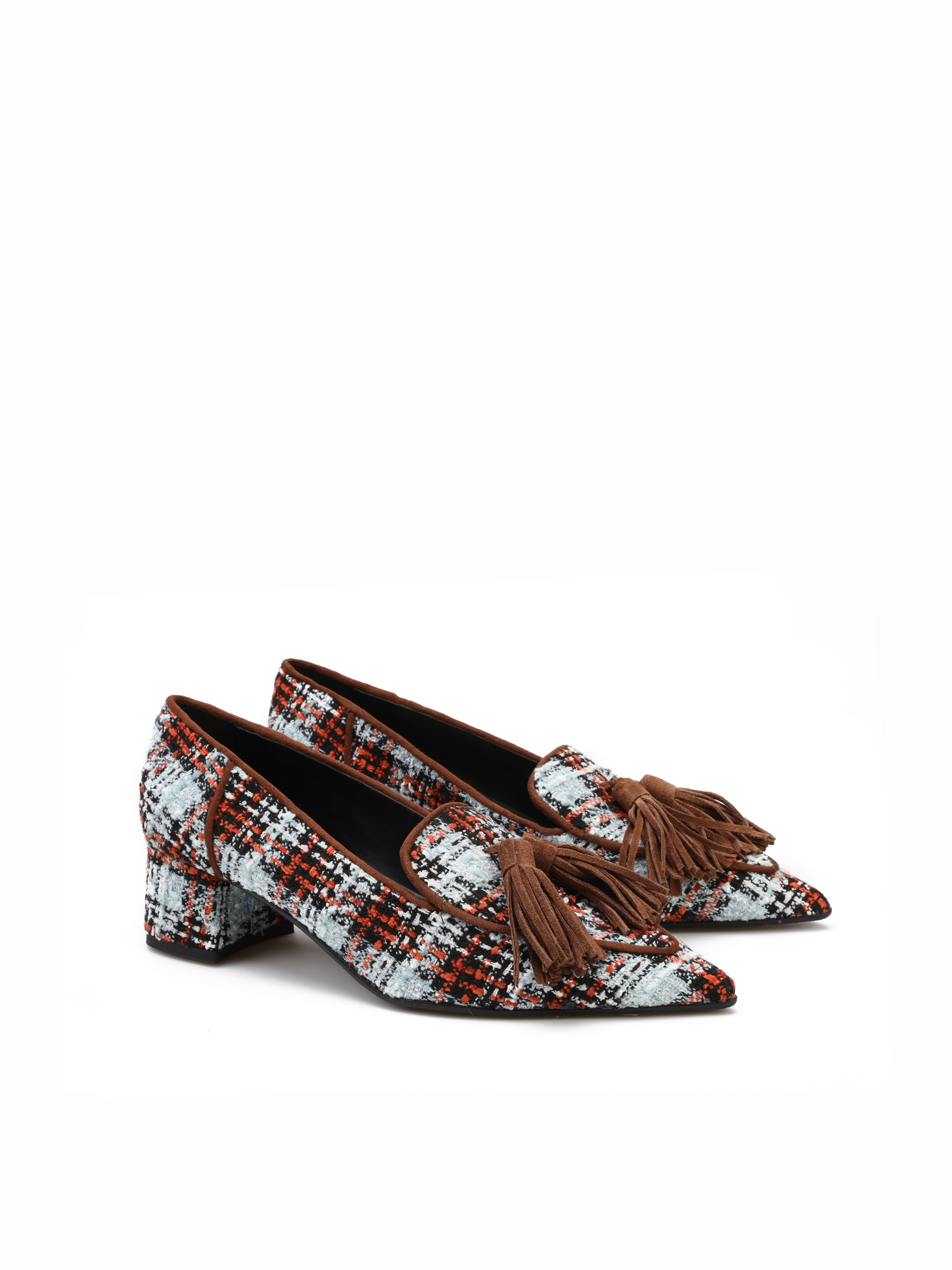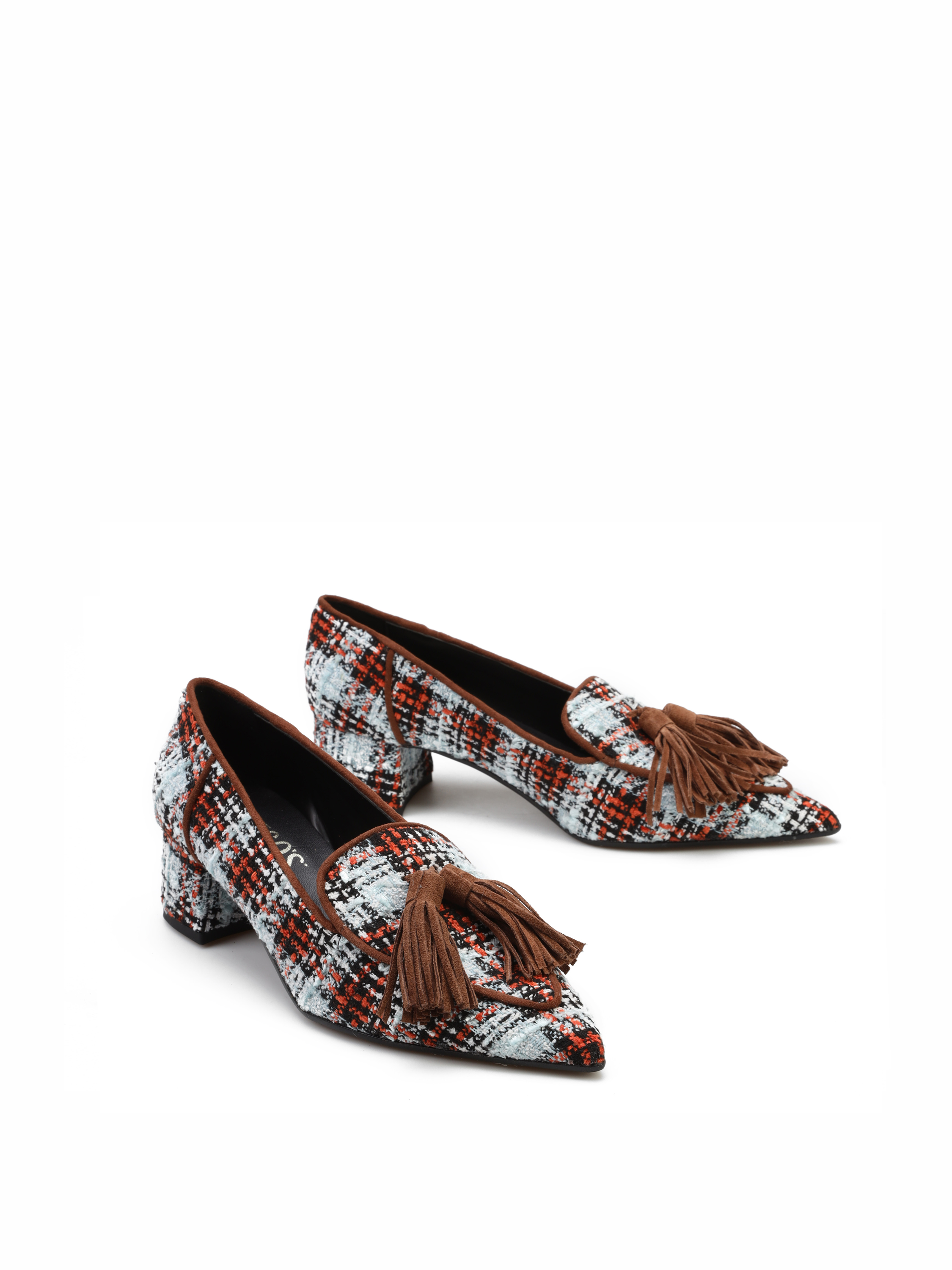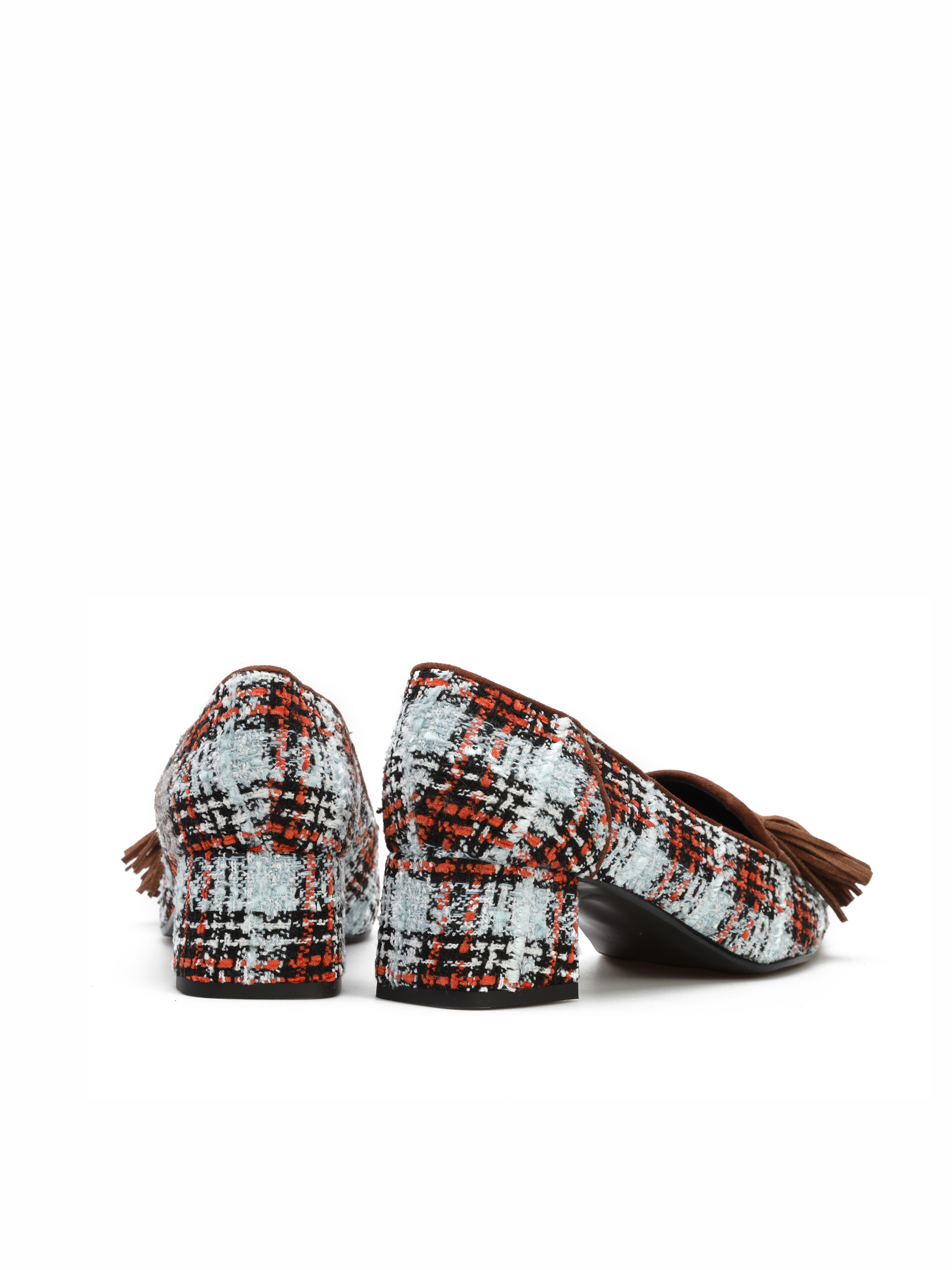 Czółenka na słupku to model dla kobiet łączących wygodę i aktualne Trendy. Cholewka z tkaniny w modnym połączeniu kolorystycznym ozdobiona została frędzlami. Model w szpic na niskim obcasie na słupku. Posiada skórzaną wkładkę.